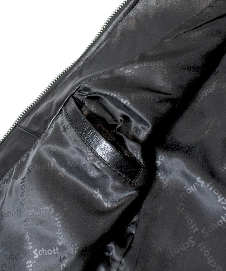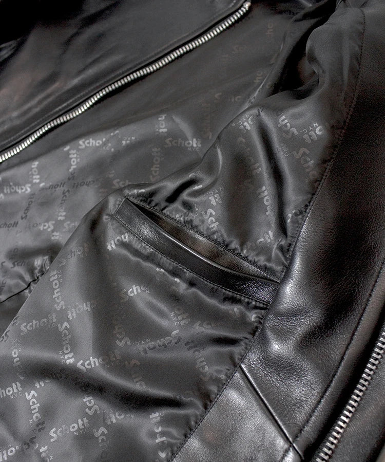 スタンドカラーのスッキリとした首元と全体的にシンプルなデザインは、ミニマルで洗練された印象を与えます。袖口は防風性を高めグローブも着用しやすいジッパー仕様、両サイドにはデザイン的にもアクセントになっているアジャスターでウエストの微調整も可能です。襟元のボタンやレザーの引き手付きフロントジップ、ボタンや袖口に配置されたジッパーにはSchottのロゴ入りデザインになっており細部にまでこだわりを感じます。