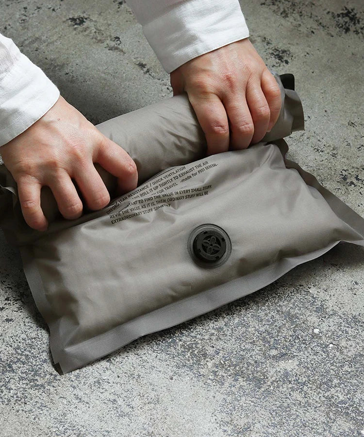 袋の上部をスライダーで閉じ、手で袋を丸めて中の空気をロック式排気弁から排出することで圧縮が完了します。