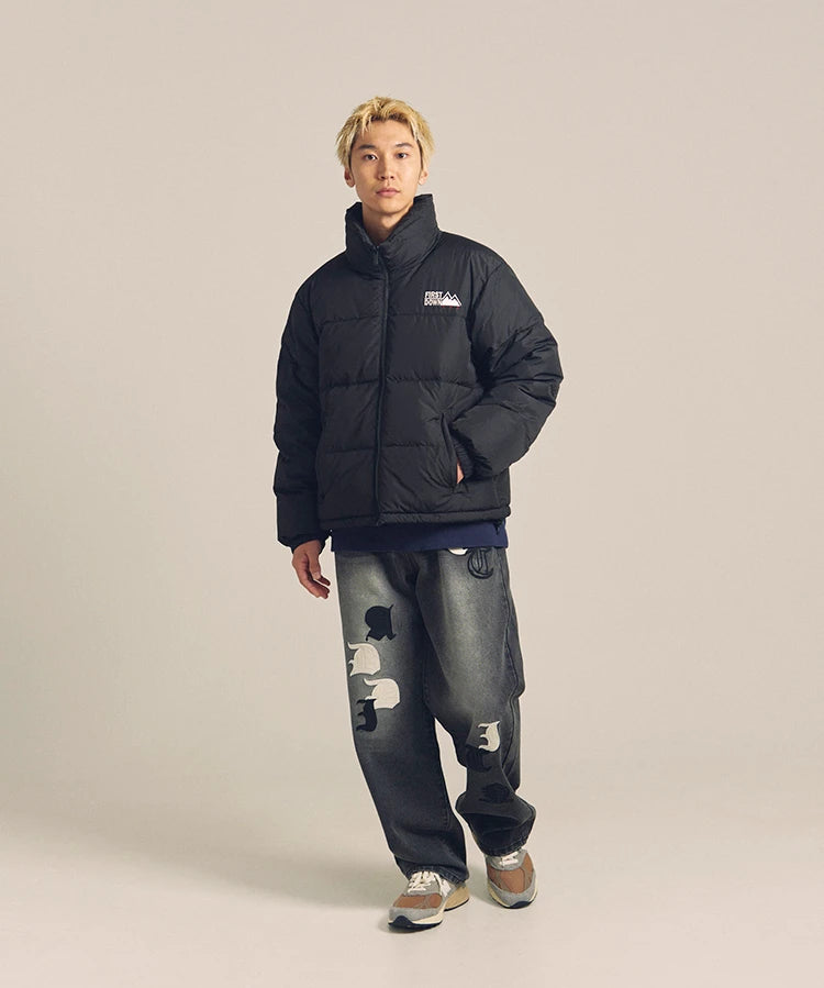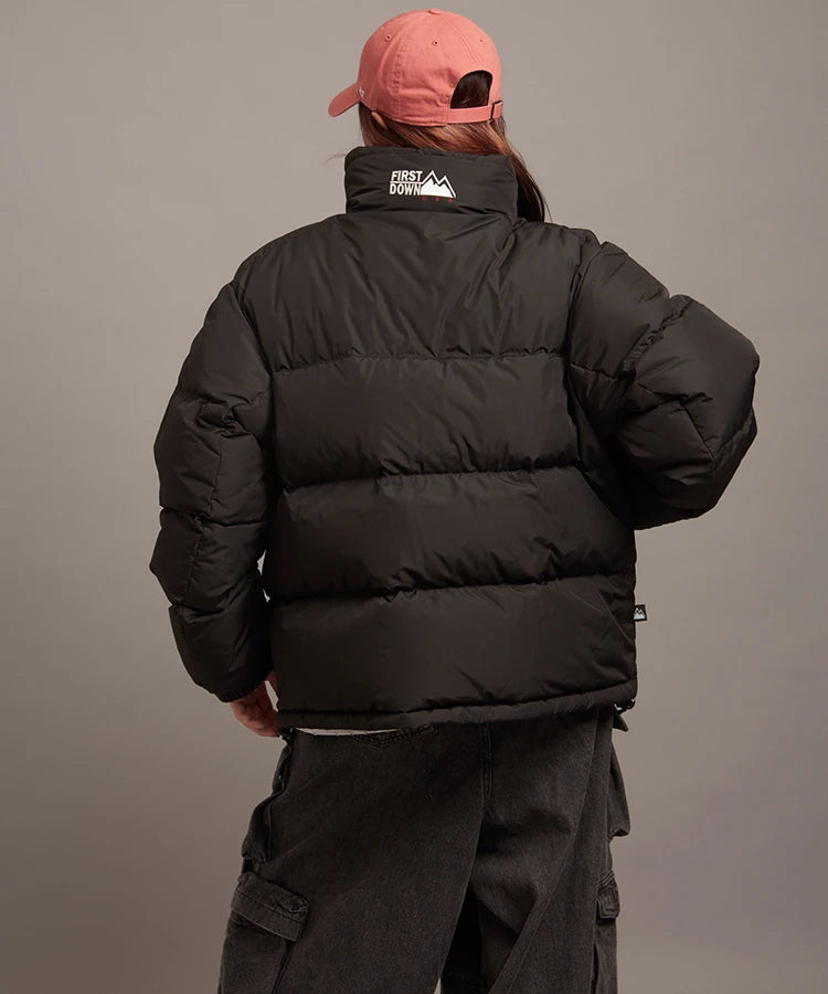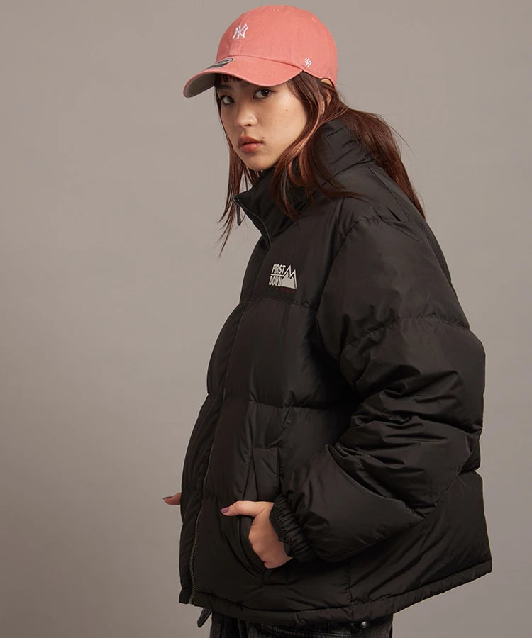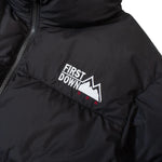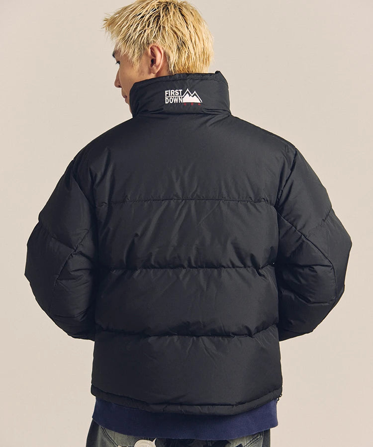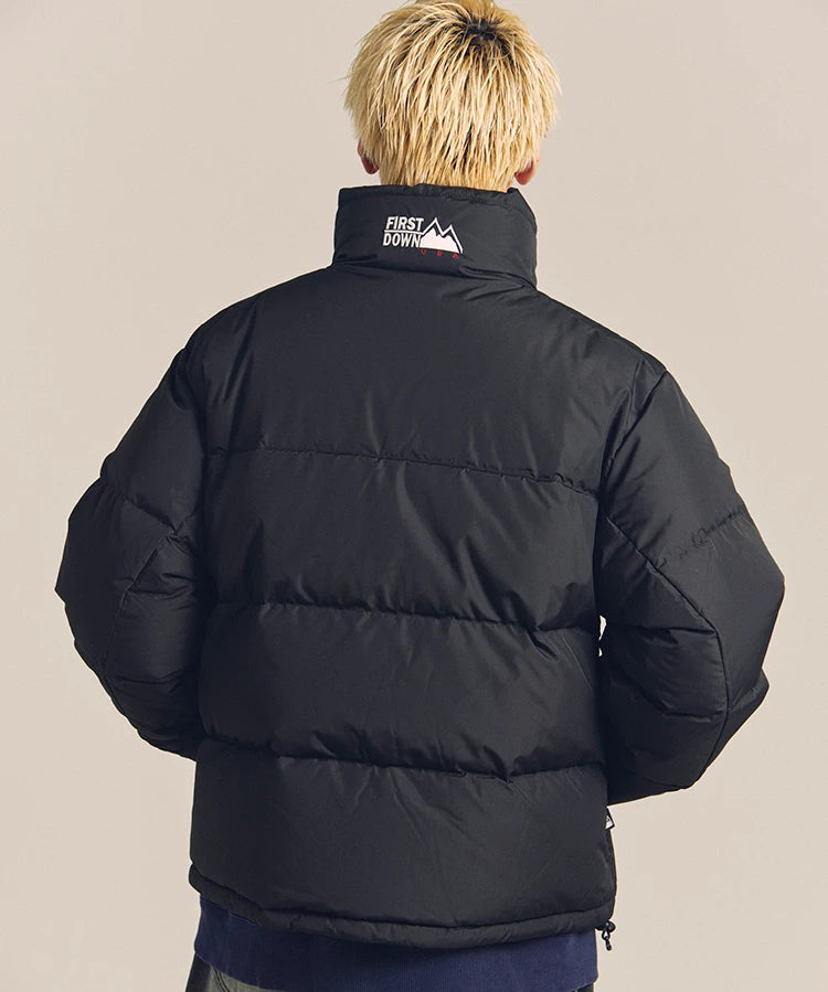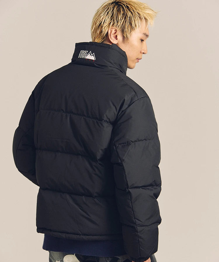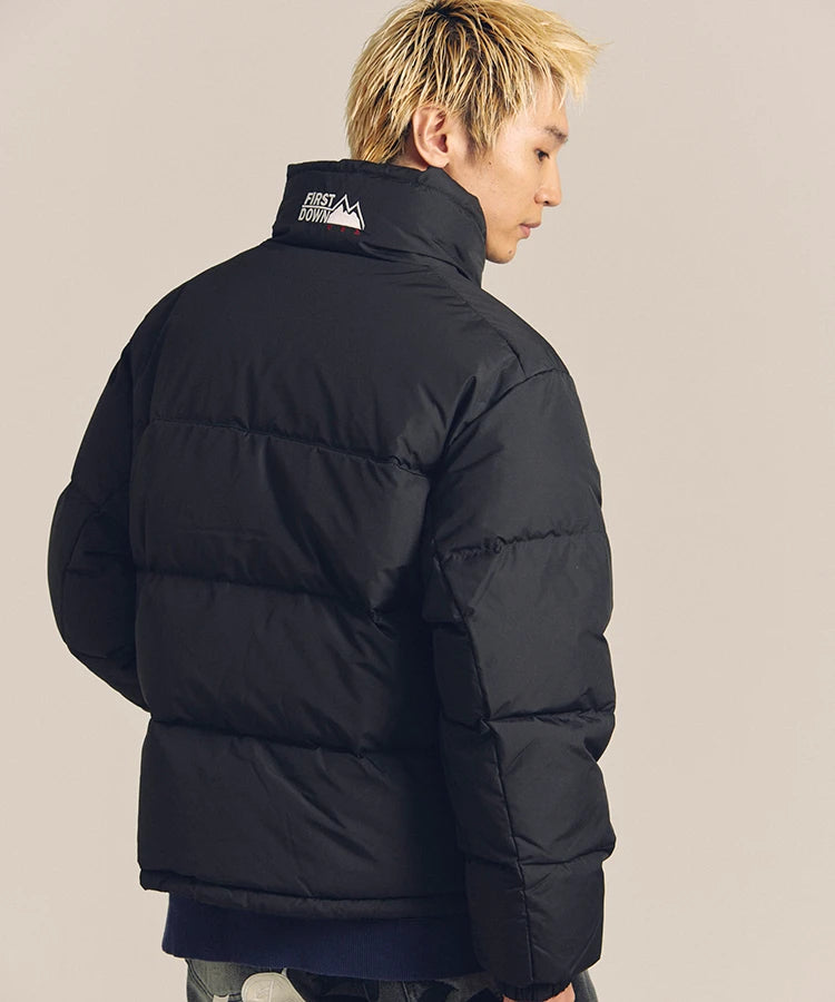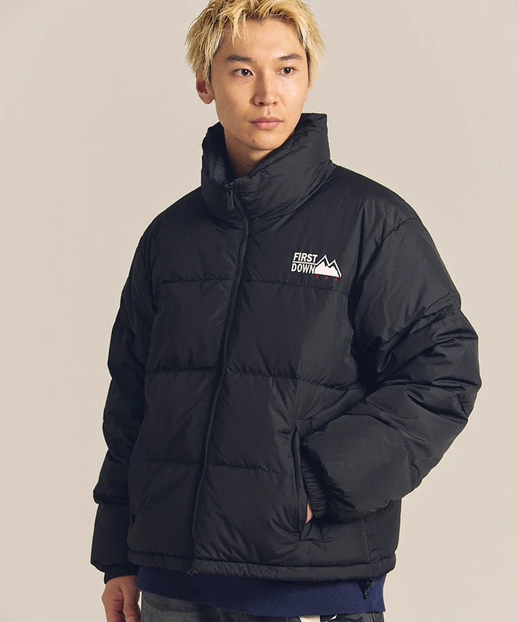 FIRSTDOWNを象徴するバブルダウンジャケット。切り替えたとボリュームのある衿高デザインが特徴。2WAYリバーシブル仕様。裏側のカラーはブラックになります。表地は優れた防水性、撥水性がありながらも、透湿性を兼ね備えた蒸れにくい『帝人MICROFT』素材を使用。高品質といわれる700フィルパワーのダウンを使用。中綿はダウン90%フェザー10%のホワイトダックダウンを使用。またシワになりにくい素材の為、お手入れも簡単。表地の下にはDupont社が開発したポリエチレン不織布を入れる事により、独特の風合い・ハリ感をもたせている。トレーナーやパーカーなどカジュアルアイテムに合わせやすく、ワイドデニムパンツやカーゴパンツとの相性も良い。オーバーサイズの着こなしで、ユニセックスでも着用可能。