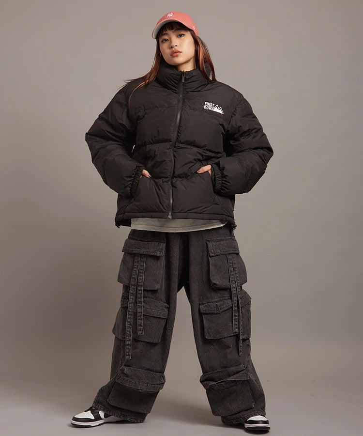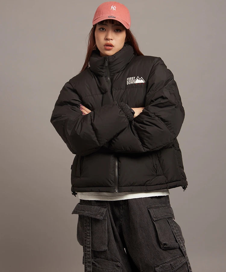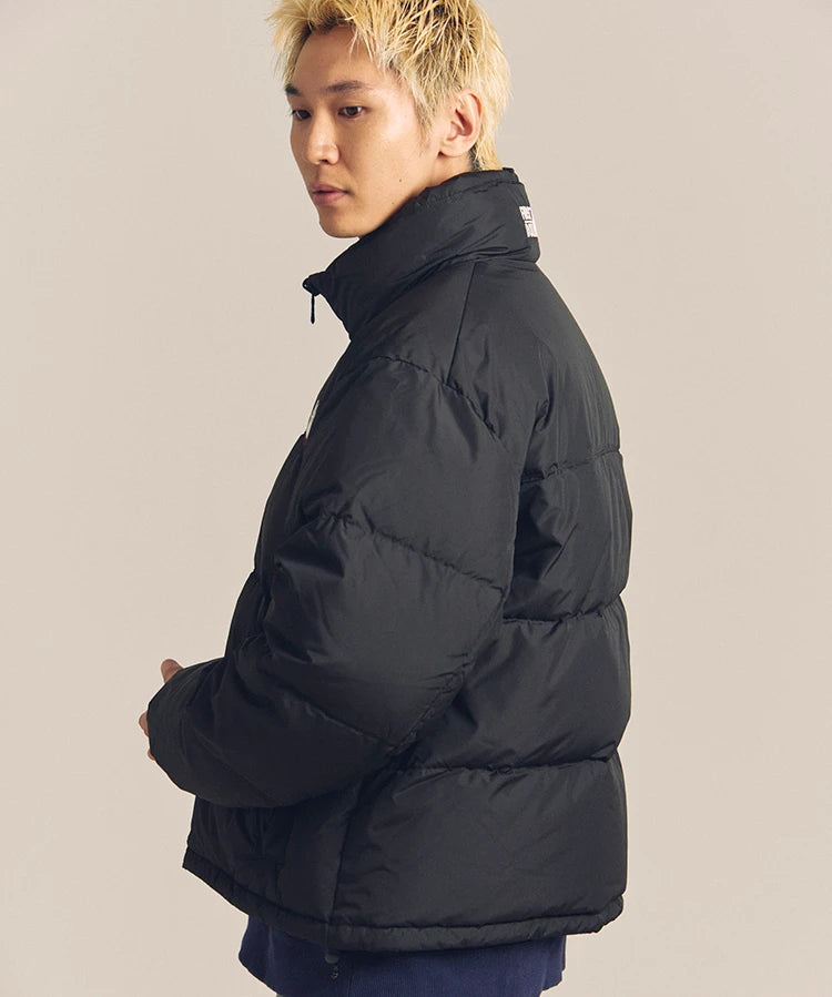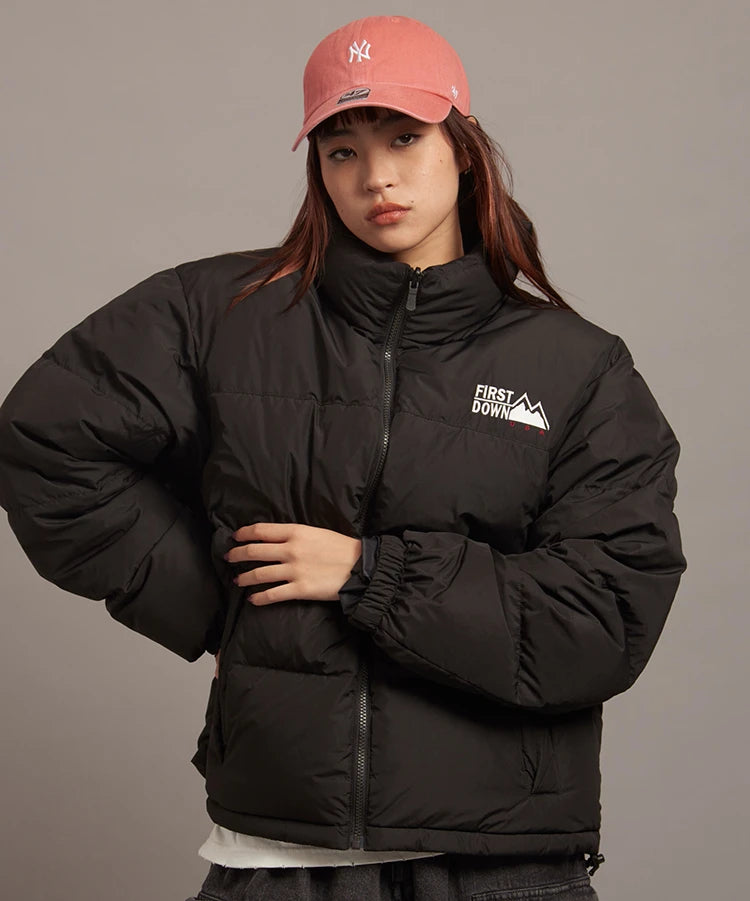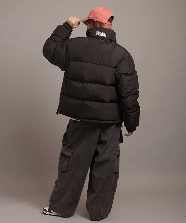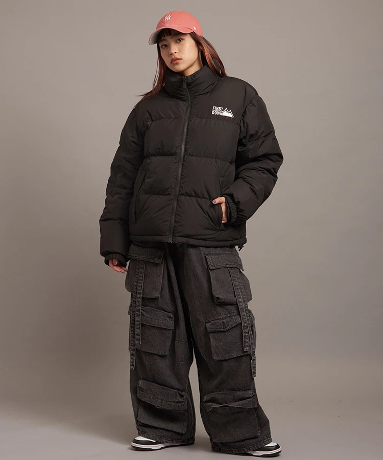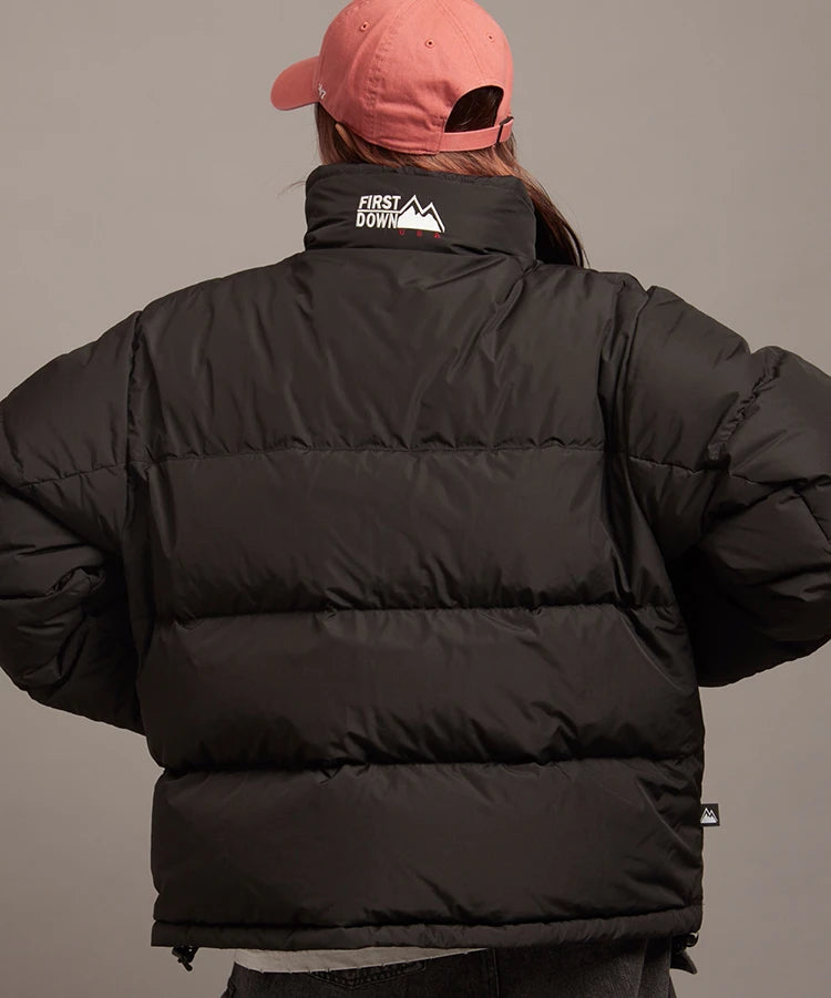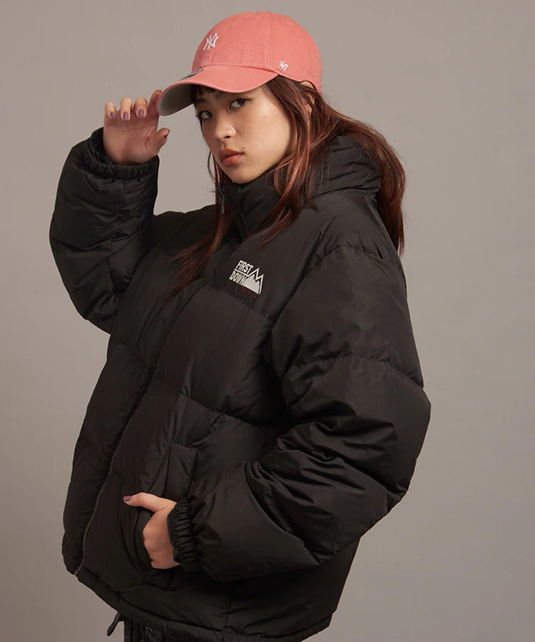FIRSTDOWNを象徴するバブルダウンジャケット。切り替えたとボリュームのある衿高デザインが特徴。2WAYリバーシブル仕様。裏側のカラーはブラックになります。表地は優れた防水性、撥水性がありながらも、透湿性を兼ね備えた蒸れにくい『帝人MICROFT』素材を使用。高品質といわれる700フィルパワーのダウンを使用。中綿はダウン90%フェザー10%のホワイトダックダウンを使用。またシワになりにくい素材の為、お手入れも簡単。表地の下にはDupont社が開発したポリエチレン不織布を入れる事により、独特の風合い・ハリ感をもたせている。トレーナーやパーカーなどカジュアルアイテムに合わせやすく、ワイドデニムパンツやカーゴパンツとの相性も良い。オーバーサイズの着こなしで、ユニセックスでも着用可能。