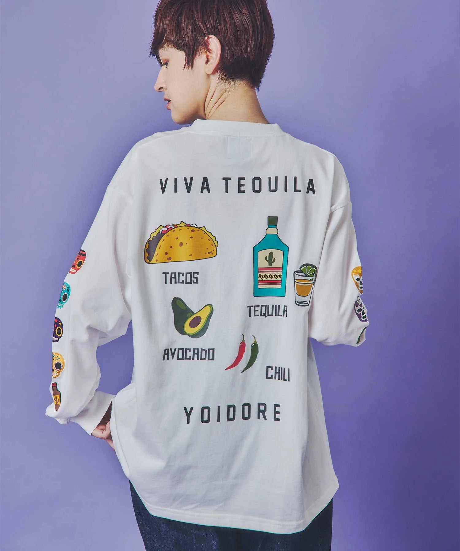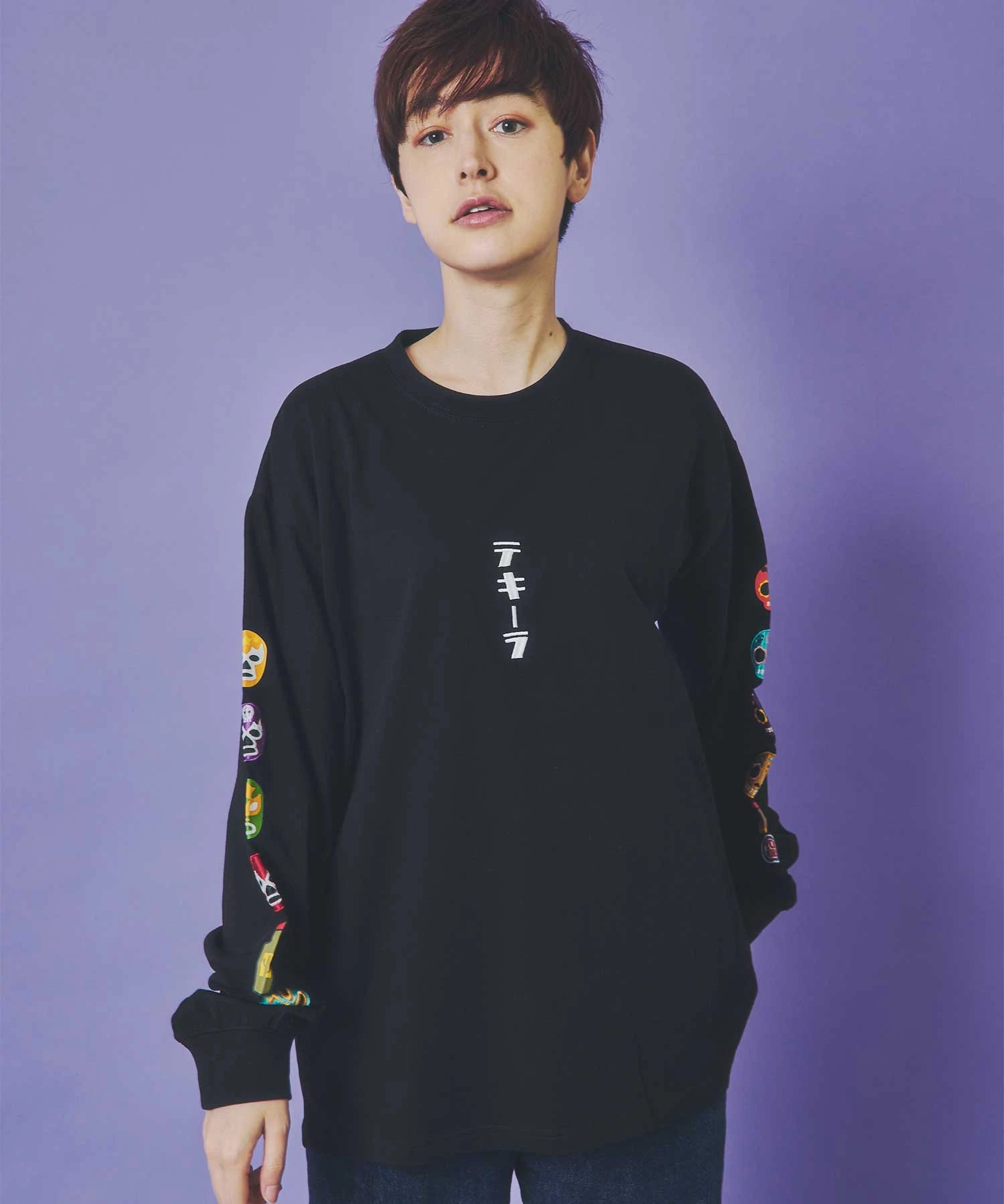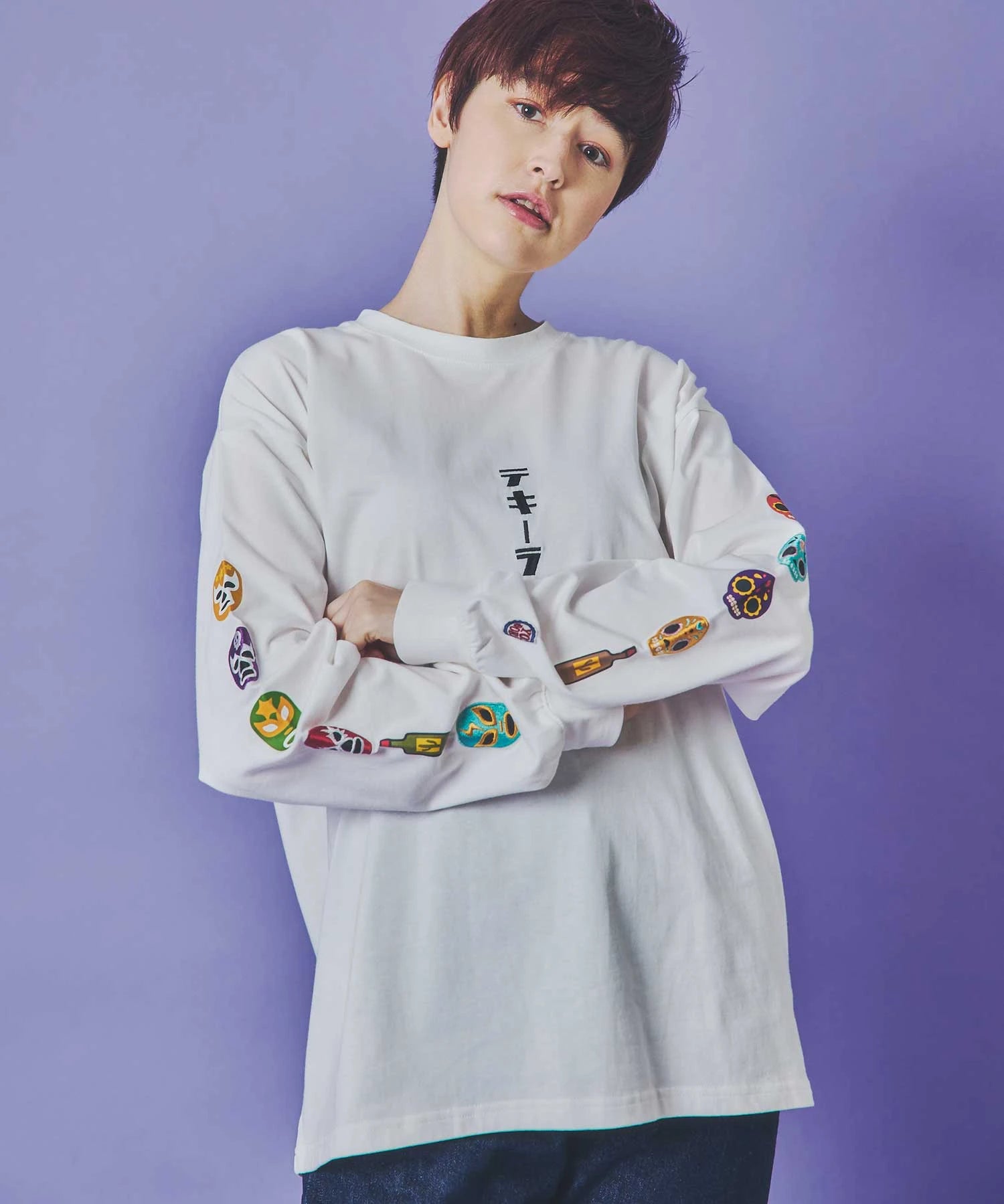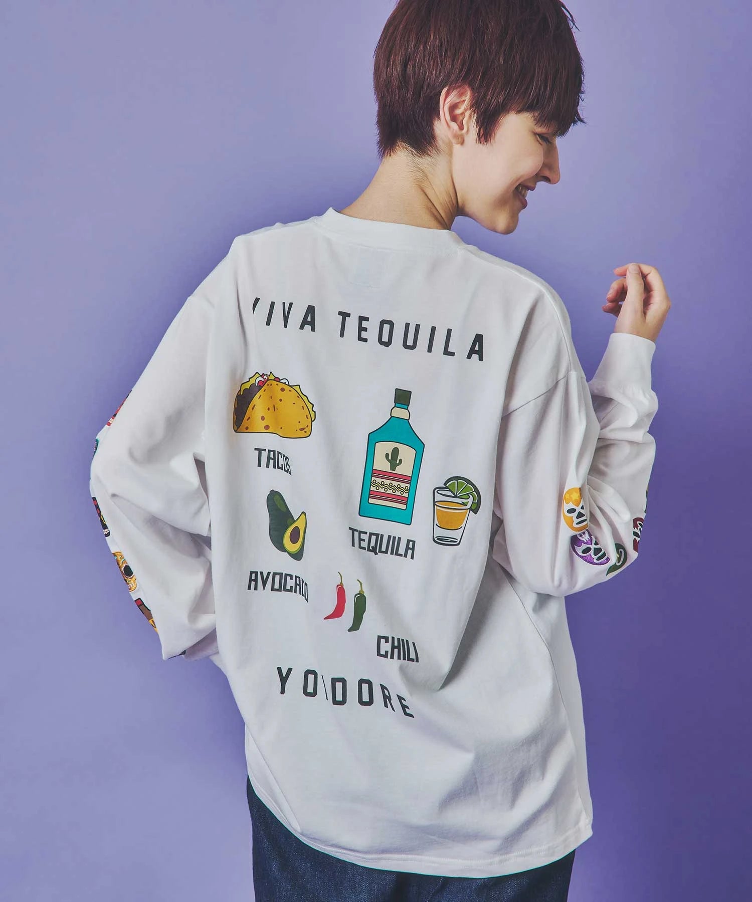 大好評のテキーラシリーズがロンTになって新登場!フロントは縦カタカナロゴでシンプルかつストレートにテキーラを表現!バックはテキーラと合わせて食べたいメキシカンフードたち。両袖にはシュガースカルとルチャリブレのマスクを刺繍ミックスであしらったポップで存在感抜群のロンTです。テキーラの母国にもリスペクトを捧げる、テキーラファンの必須アイテム!ややゆったりめのルーズなシルエットは適度なリラックス感があり、ラフな呑みシーンでのコーディネートに取り入れたいマストなアイテムです。ユニセックスで着用可能。