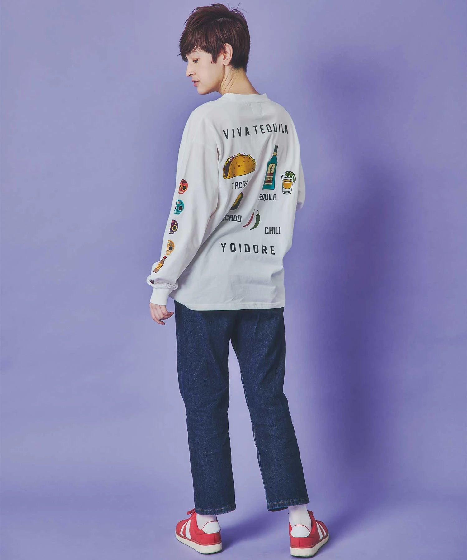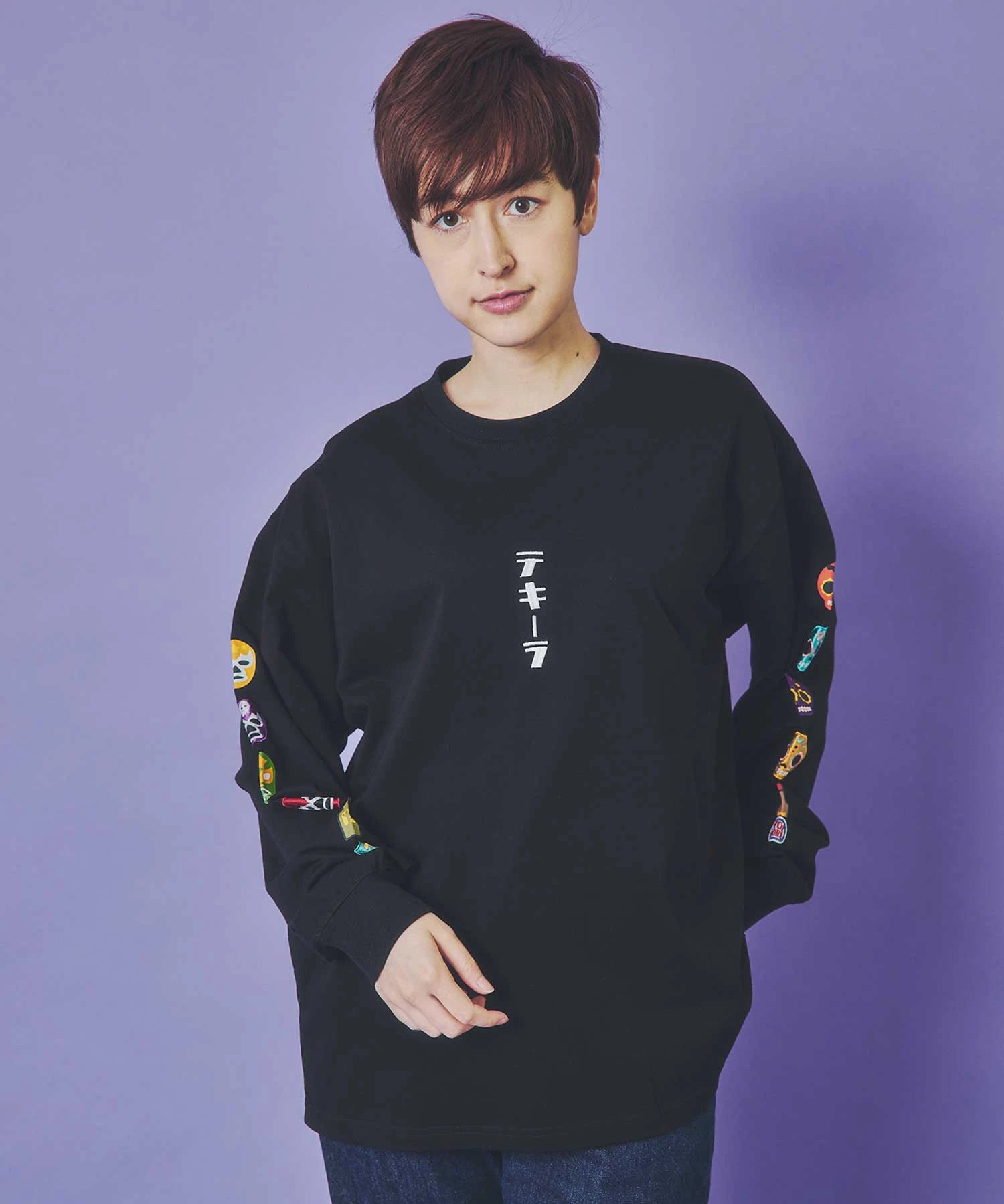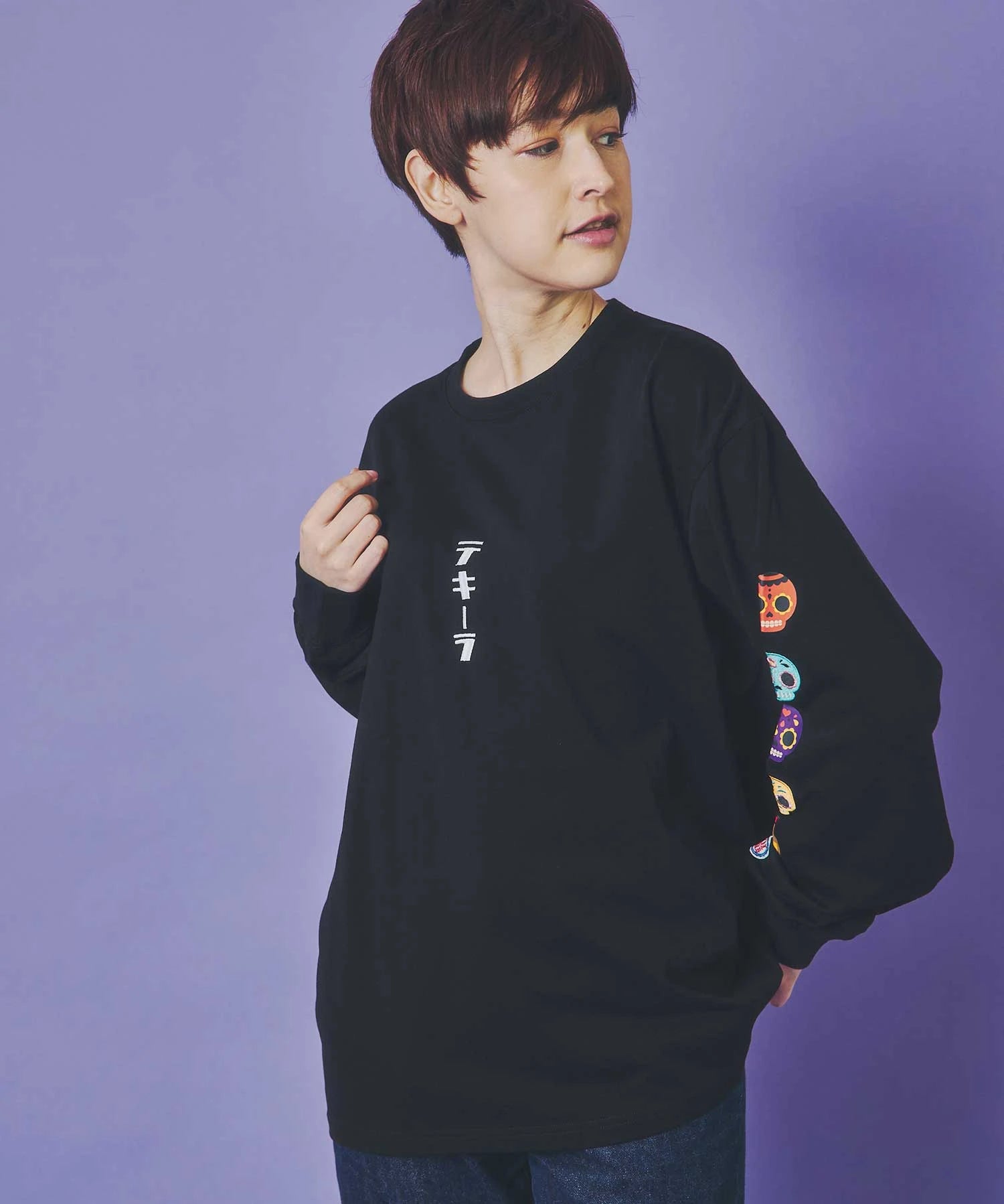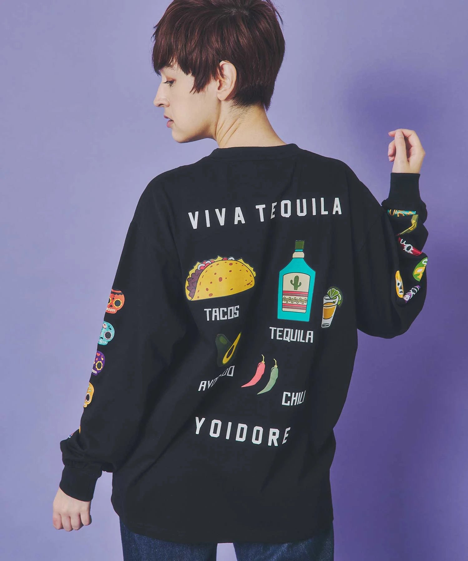 大好評のテキーラシリーズがロンTになって新登場!フロントは縦カタカナロゴでシンプルかつストレートにテキーラを表現!バックはテキーラと合わせて食べたいメキシカンフードたち。両袖にはシュガースカルとルチャリブレのマスクを刺繍ミックスであしらったポップで存在感抜群のロンTです。テキーラの母国にもリスペクトを捧げる、テキーラファンの必須アイテム!ややゆったりめのルーズなシルエットは適度なリラックス感があり、ラフな呑みシーンでのコーディネートに取り入れたいマストなアイテムです。ユニセックスで着用可能。