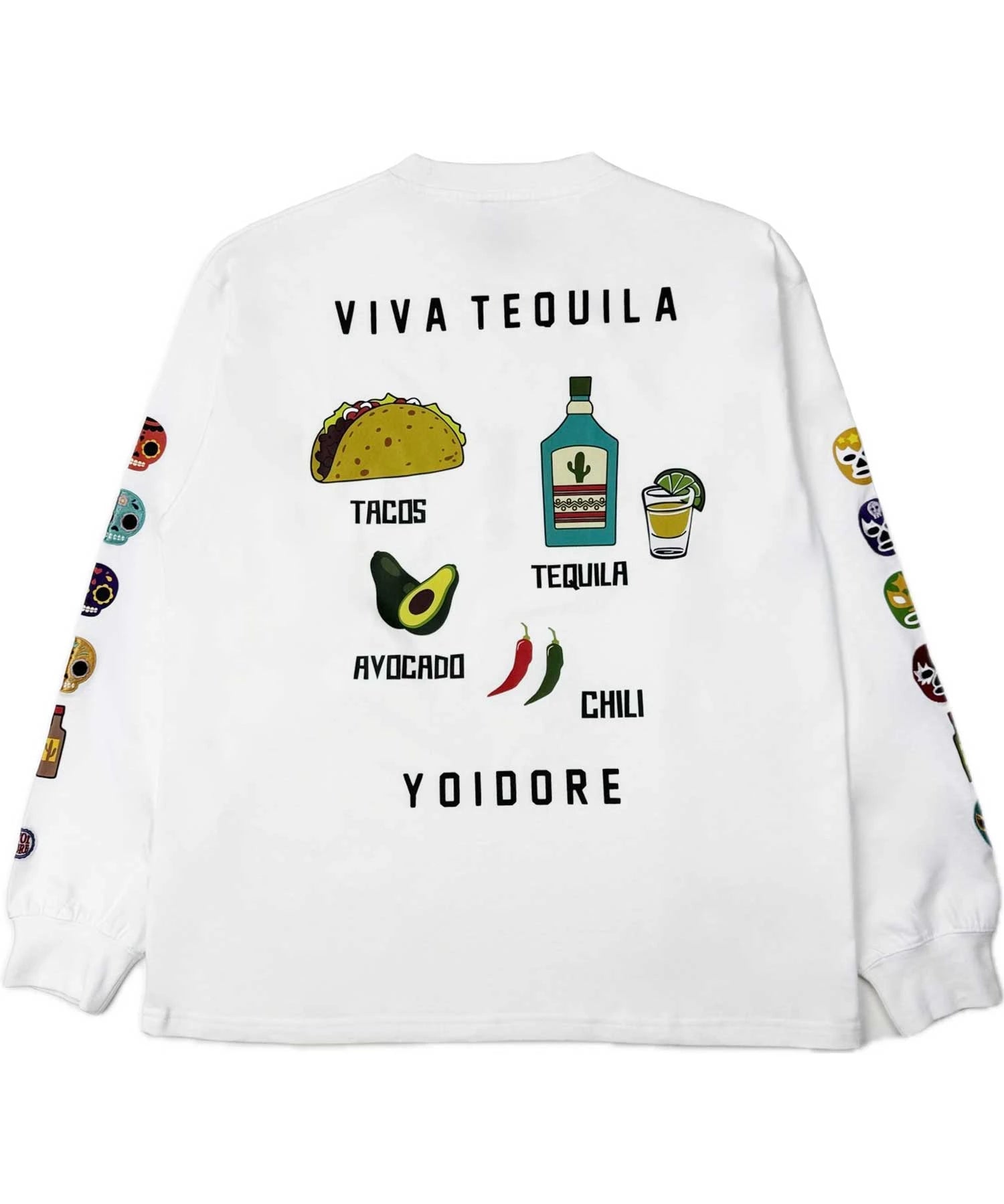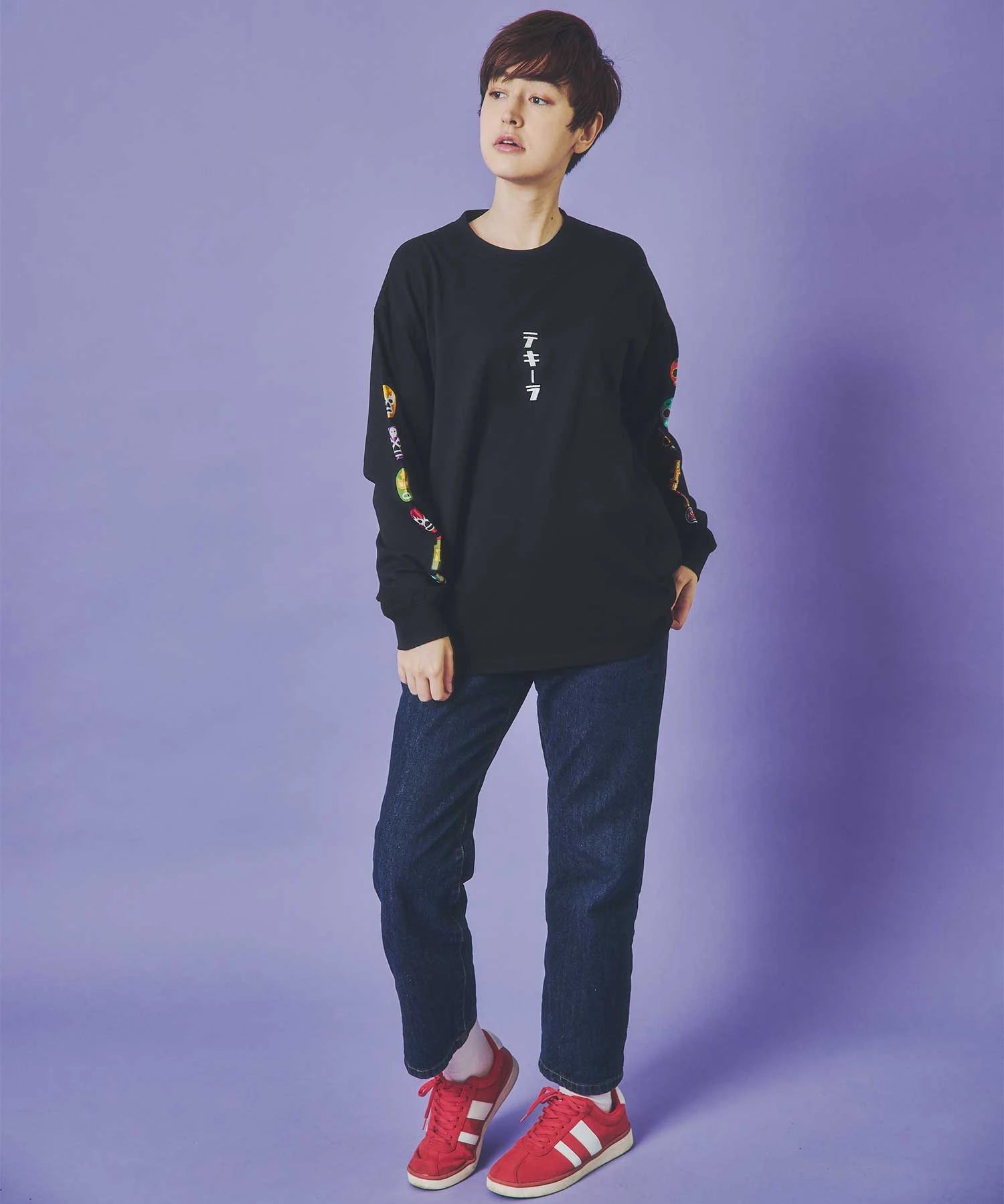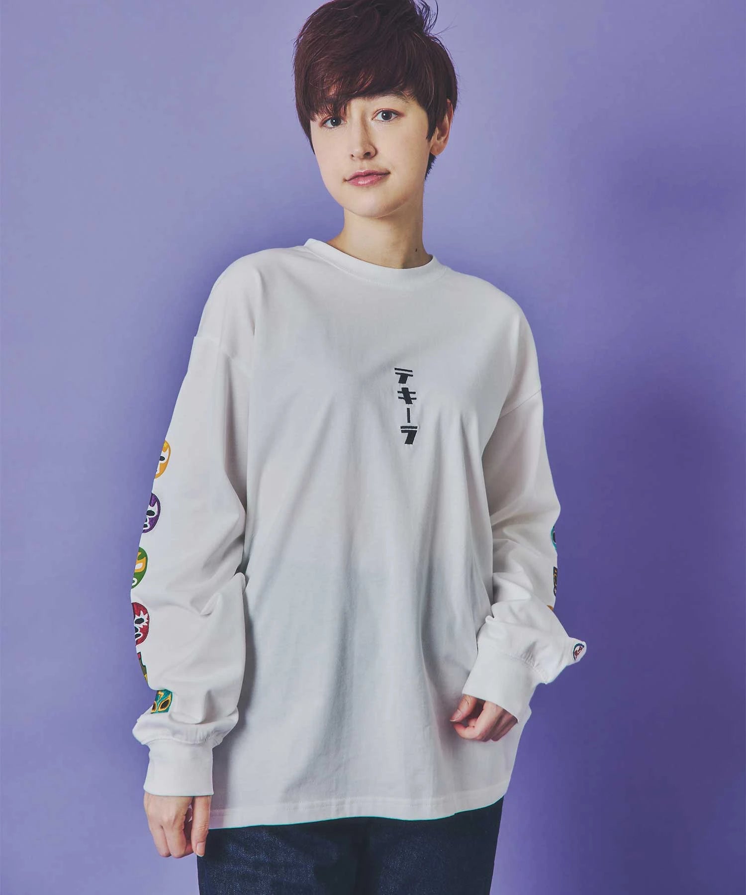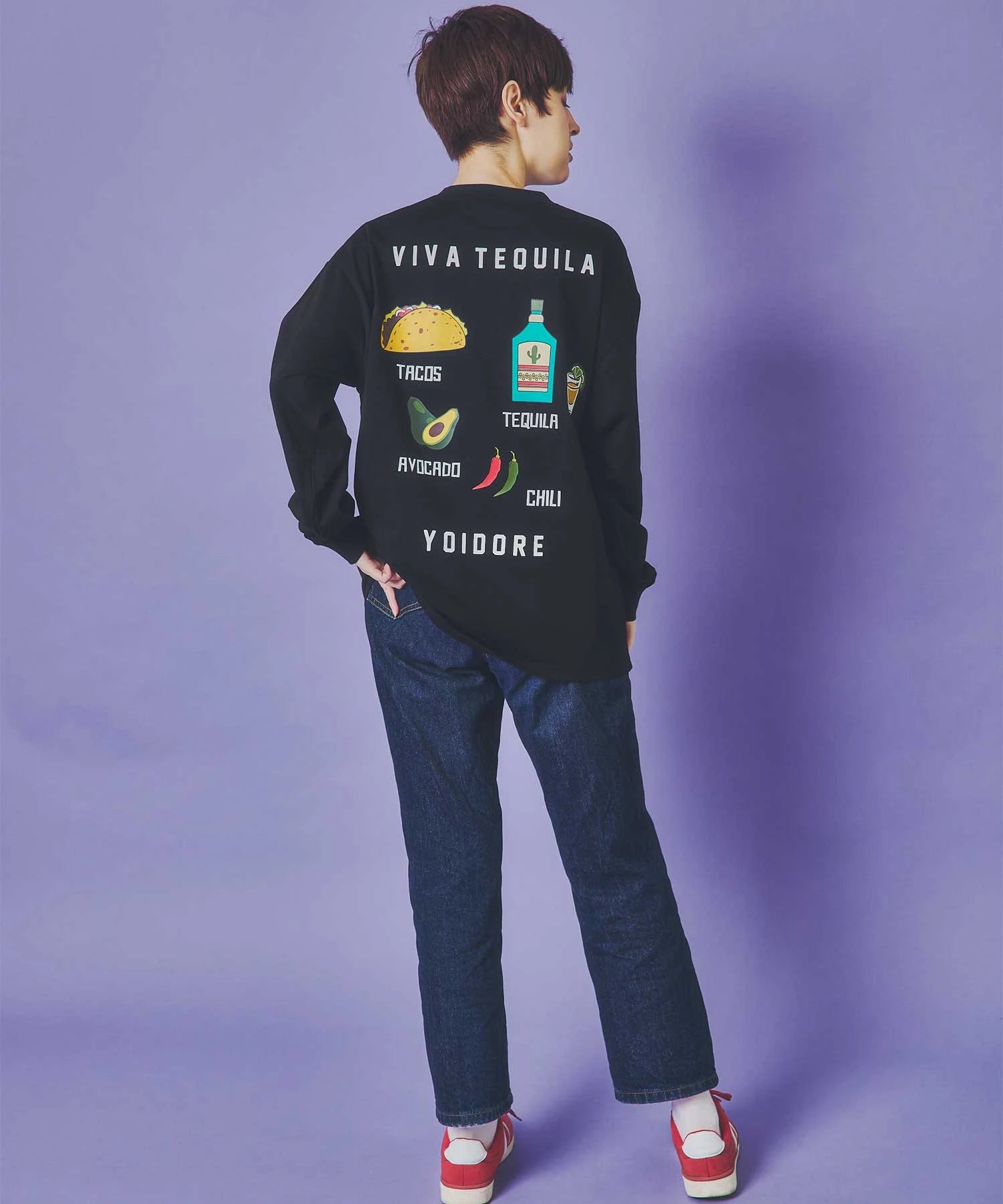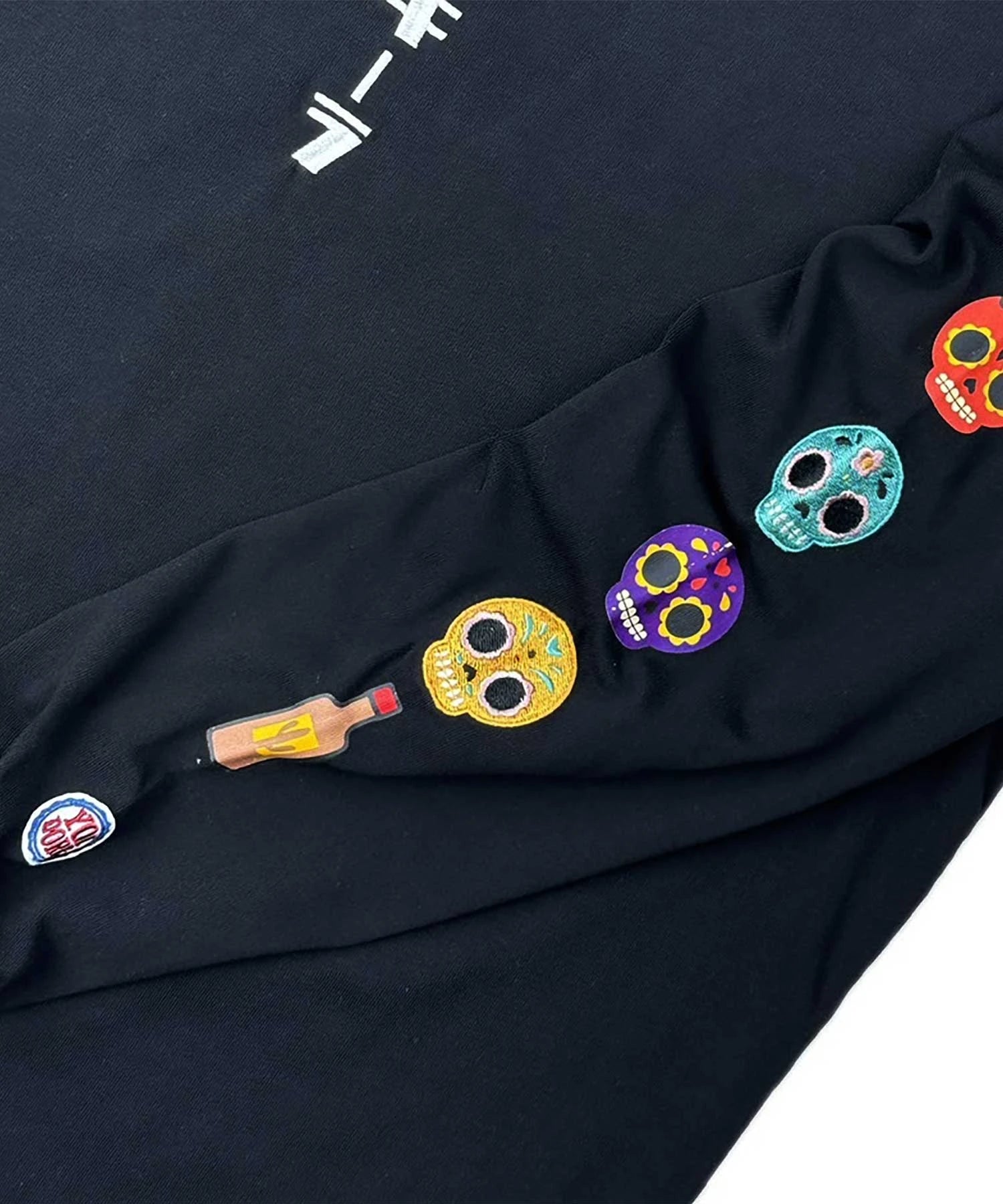 大好評のテキーラシリーズがロンTになって新登場!フロントは縦カタカナロゴでシンプルかつストレートにテキーラを表現!バックはテキーラと合わせて食べたいメキシカンフードたち。両袖にはシュガースカルとルチャリブレのマスクを刺繍ミックスであしらったポップで存在感抜群のロンTです。テキーラの母国にもリスペクトを捧げる、テキーラファンの必須アイテム!ややゆったりめのルーズなシルエットは適度なリラックス感があり、ラフな呑みシーンでのコーディネートに取り入れたいマストなアイテムです。ユニセックスで着用可能。