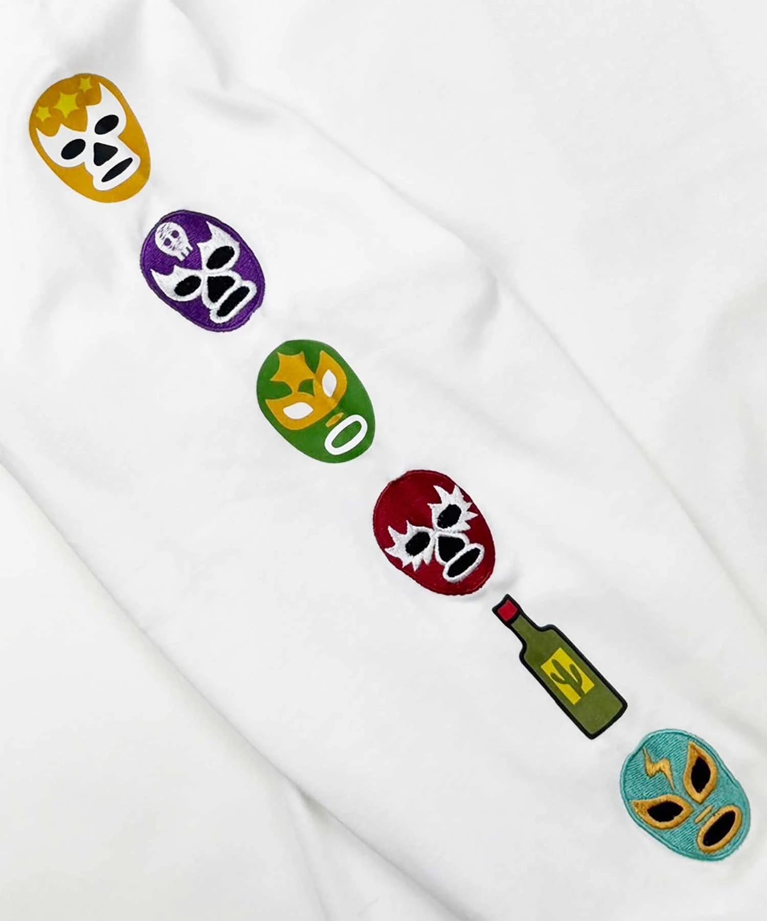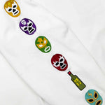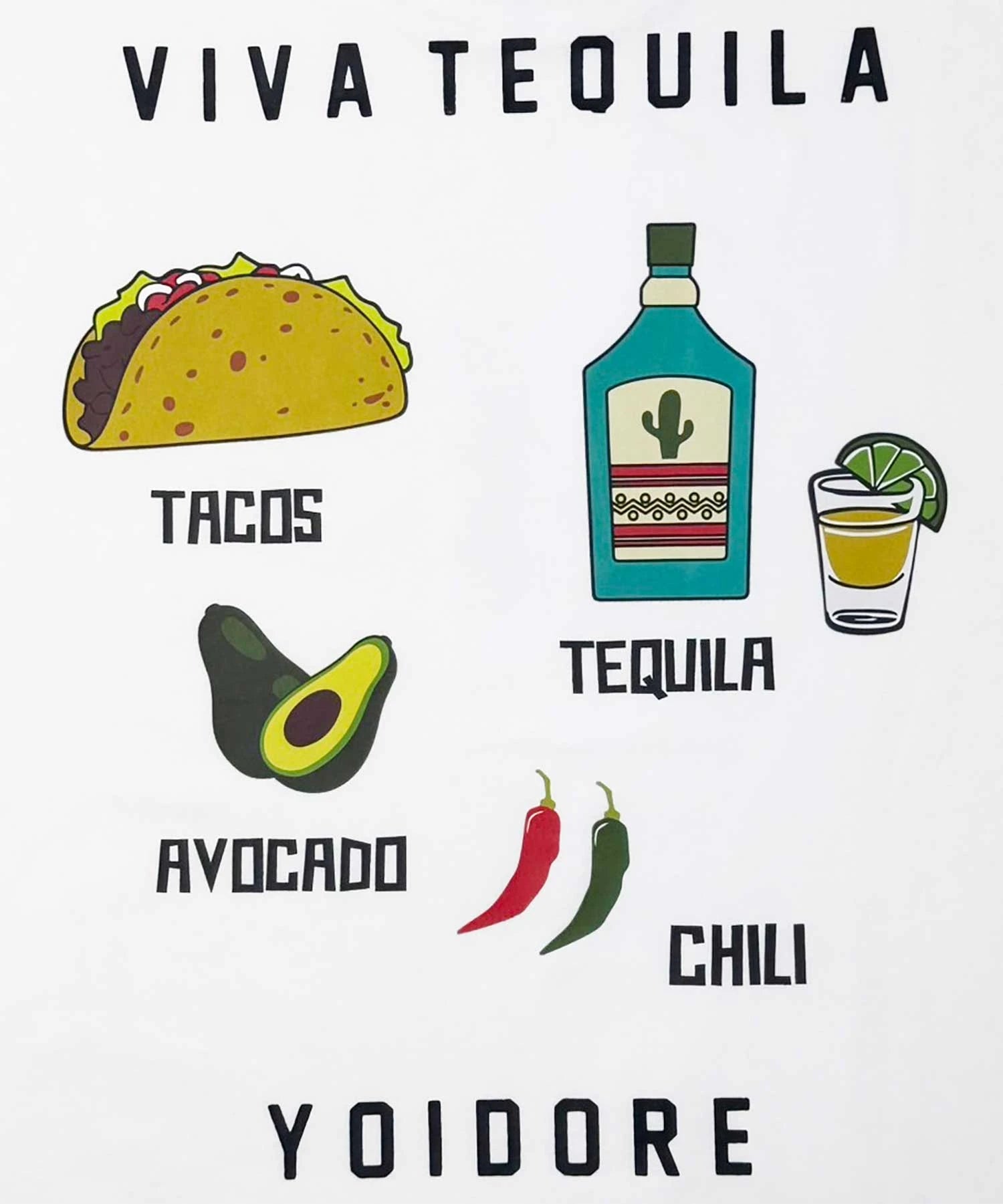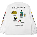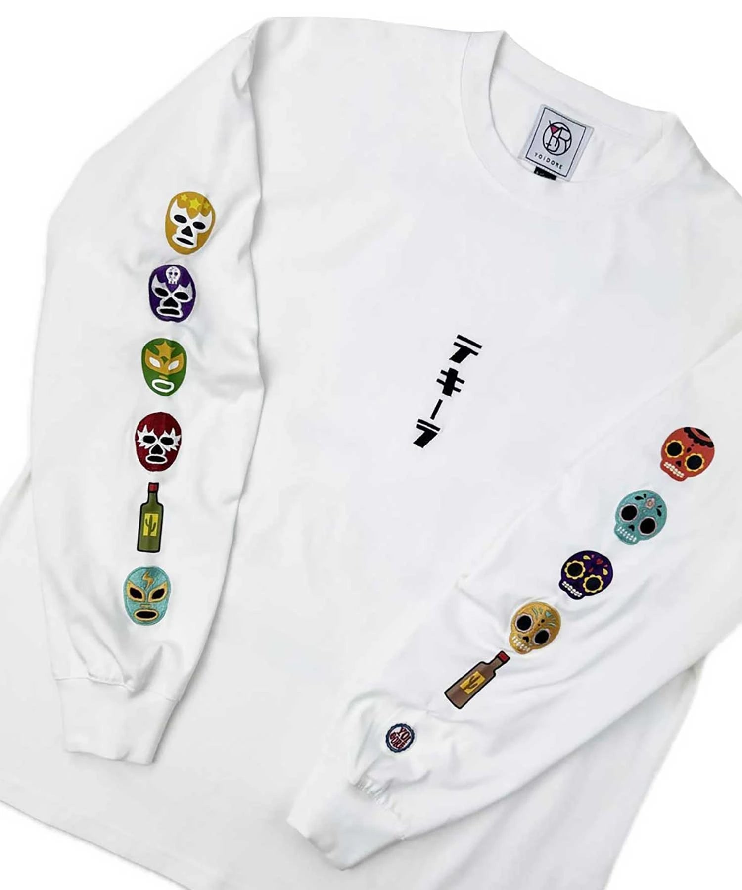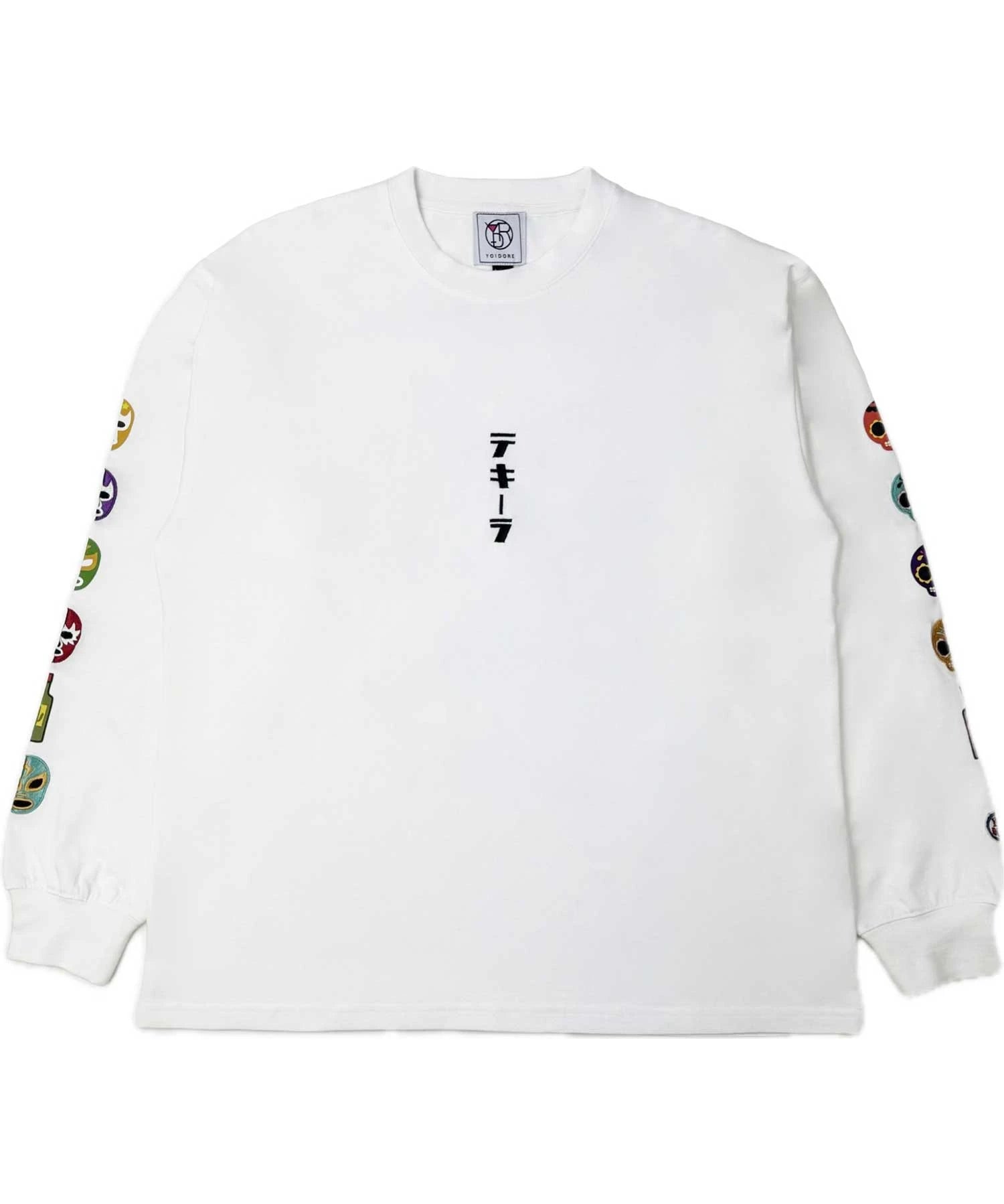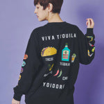 大好評のテキーラシリーズがロンTになって新登場!フロントは縦カタカナロゴでシンプルかつストレートにテキーラを表現!バックはテキーラと合わせて食べたいメキシカンフードたち。両袖にはシュガースカルとルチャリブレのマスクを刺繍ミックスであしらったポップで存在感抜群のロンTです。テキーラの母国にもリスペクトを捧げる、テキーラファンの必須アイテム!ややゆったりめのルーズなシルエットは適度なリラックス感があり、ラフな呑みシーンでのコーディネートに取り入れたいマストなアイテムです。ユニセックスで着用可能。