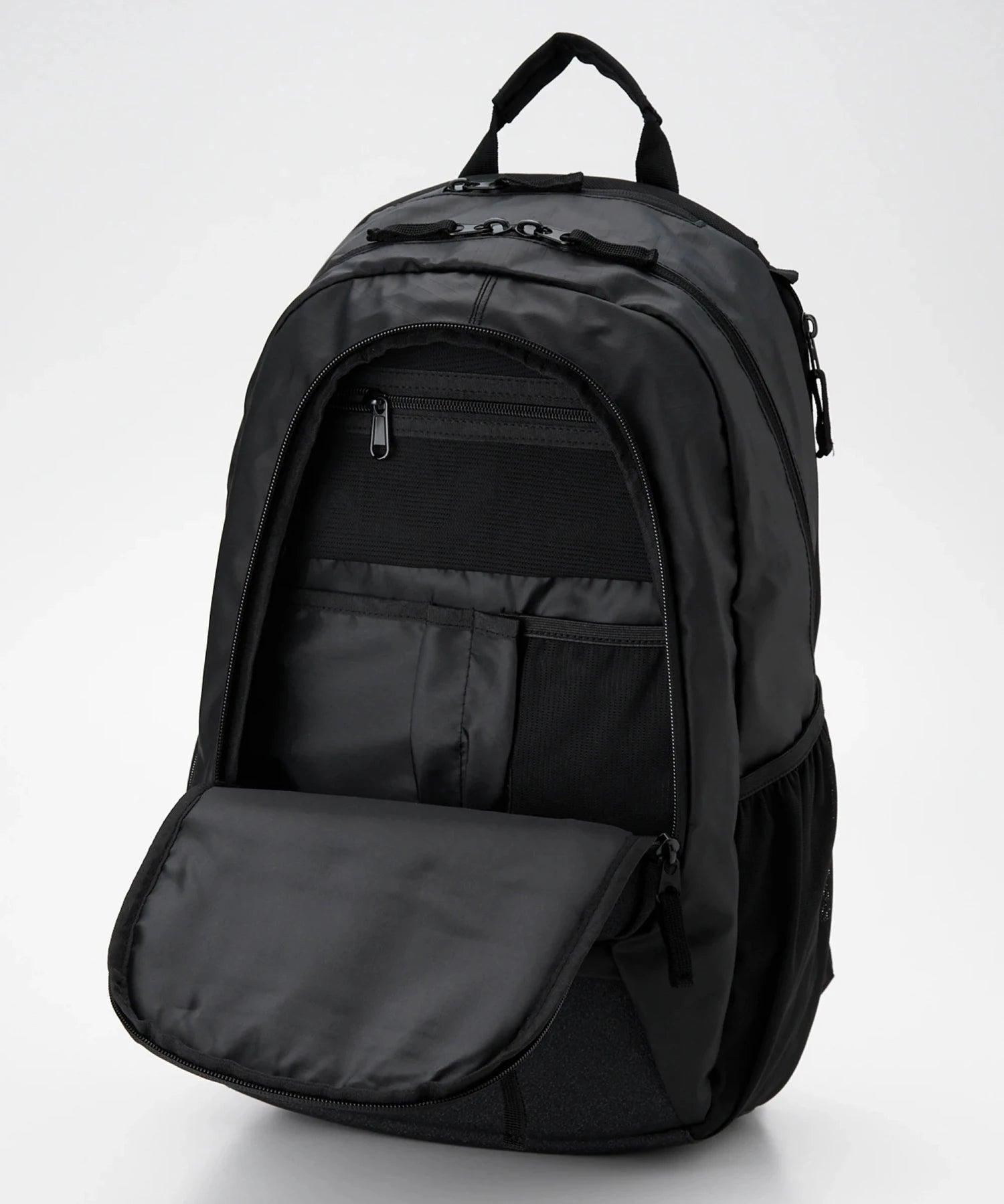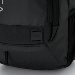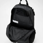 雨を弾く撥水性と強度を備えたリサイクルポリエステルを使用した実用性の高いアイテム。大容量のメインコンパートメントに加え、小物を整理できるフロントポケットを搭載。さらに、フリース裏地のサングラス専用ポケットやサイドポケット、利便性に優れたパネルジッパーポケットなど、多彩な収納機能を備えています。シーンを選ばず使える汎用性の高いサイズ感で、デイリーからアウトドアまで幅広く活躍するバックパックです。