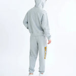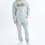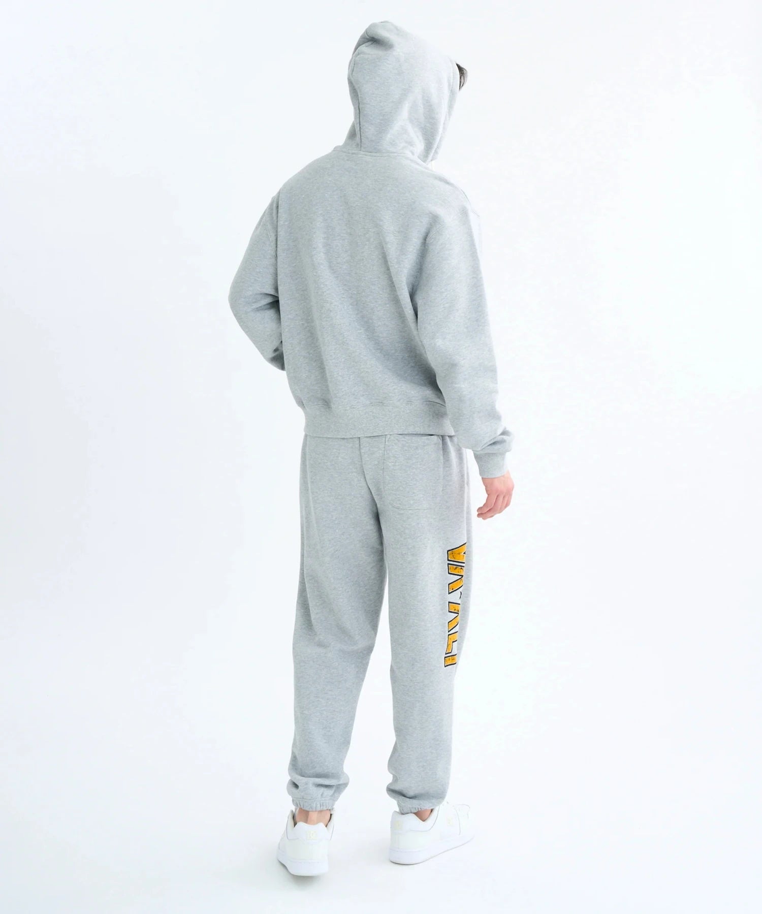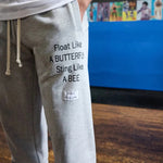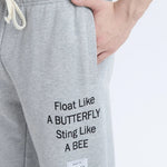 モハメド・アリとのコラボレーションによる特別なスウェットパンツです。コットンポリエステルのヘビーウェイトなツイル裏毛素材を使用し、快適なリラックスフィットを実現。ウエストはゴムとドローコードで調整可能で、フロントにウェルトポケット、バックにパッチポケットを配置しています。左脚にはスクリーンプリントと織りネーム、右脚にはフロッキーと刺繍を組み合わせたフェルトアップリケを施し、存在感のあるデザインに。裾はゴム入りで足元をすっきり見せ、ポケット裏地には柔らかなジャージー素材を採用するなど、デザイン性と機能性を兼ね備えた一本です。オーバーサイズの着こなしで、ユニセックスで着用可能。