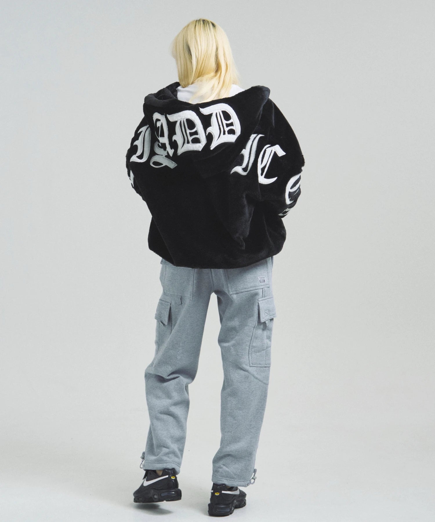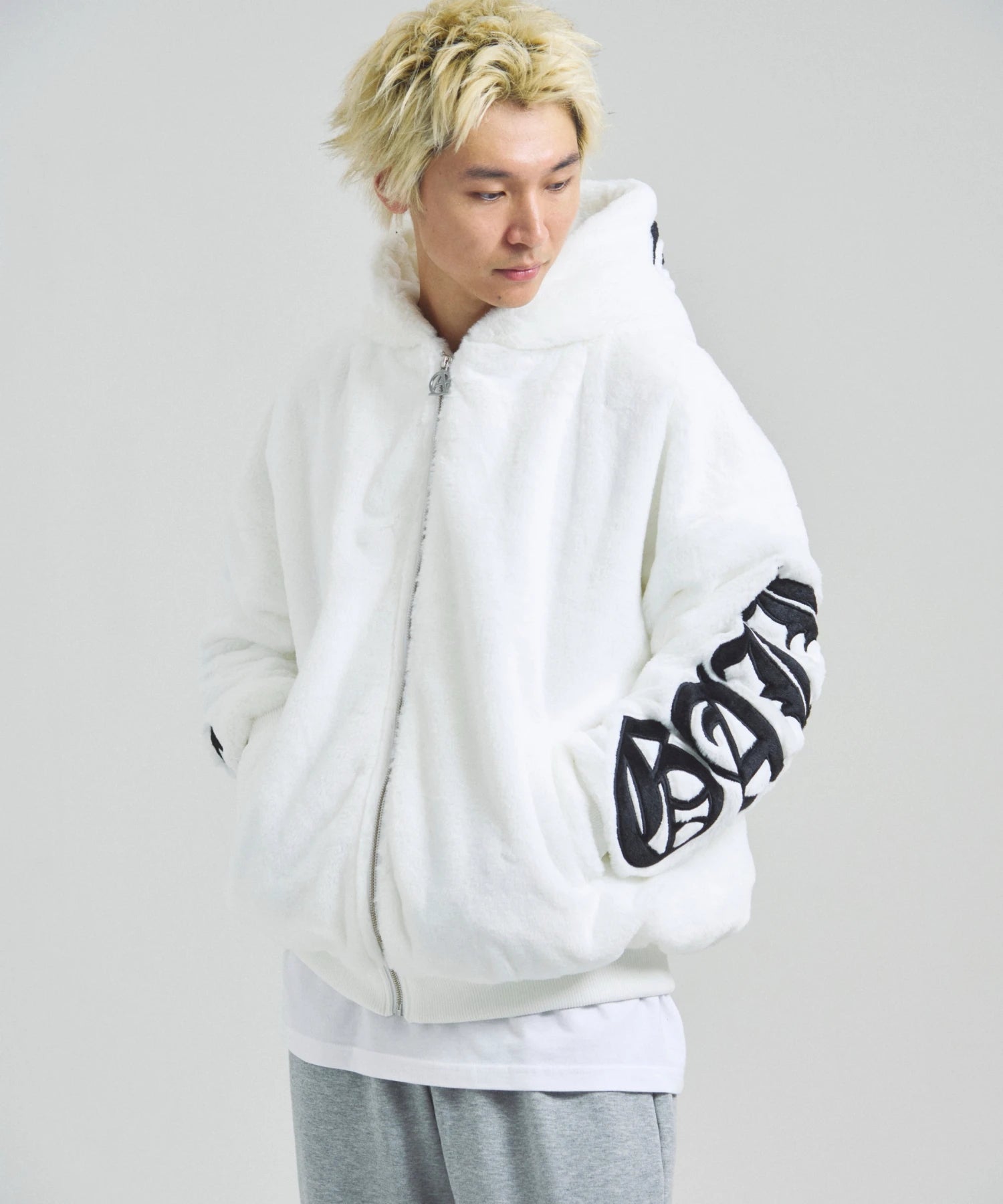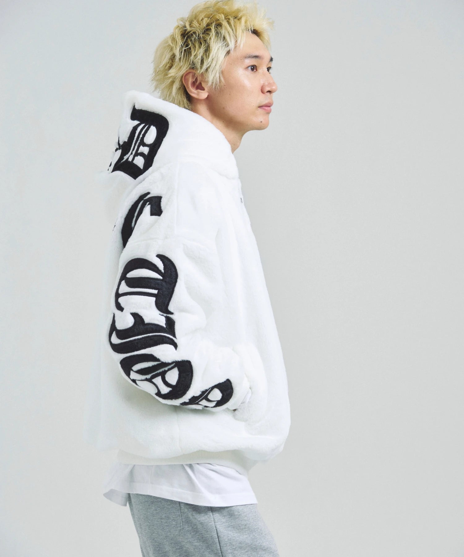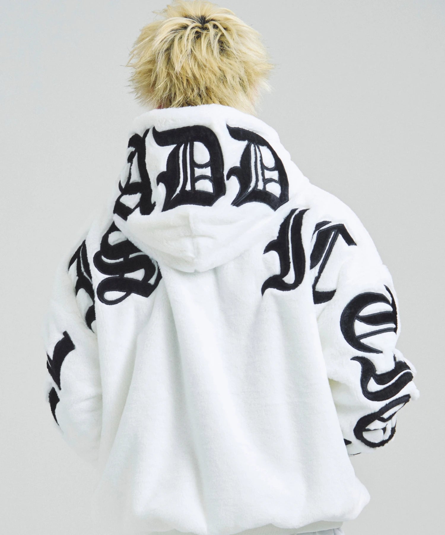 圧倒的な存在感を放つオールドイングリッシュロゴが印象的な、GALLIS ADDICTIONのファーブルゾン。毛足の長いフェイクファー素材を贅沢に使用し、ふんわりとした肌触りと高い保温性を両立。軽量で柔らかな着心地が魅力で、ストリートからデイリーまで幅広いスタイリングに対応します。フロントはシンプルなジップアップ仕様ながら、バックに大胆に施されたブランドロゴ刺繍が視線を惹きつけるデザイン。オーバーサイズのシルエットで、ユニセックスに着用可能。トレンド感のあるルーズなフォルムと、GALLIS ADDICTIONらしいエッジの効いたグラフィックが融合した一着は、羽織るだけでコーディネートにインパクトを与える主役級アイテムです。カラー展開はホワイト、ブラック、オレンジの3色。個性に合わせて選べるバリエーションも魅力です。