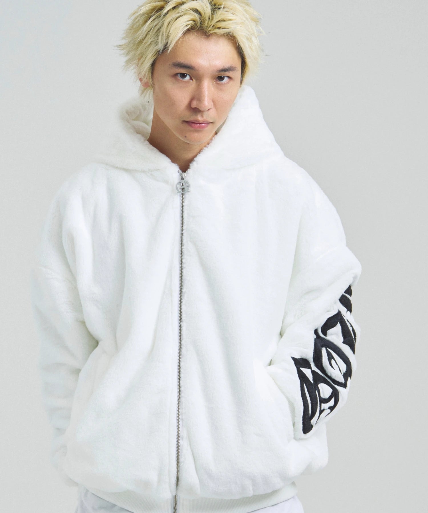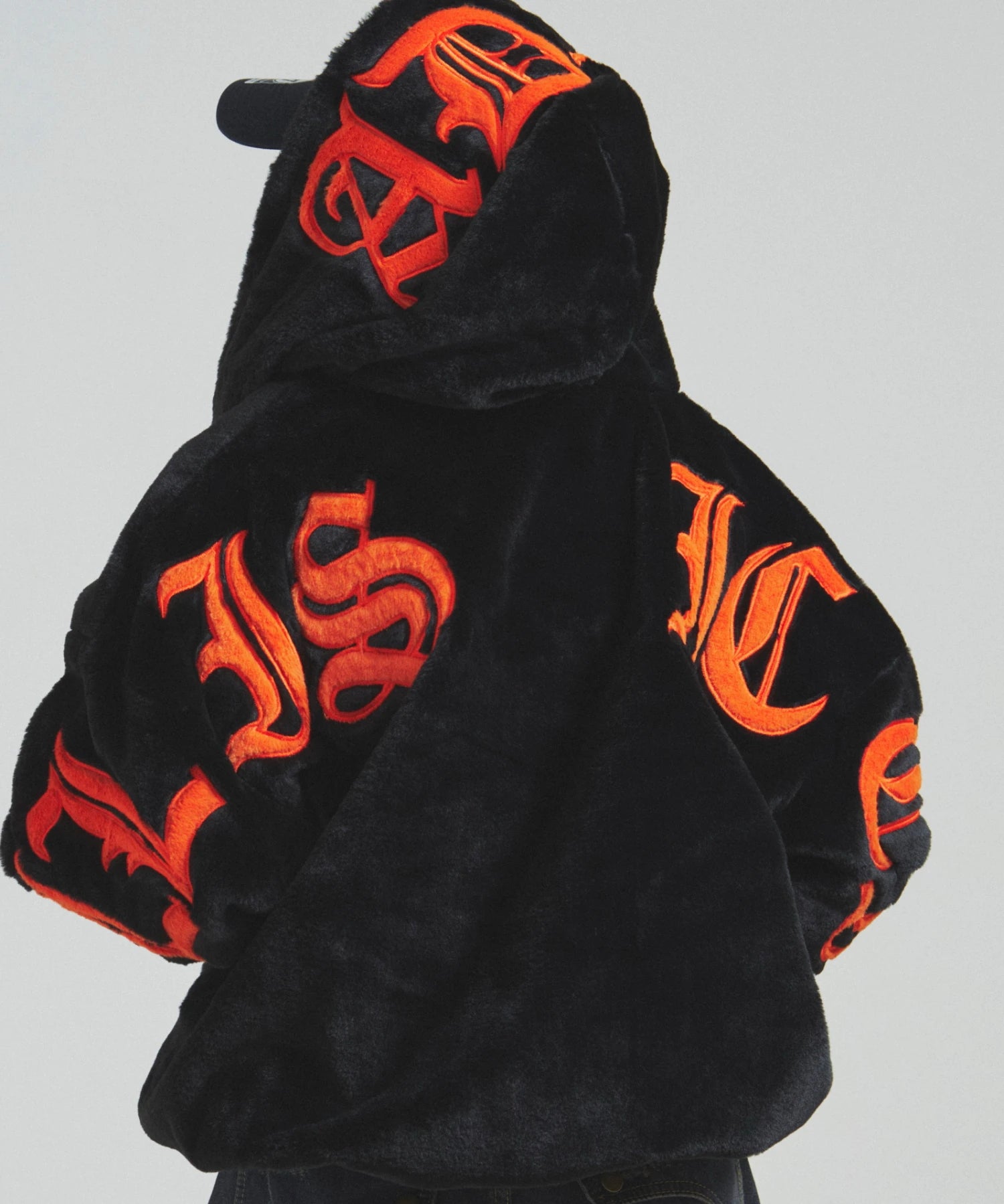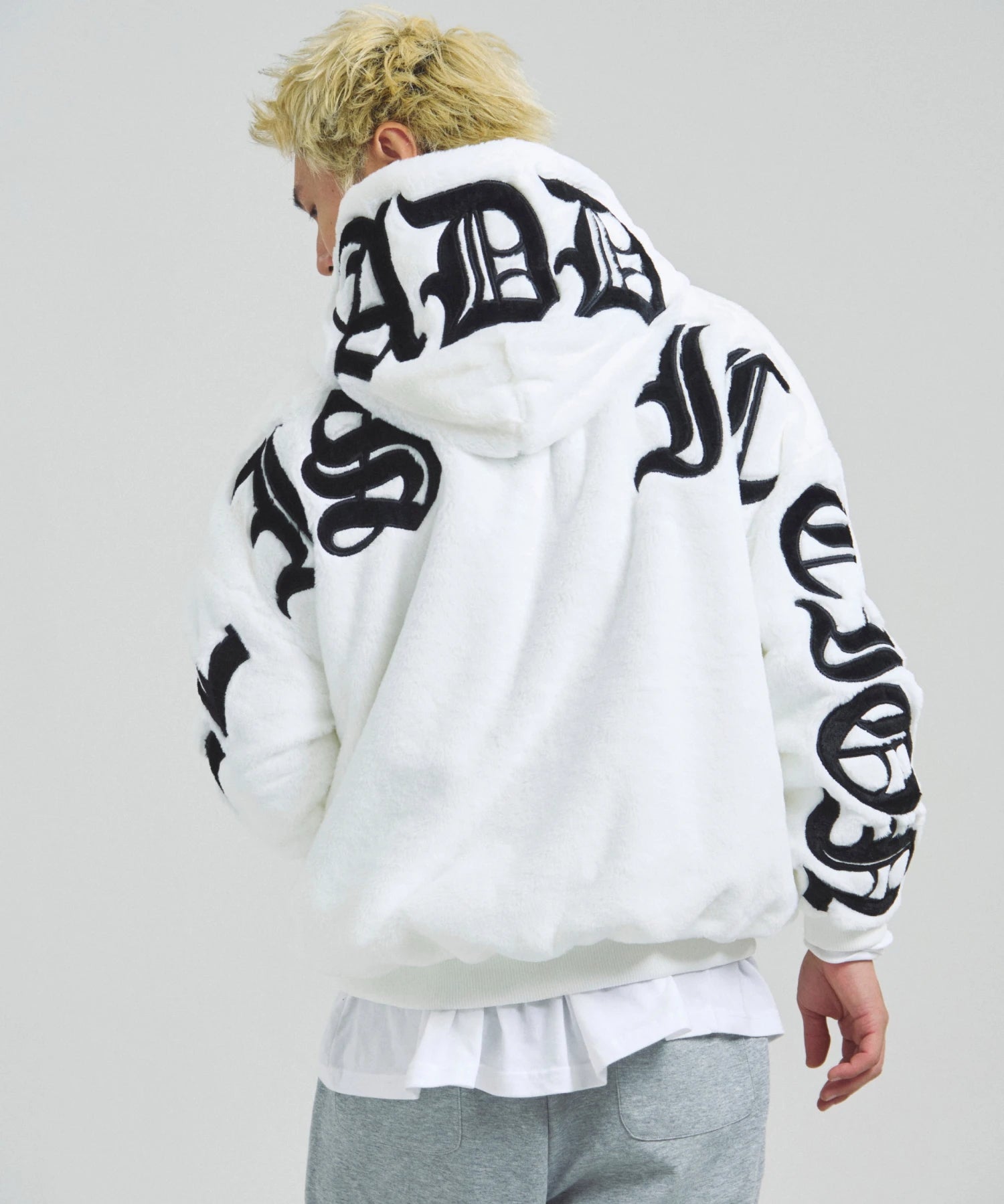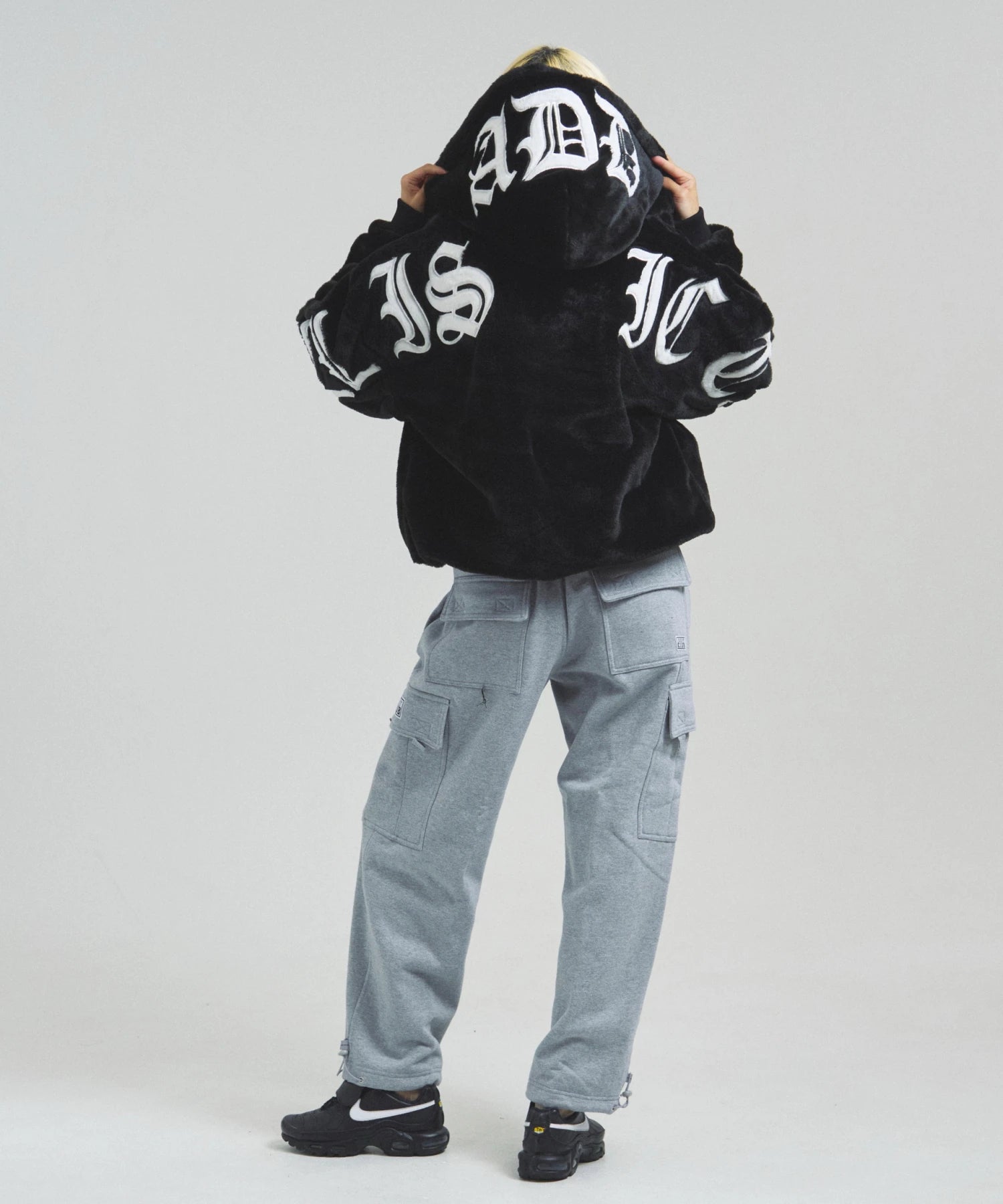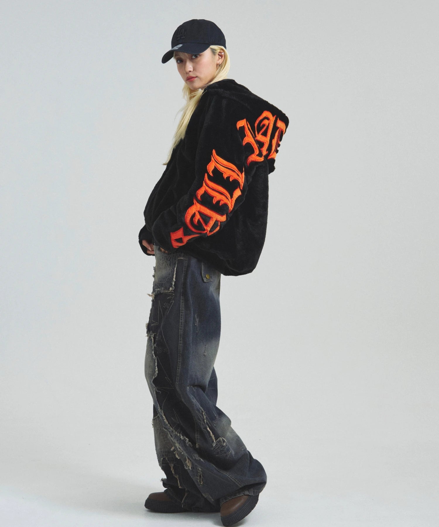 圧倒的な存在感を放つオールドイングリッシュロゴが印象的な、GALLIS ADDICTIONのファーブルゾン。毛足の長いフェイクファー素材を贅沢に使用し、ふんわりとした肌触りと高い保温性を両立。軽量で柔らかな着心地が魅力で、ストリートからデイリーまで幅広いスタイリングに対応します。フロントはシンプルなジップアップ仕様ながら、バックに大胆に施されたブランドロゴ刺繍が視線を惹きつけるデザイン。オーバーサイズのシルエットで、ユニセックスに着用可能。トレンド感のあるルーズなフォルムと、GALLIS ADDICTIONらしいエッジの効いたグラフィックが融合した一着は、羽織るだけでコーディネートにインパクトを与える主役級アイテムです。カラー展開はホワイト、ブラック、オレンジの3色。個性に合わせて選べるバリエーションも魅力です。