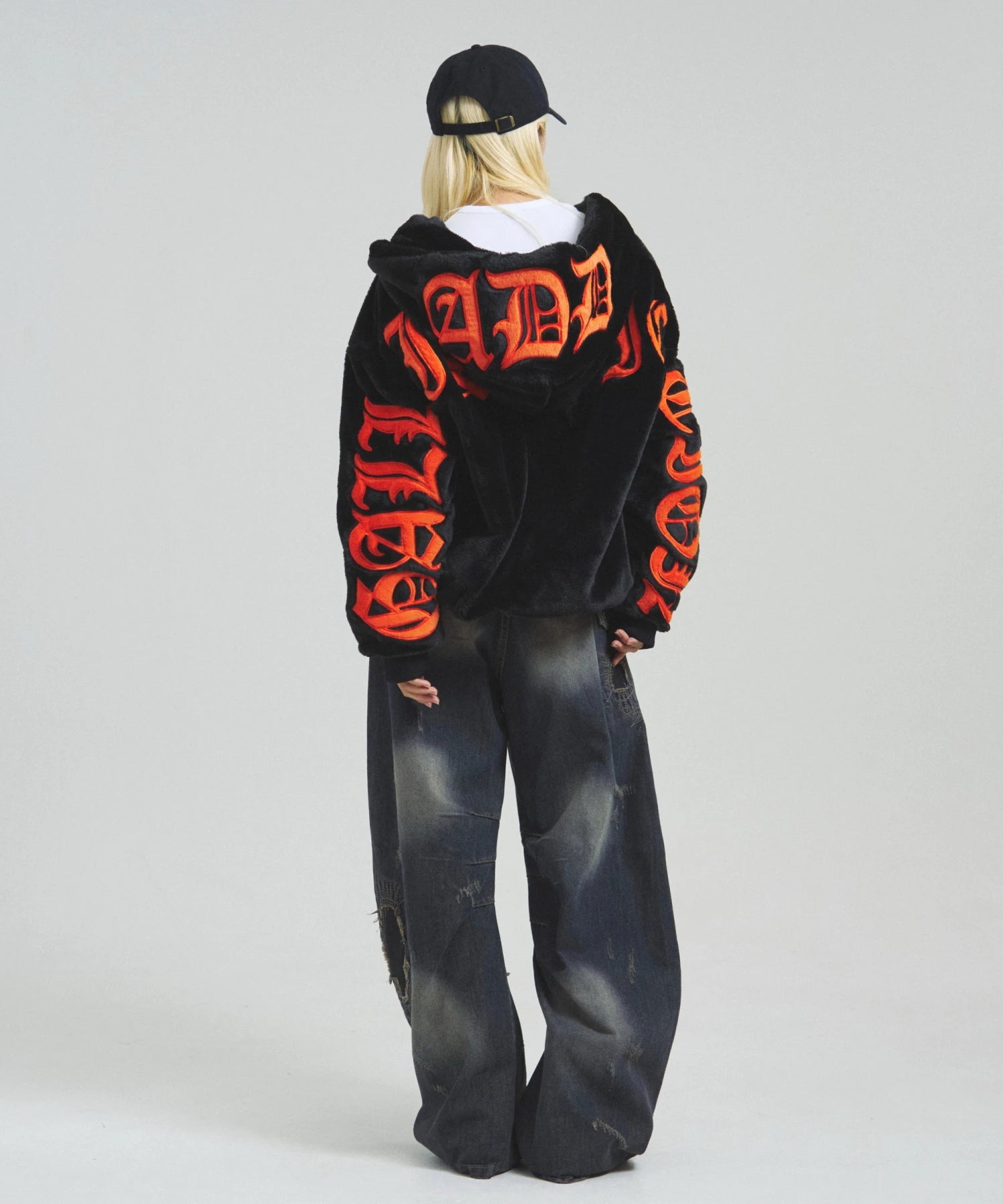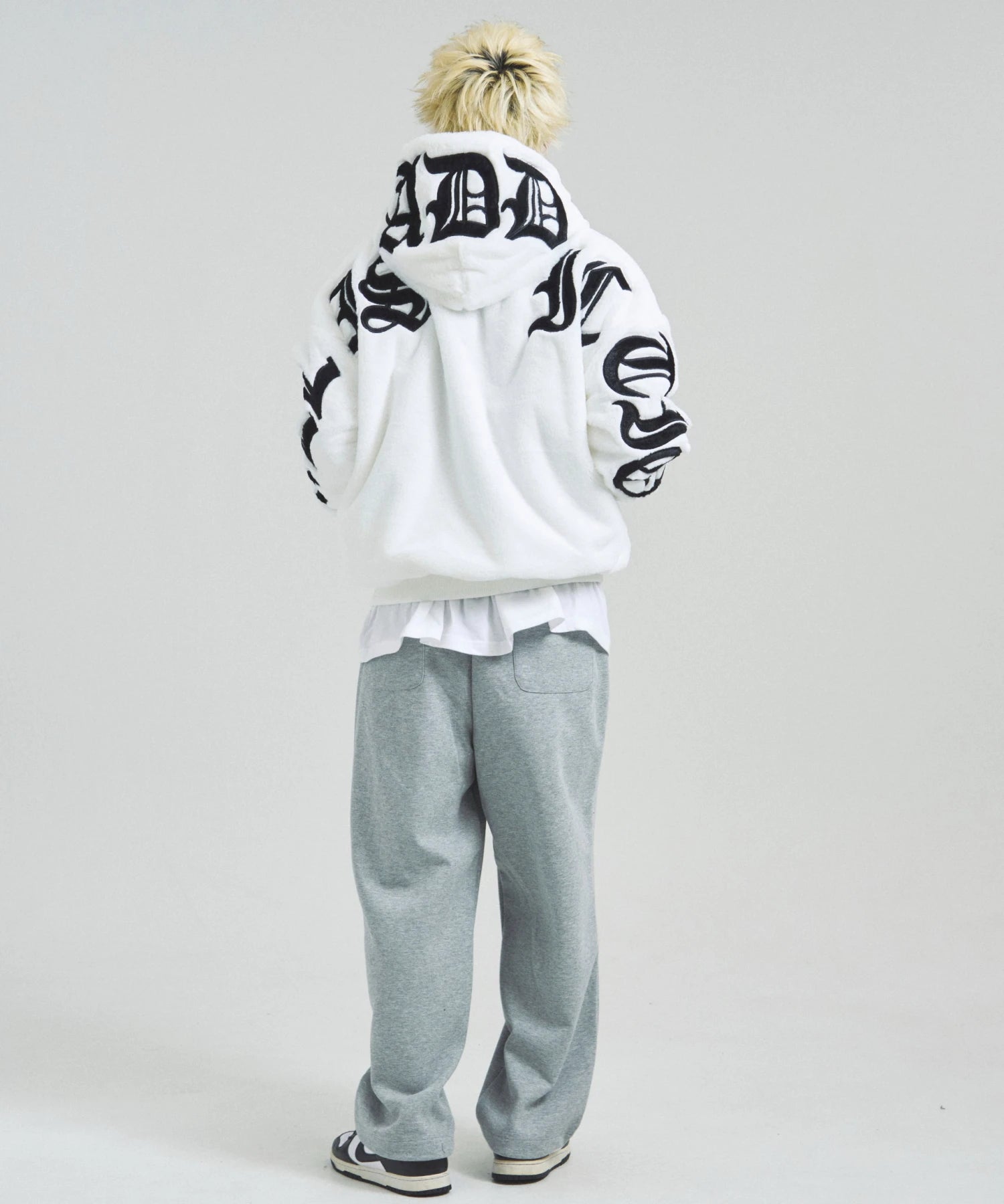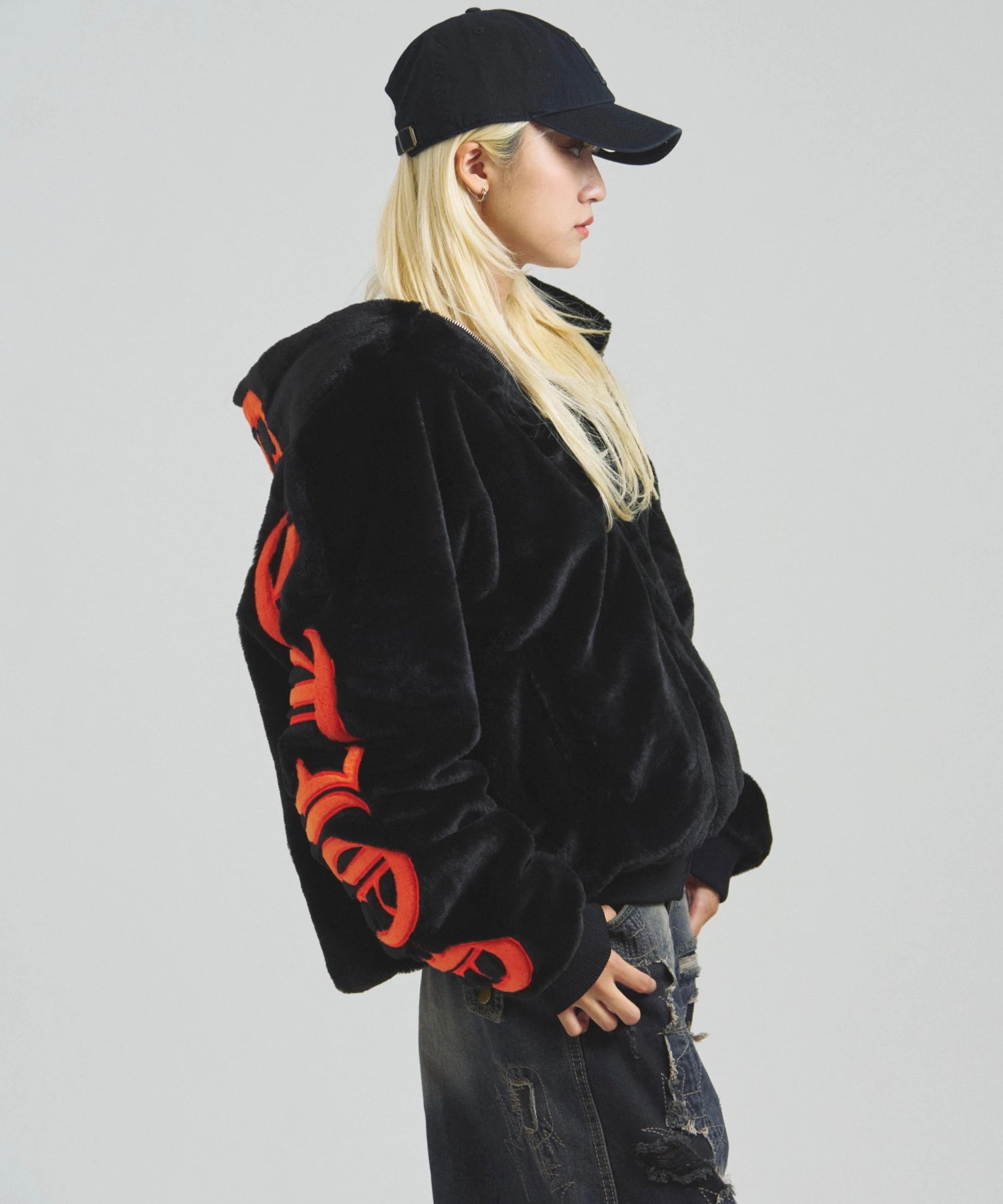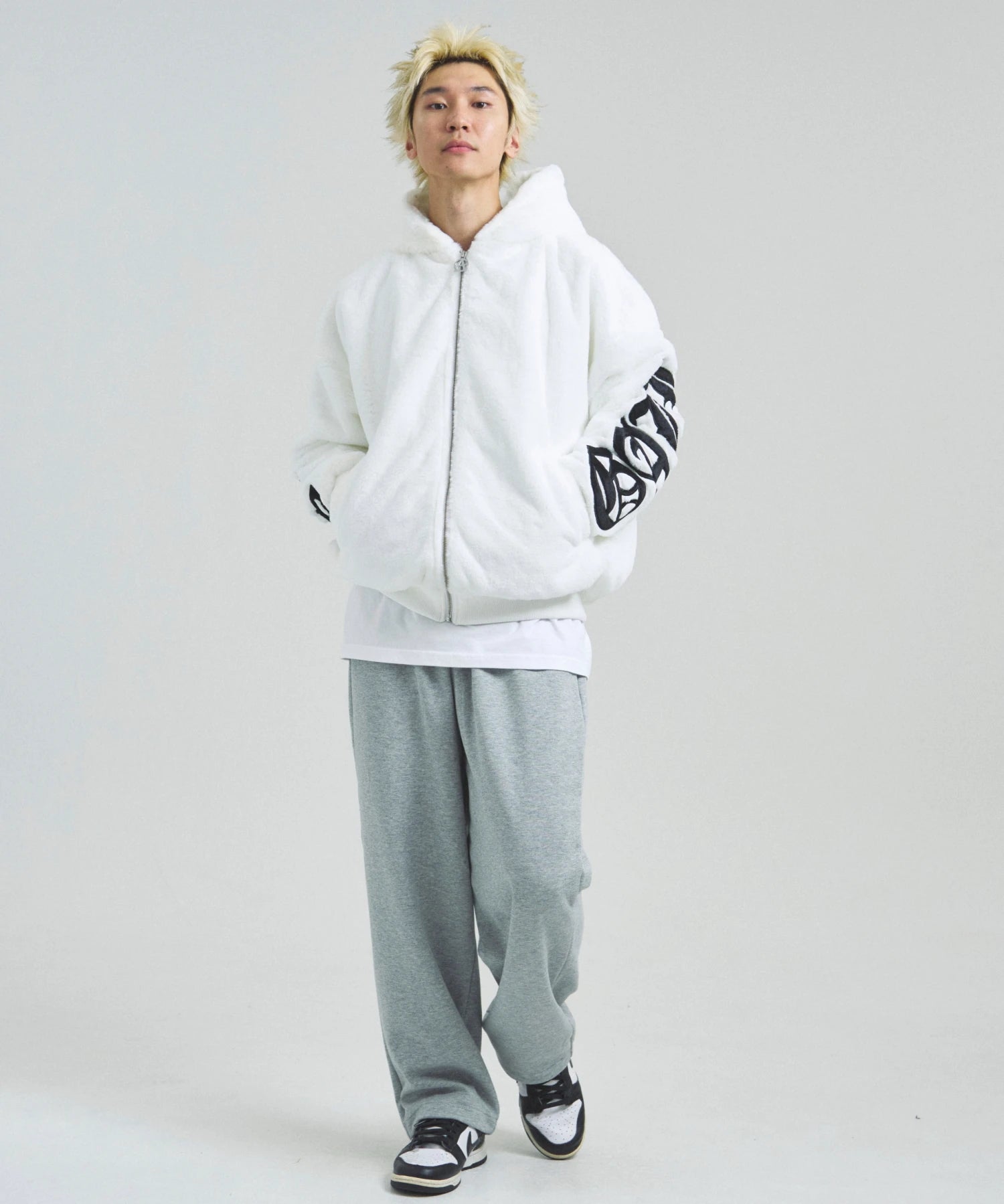 圧倒的な存在感を放つオールドイングリッシュロゴが印象的な、GALLIS ADDICTIONのファーブルゾン。毛足の長いフェイクファー素材を贅沢に使用し、ふんわりとした肌触りと高い保温性を両立。軽量で柔らかな着心地が魅力で、ストリートからデイリーまで幅広いスタイリングに対応します。フロントはシンプルなジップアップ仕様ながら、バックに大胆に施されたブランドロゴ刺繍が視線を惹きつけるデザイン。オーバーサイズのシルエットで、ユニセックスに着用可能。トレンド感のあるルーズなフォルムと、GALLIS ADDICTIONらしいエッジの効いたグラフィックが融合した一着は、羽織るだけでコーディネートにインパクトを与える主役級アイテムです。カラー展開はホワイト、ブラック、オレンジの3色。個性に合わせて選べるバリエーションも魅力です。