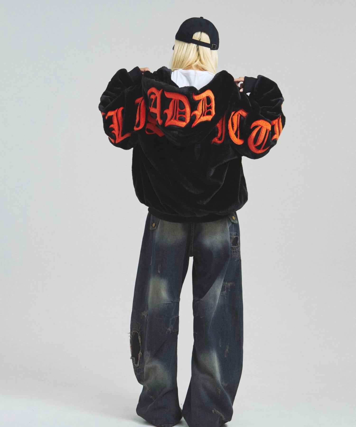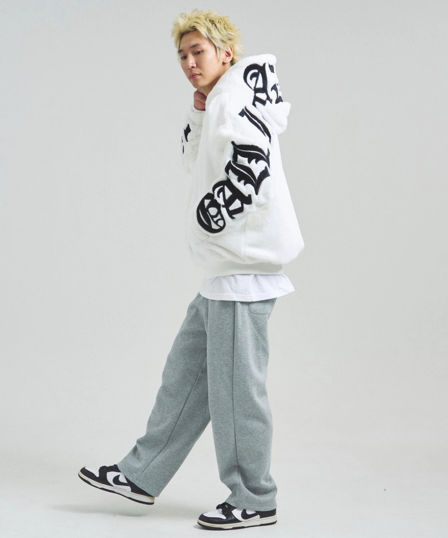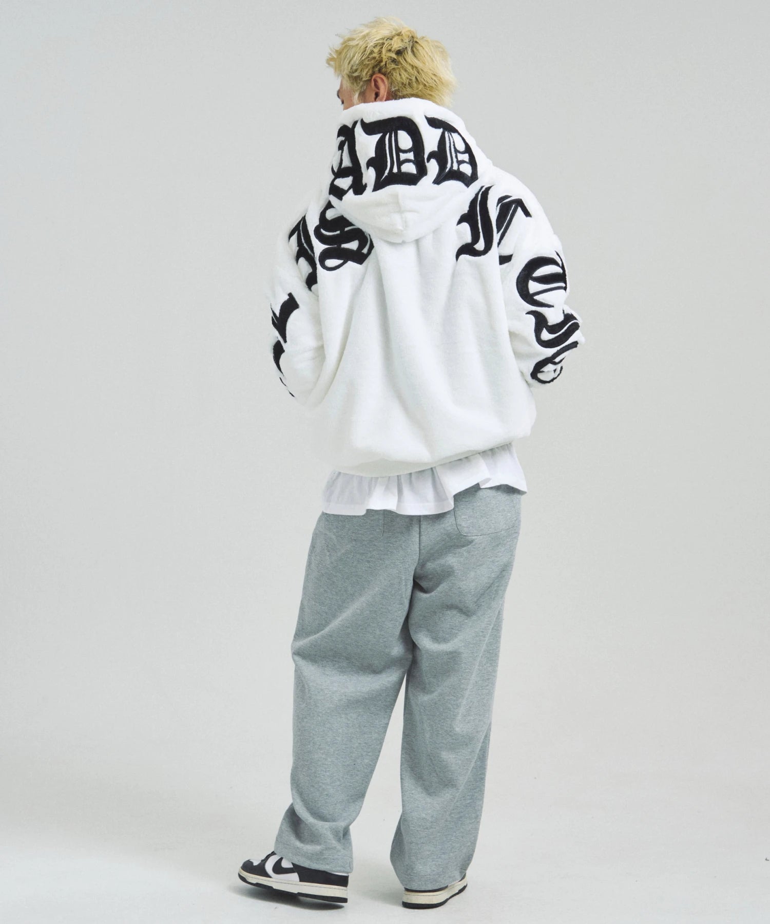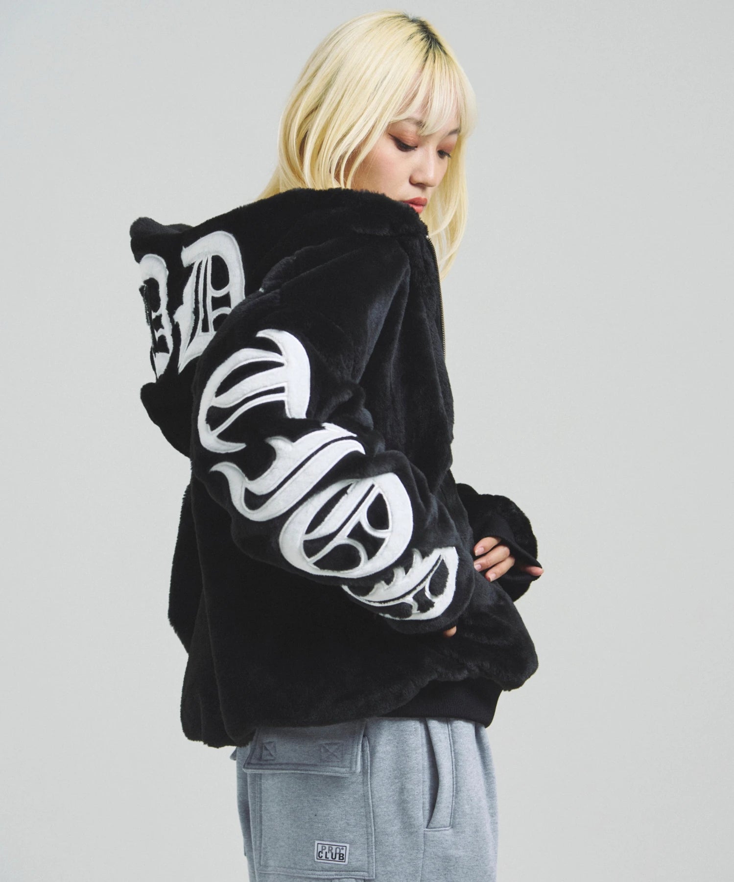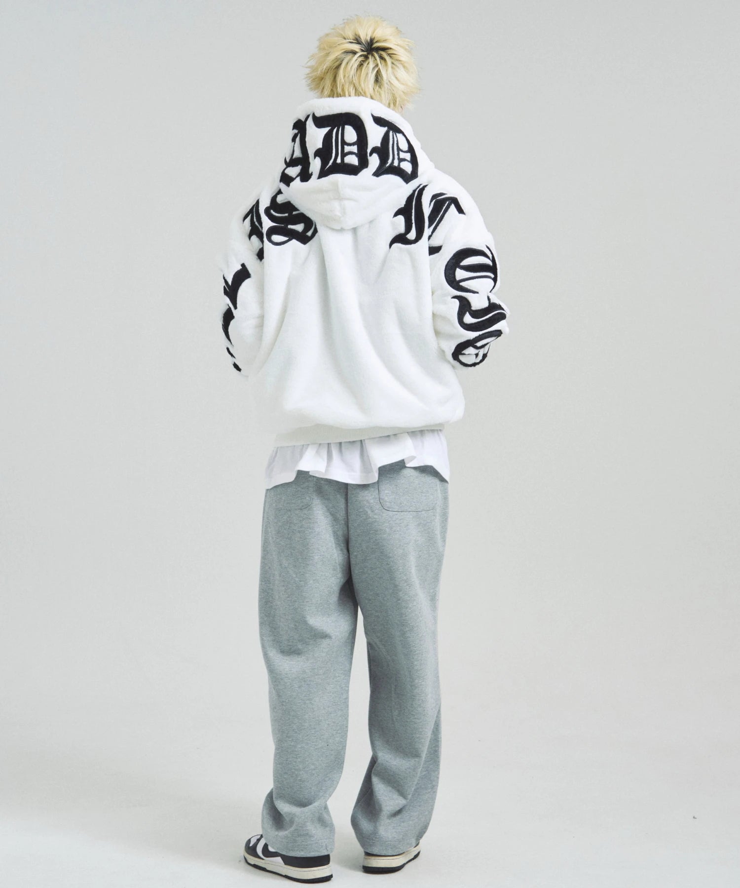 圧倒的な存在感を放つオールドイングリッシュロゴが印象的な、GALLIS ADDICTIONのファーブルゾン。毛足の長いフェイクファー素材を贅沢に使用し、ふんわりとした肌触りと高い保温性を両立。軽量で柔らかな着心地が魅力で、ストリートからデイリーまで幅広いスタイリングに対応します。フロントはシンプルなジップアップ仕様ながら、バックに大胆に施されたブランドロゴ刺繍が視線を惹きつけるデザイン。オーバーサイズのシルエットで、ユニセックスに着用可能。トレンド感のあるルーズなフォルムと、GALLIS ADDICTIONらしいエッジの効いたグラフィックが融合した一着は、羽織るだけでコーディネートにインパクトを与える主役級アイテムです。カラー展開はホワイト、ブラック、オレンジの3色。個性に合わせて選べるバリエーションも魅力です。