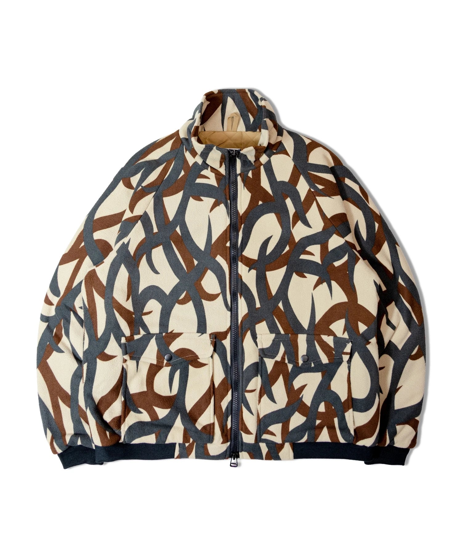 1980年代に登場したASAT社のヴィンテージフリースジャケットをアップデートした一着。フリースと中綿を組み合わせることで、保温性と防寒性を大幅に高めています。目を惹くトライバルカモ柄が印象的で、アウトドアの要素とミリタリーの要素を融合させた存在感ある仕上がりです。首元をしっかり覆うハイネック仕様に、表地にはトライバルカモをプリントしたフリースを採用。中綿には軽量かつ高い保温性を誇るサーモライトを使用し、ボディから袖までしっかりと配することで防寒性と袖通りの良さを両立しています。フロントにはフラップポケットとサイドポケットを備え、袖と裾にはリブを配置。ジップにはミリタリー仕様のダブルジップを採用し、細部までこだわり抜いた仕上がりとなっています。