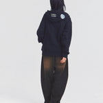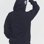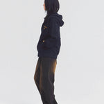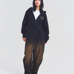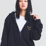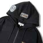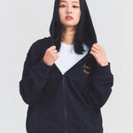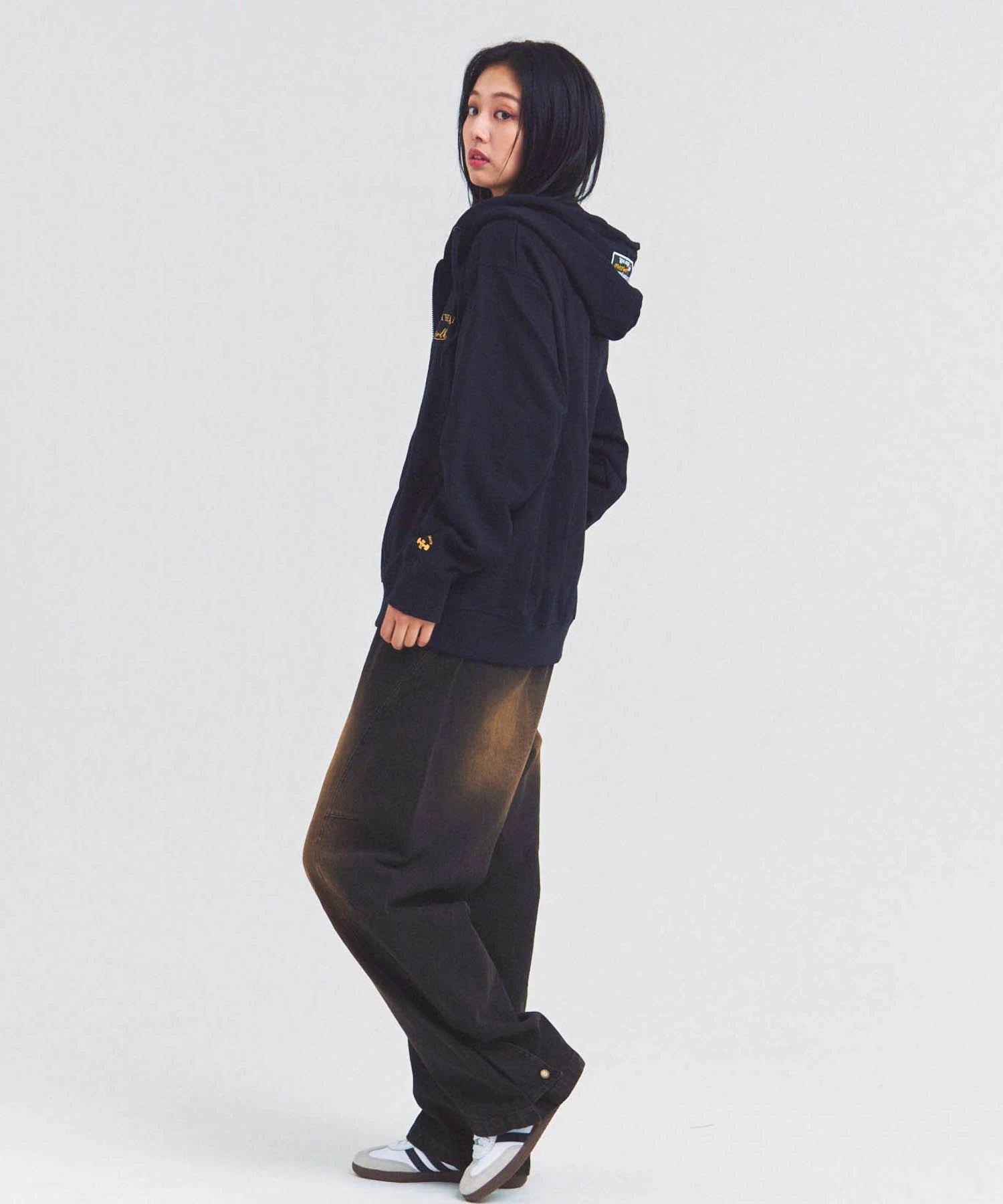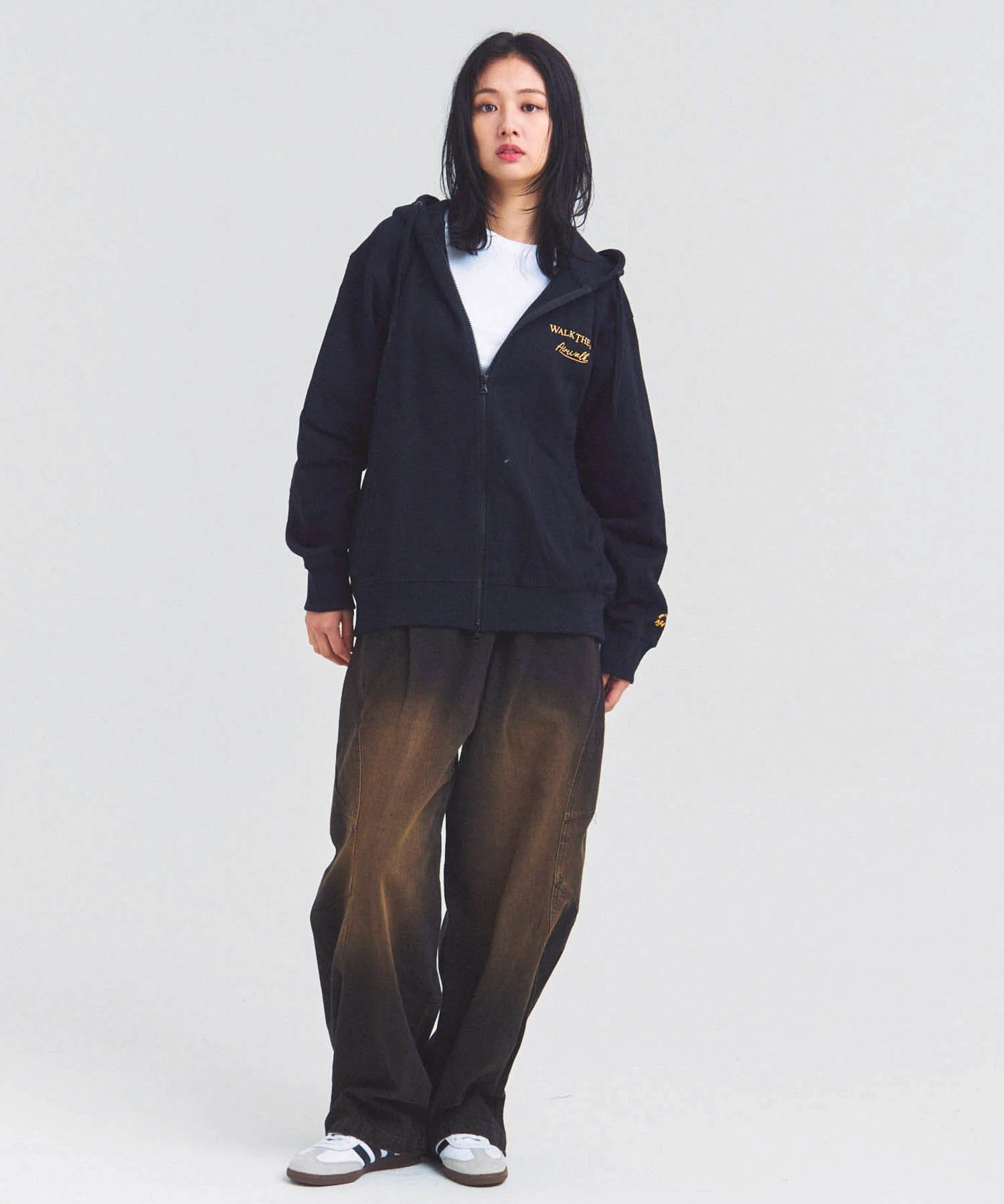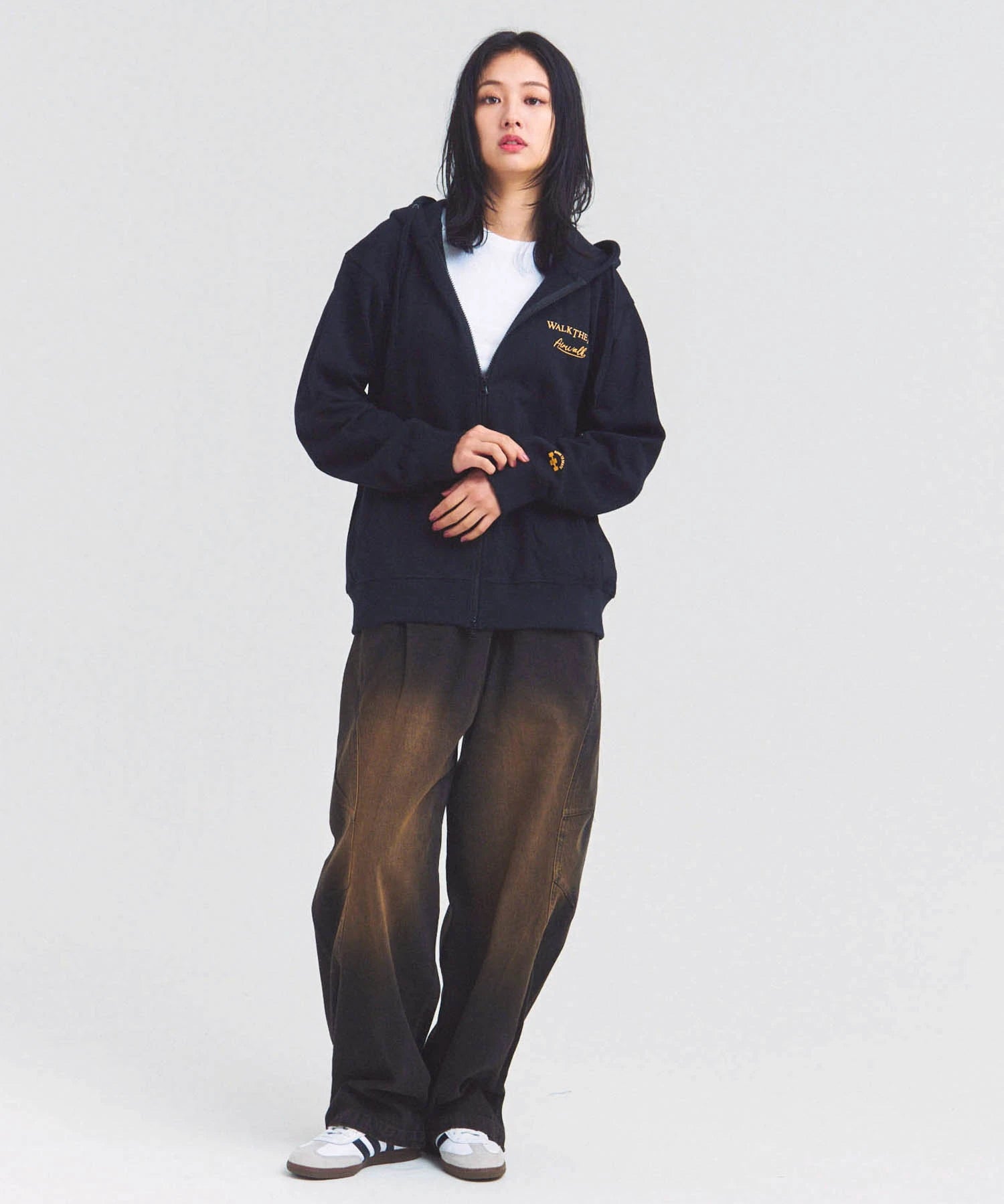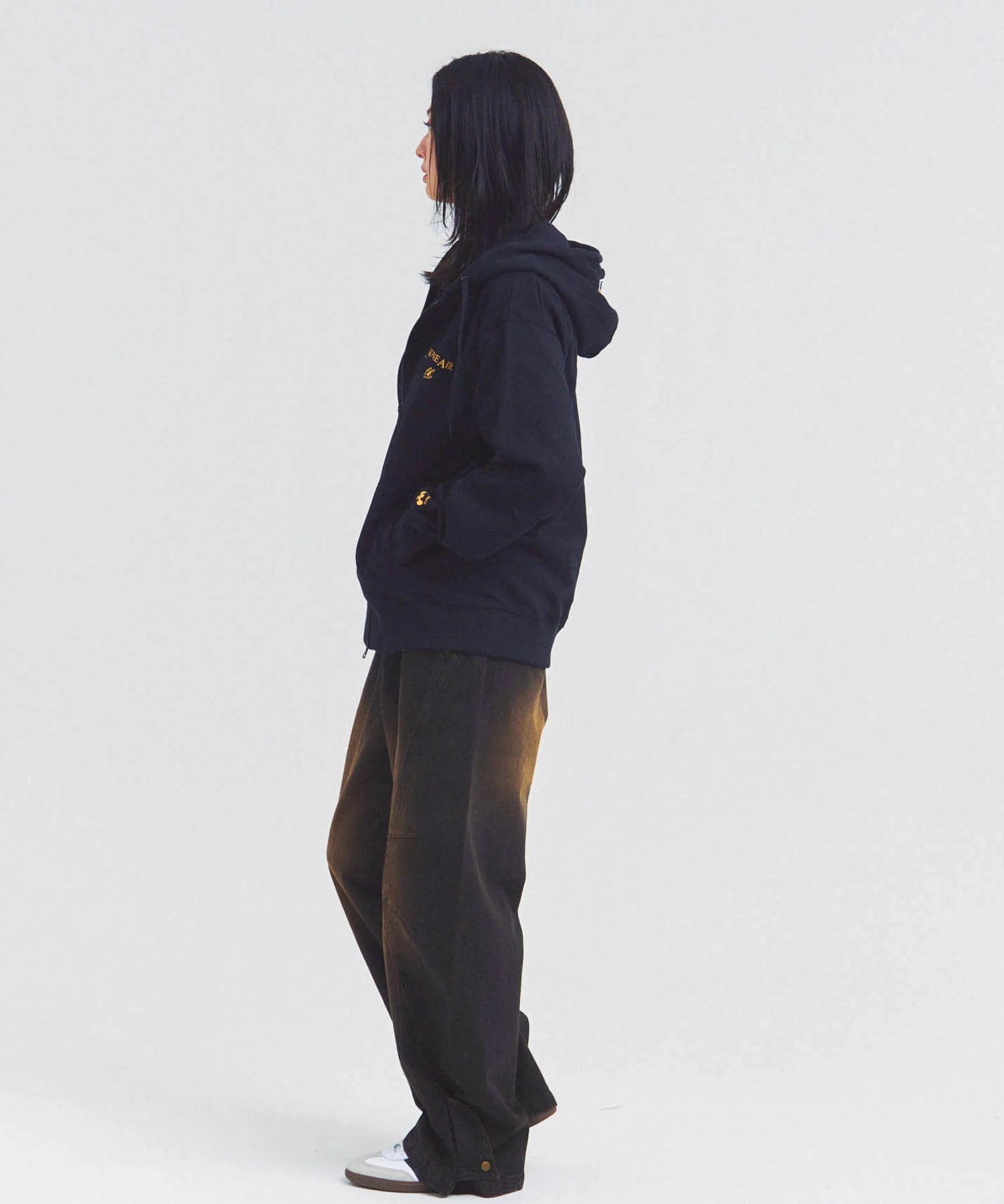 コットン100%の柔らかく肌触りの良い生地。季節を問わず使いやすい厚み。フロントにはジップを採用し、開閉が楽。気温やスタイルに応じて体温調節が可能。胸元には存在感のあるワッペン装飾を配置。デザイン性が高く、1枚でサマになる。ドロップショルダー+ゆったりめの身幅でリラックスしたシルエットなのでユニセックスで着用可能。重ね着やレイヤードにも最適。春・秋のライトアウターとしてだけでなく、冬にはインナーパーカーとしても活躍。