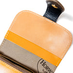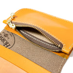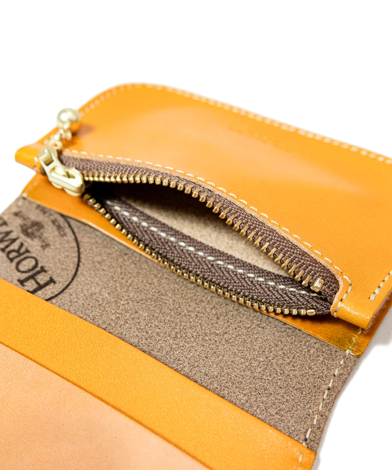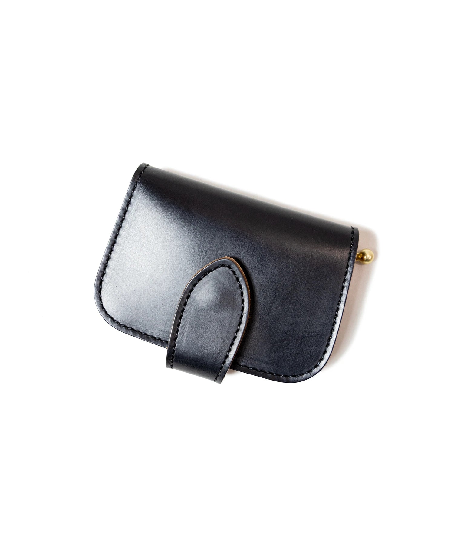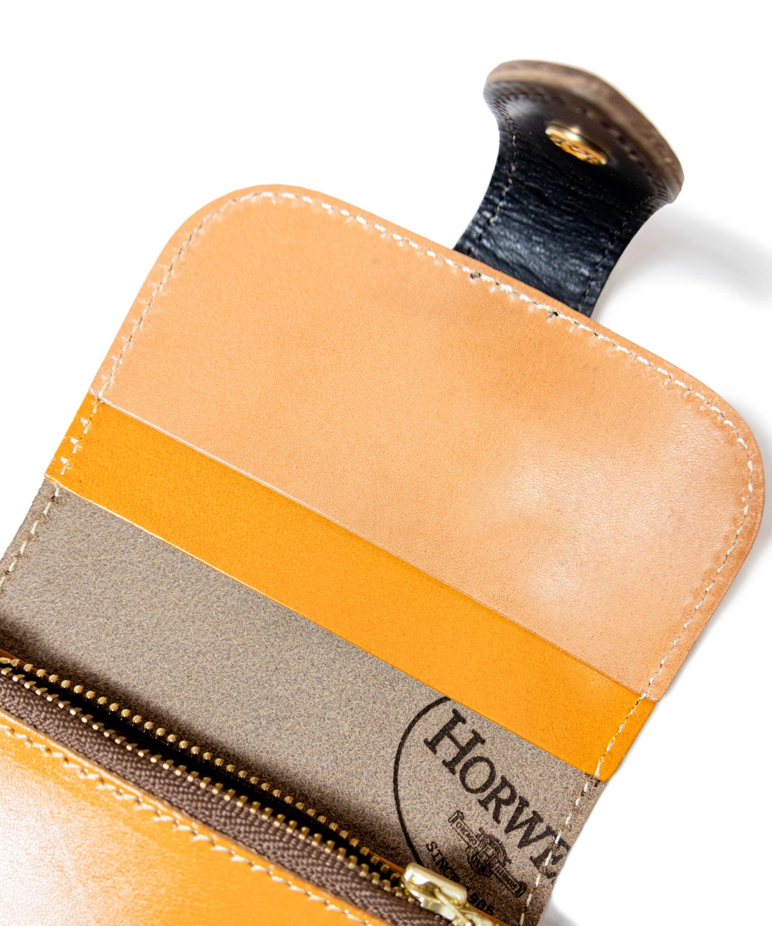ホーイン社クロムエクセルを使用したミニウォレット。 外側がクロムエクセルで、内側は栃木レザーです。(配色にしています) 折りたたんで、ホック(フィヨッキーホック。現プリモホック)でとめます。 開いた中央(革の裏が見える部分)には、すべてにホーインの焼印が入ります。 手のひらサイズで、デニムのポケットに入れる事ができます。 ステッチは#5の太番手で縫製しています。チャーム付。[Made in JAPAN]サイズ8×12×2.5cm