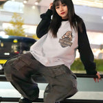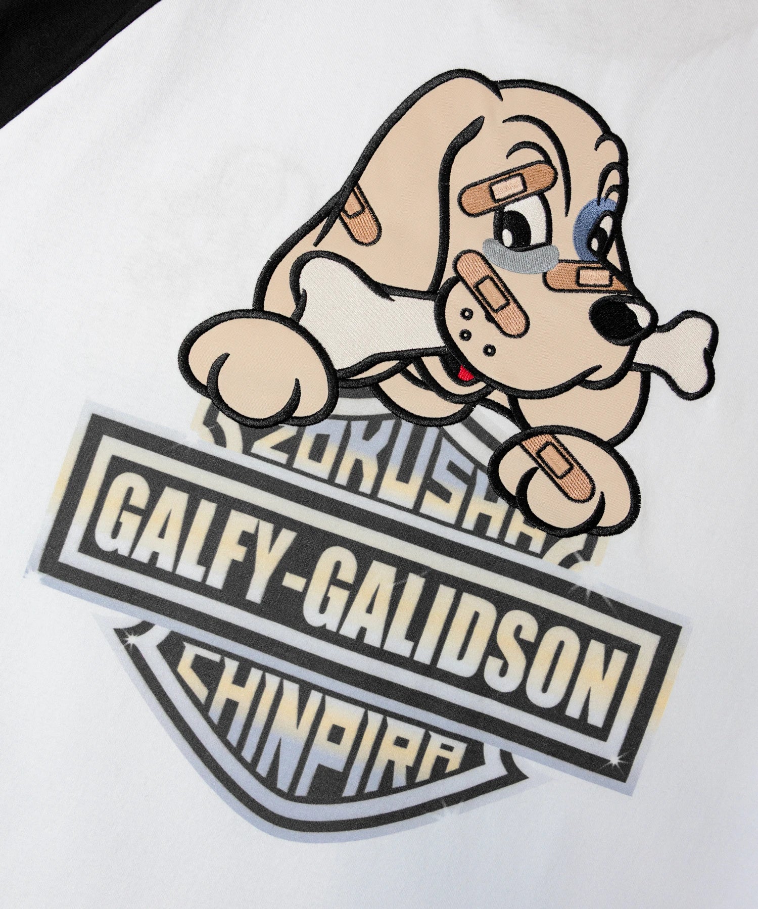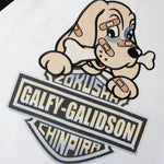 ・ホワイト・ブラックフロント左胸に小さめのガルフィー犬、バックには大きくエンブレム調のロゴグラフィックを配置。シンプルながらも存在感のあるデザインで、ストリートコーデやモノトーンスタイルにおすすめ。