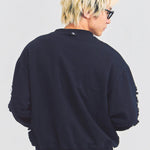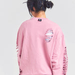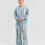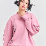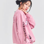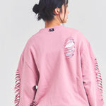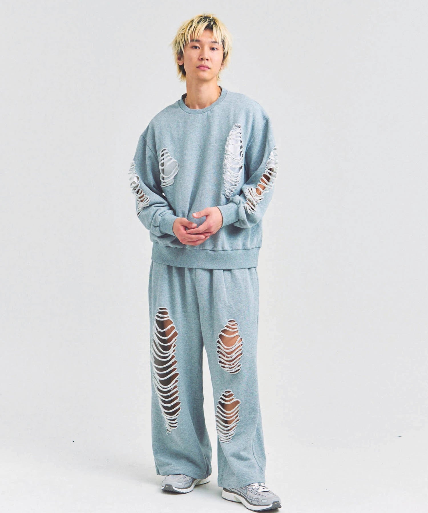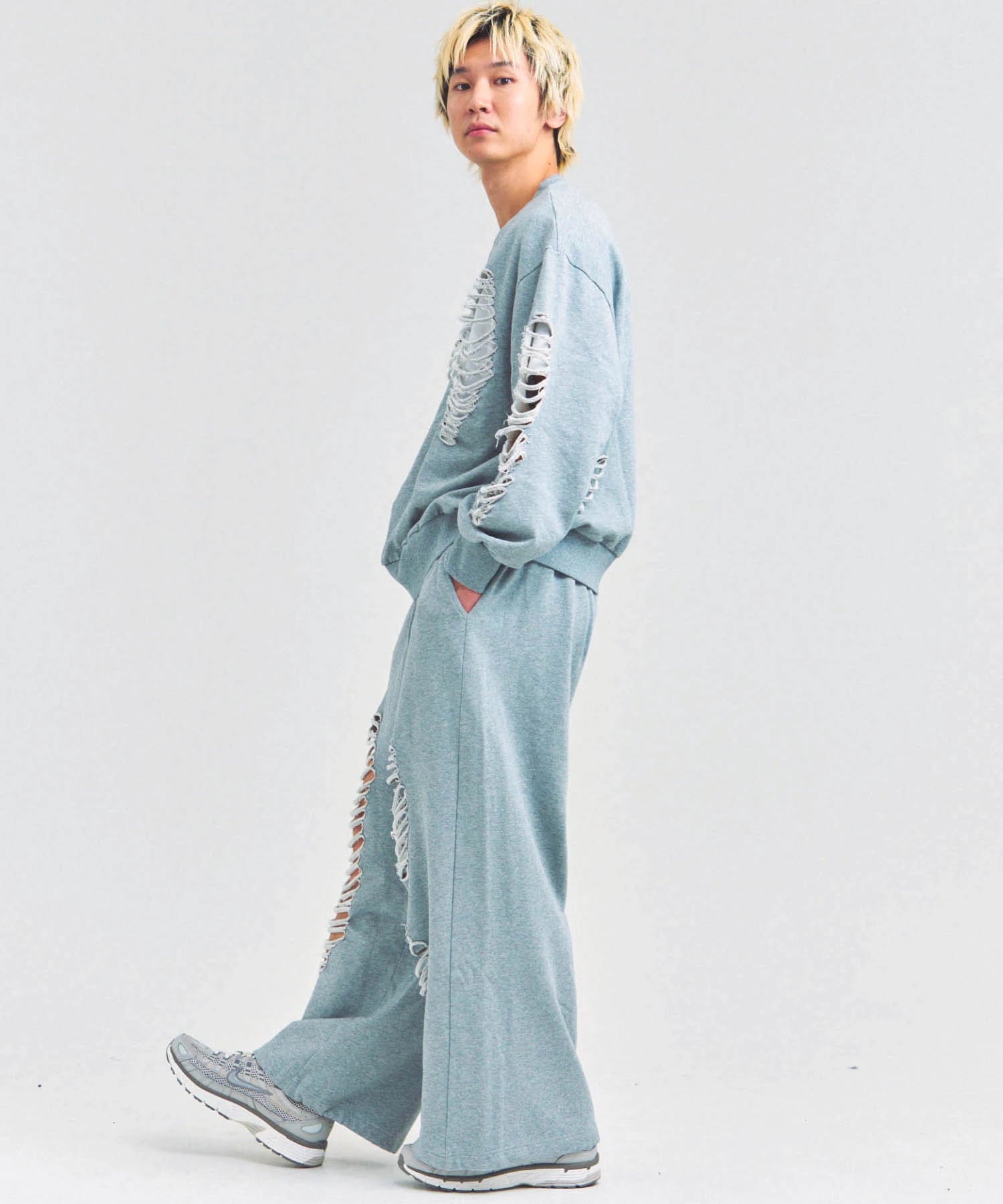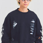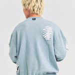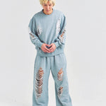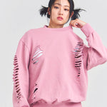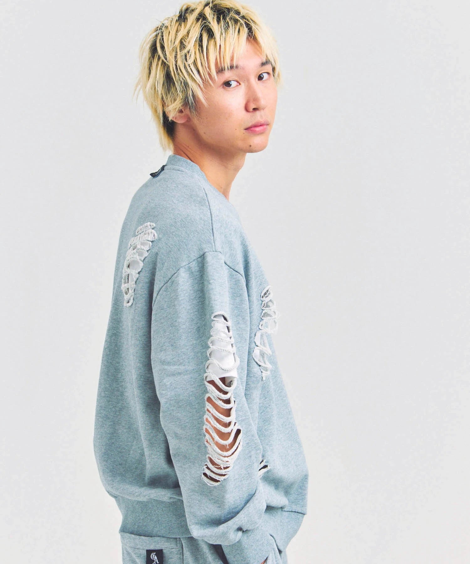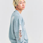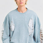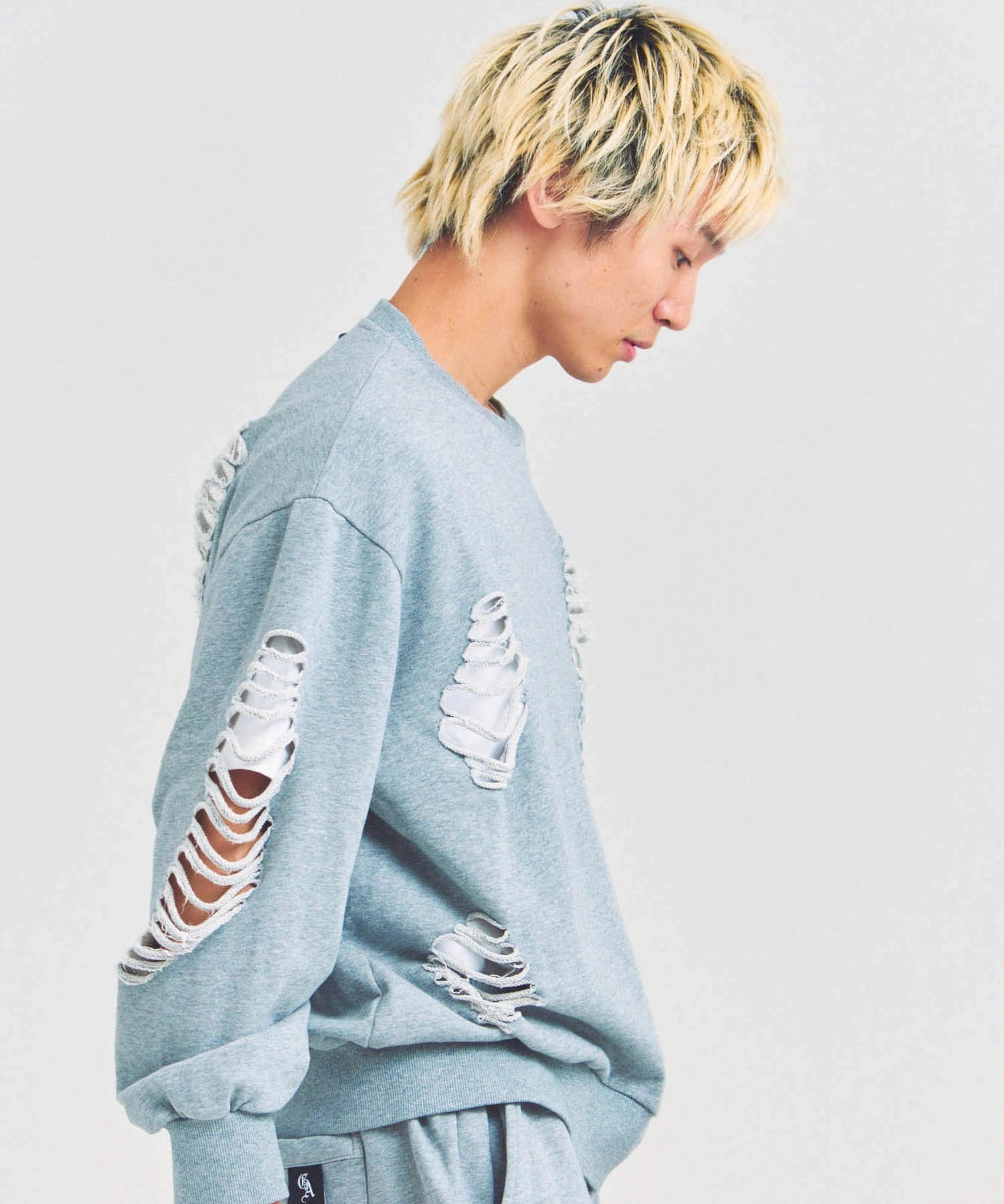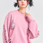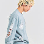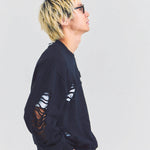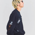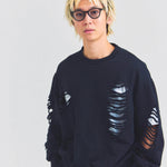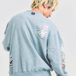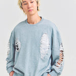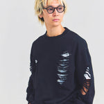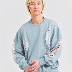 大胆なダメージ加工が目を引く、GALLIS ADDICTIONのクルーネックスウェット。