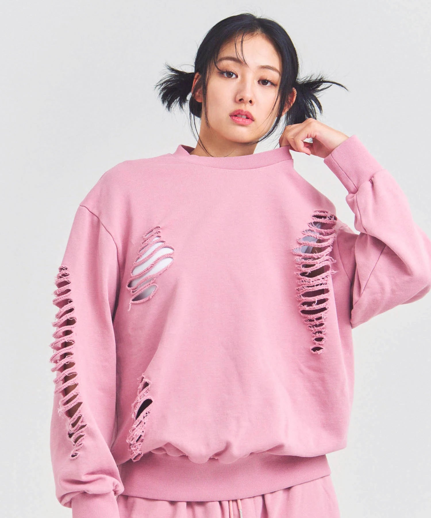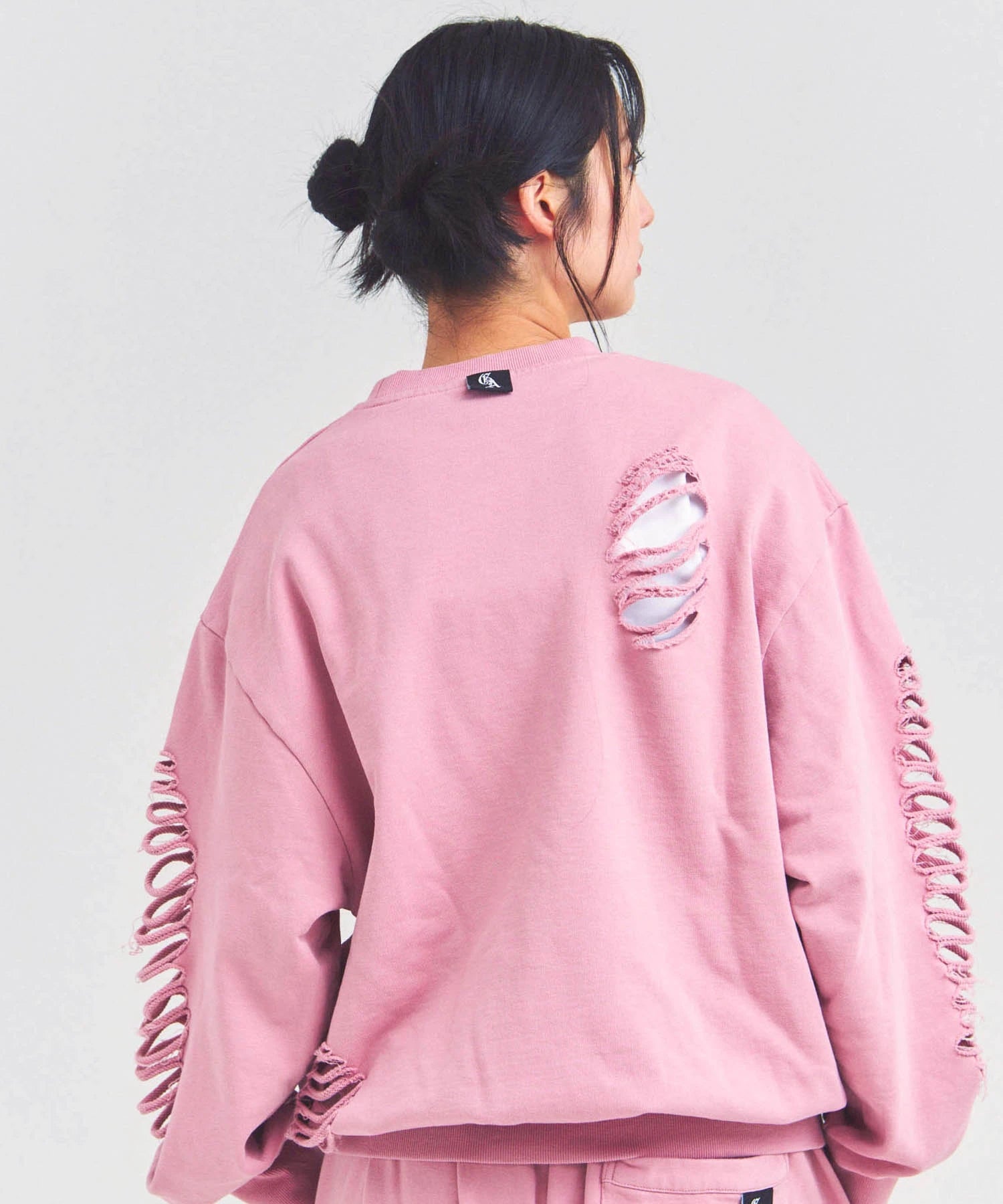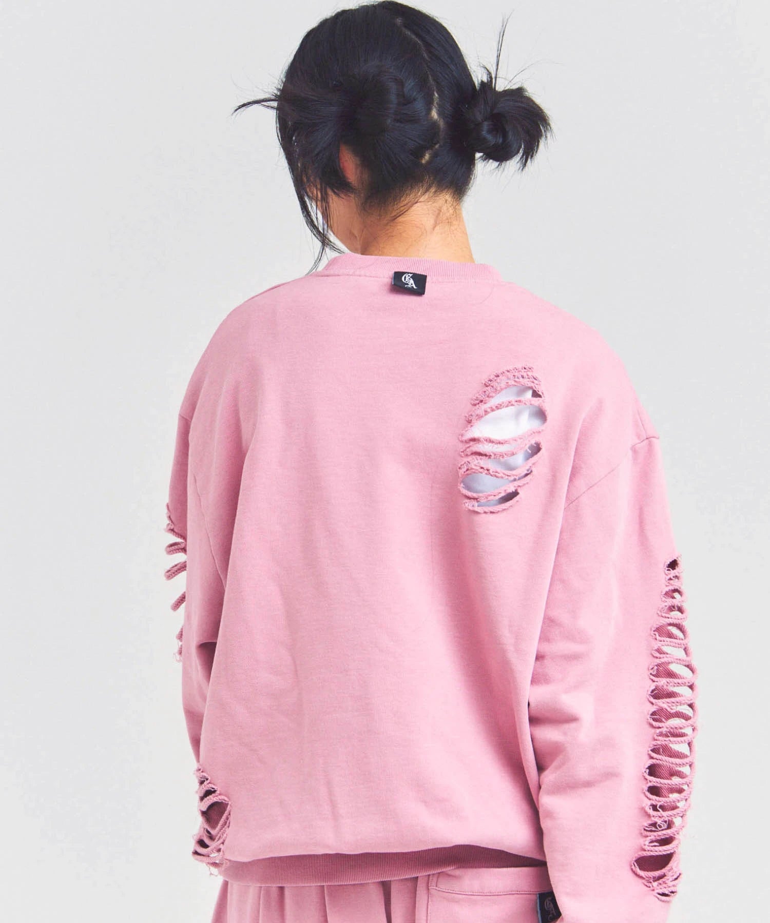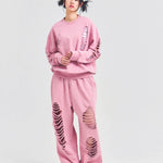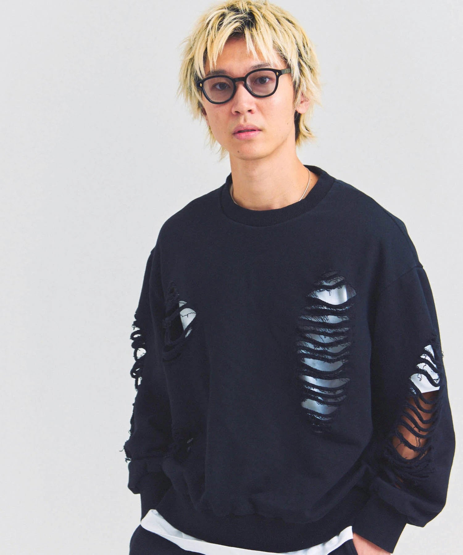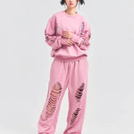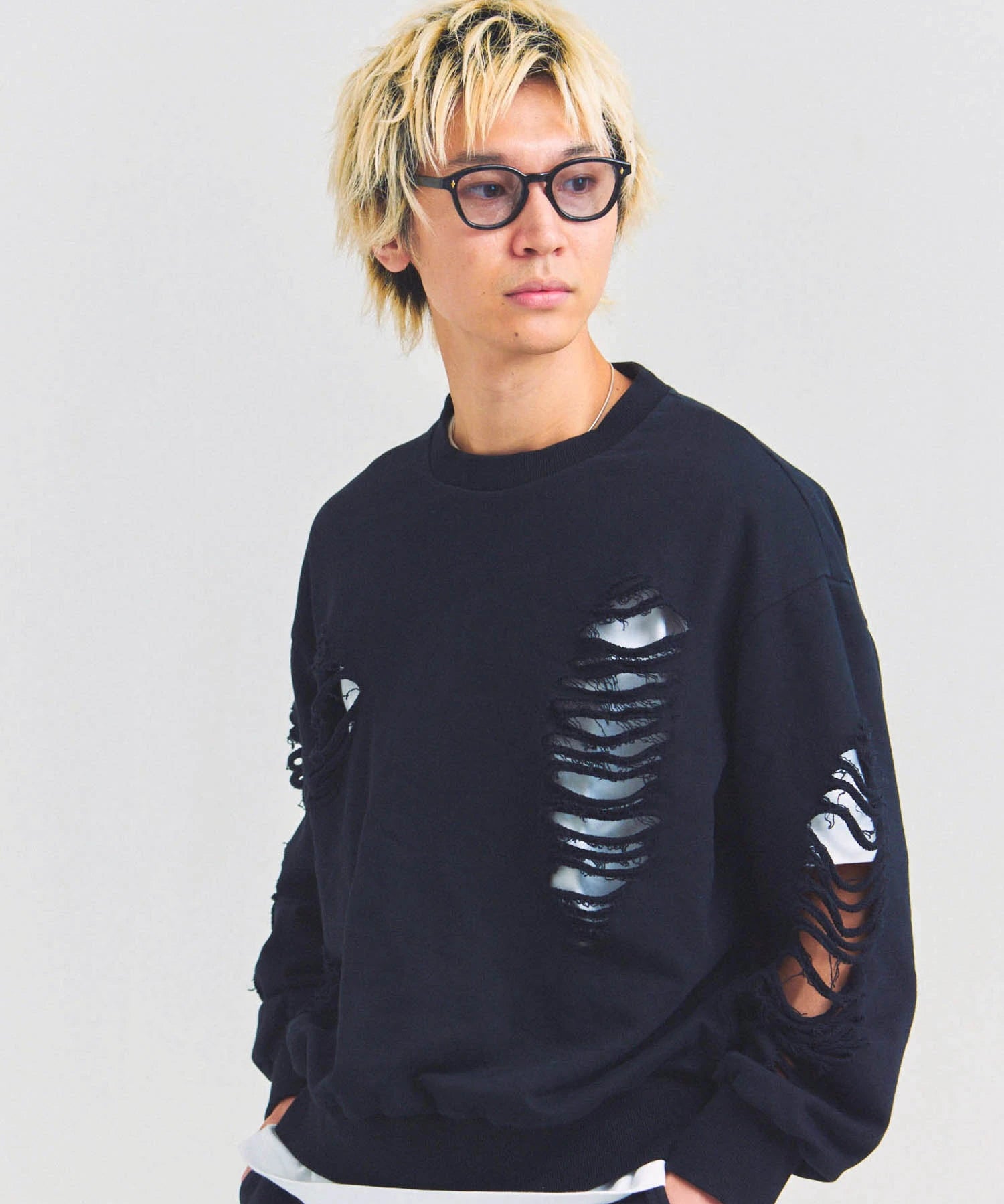 大胆なダメージ加工が目を引く、GALLIS ADDICTIONのクルーネックスウェット。