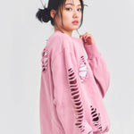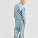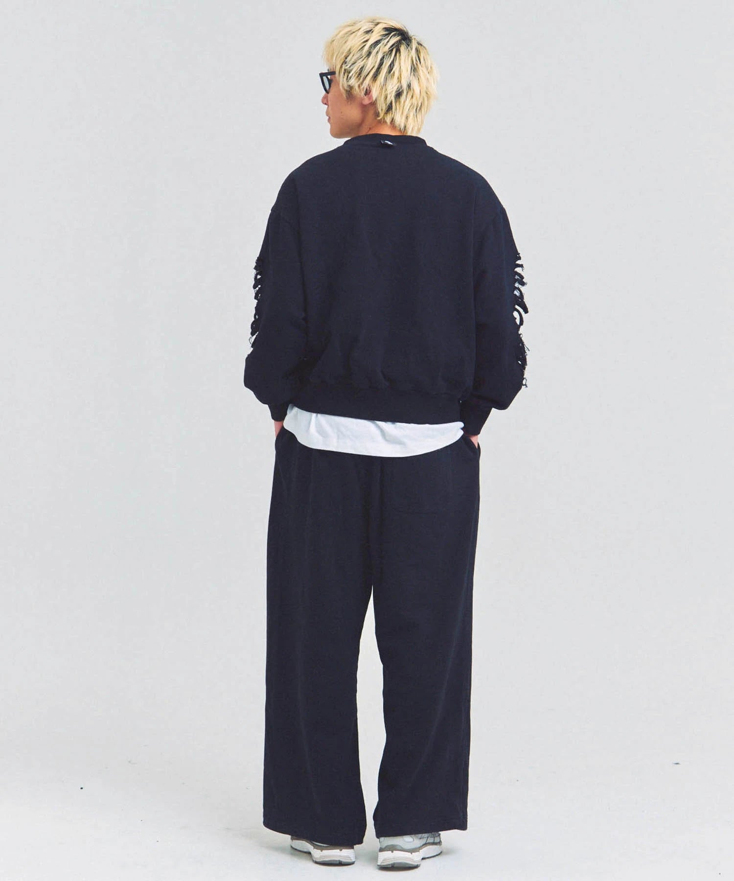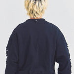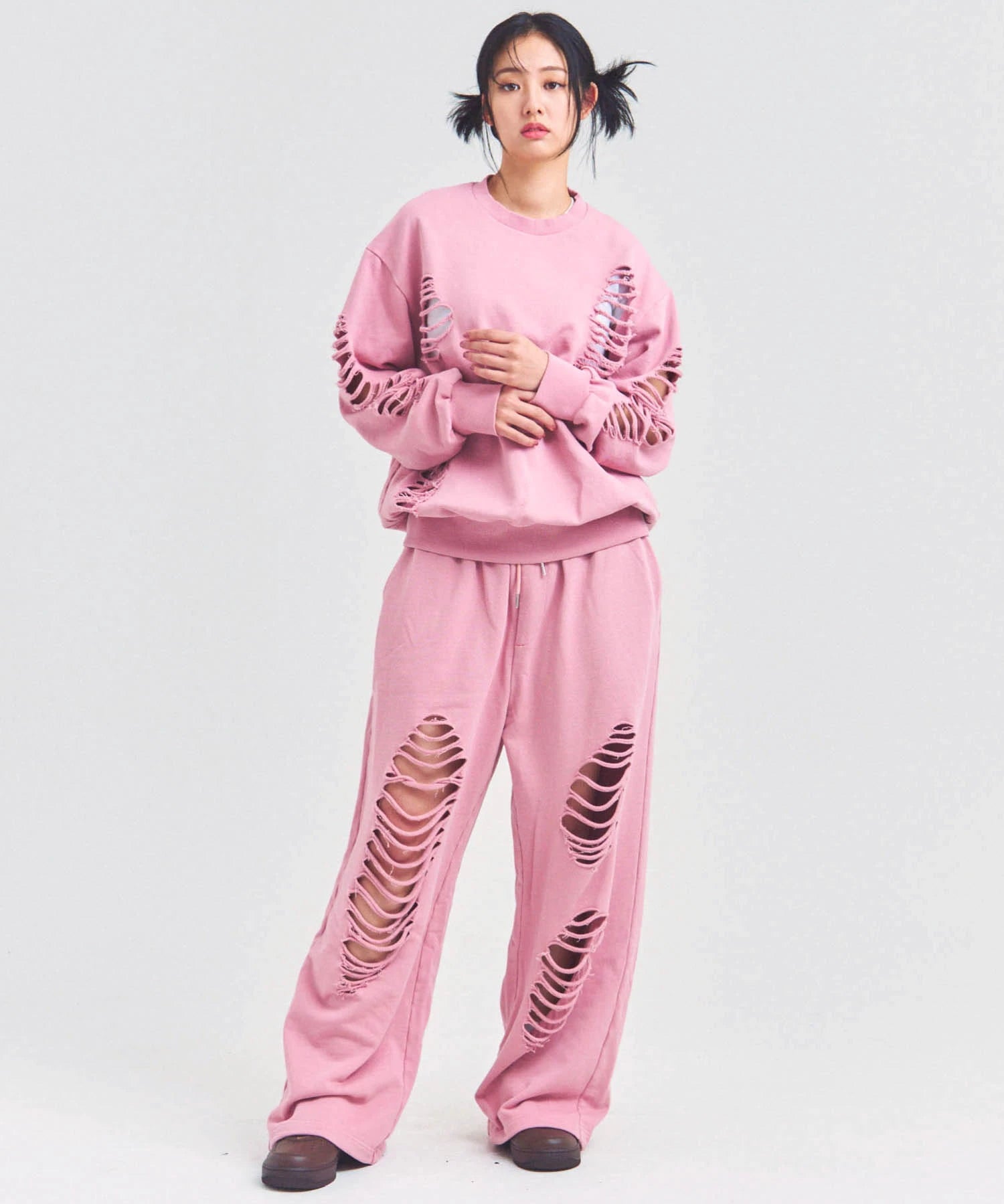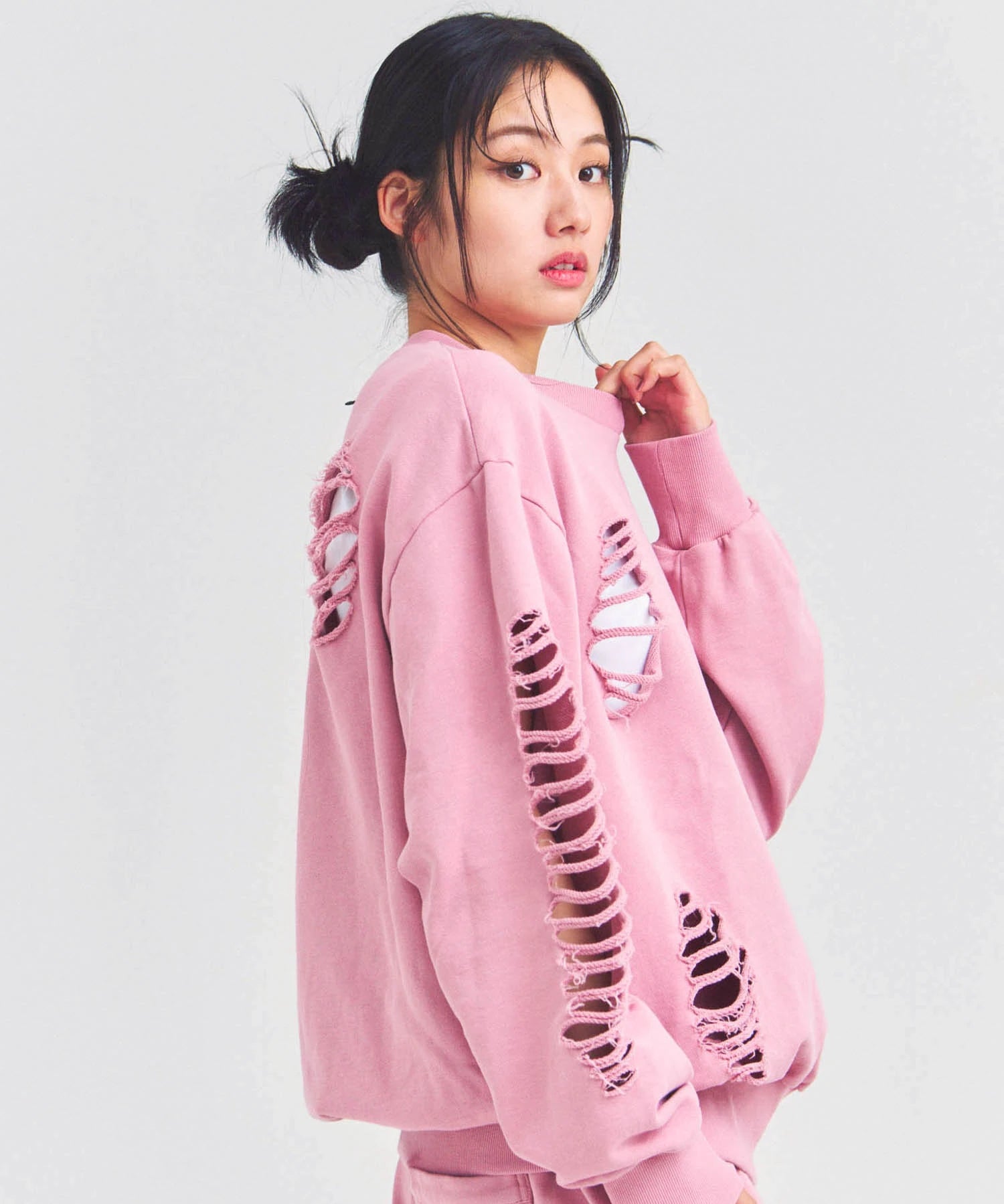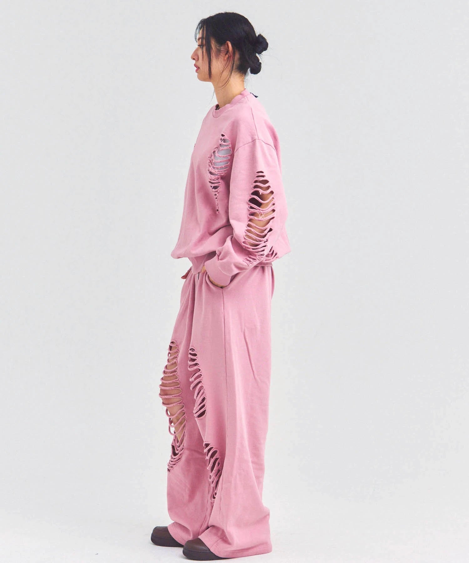大胆なダメージ加工が目を引く、GALLIS ADDICTIONのクルーネックスウェット。