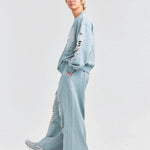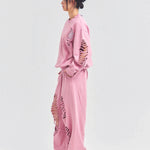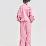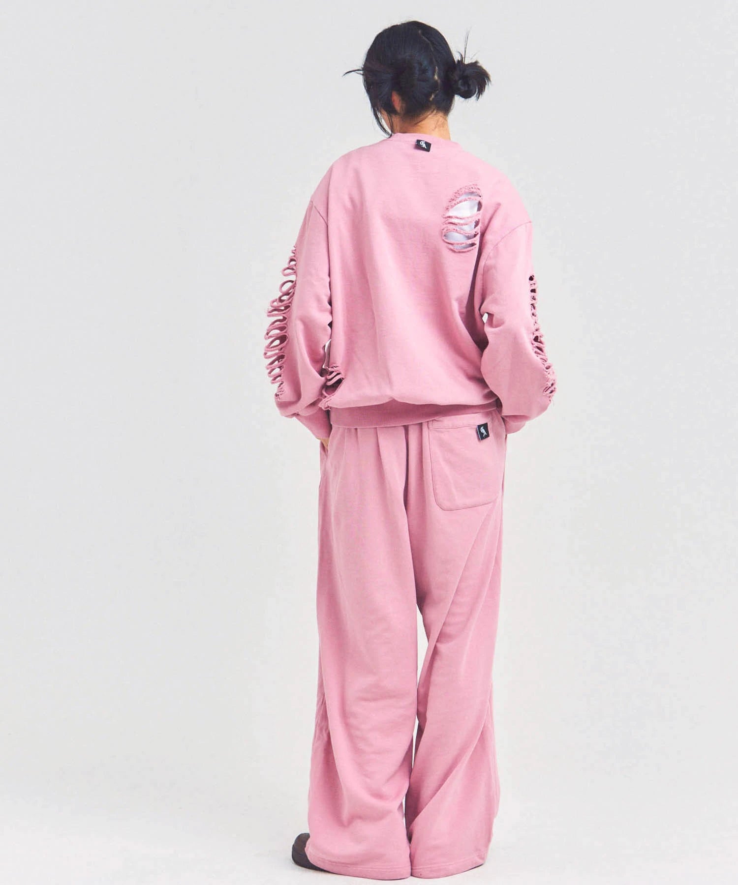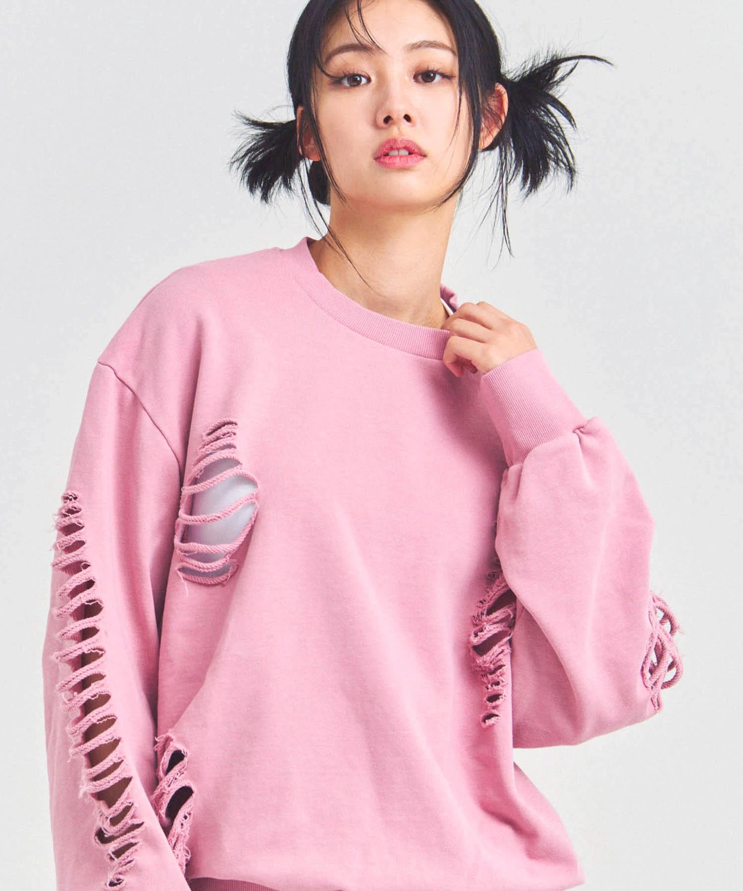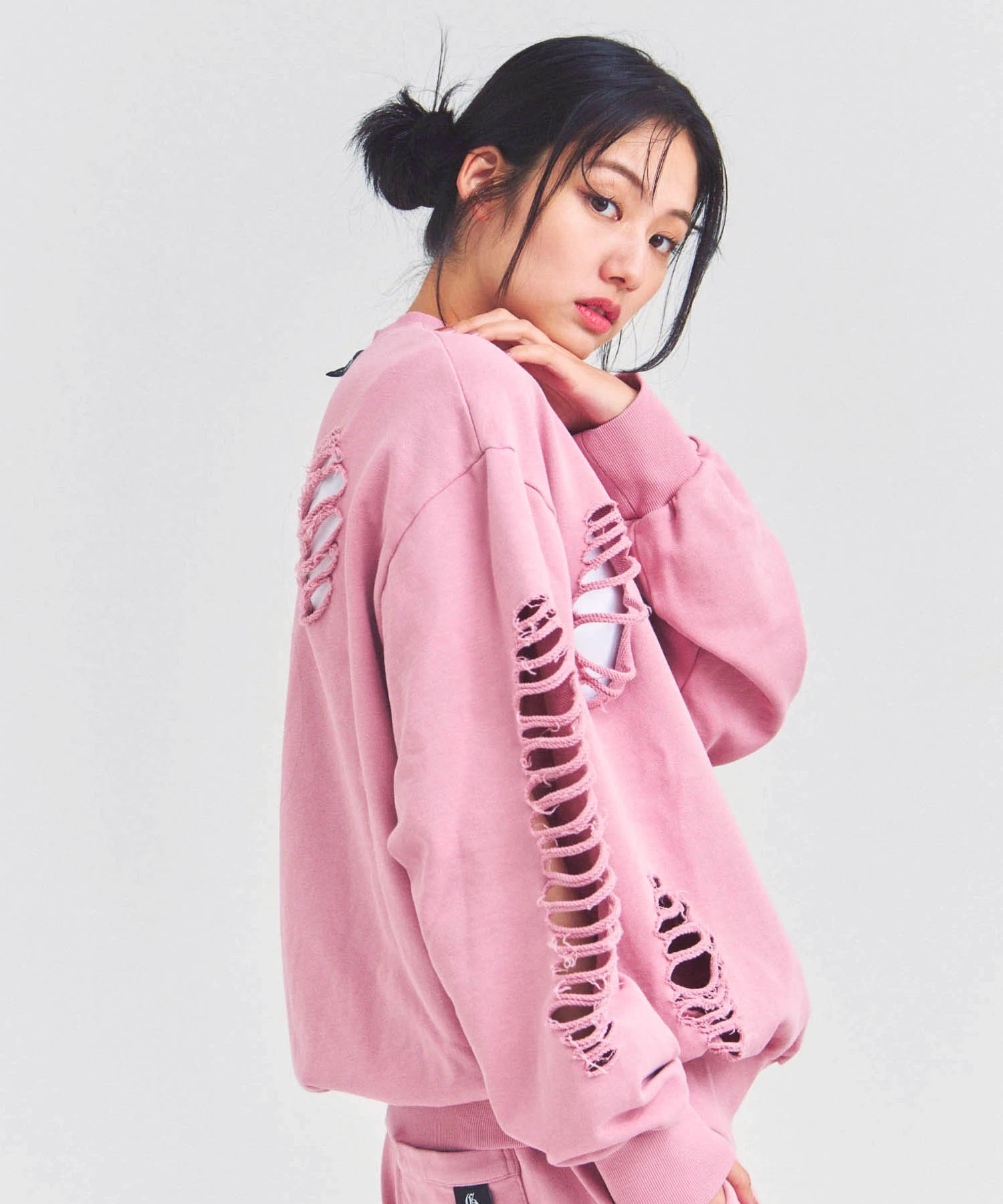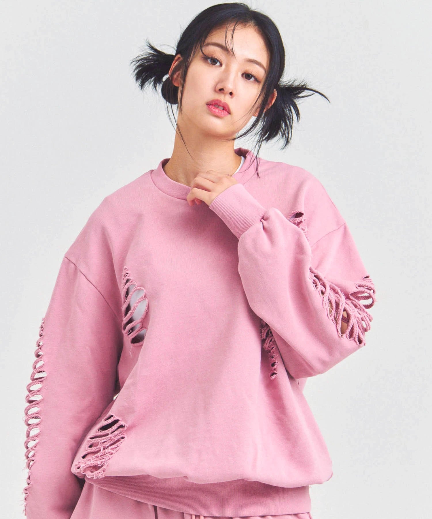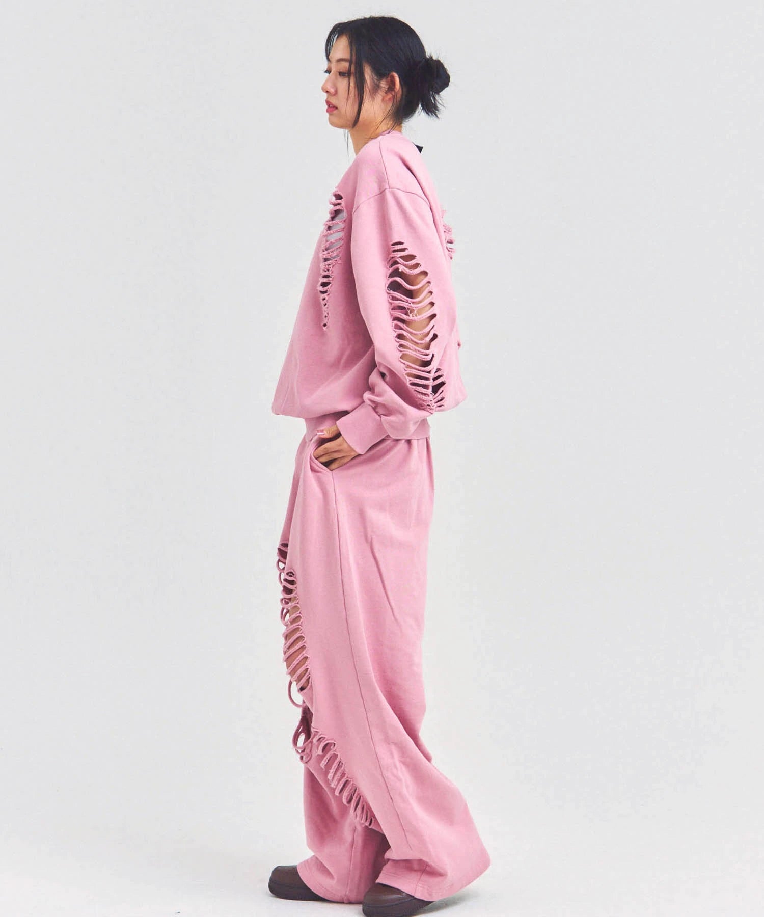 大胆なダメージ加工が目を引く、GALLIS ADDICTIONのクルーネックスウェット。