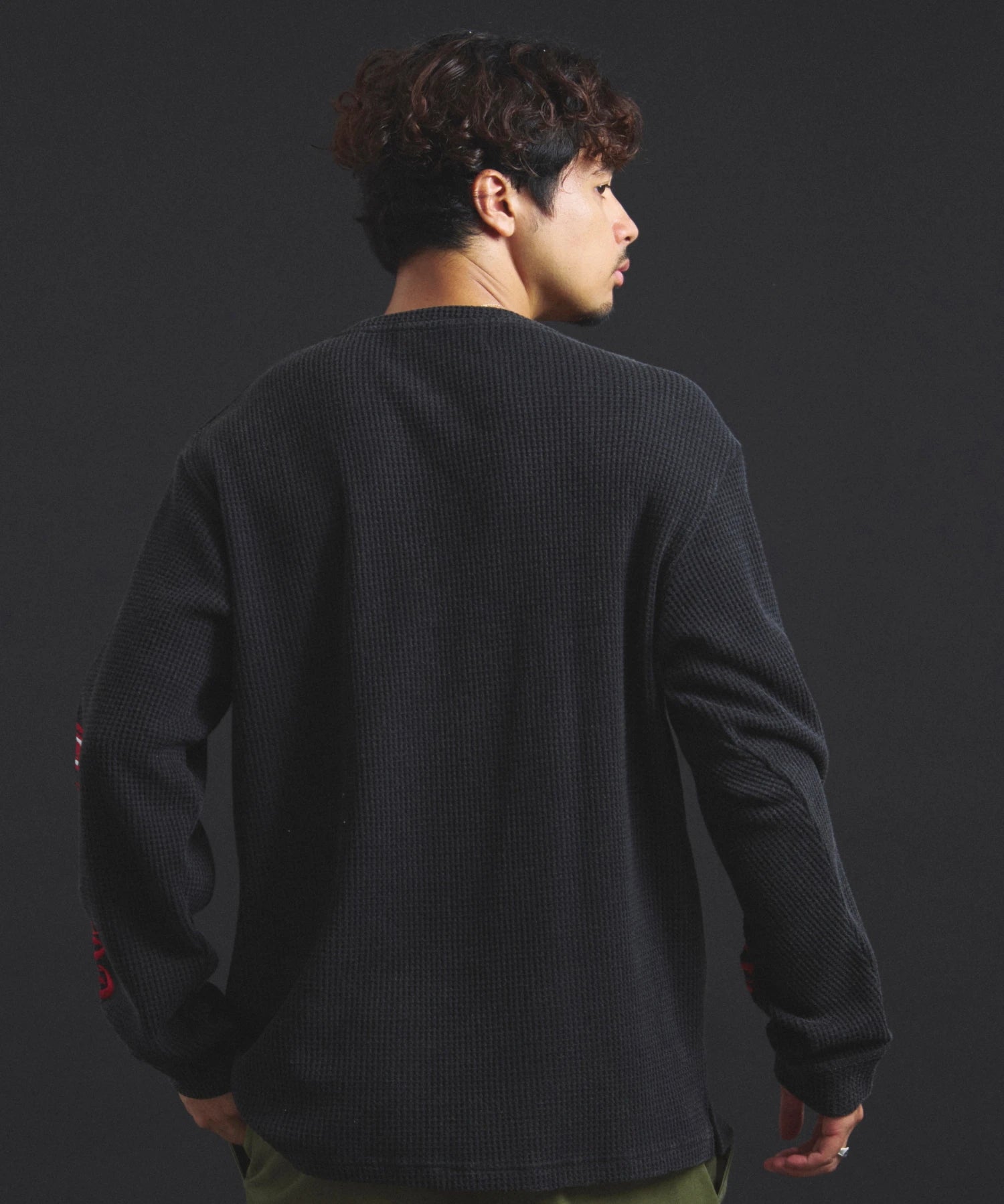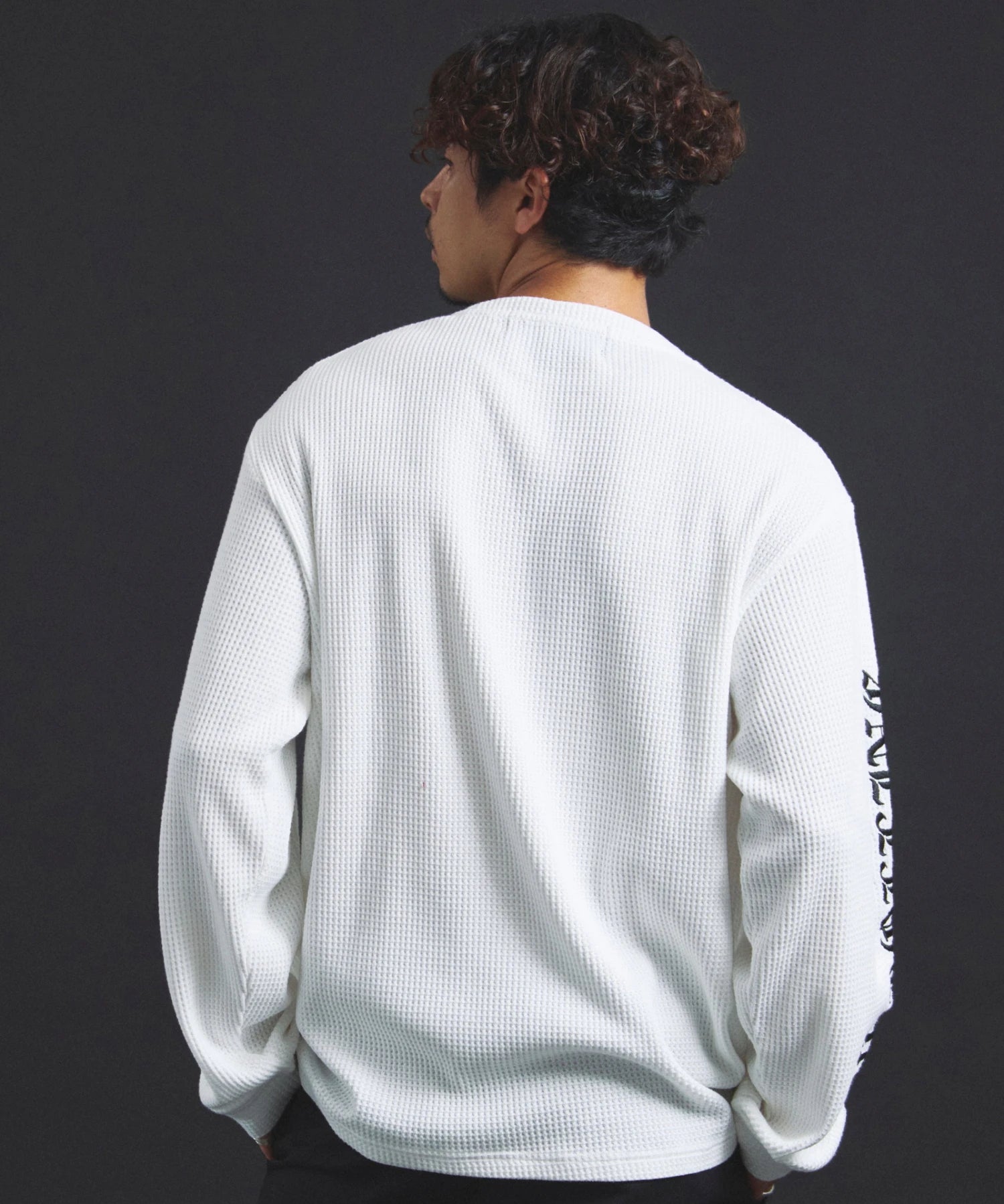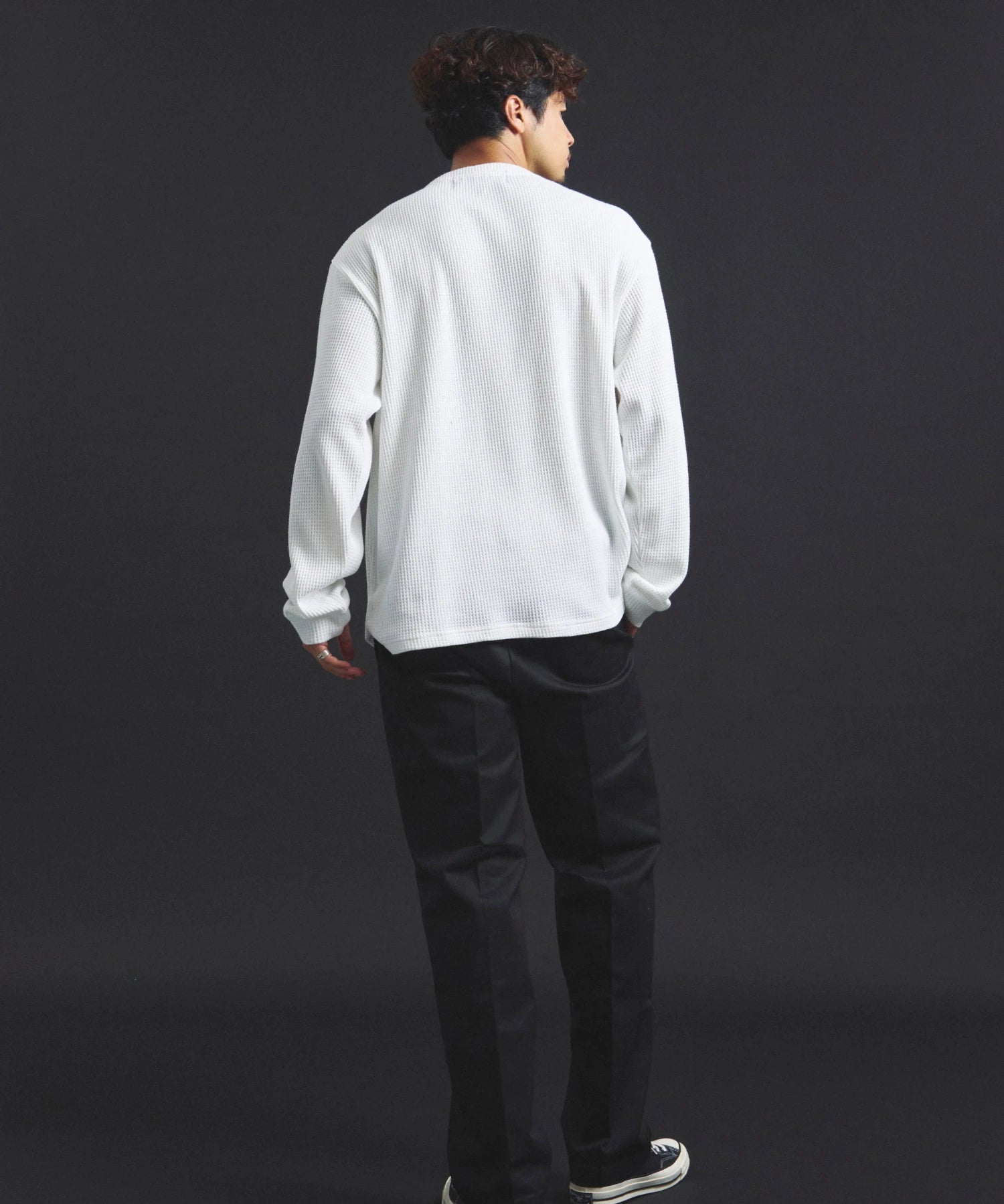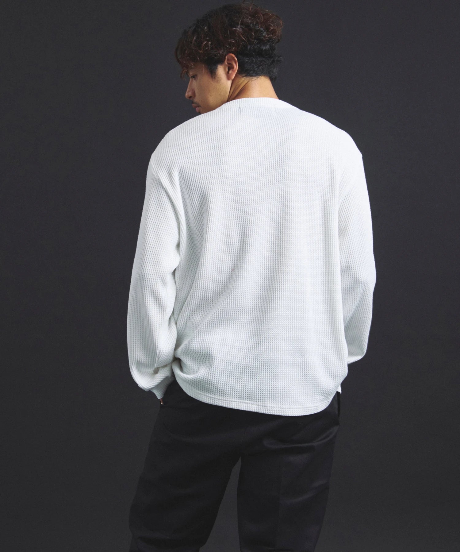 素材には凹凸のあるワッフル生地(サーマル地)を使用。柔らかく伸縮性があり、着心地の良さと保温性を兼ね備えているのが特徴です。程よくゆとりのあるシルエットで、1枚着としてはもちろん、シャツやジャケットのインナーとしても活躍します。