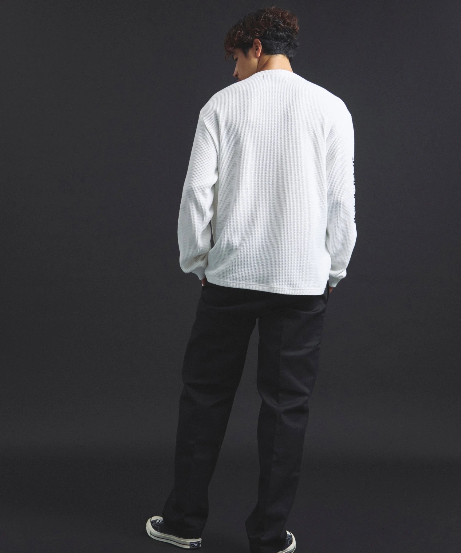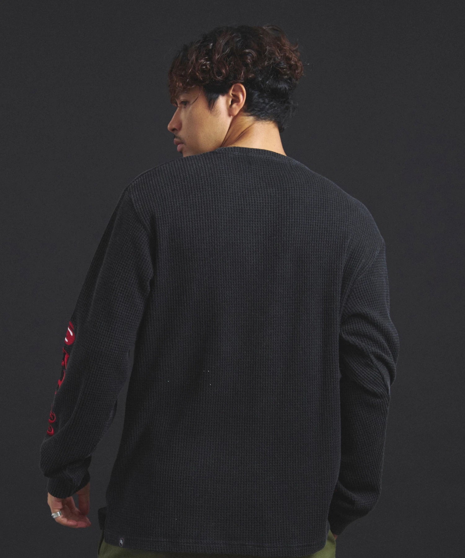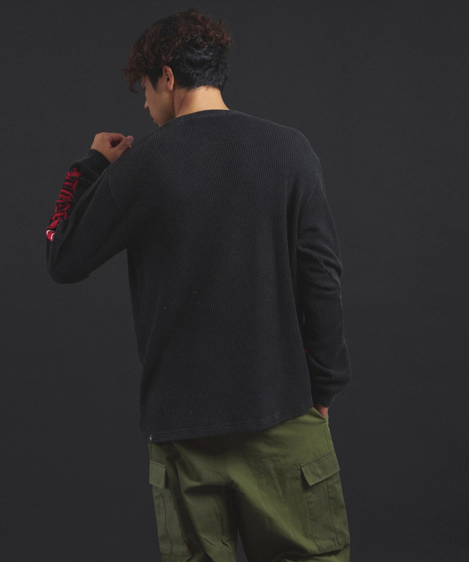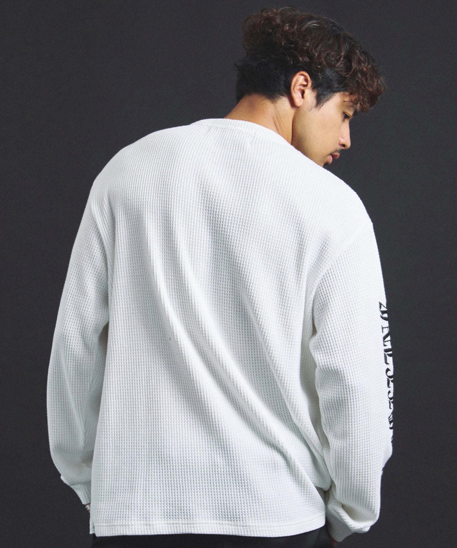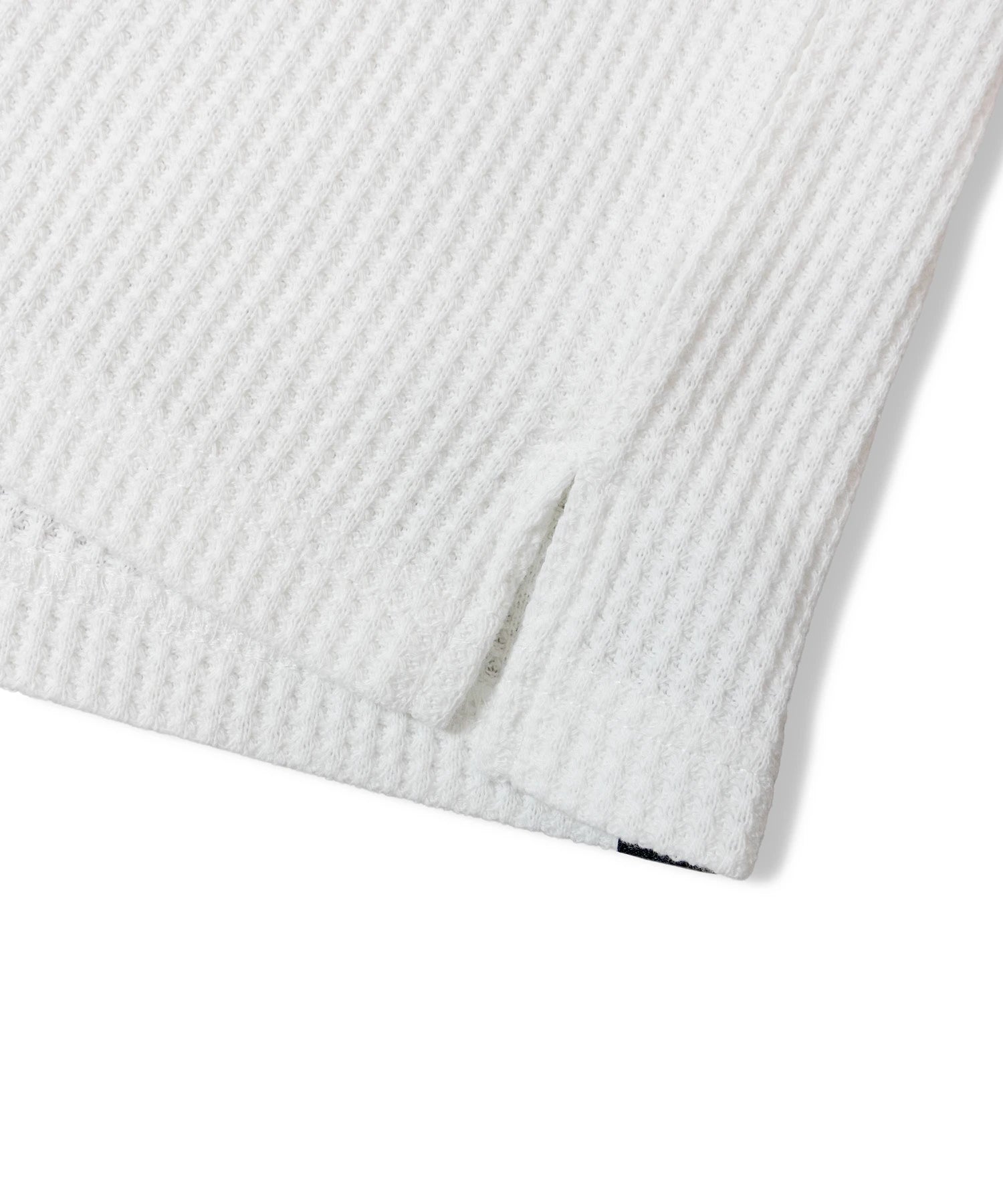 素材には凹凸のあるワッフル生地(サーマル地)を使用。柔らかく伸縮性があり、着心地の良さと保温性を兼ね備えているのが特徴です。程よくゆとりのあるシルエットで、1枚着としてはもちろん、シャツやジャケットのインナーとしても活躍します。