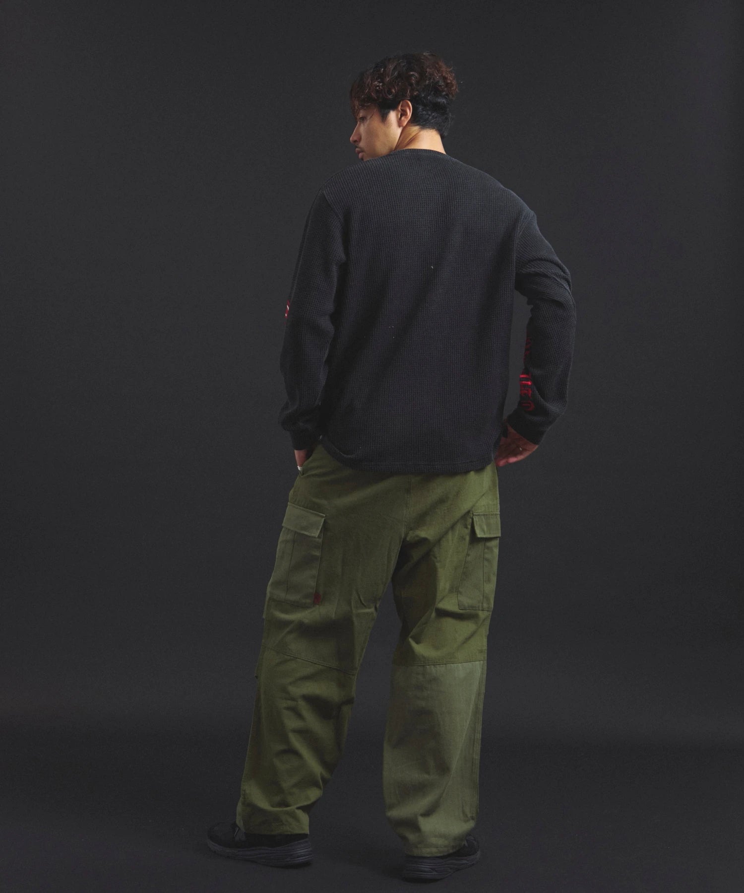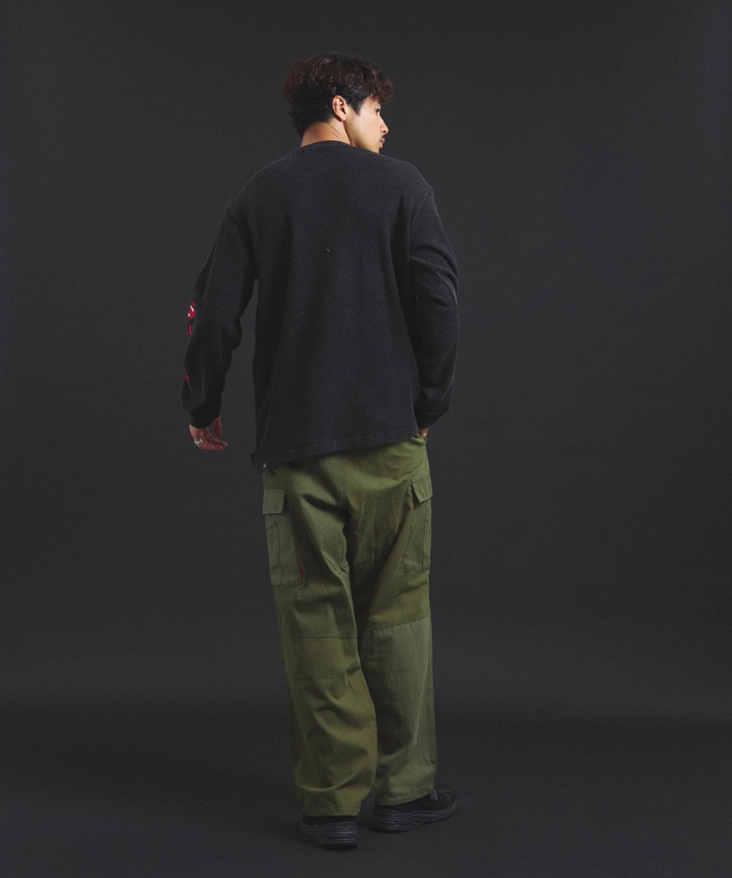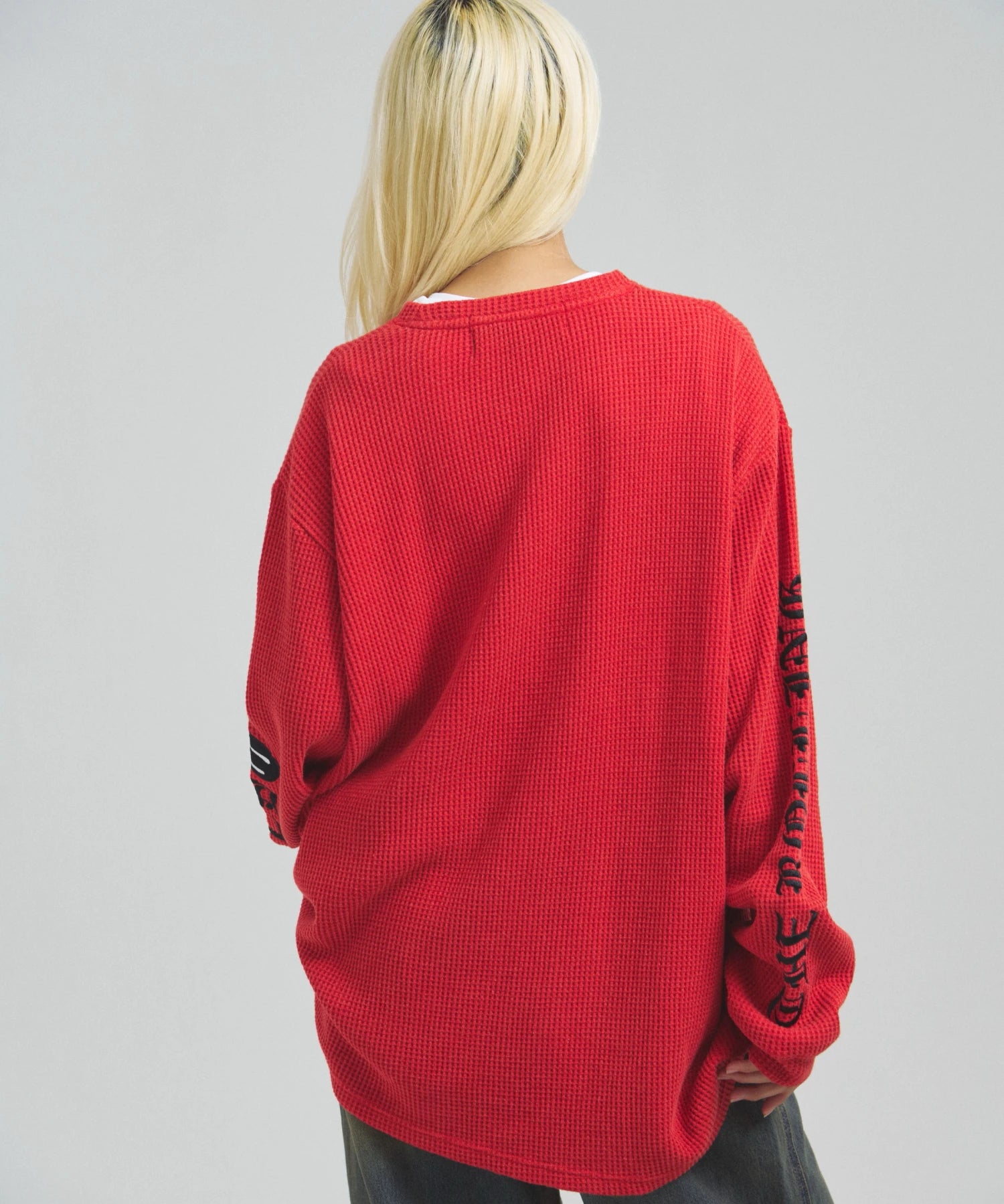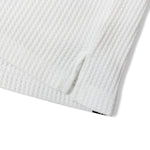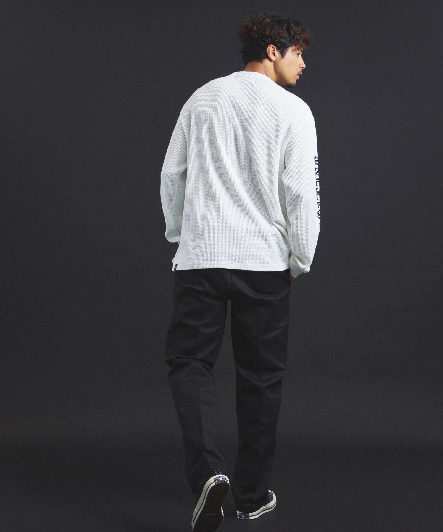 素材には凹凸のあるワッフル生地(サーマル地)を使用。柔らかく伸縮性があり、着心地の良さと保温性を兼ね備えているのが特徴です。程よくゆとりのあるシルエットで、1枚着としてはもちろん、シャツやジャケットのインナーとしても活躍します。