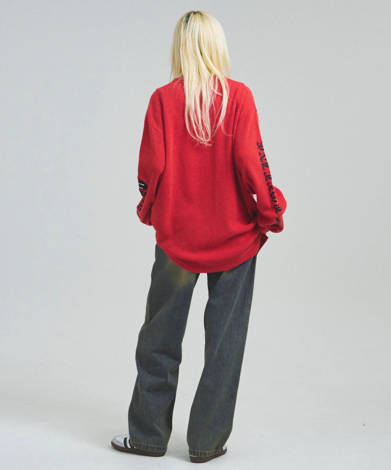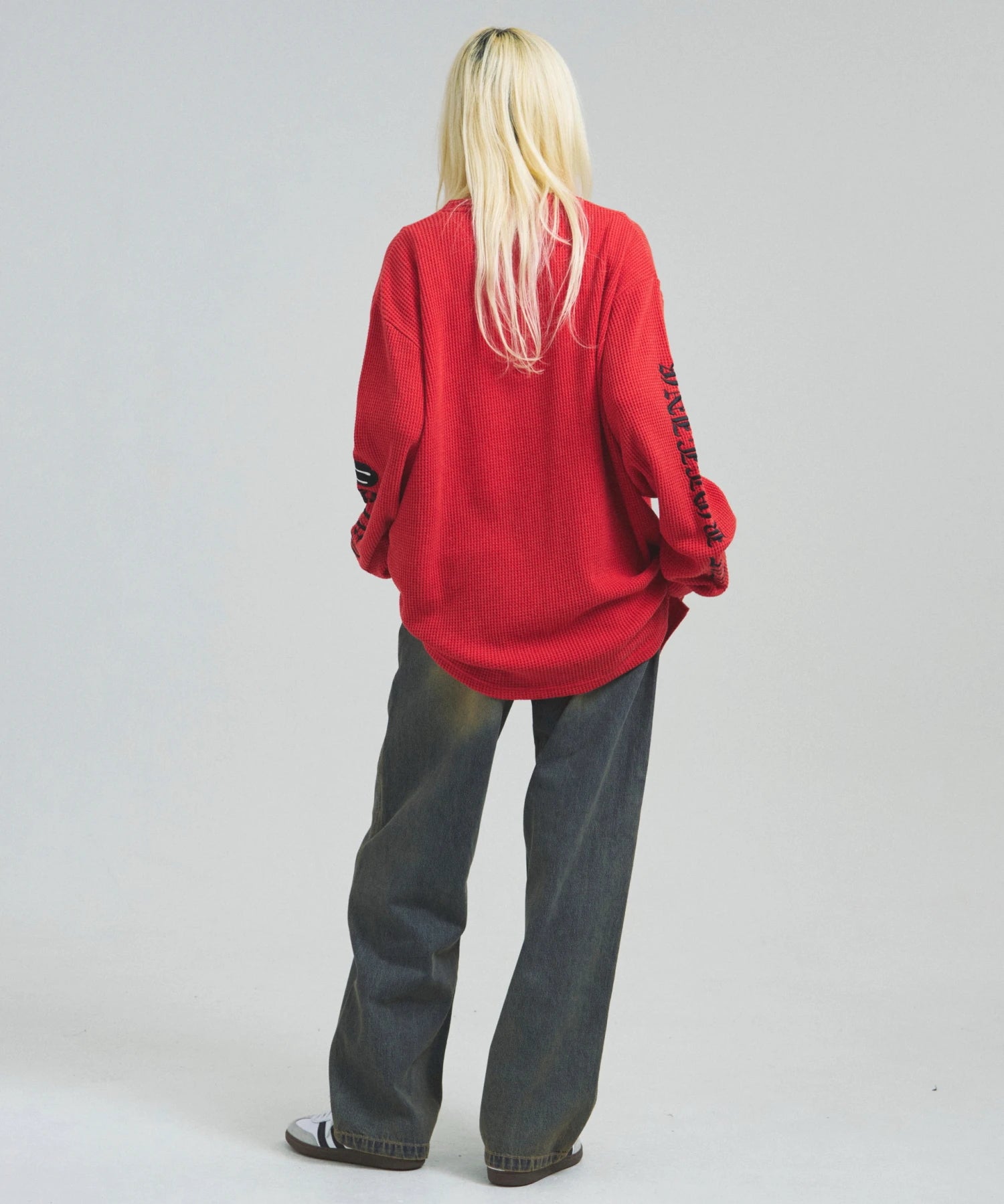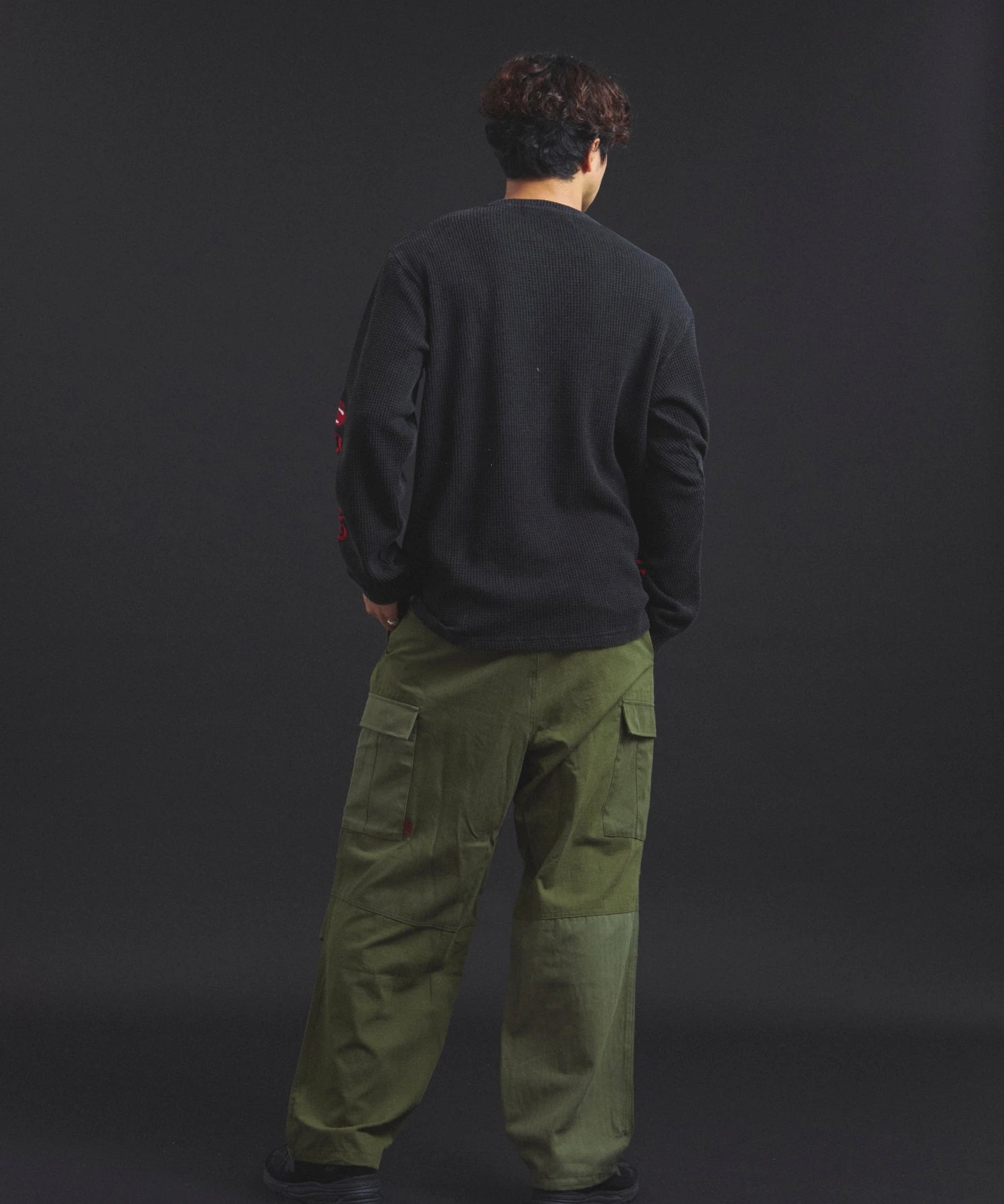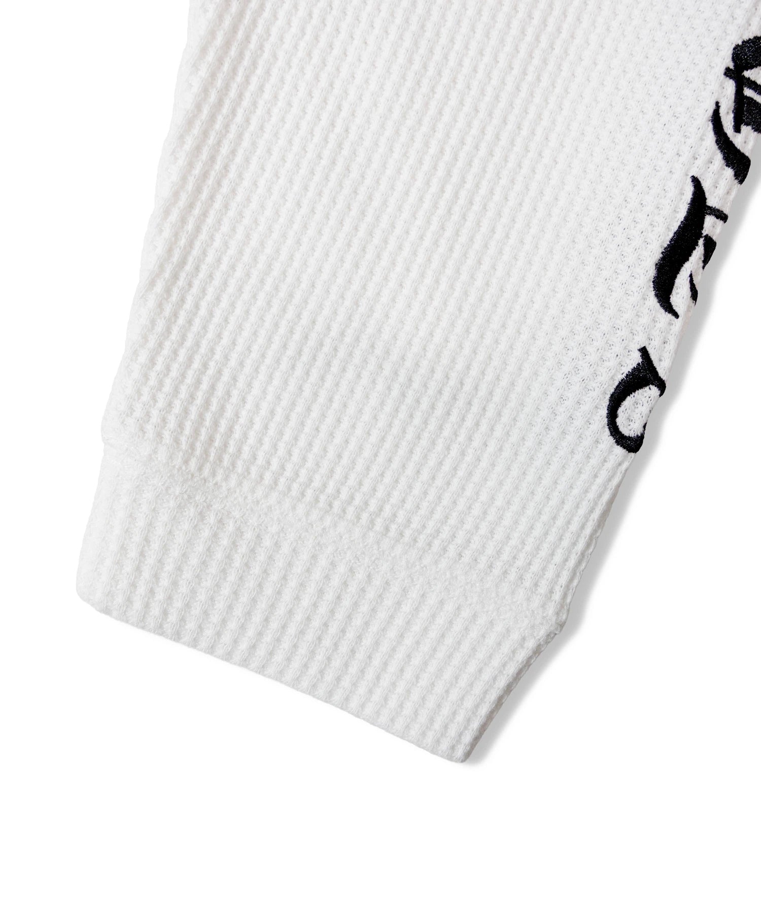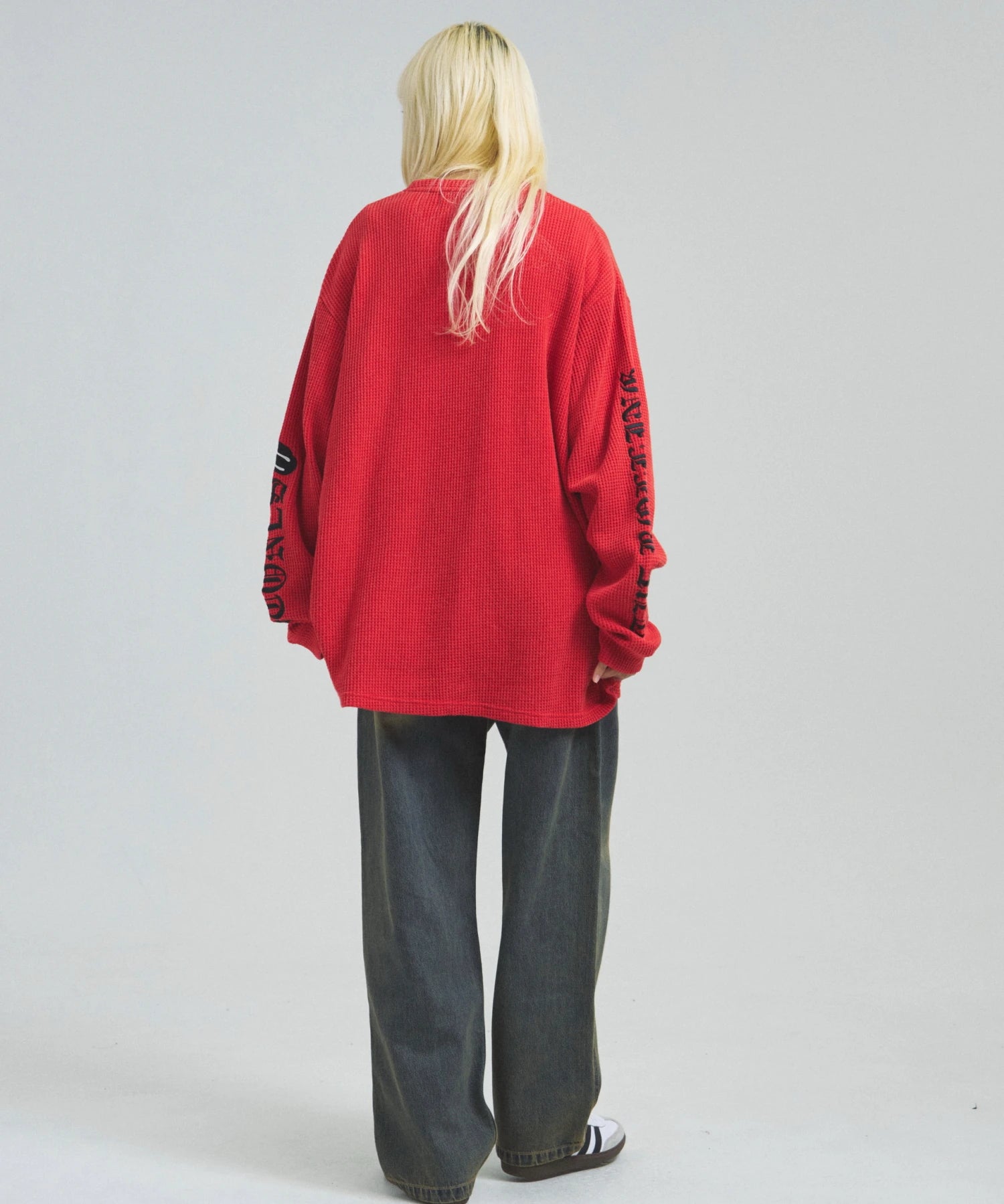素材には凹凸のあるワッフル生地(サーマル地)を使用。柔らかく伸縮性があり、着心地の良さと保温性を兼ね備えているのが特徴です。程よくゆとりのあるシルエットで、1枚着としてはもちろん、シャツやジャケットのインナーとしても活躍します。