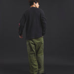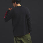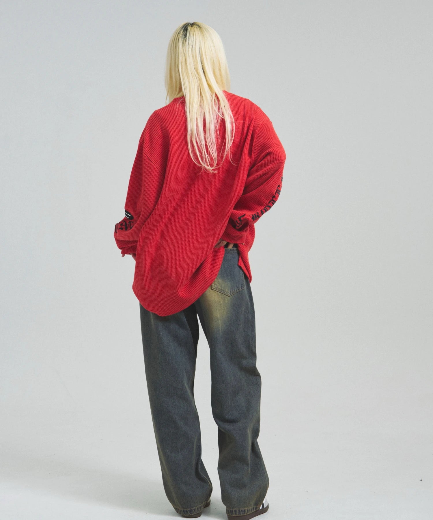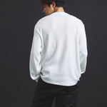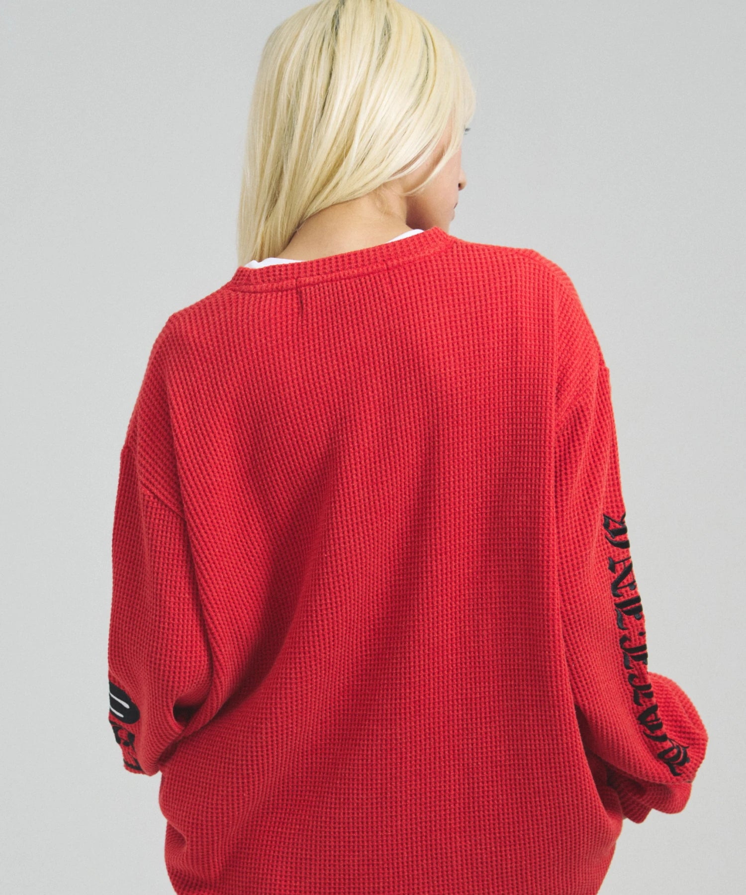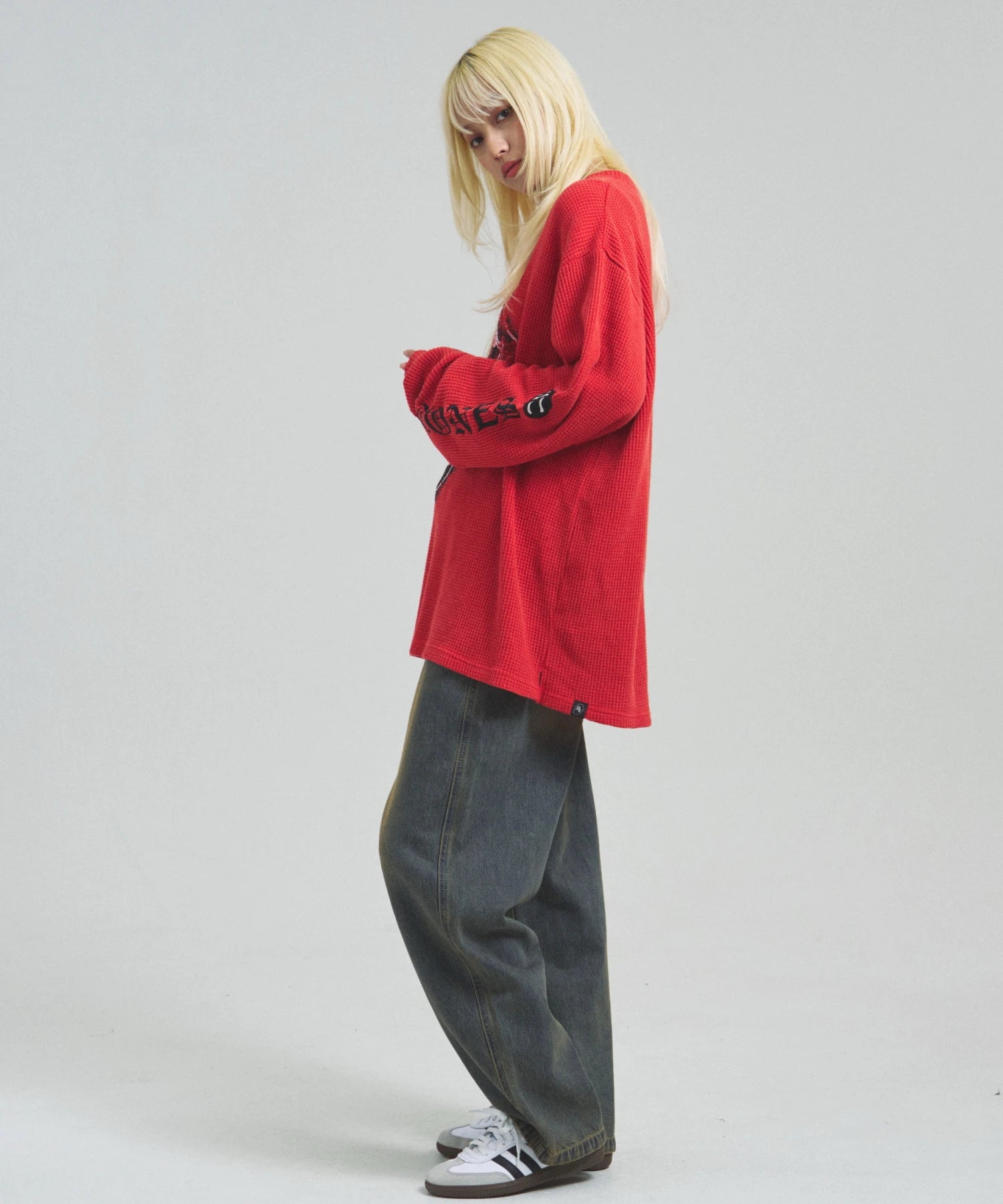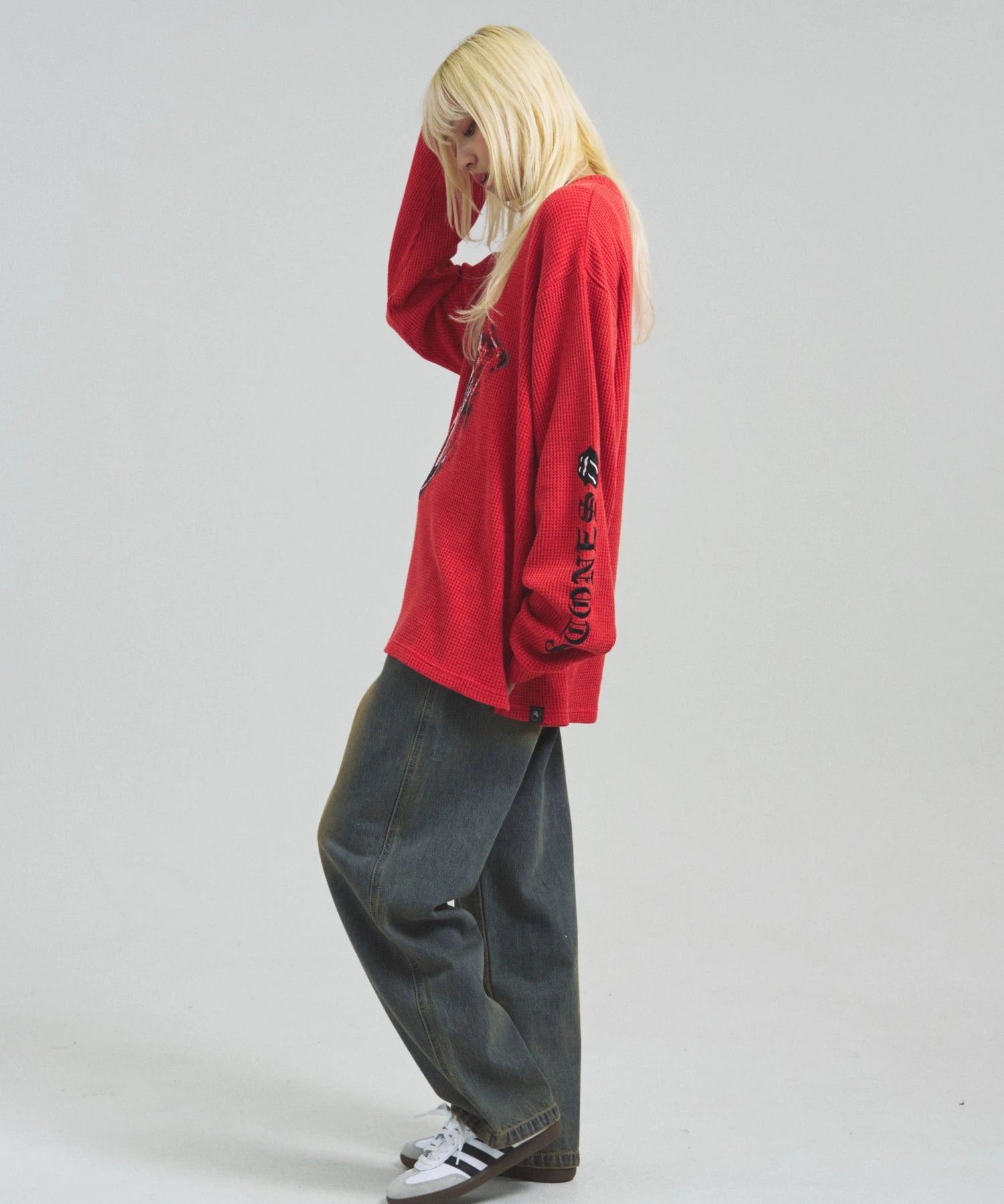 素材には凹凸のあるワッフル生地(サーマル地)を使用。柔らかく伸縮性があり、着心地の良さと保温性を兼ね備えているのが特徴です。程よくゆとりのあるシルエットで、1枚着としてはもちろん、シャツやジャケットのインナーとしても活躍します。