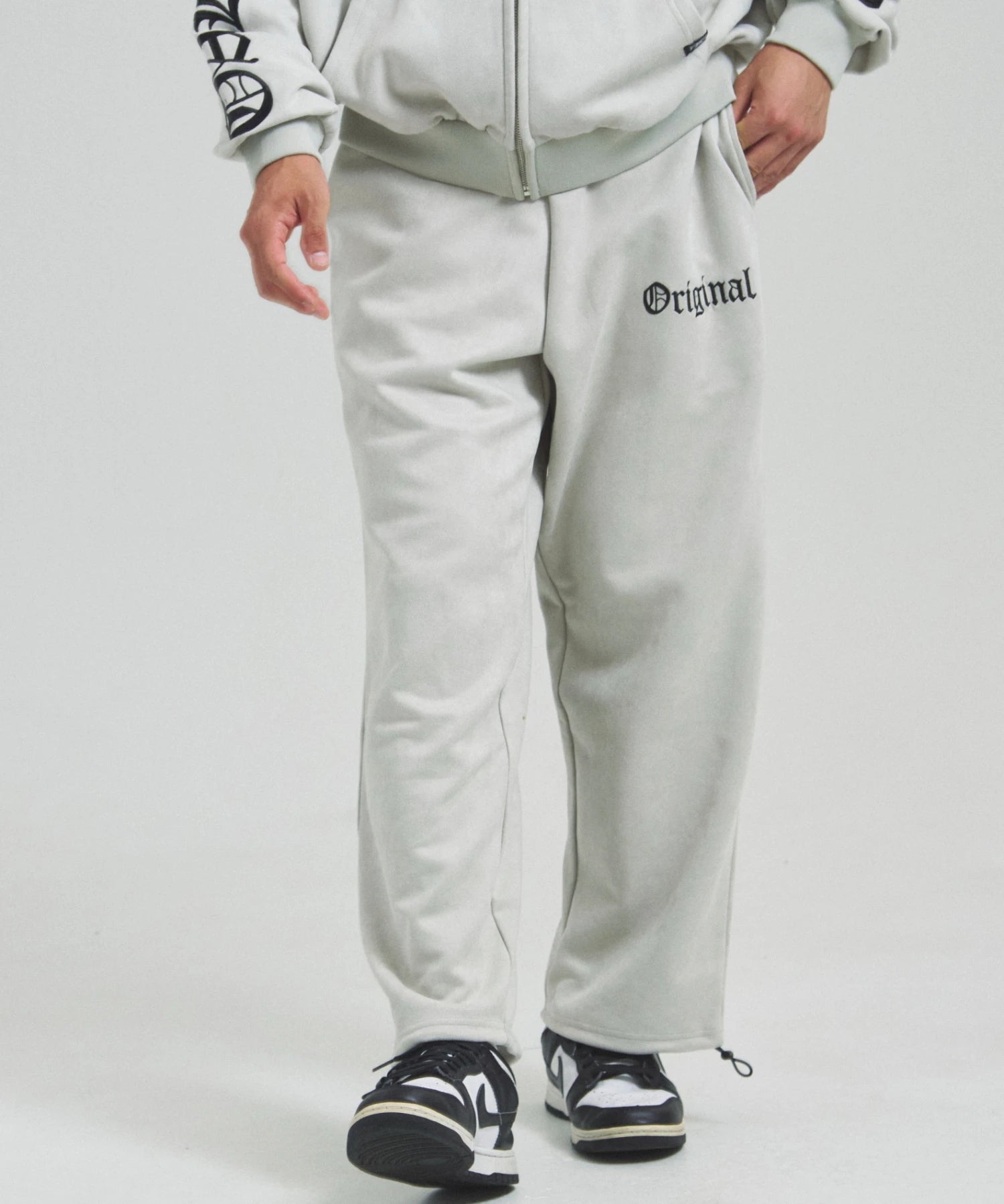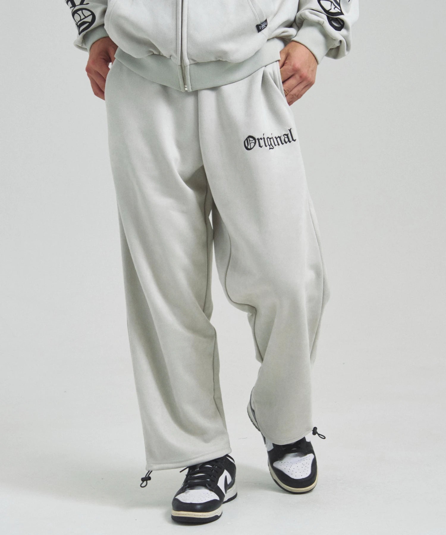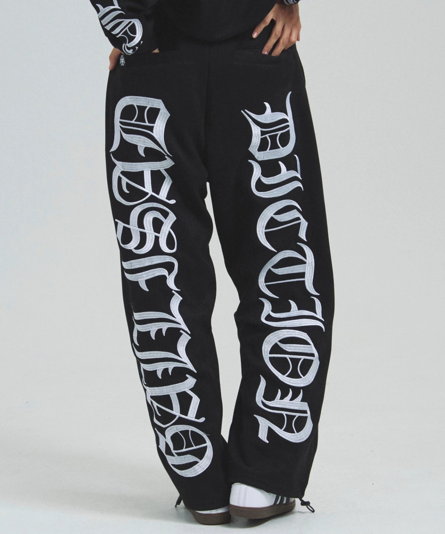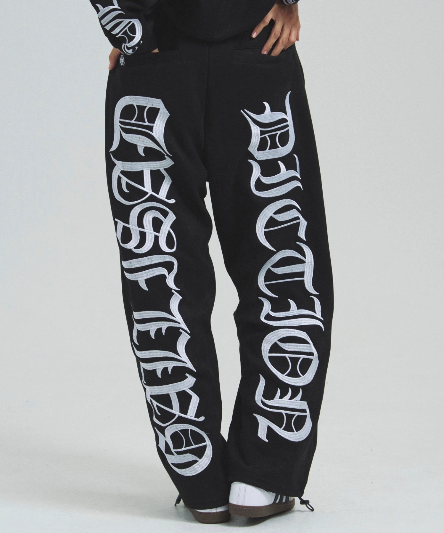 ・両脚背面に施されたインパクトのある刺繍デザイン・ウエストはドローコード付きのイージー仕様・単品でもセットアップでも着用可能・しなやかで伸縮性のあるスウェードタッチ素材