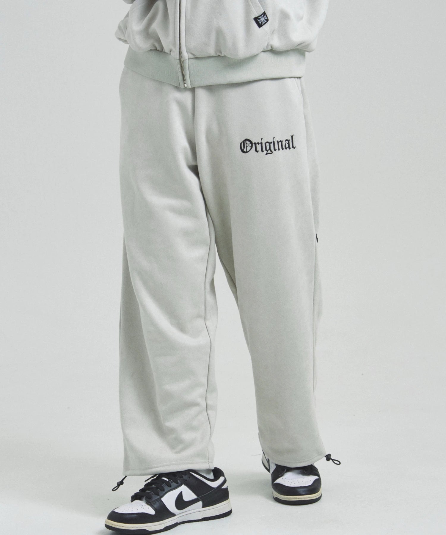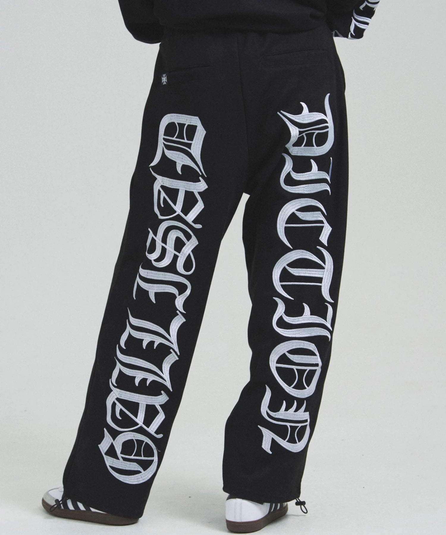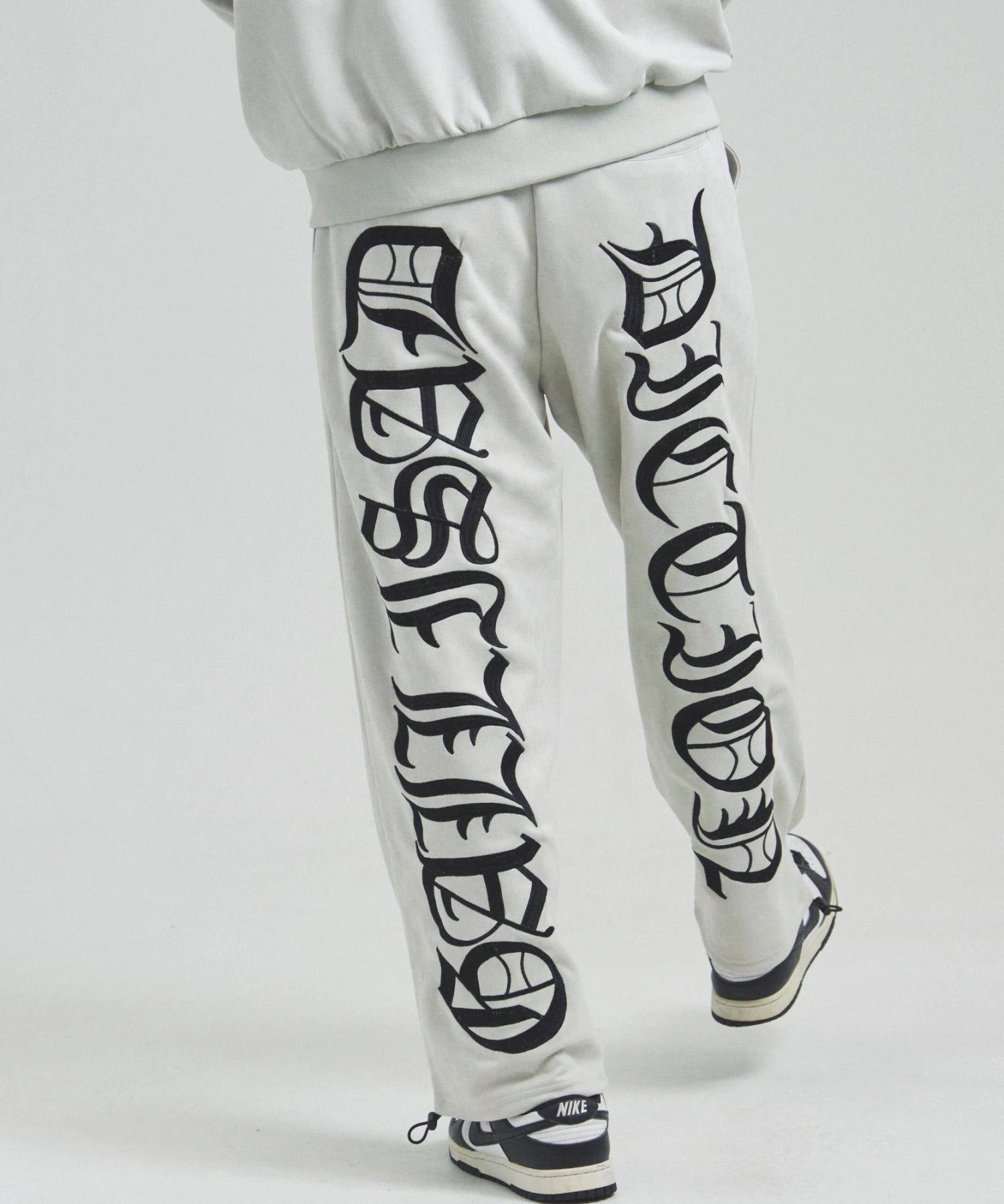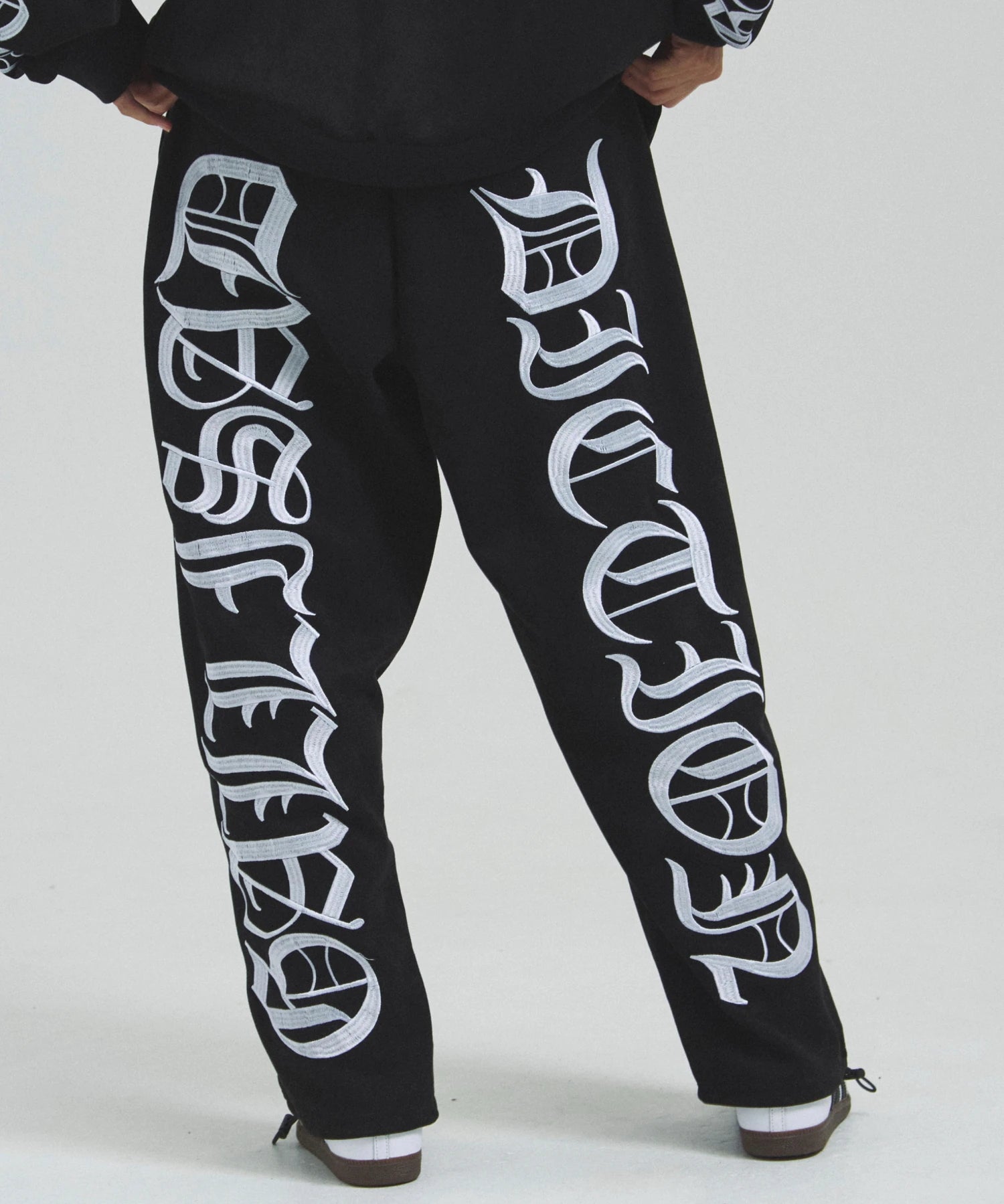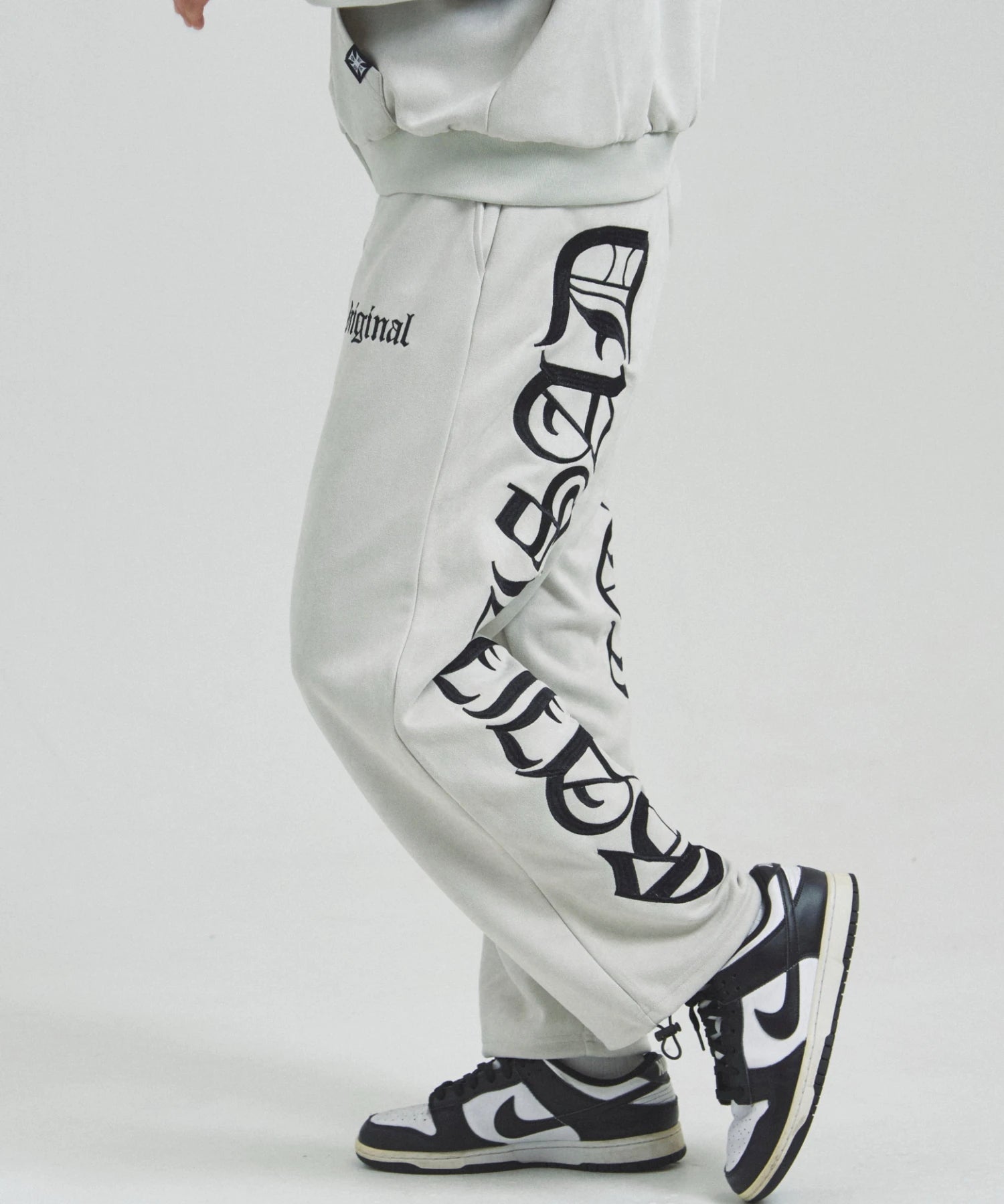 ・両脚背面に施されたインパクトのある刺繍デザイン・ウエストはドローコード付きのイージー仕様・単品でもセットアップでも着用可能・しなやかで伸縮性のあるスウェードタッチ素材