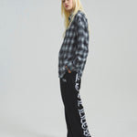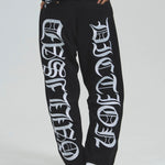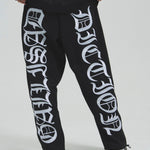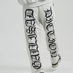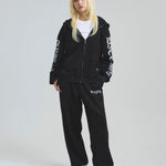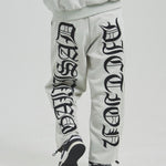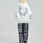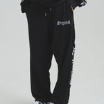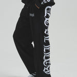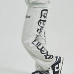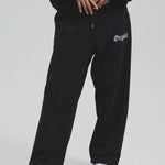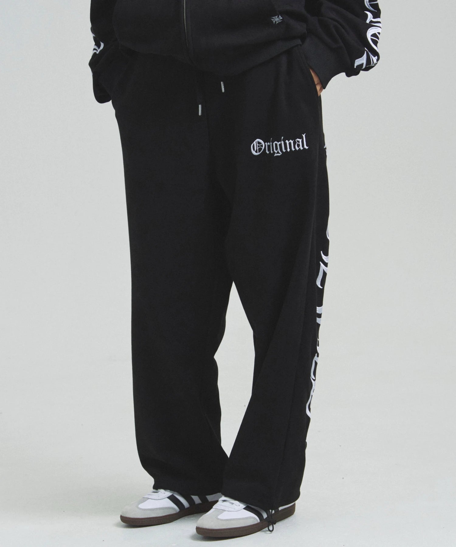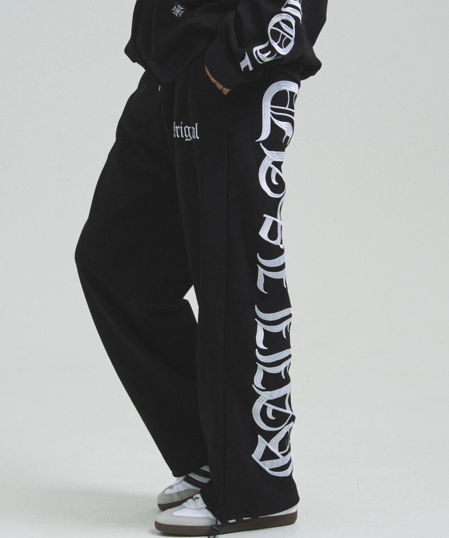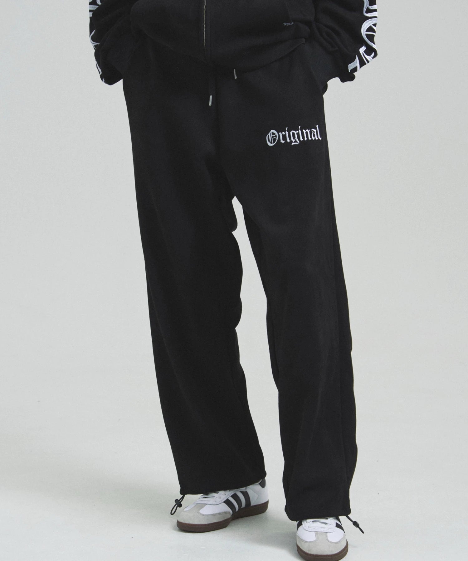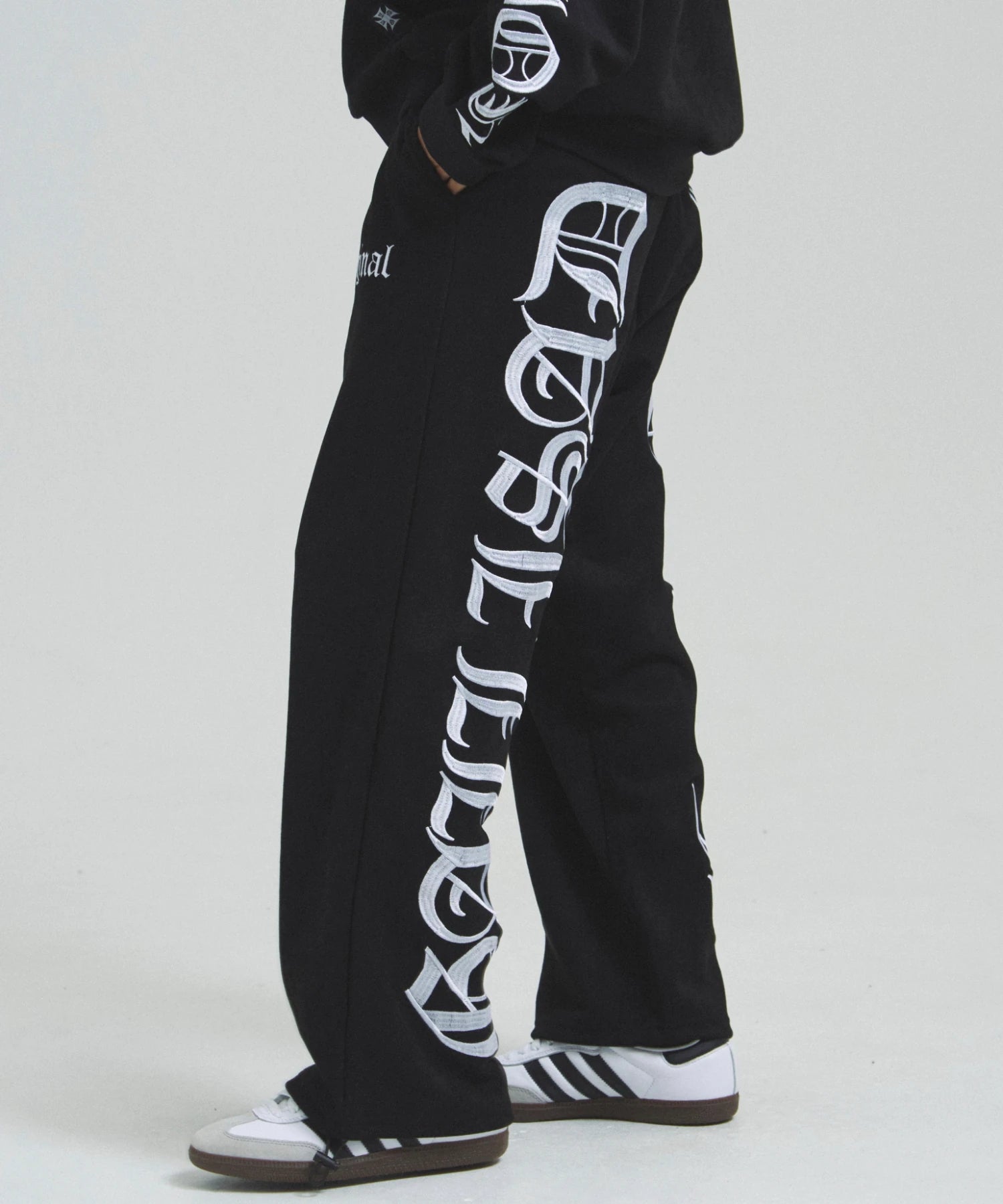 ・両脚背面に施されたインパクトのある刺繍デザイン・ウエストはドローコード付きのイージー仕様・単品でもセットアップでも着用可能・しなやかで伸縮性のあるスウェードタッチ素材