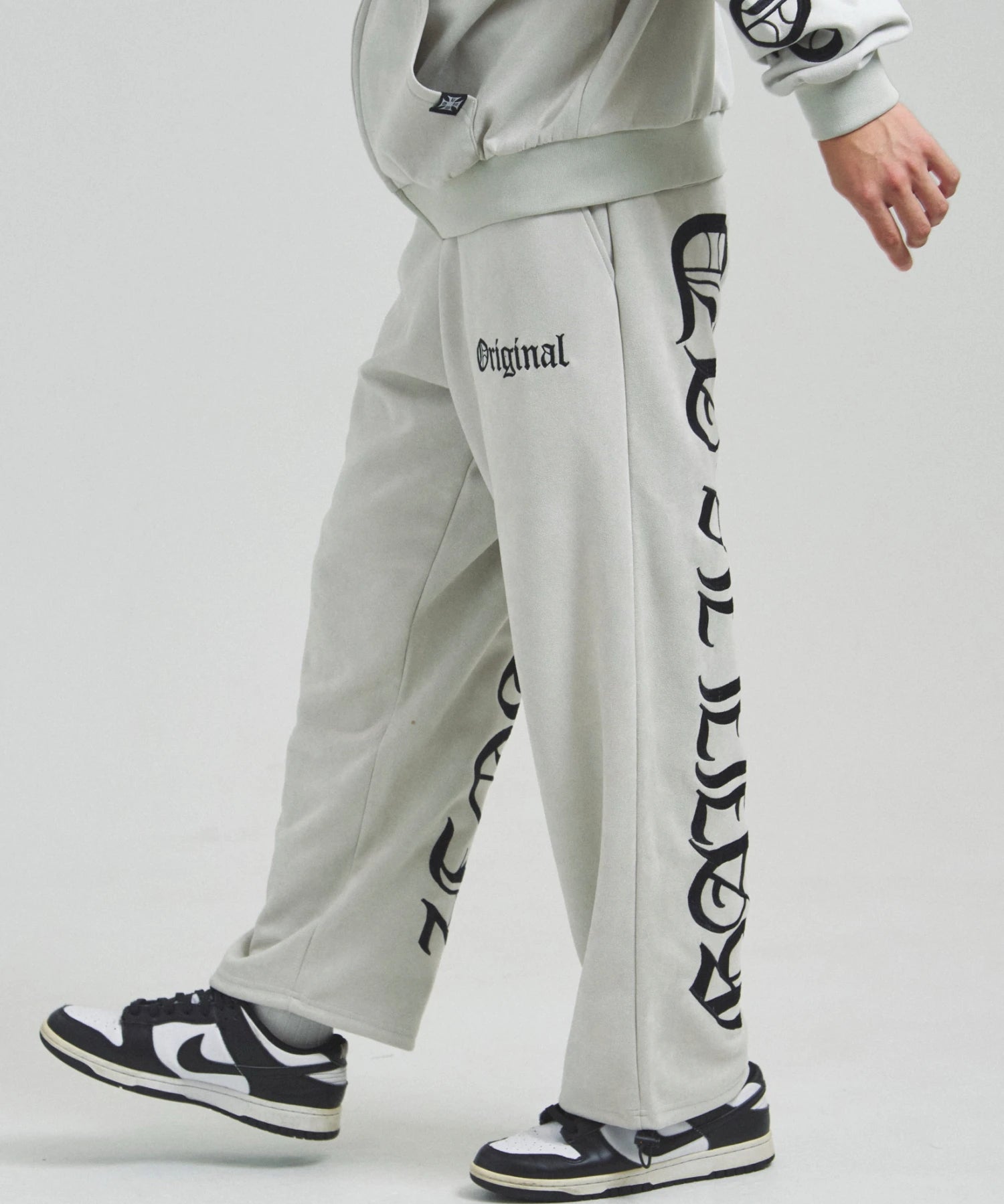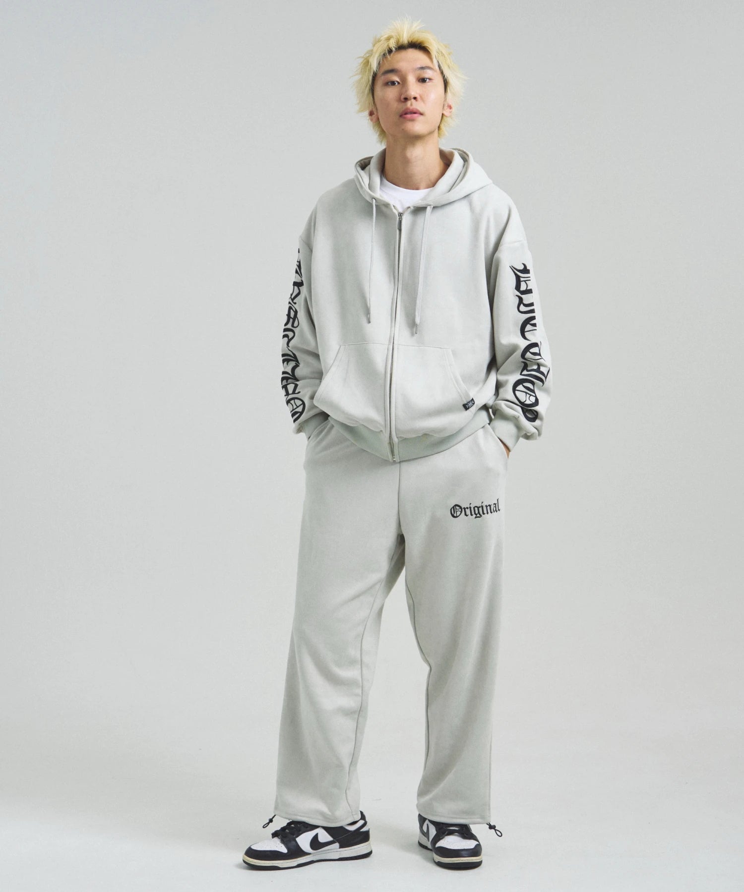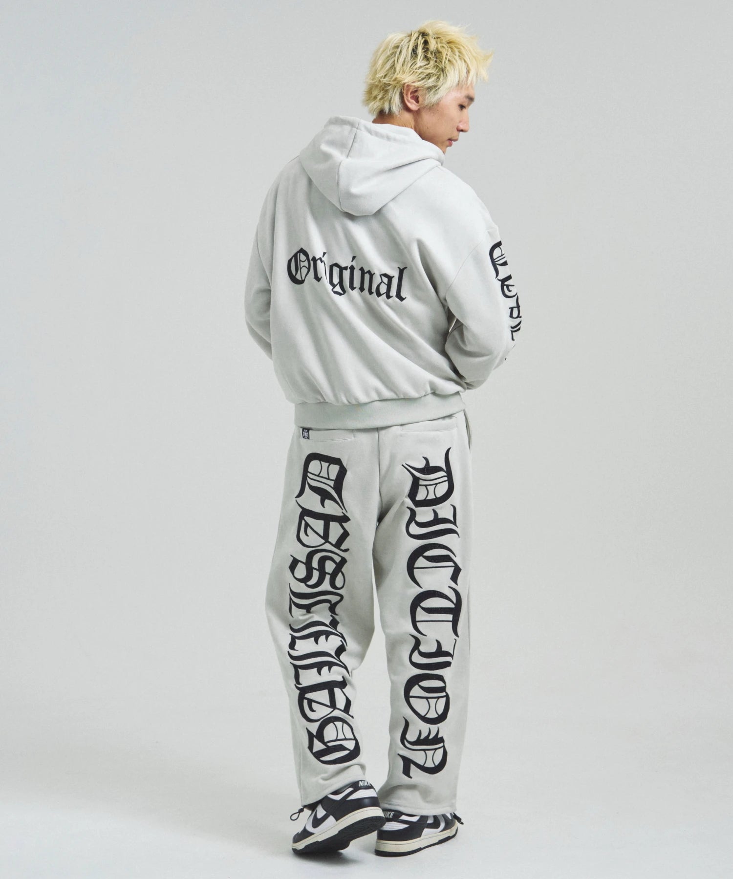 GALLIS ADDICTIONからバックに大きく入ったOLD ENGLISHロゴ刺繍が目を惹くスウェードライクパンツ。ゆったりとしたストレートシルエットで、抜け感のあるストリートスタイルを演出。同シリーズのZIP-HOODIEとセットアップでの着用も可能で、存在感抜群のコーディネートが完成します。