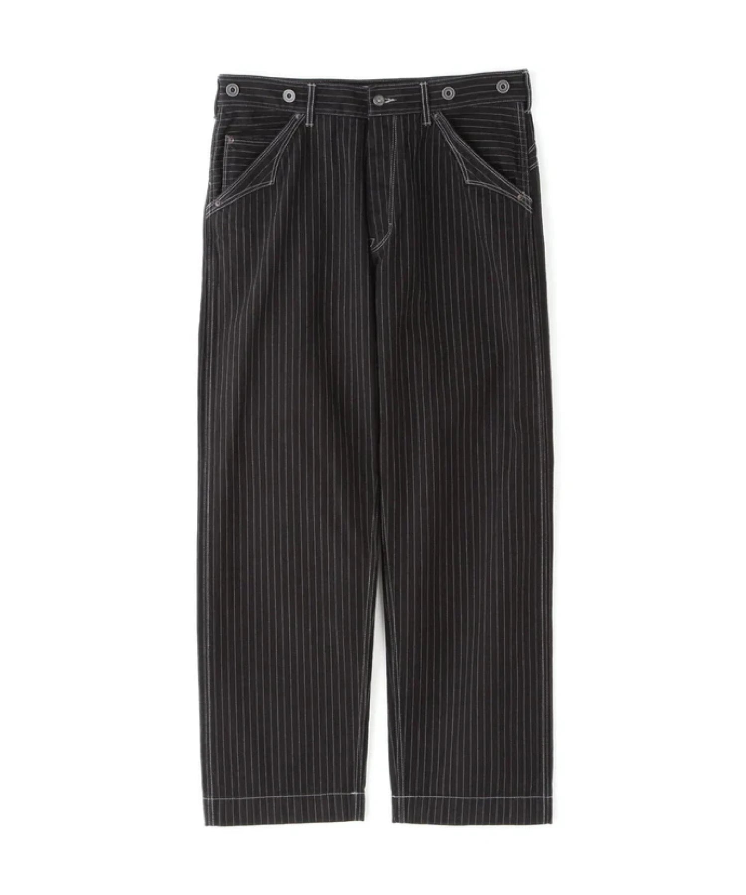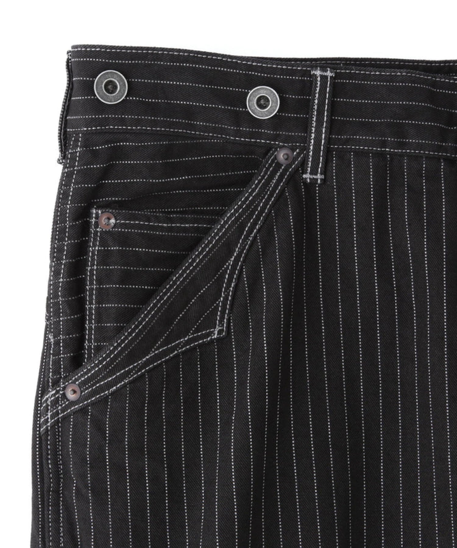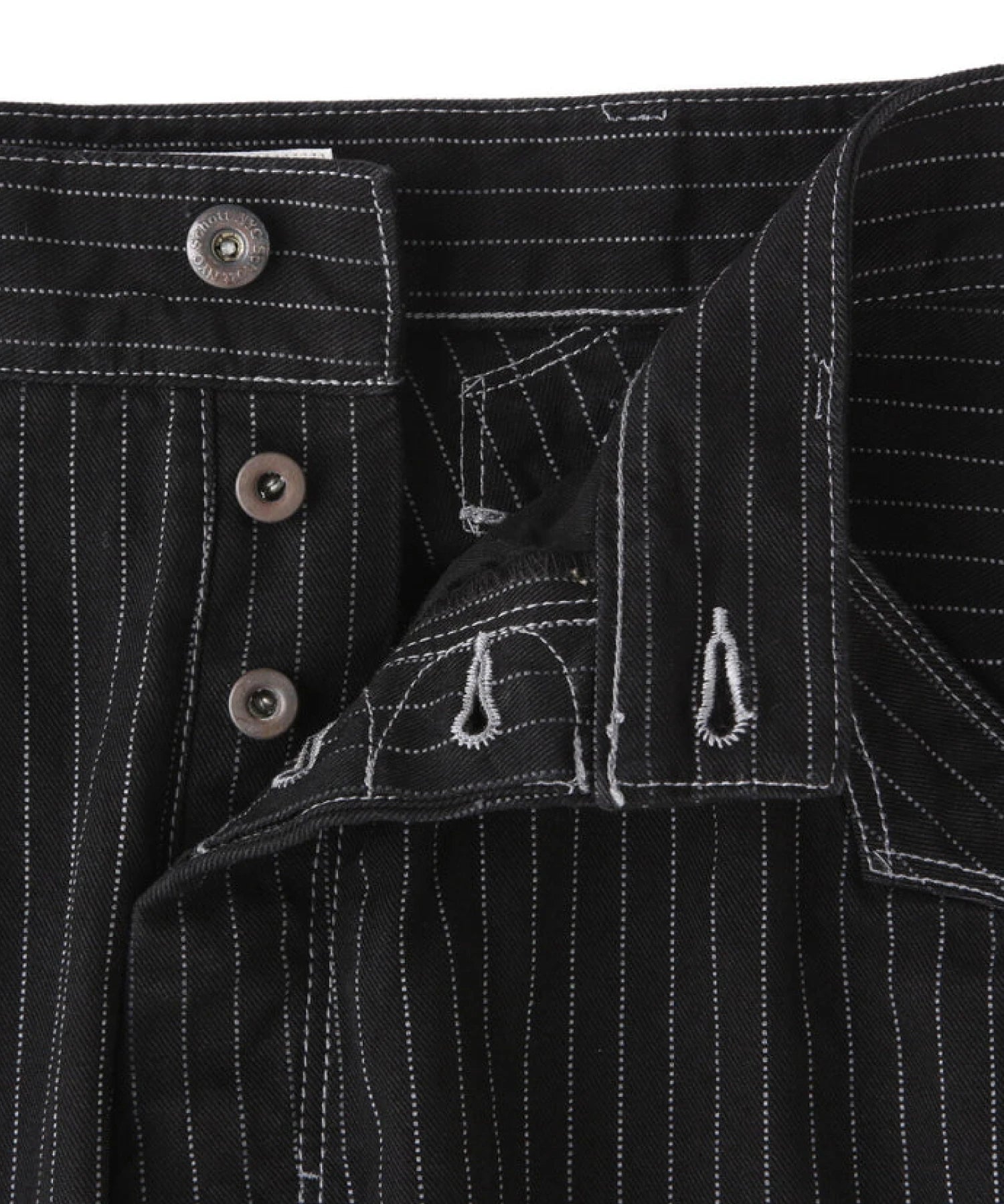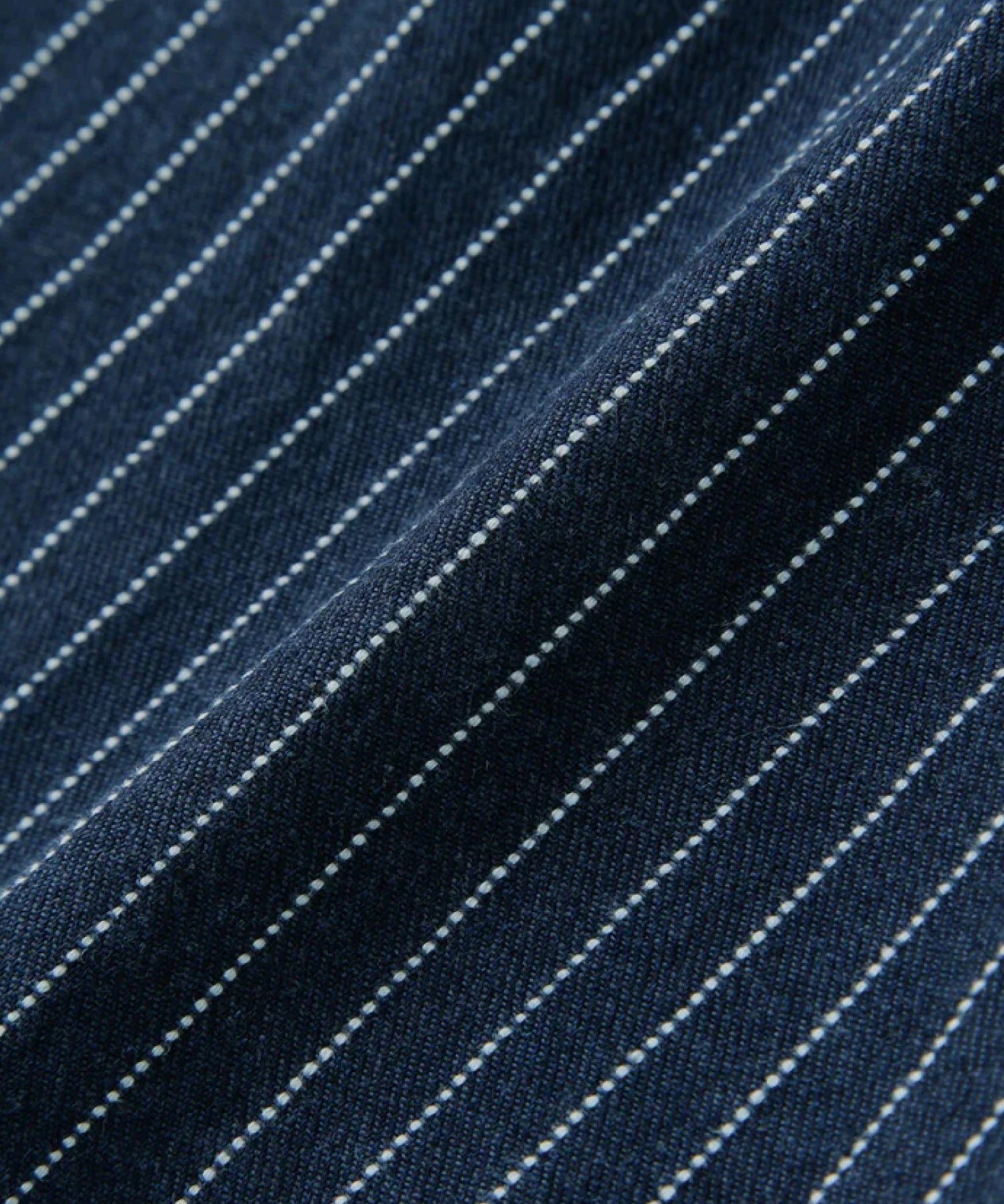 深めの股上とワイドストレートシルエットで、取り入れやすさと快適な穿き心地を兼備。素材にはSchottオリジナルのピンストライプヒッコリーデニムを採用し、ブラックは硫化染料を用いたワンウォッシュ仕上げ、インディゴは自然なアタリ感を引き出す弱加工を施しました。プリントではなく織りで表現されたストライプが、長く愛用するほどに風合いを増していきます。