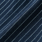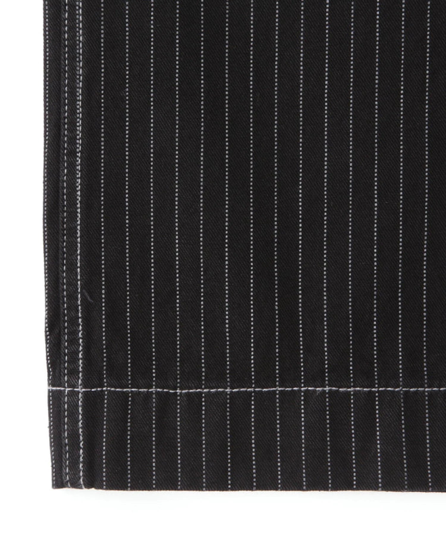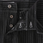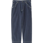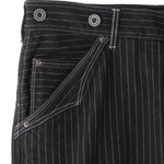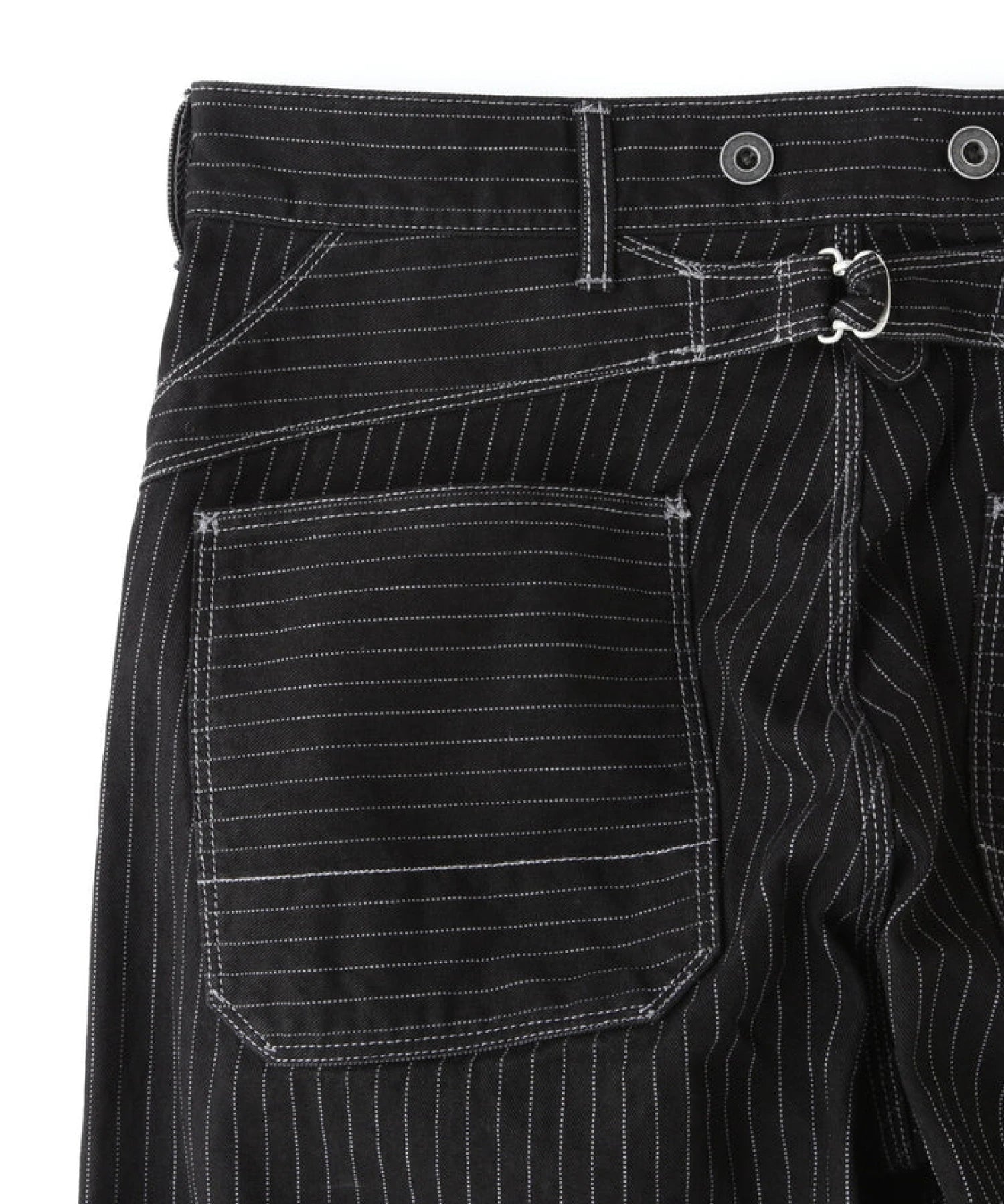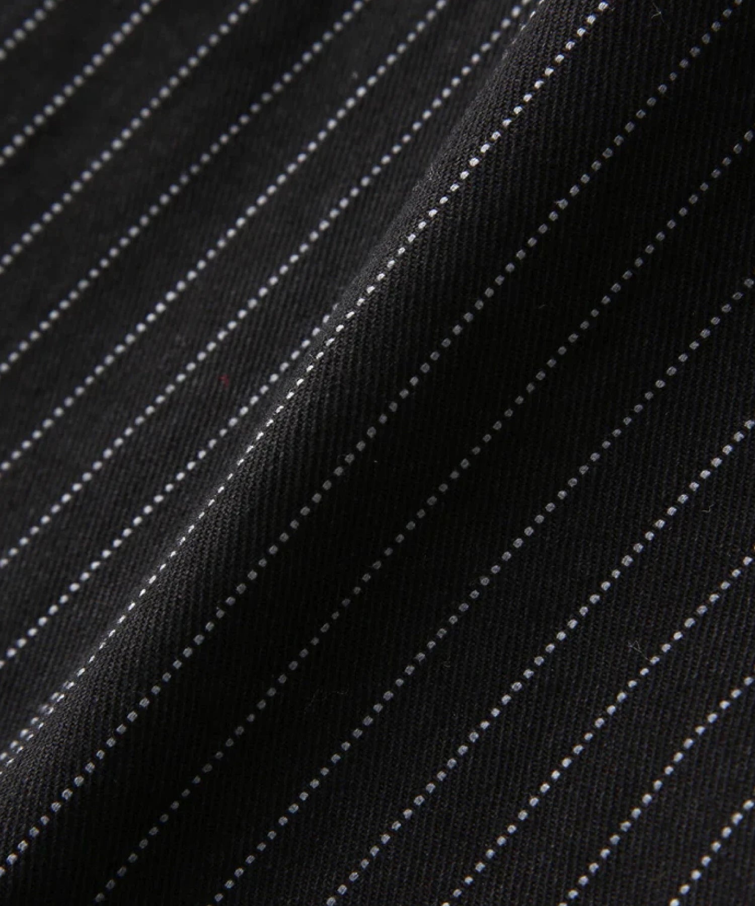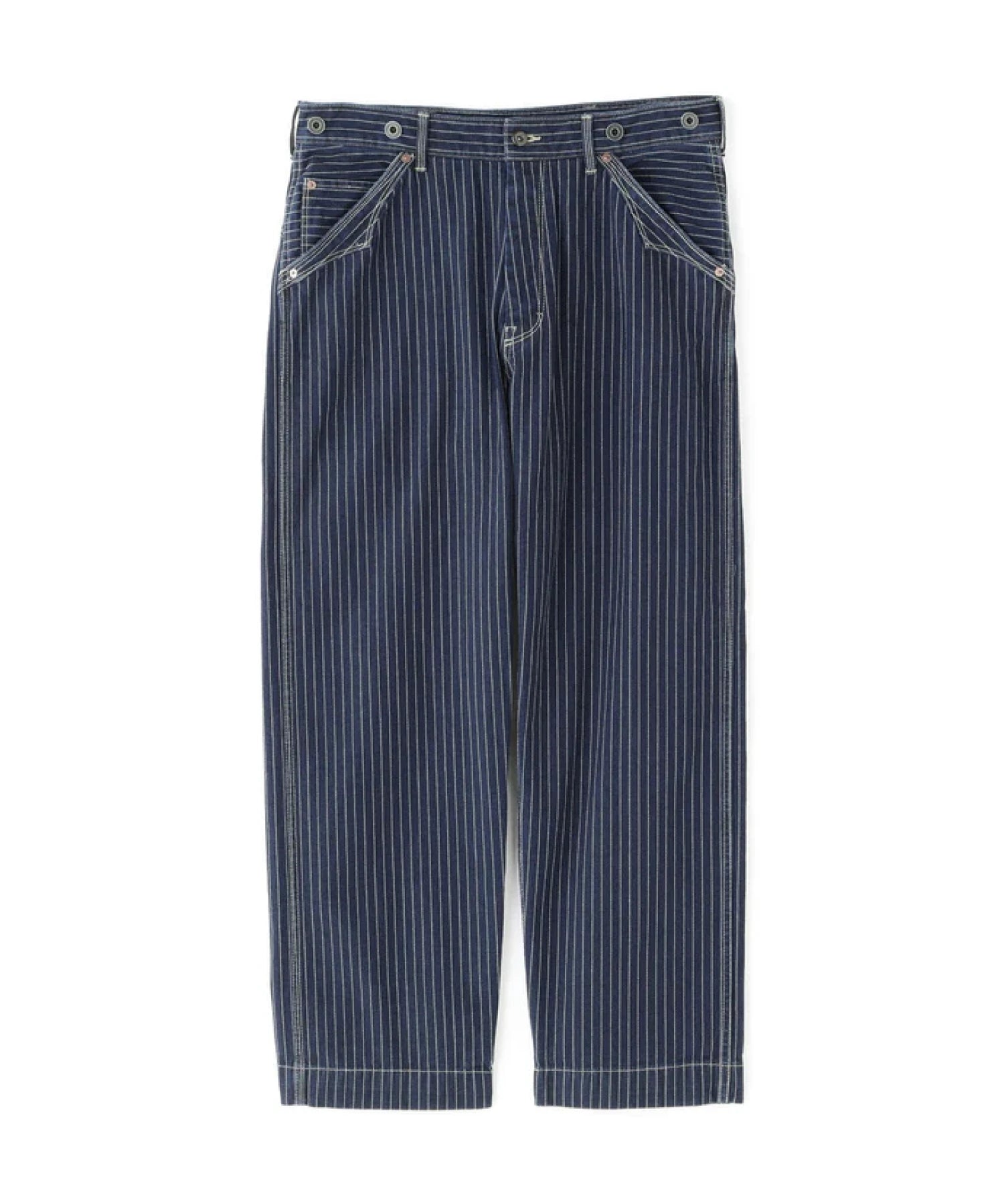 深めの股上とワイドストレートシルエットで、取り入れやすさと快適な穿き心地を兼備。素材にはSchottオリジナルのピンストライプヒッコリーデニムを採用し、ブラックは硫化染料を用いたワンウォッシュ仕上げ、インディゴは自然なアタリ感を引き出す弱加工を施しました。プリントではなく織りで表現されたストライプが、長く愛用するほどに風合いを増していきます。