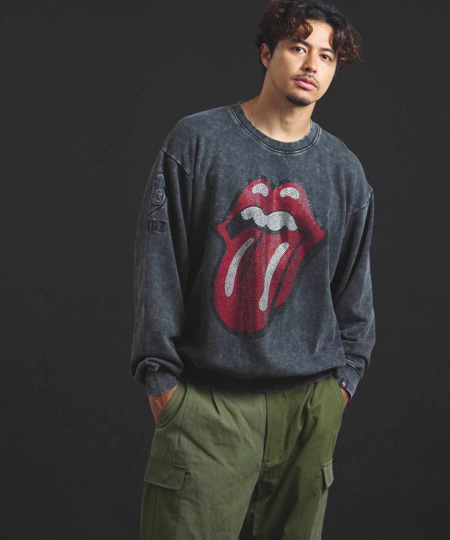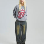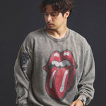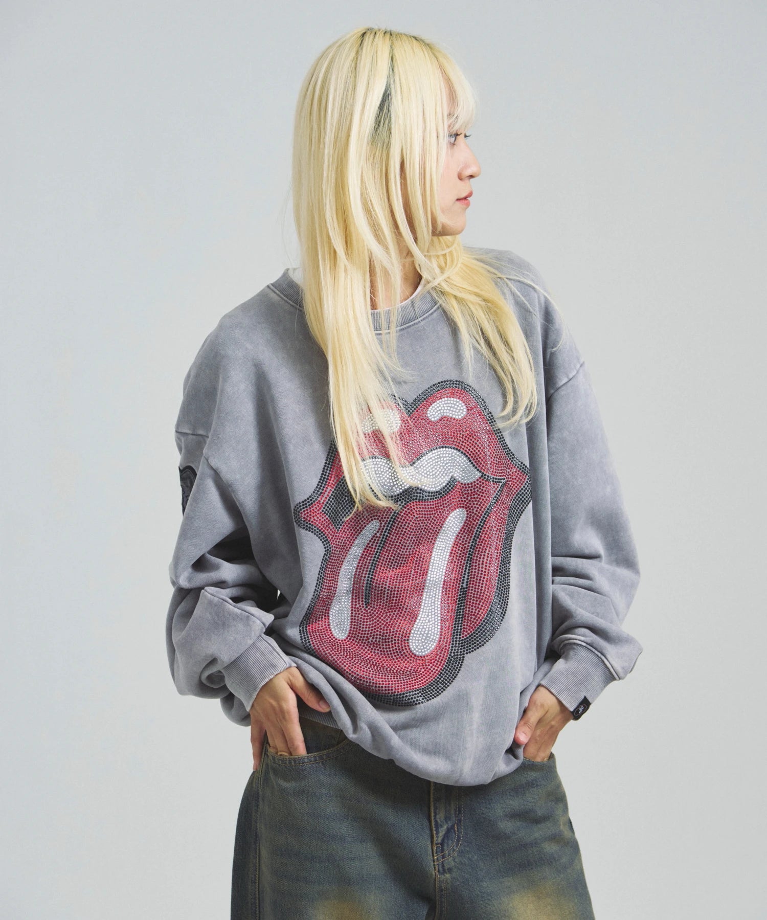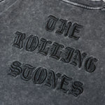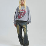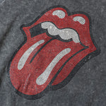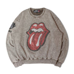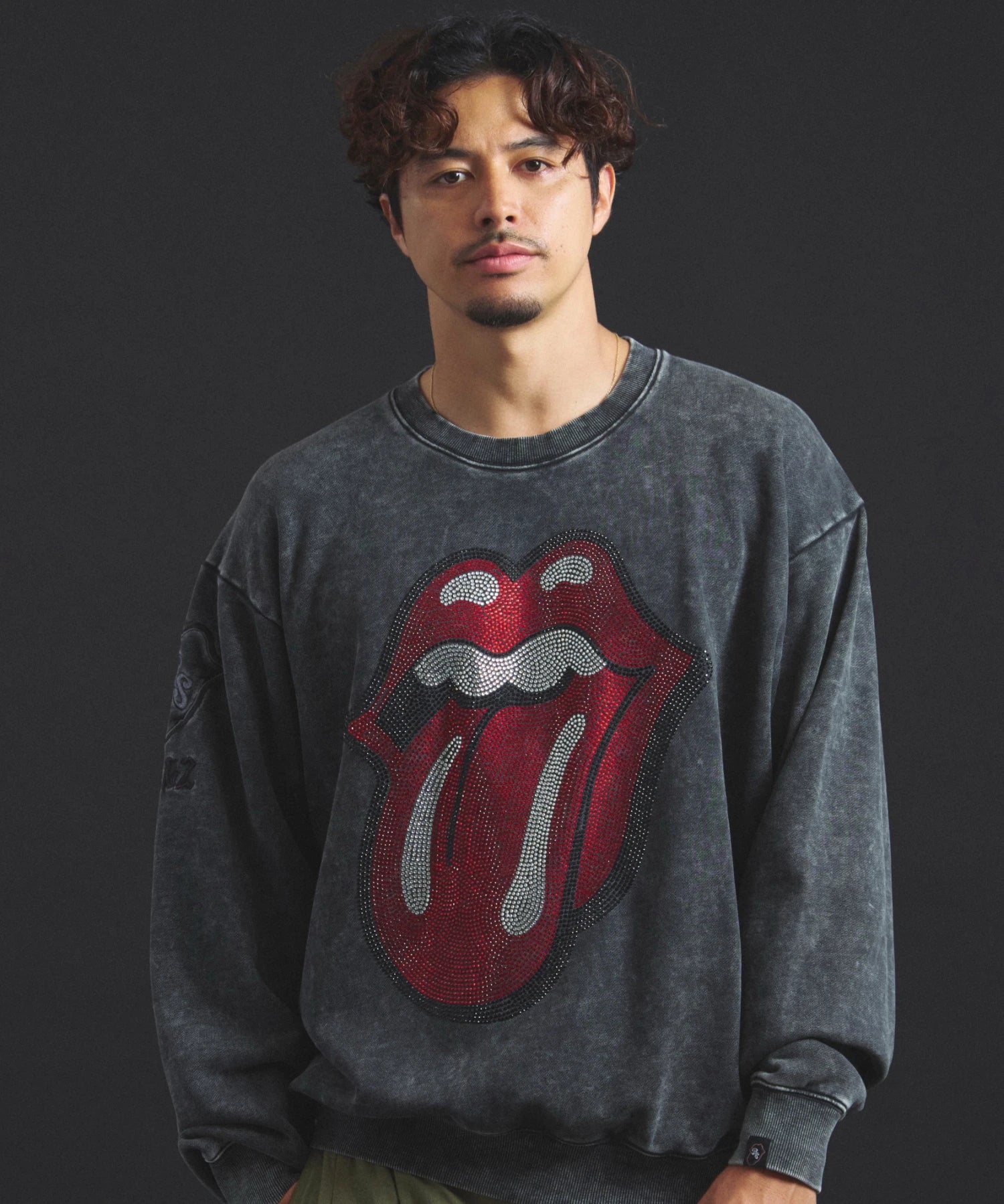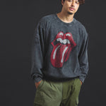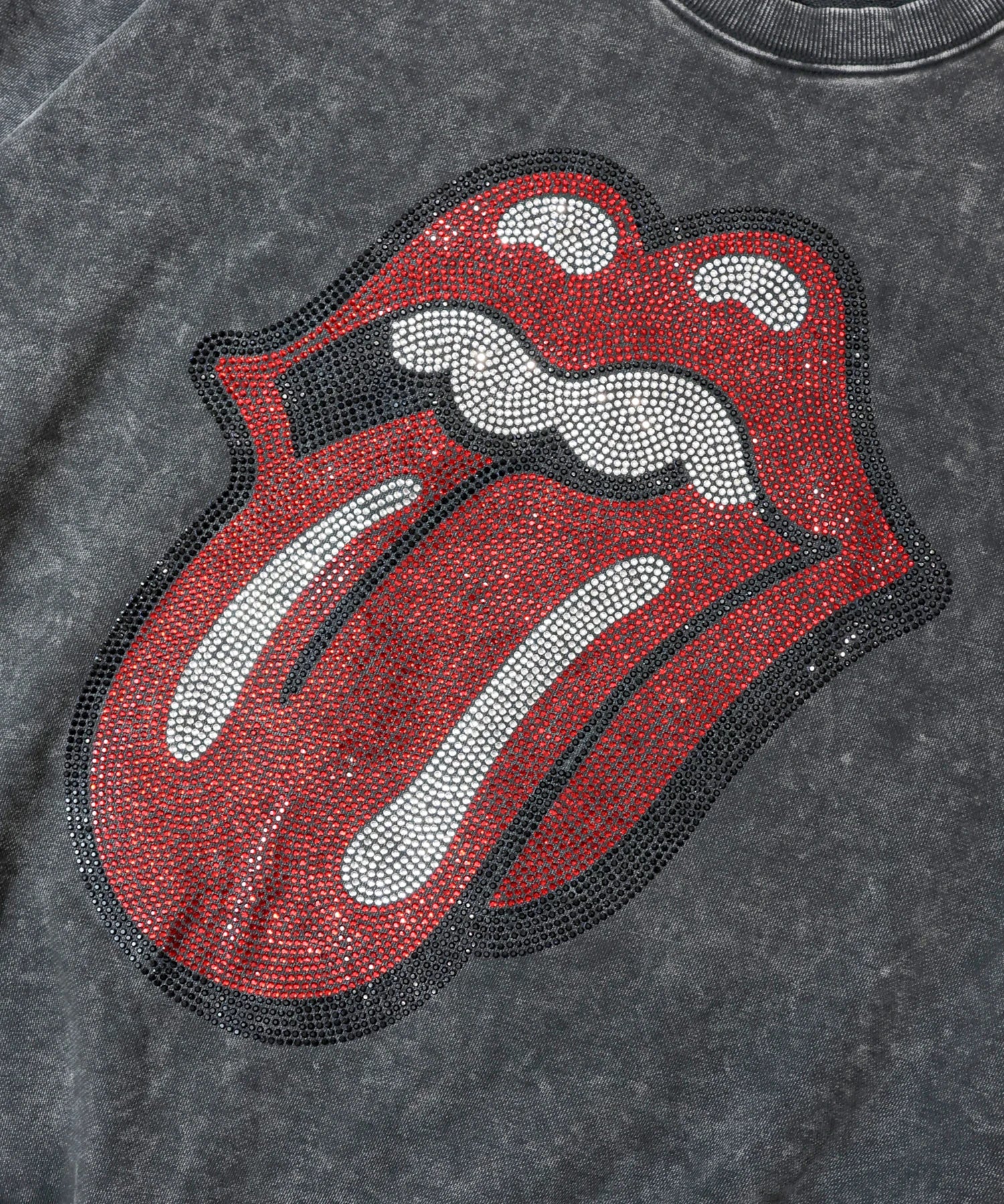 バンドの象徴である「Lips & Tongue(リップス&タン)」ロゴをきらめくラインストーンで大胆にあしらい、ヴィンテージ感のあるウォッシュ加工で長年愛用したような風合いを表現。
