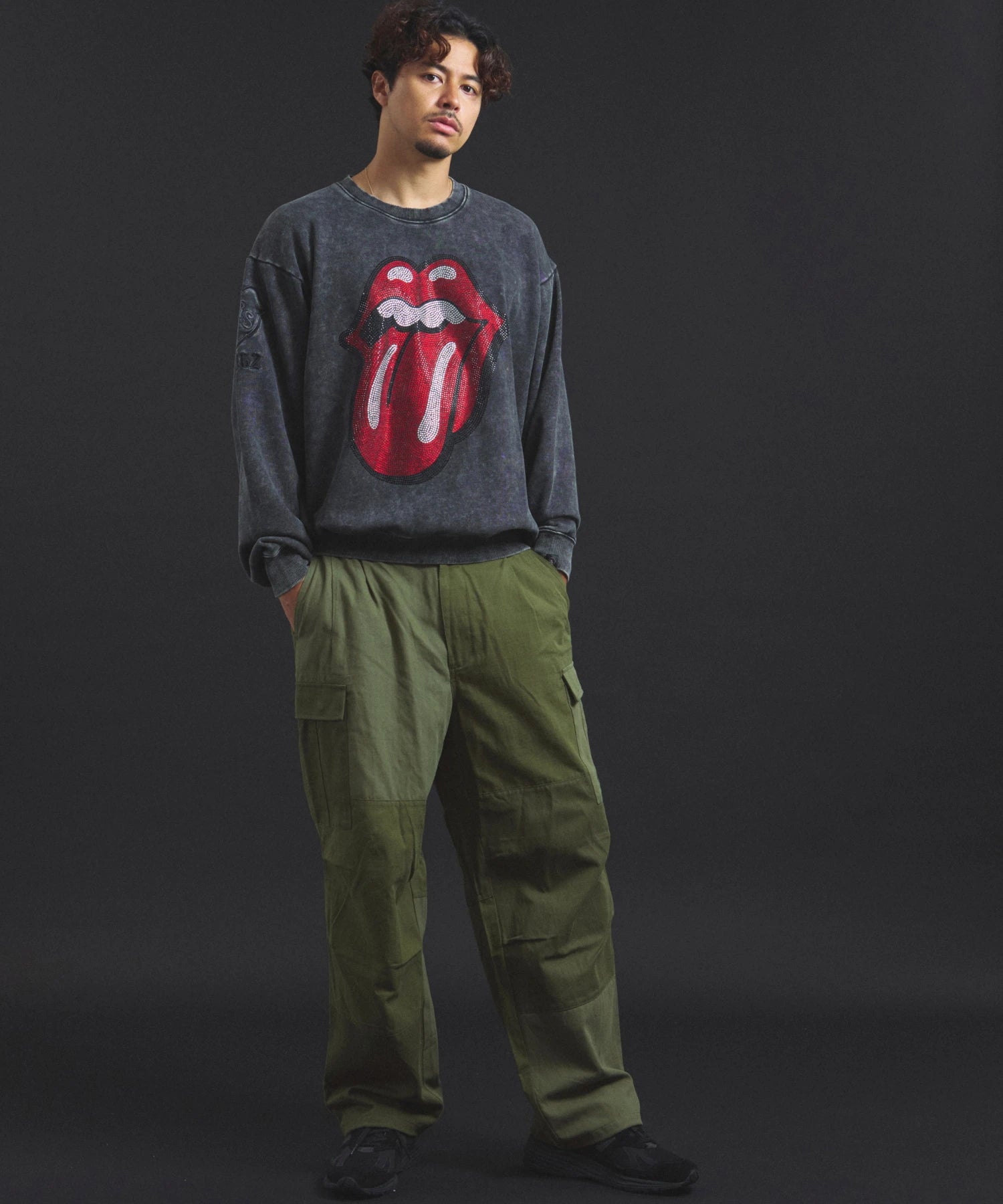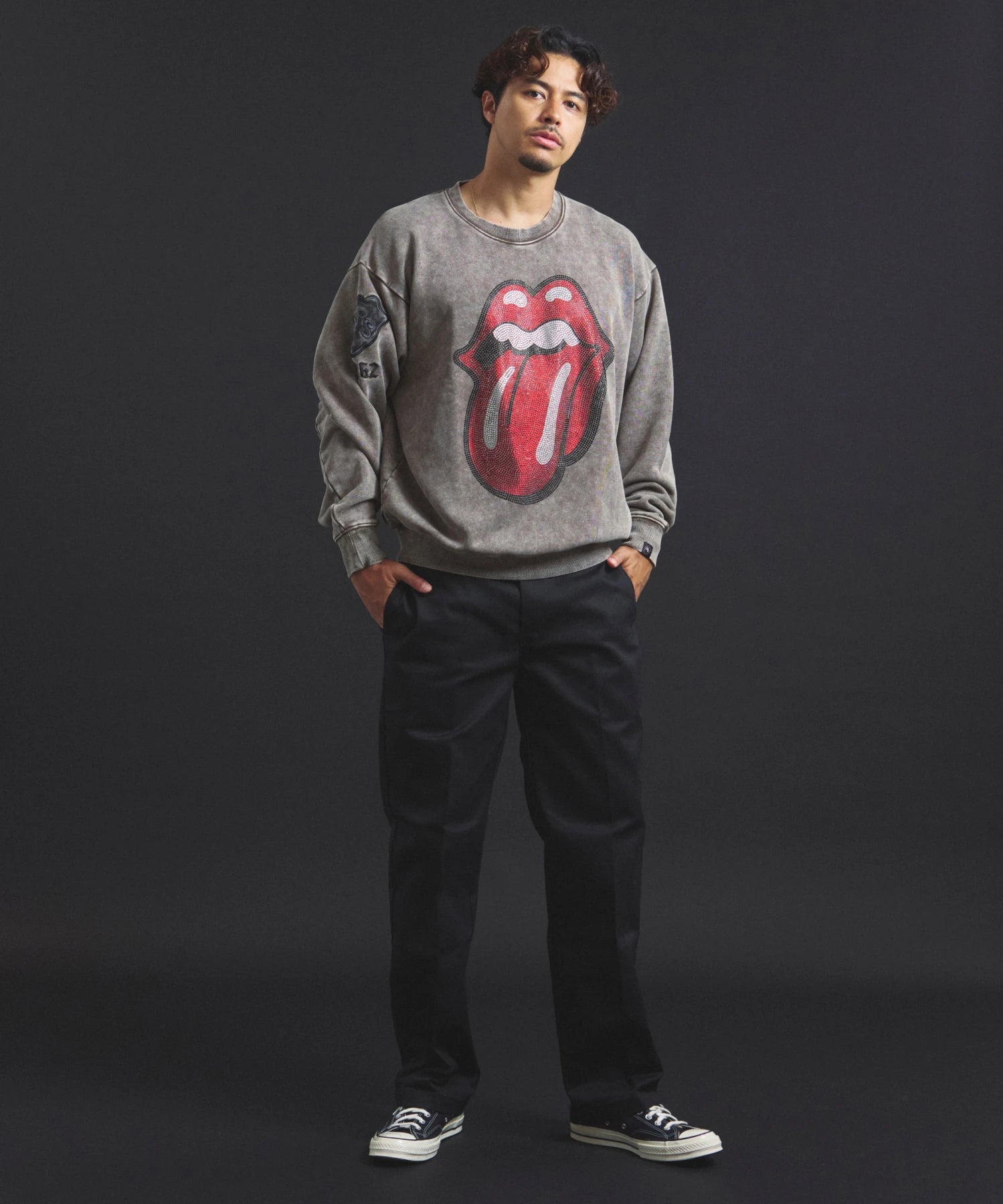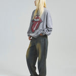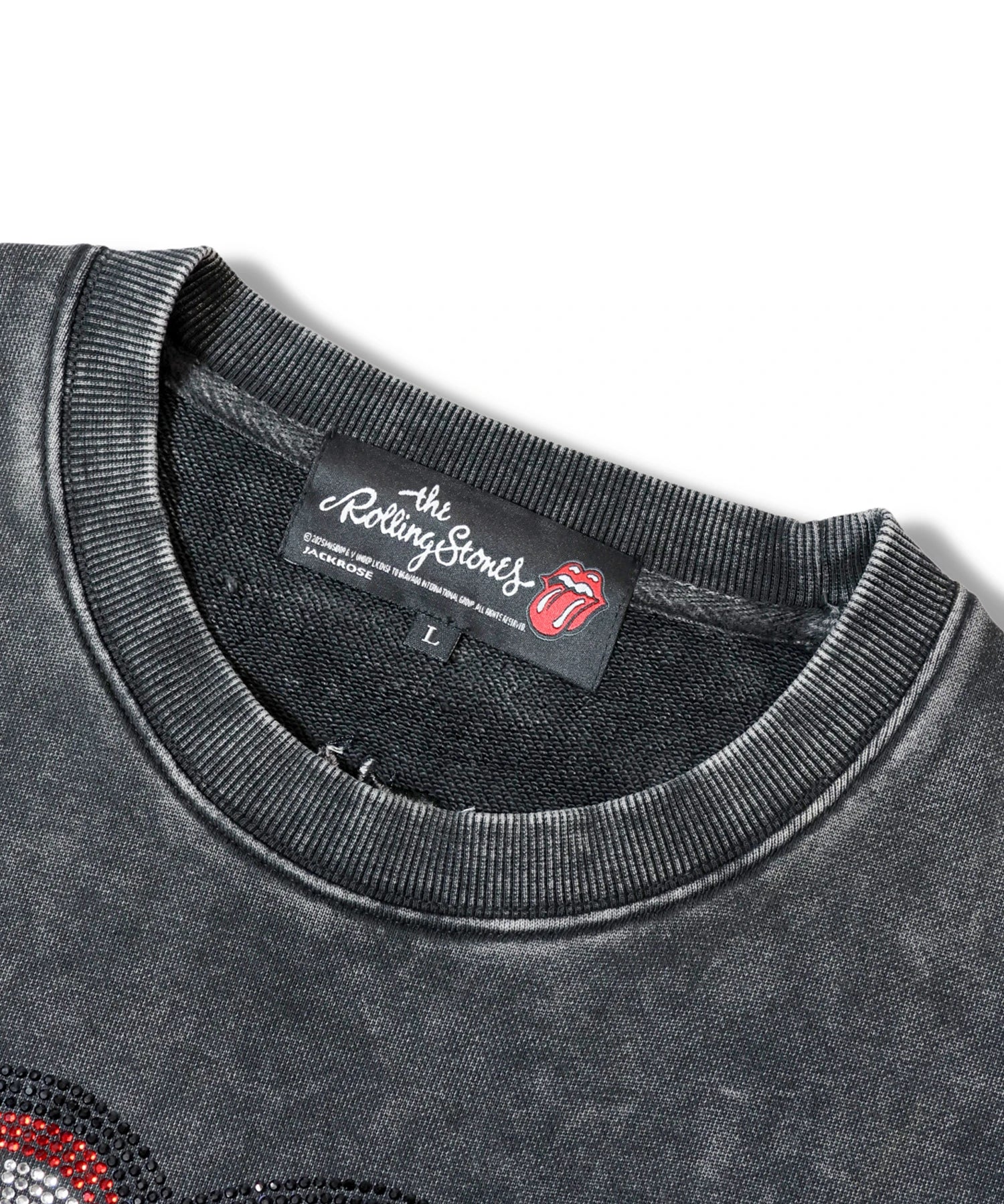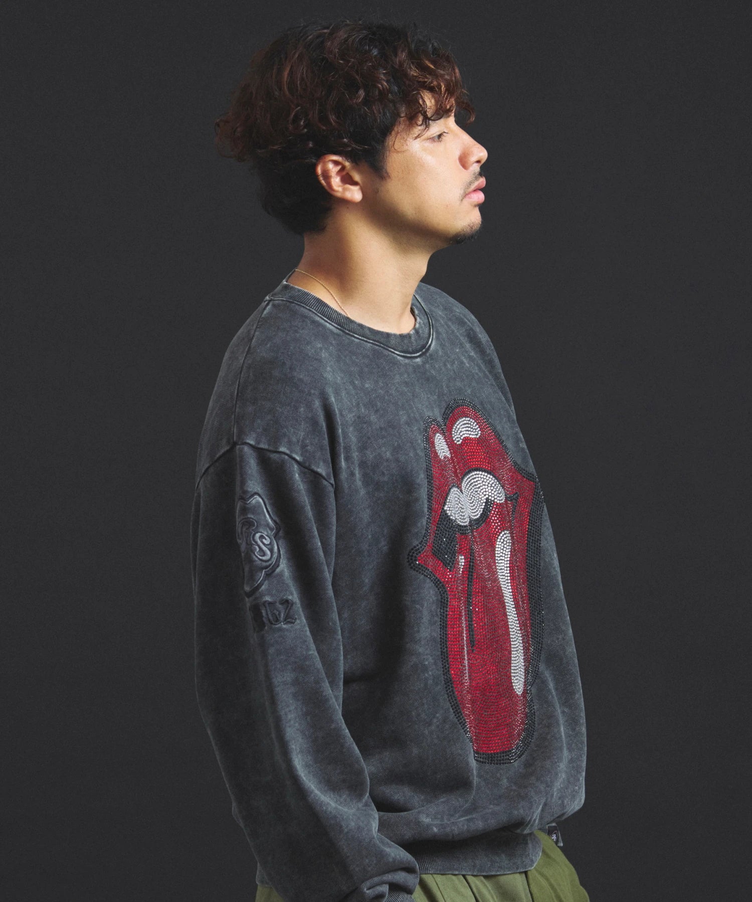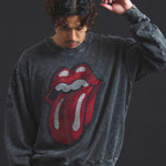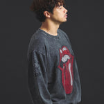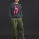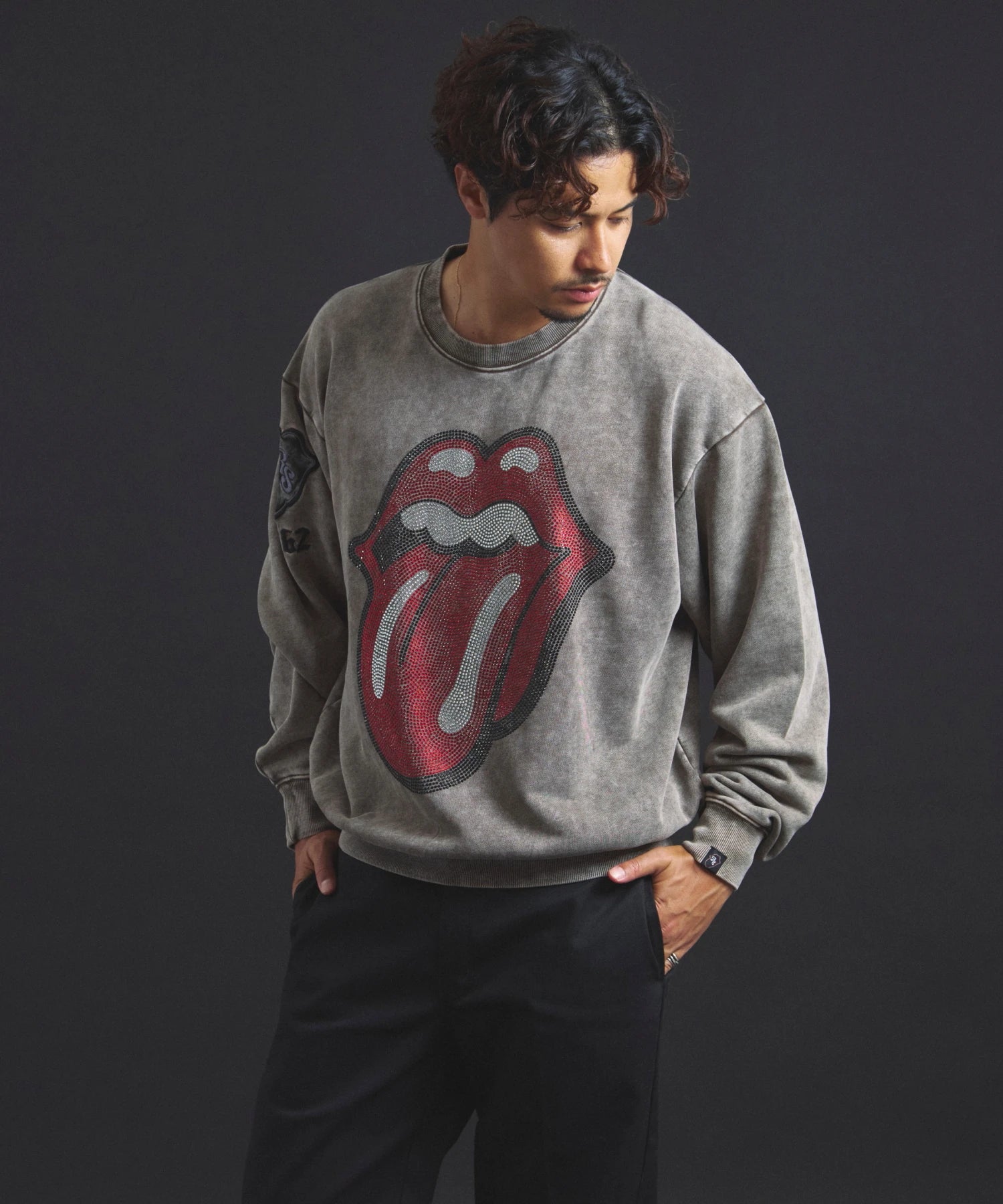 バンドの象徴である「Lips & Tongue(リップス&タン)」ロゴをきらめくラインストーンで大胆にあしらい、ヴィンテージ感のあるウォッシュ加工で長年愛用したような風合いを表現。