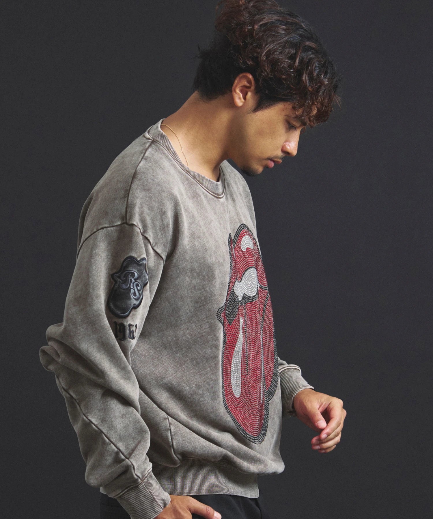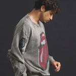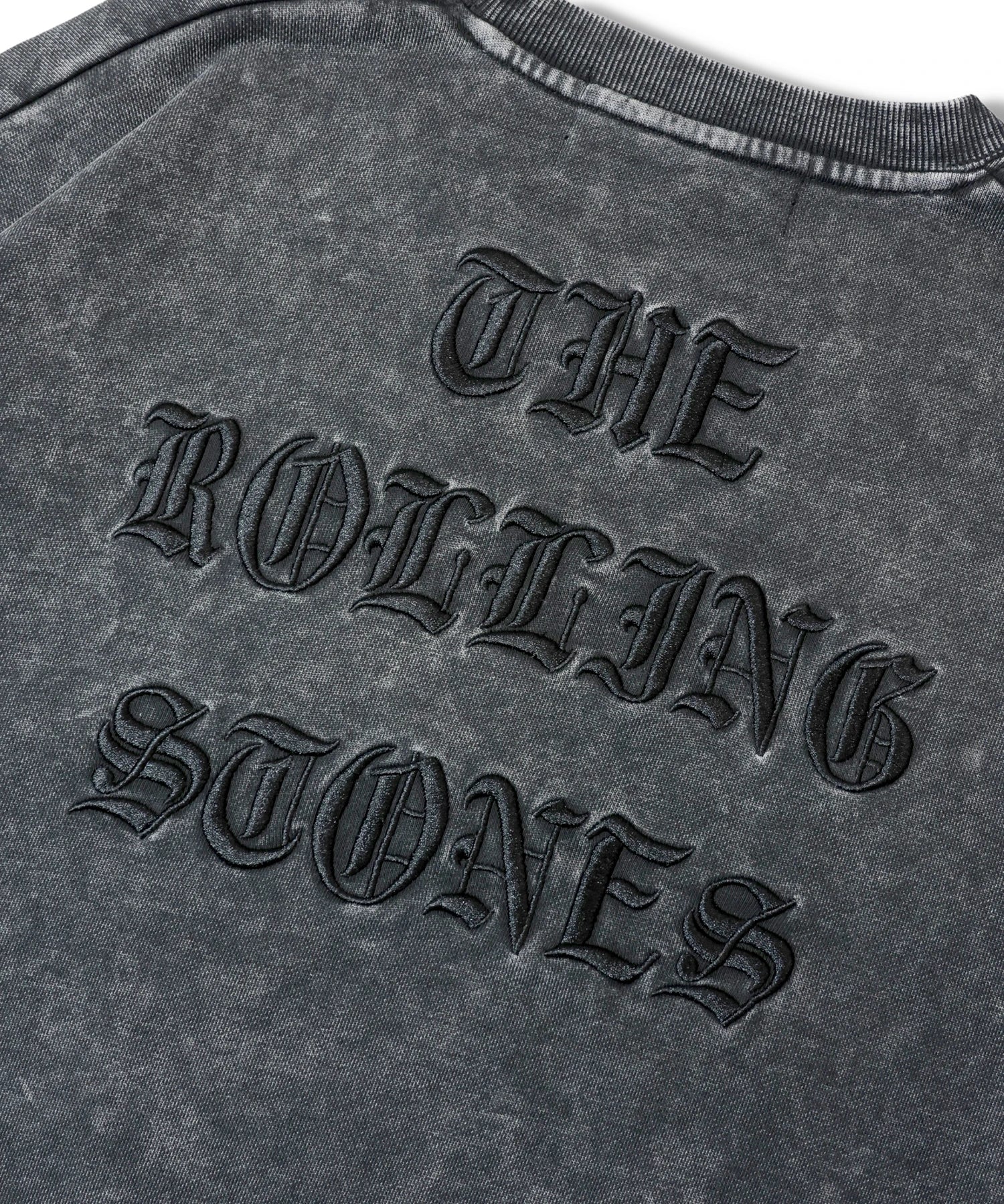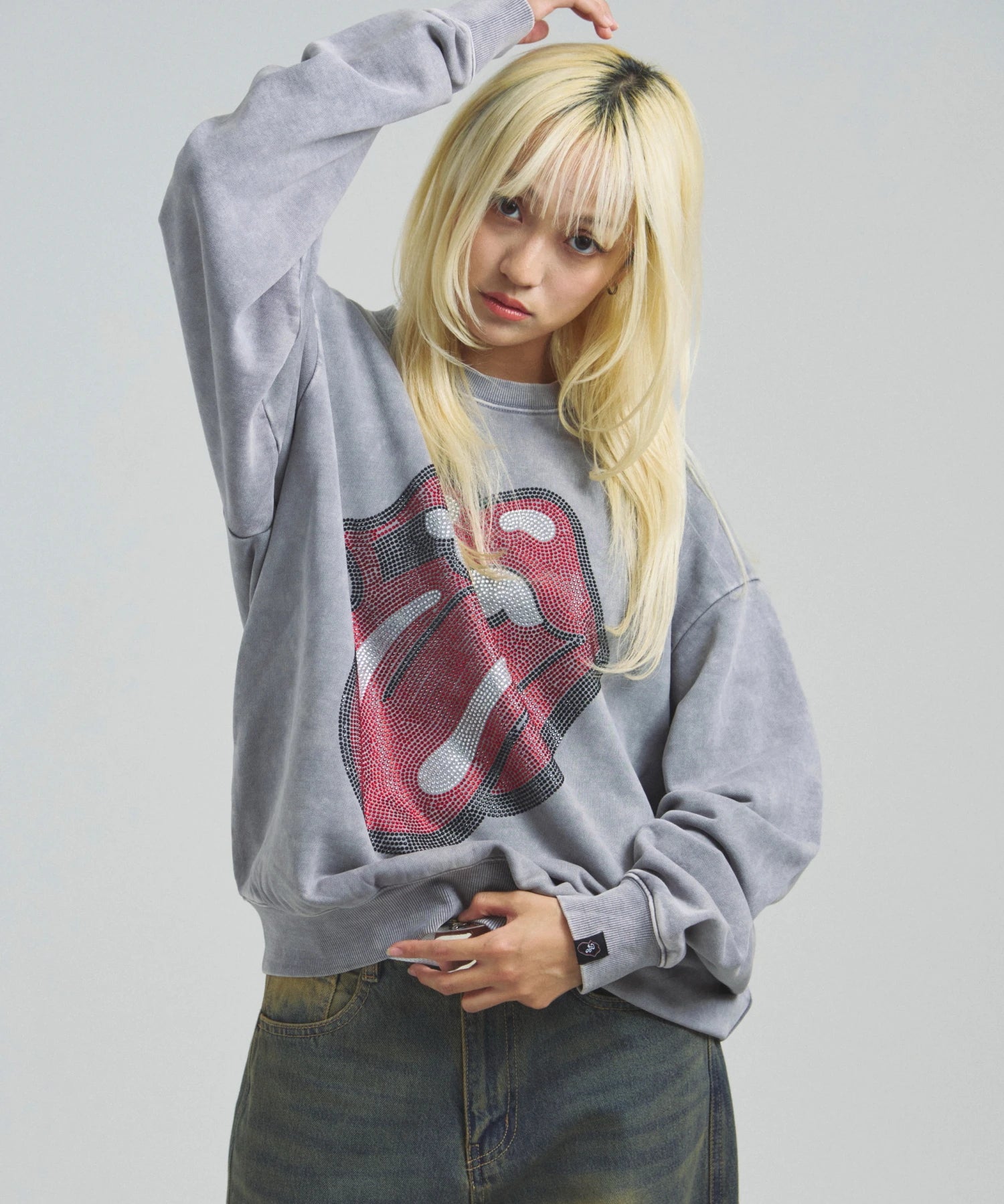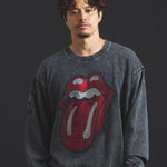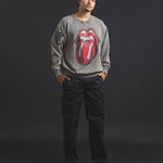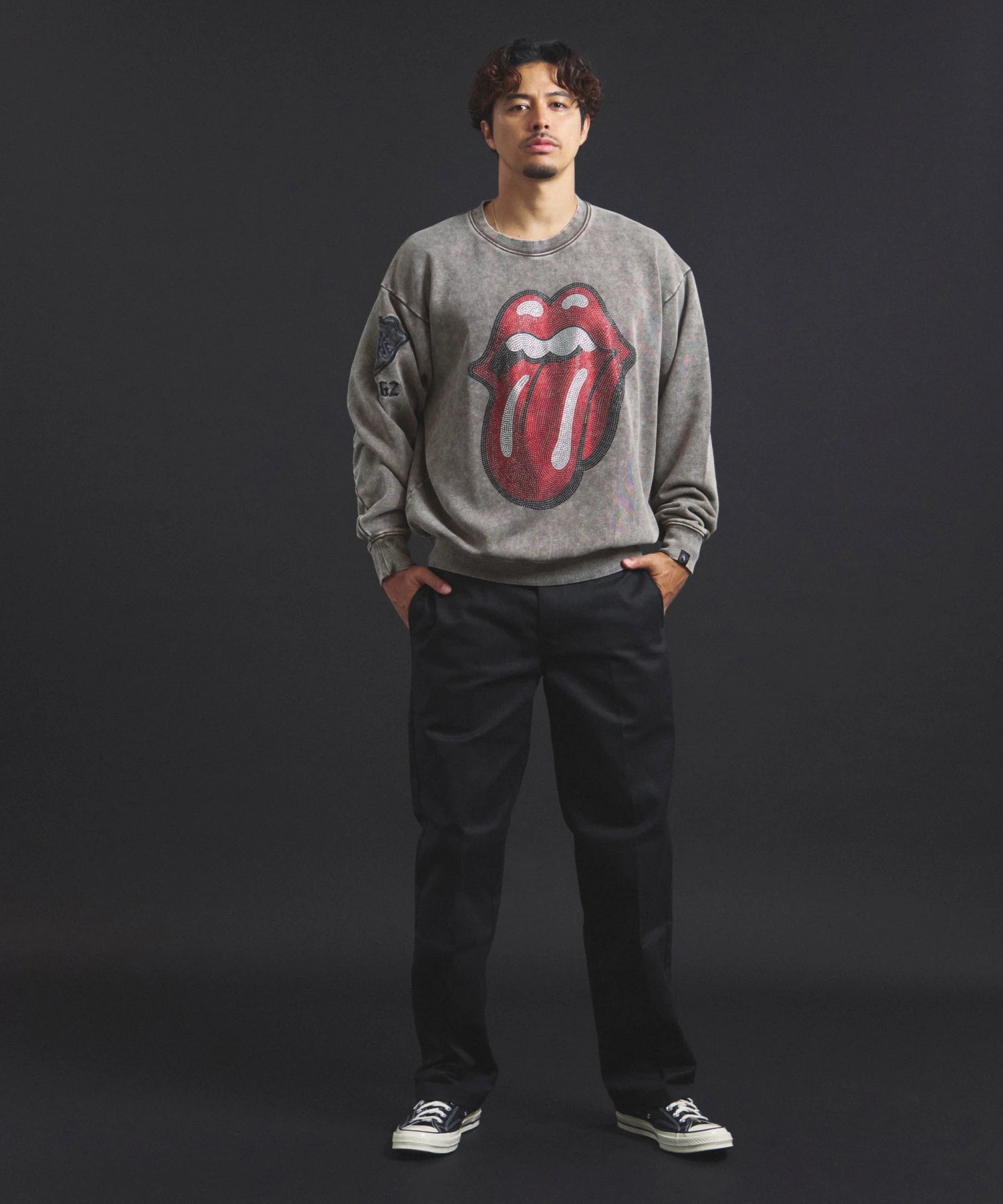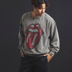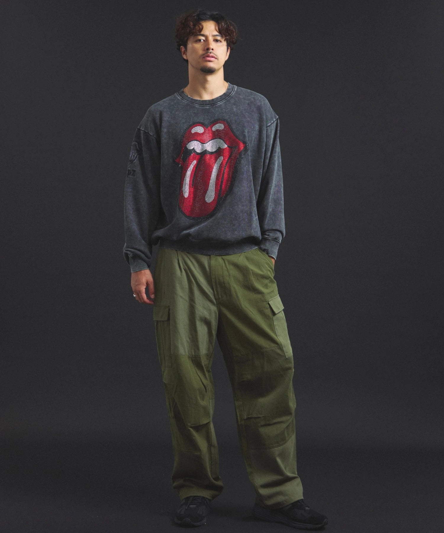 バンドの象徴である「Lips & Tongue(リップス&タン)」ロゴをきらめくラインストーンで大胆にあしらい、ヴィンテージ感のあるウォッシュ加工で長年愛用したような風合いを表現。