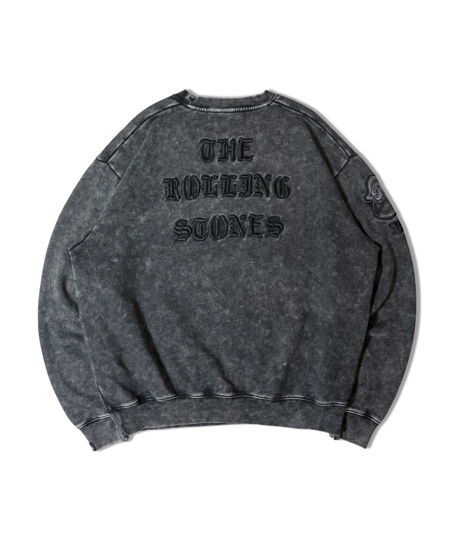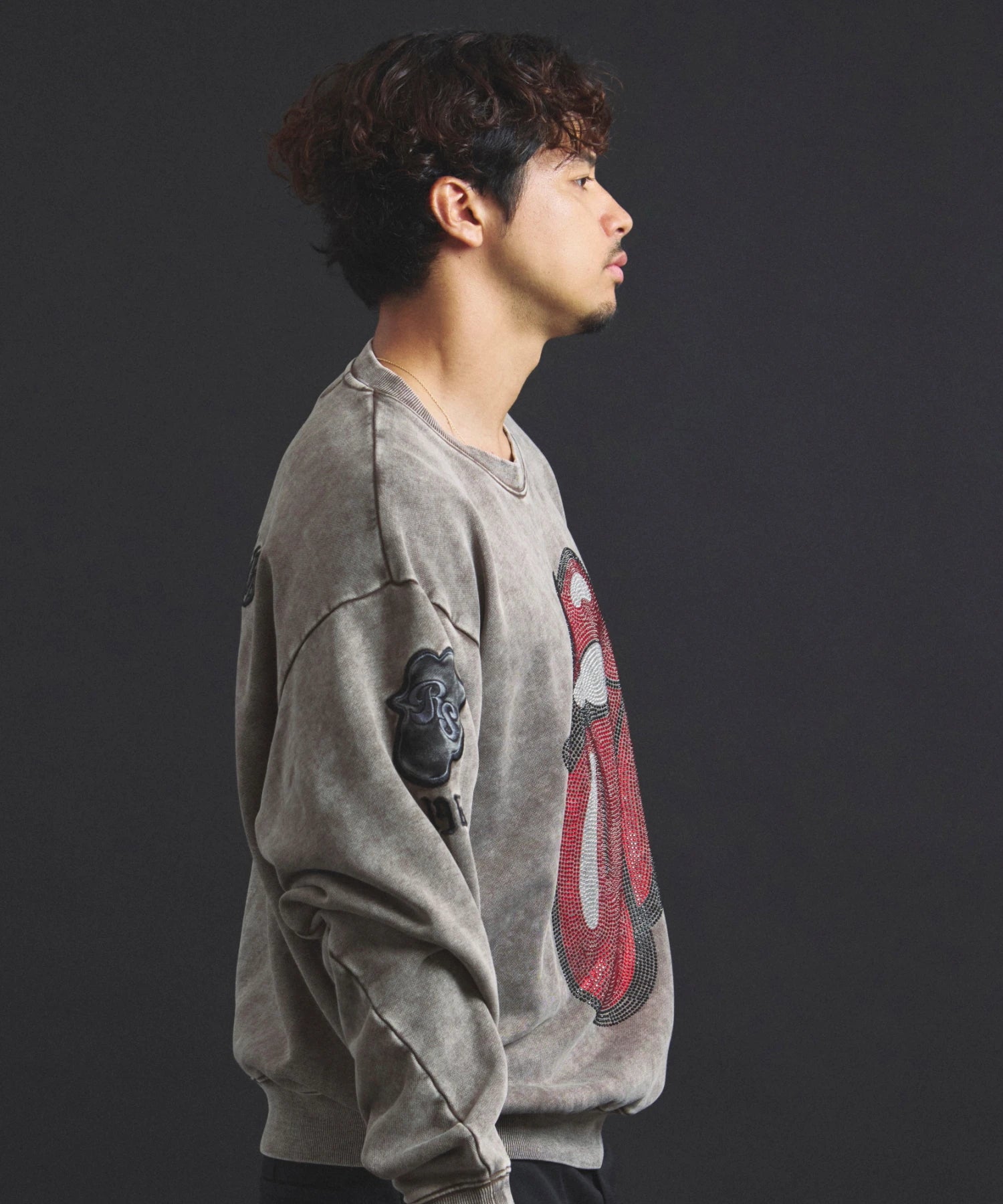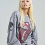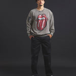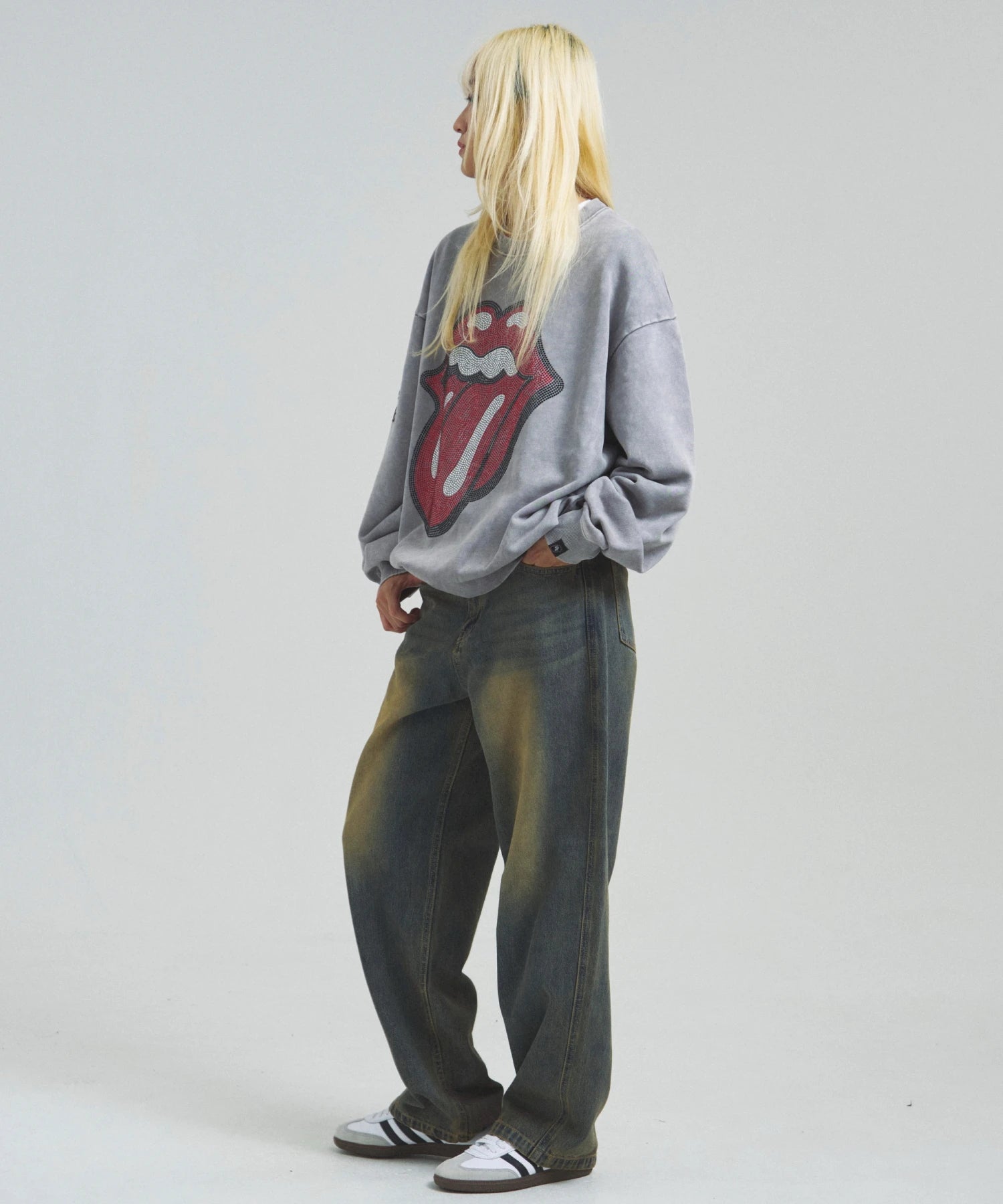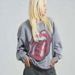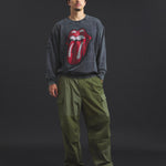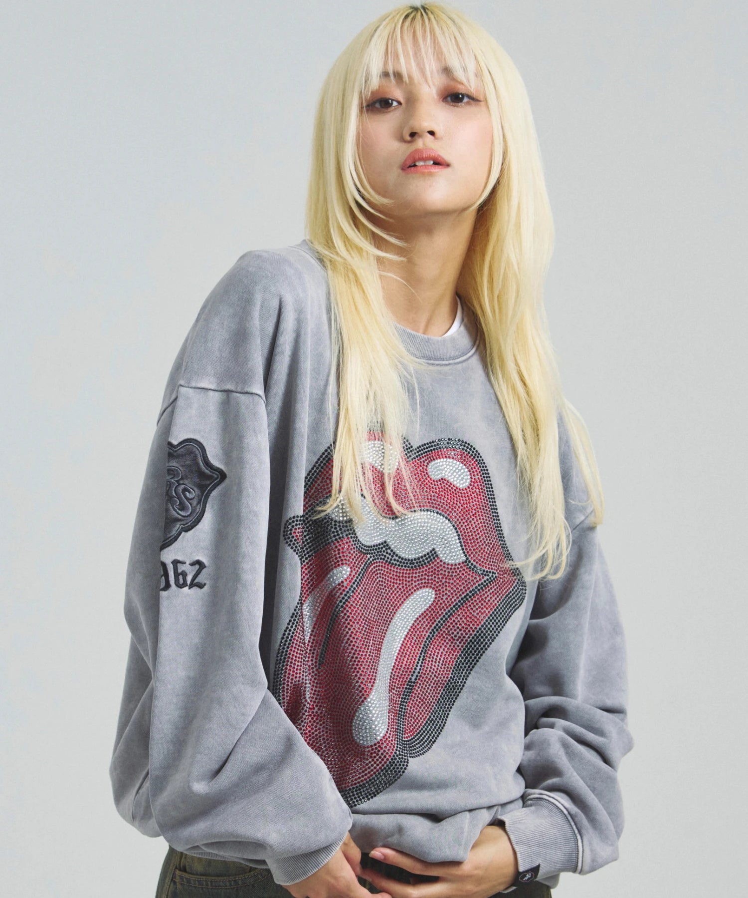 バンドの象徴である「Lips & Tongue(リップス&タン)」ロゴをきらめくラインストーンで大胆にあしらい、ヴィンテージ感のあるウォッシュ加工で長年愛用したような風合いを表現。