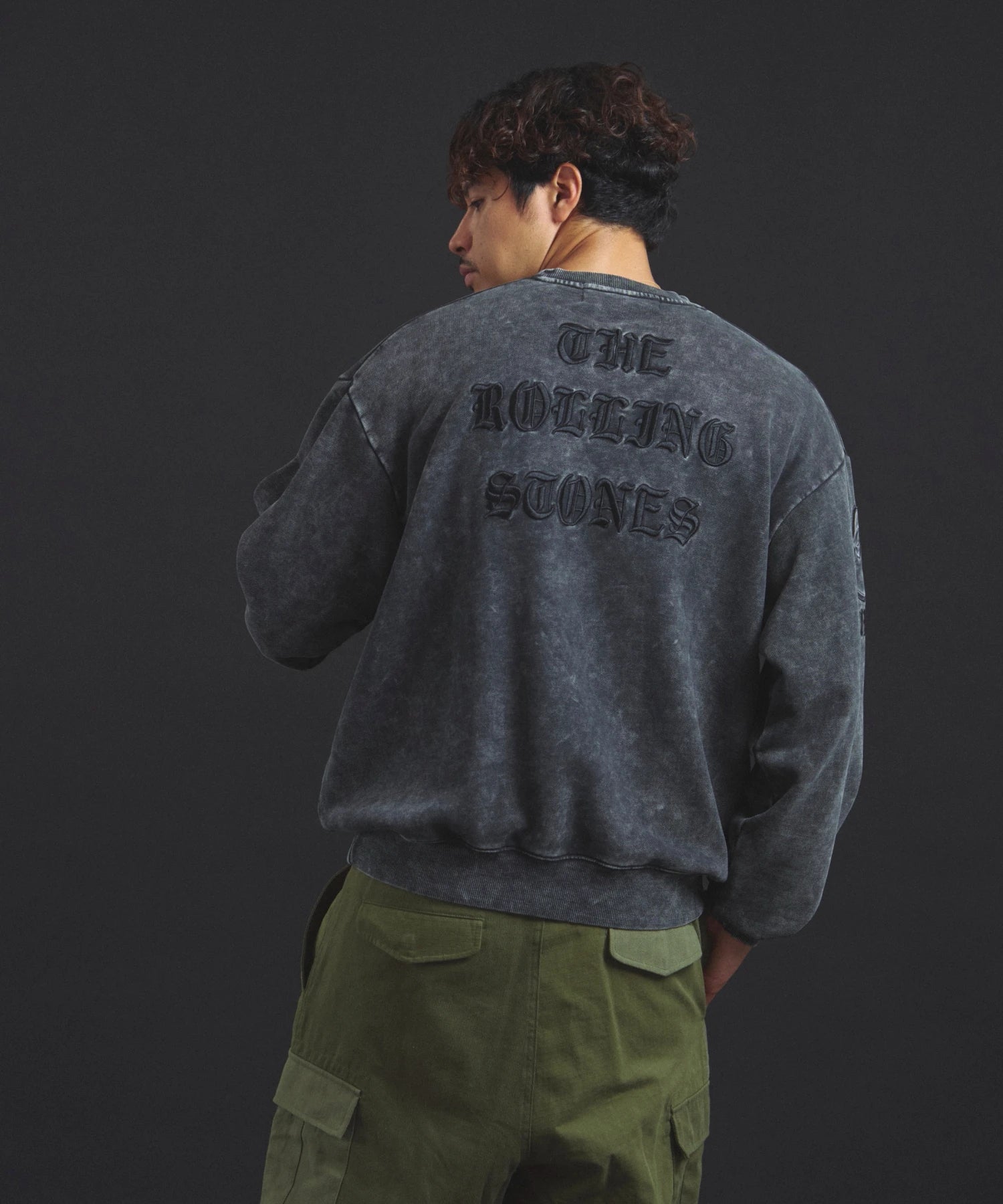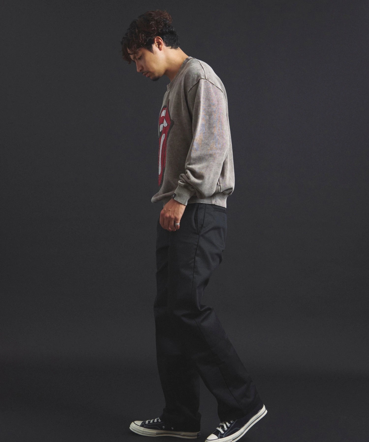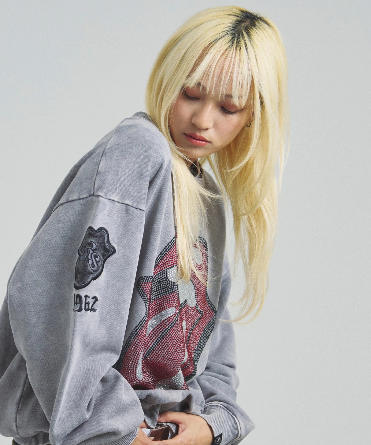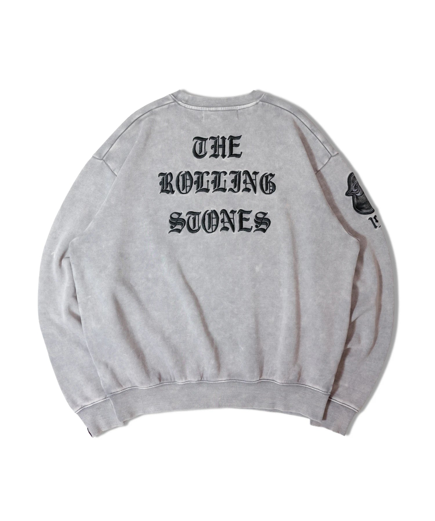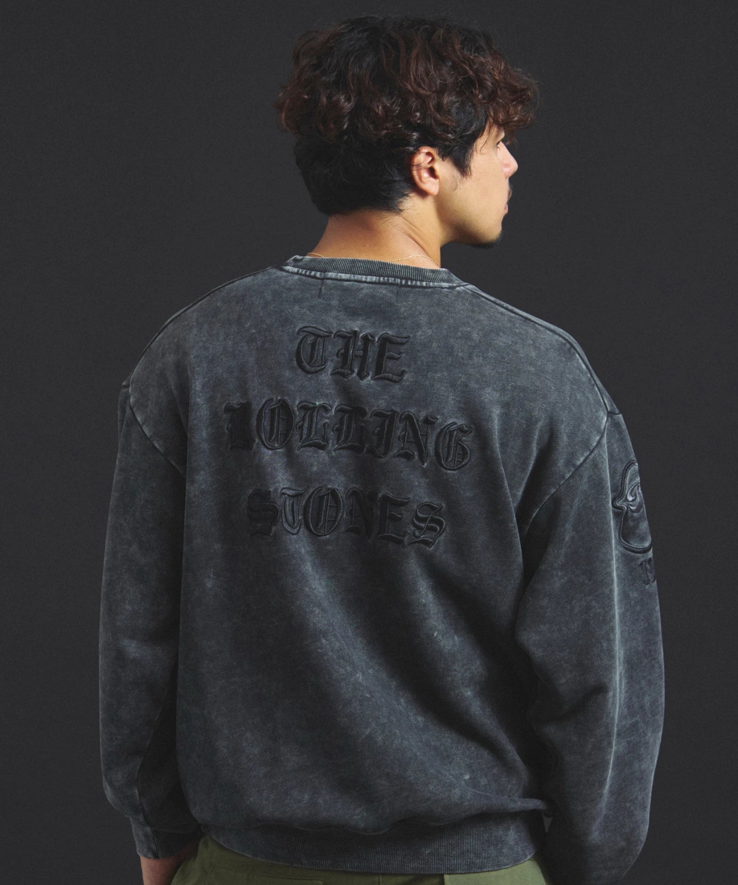 バンドの象徴である「Lips & Tongue(リップス&タン)」ロゴをきらめくラインストーンで大胆にあしらい、ヴィンテージ感のあるウォッシュ加工で長年愛用したような風合いを表現。