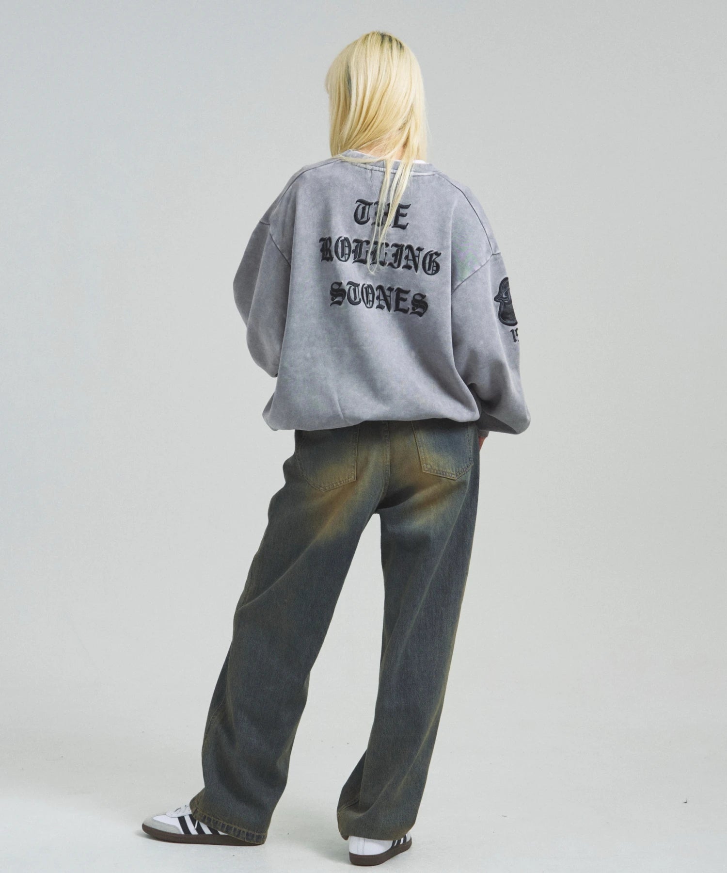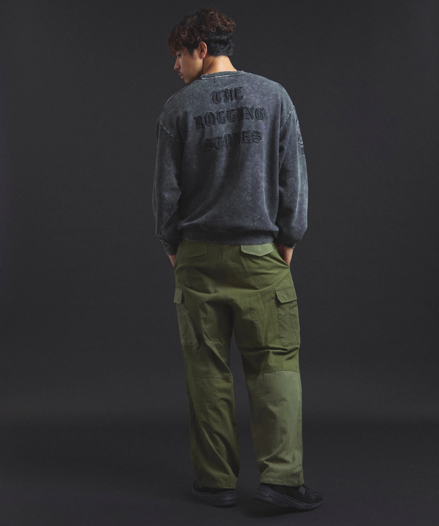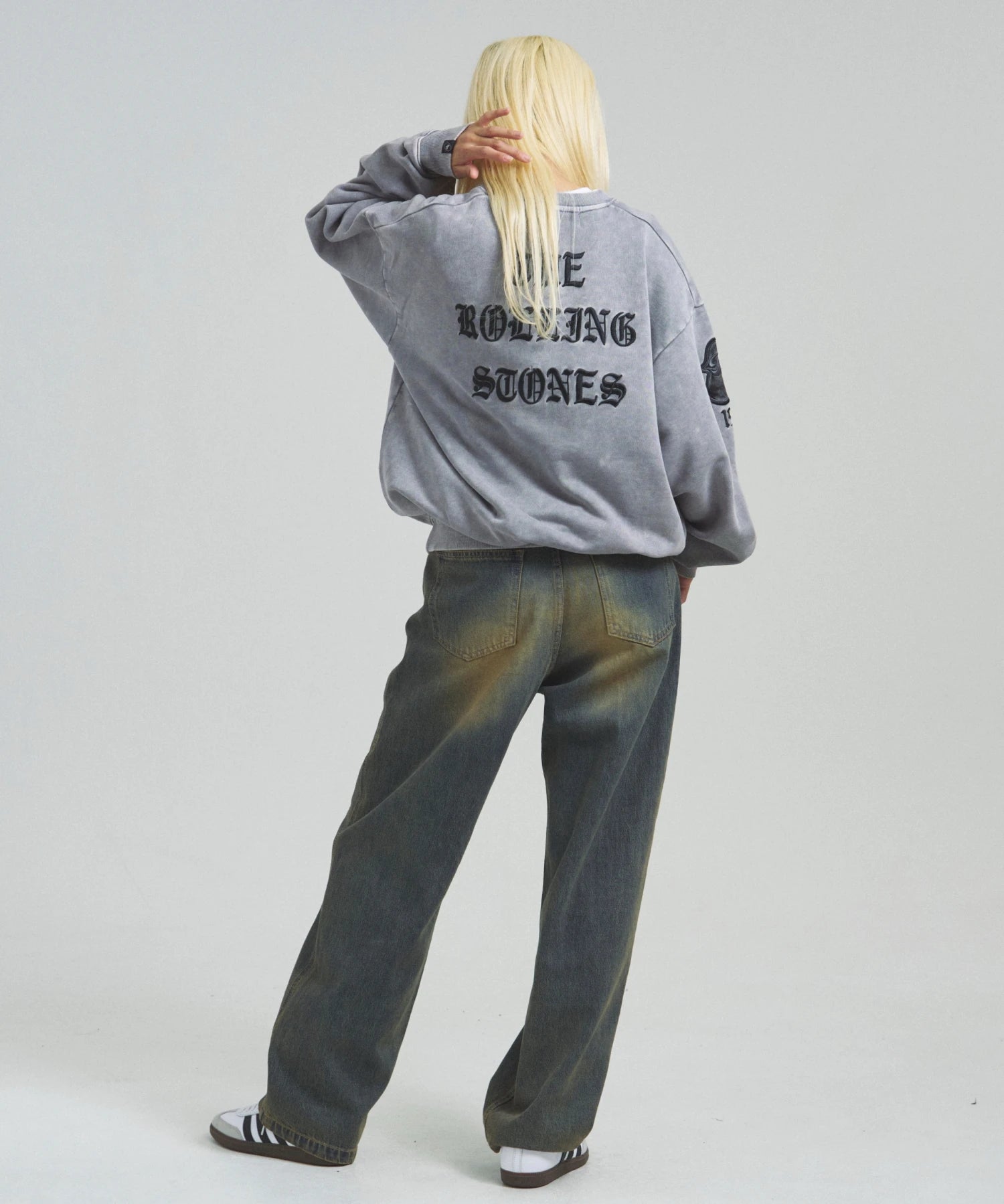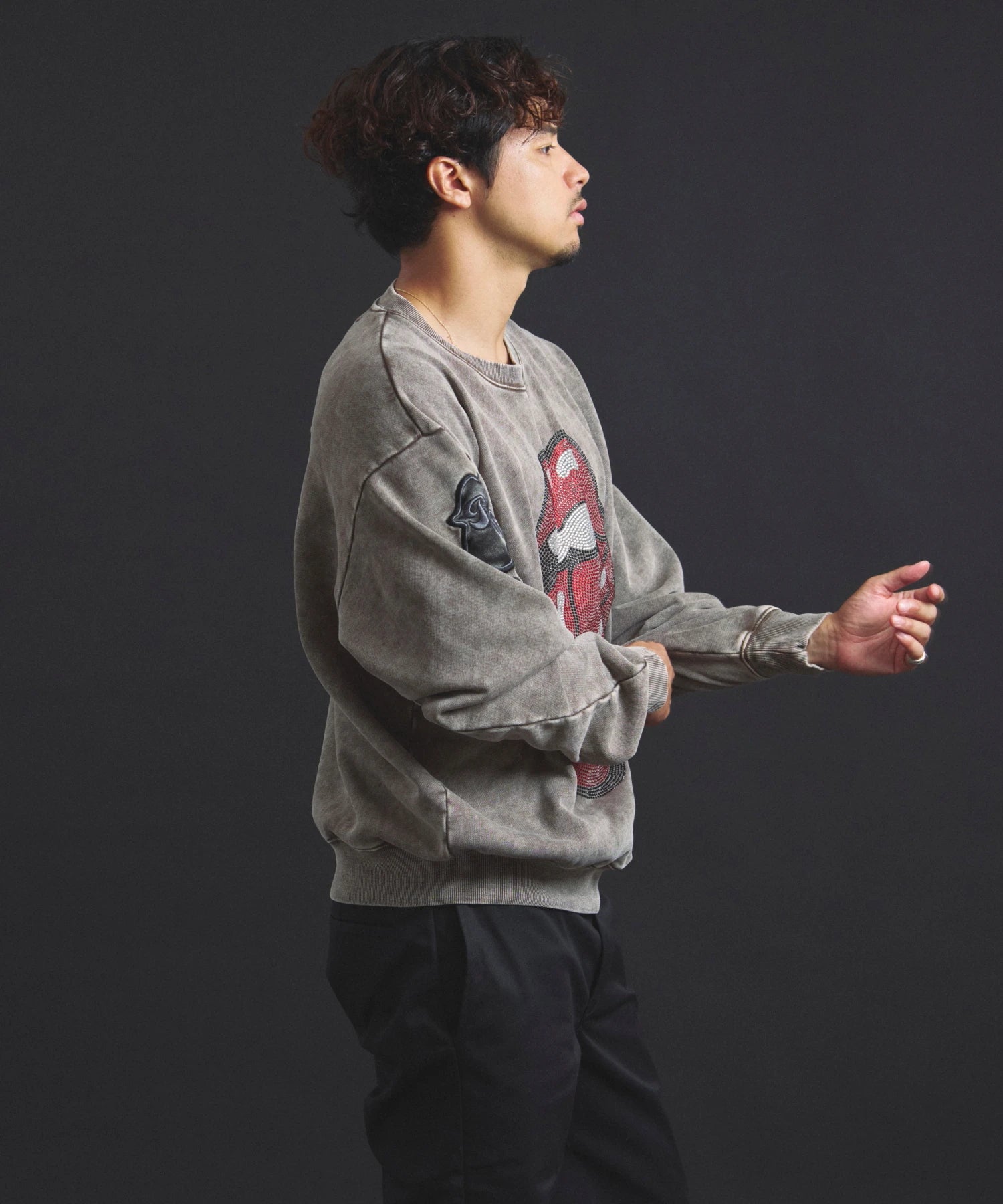 バンドの象徴である「Lips & Tongue(リップス&タン)」ロゴをきらめくラインストーンで大胆にあしらい、ヴィンテージ感のあるウォッシュ加工で長年愛用したような風合いを表現。