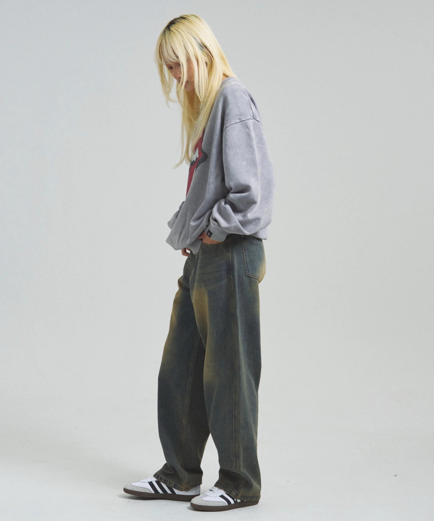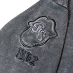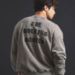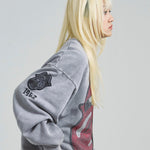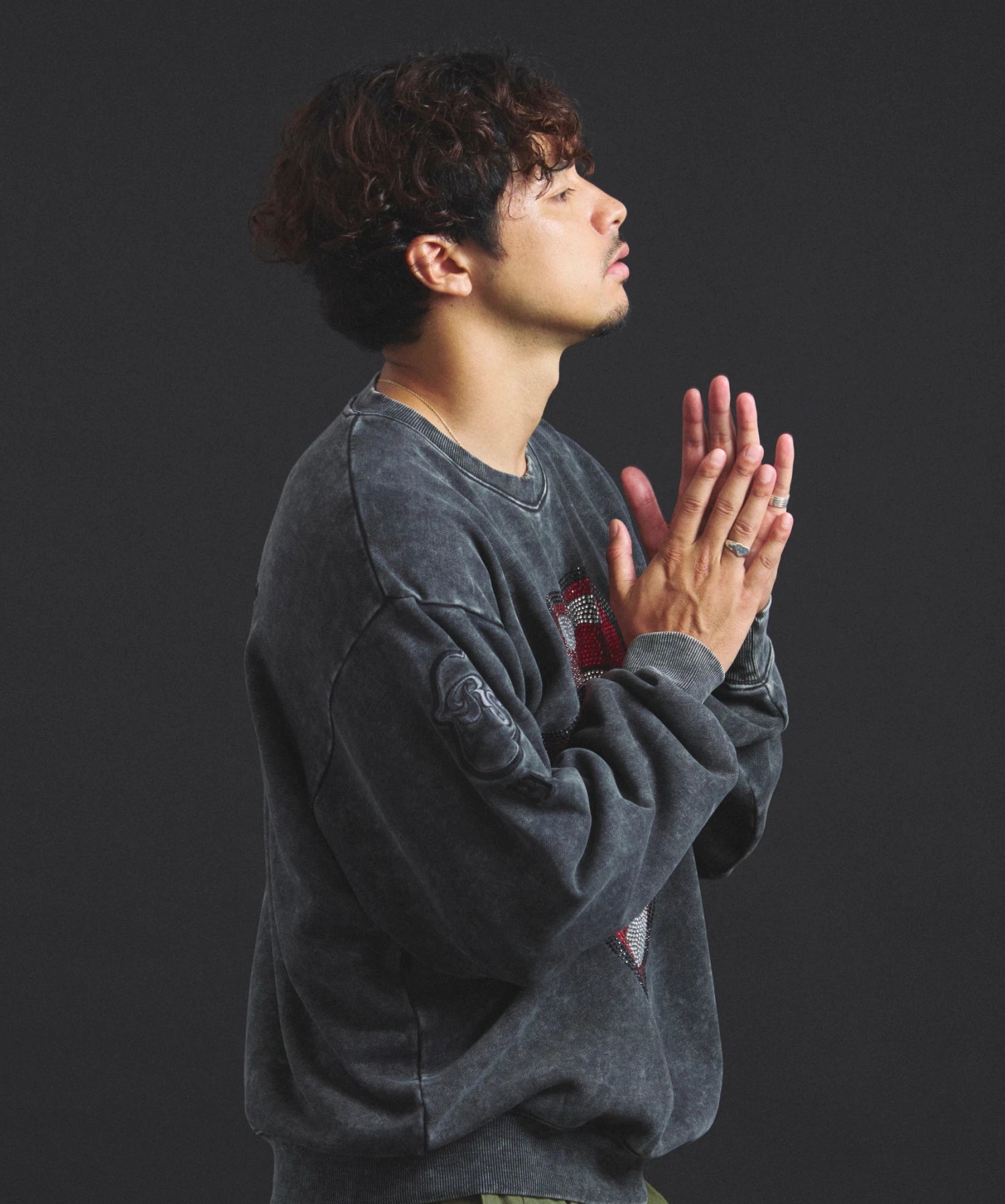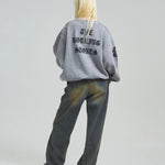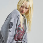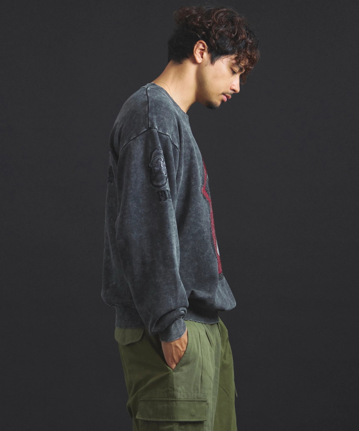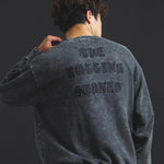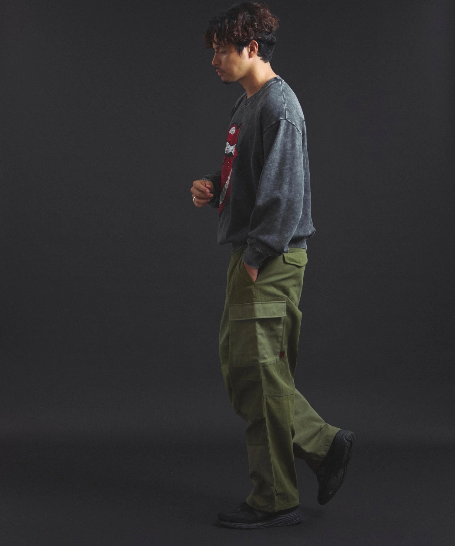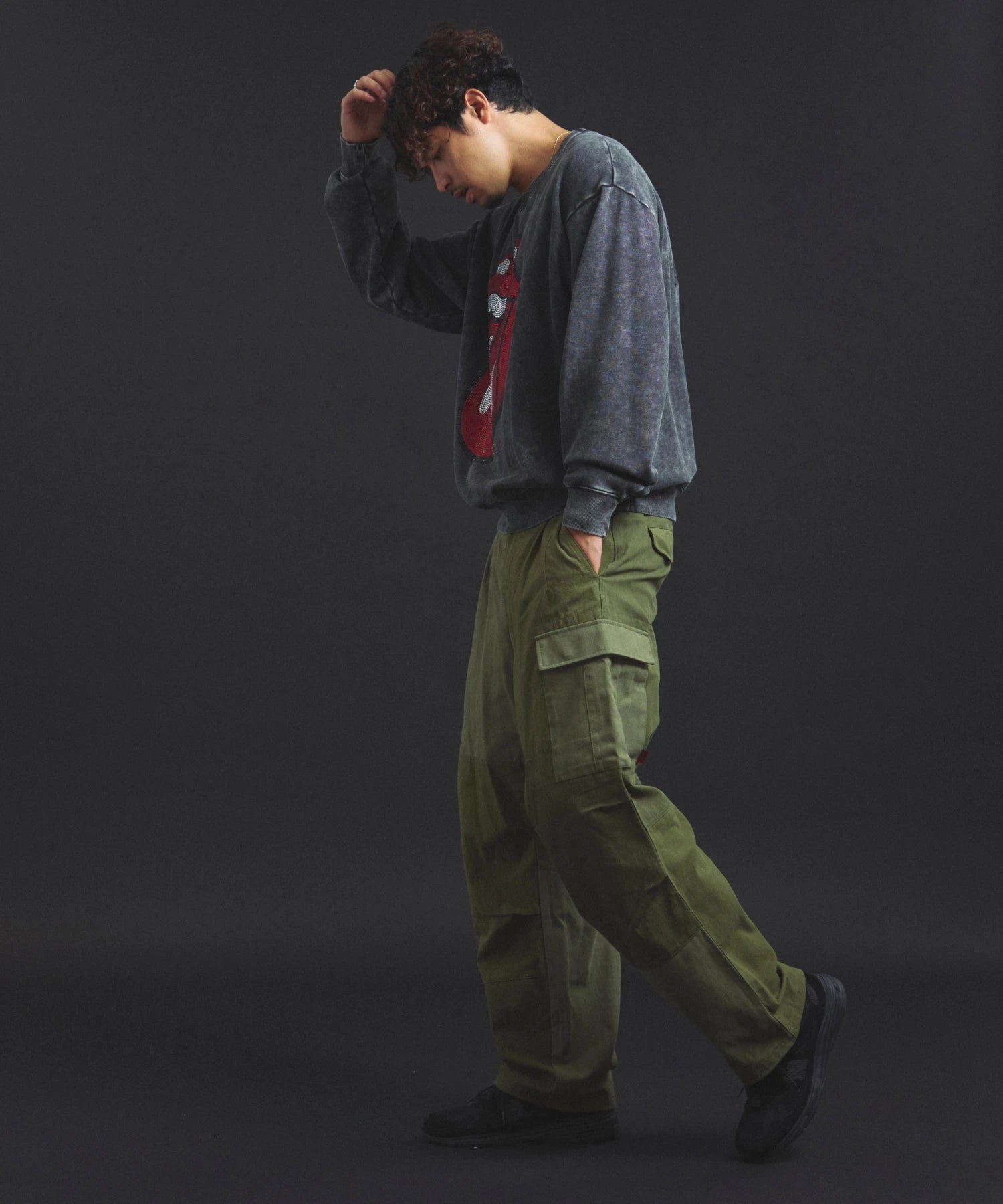 バンドの象徴である「Lips & Tongue(リップス&タン)」ロゴをきらめくラインストーンで大胆にあしらい、ヴィンテージ感のあるウォッシュ加工で長年愛用したような風合いを表現。