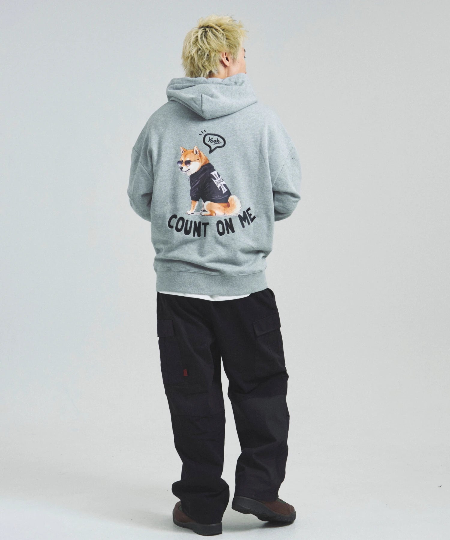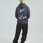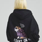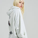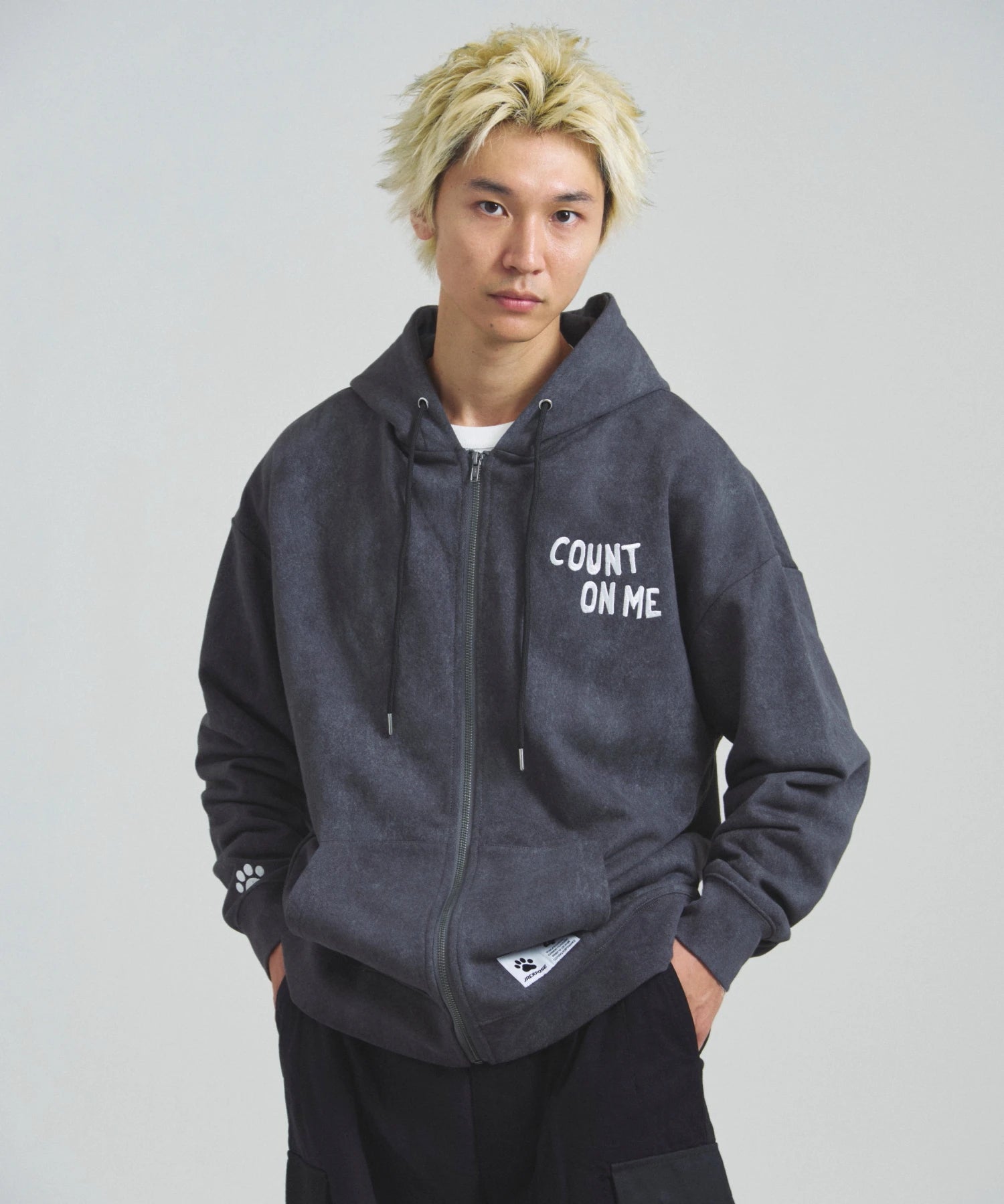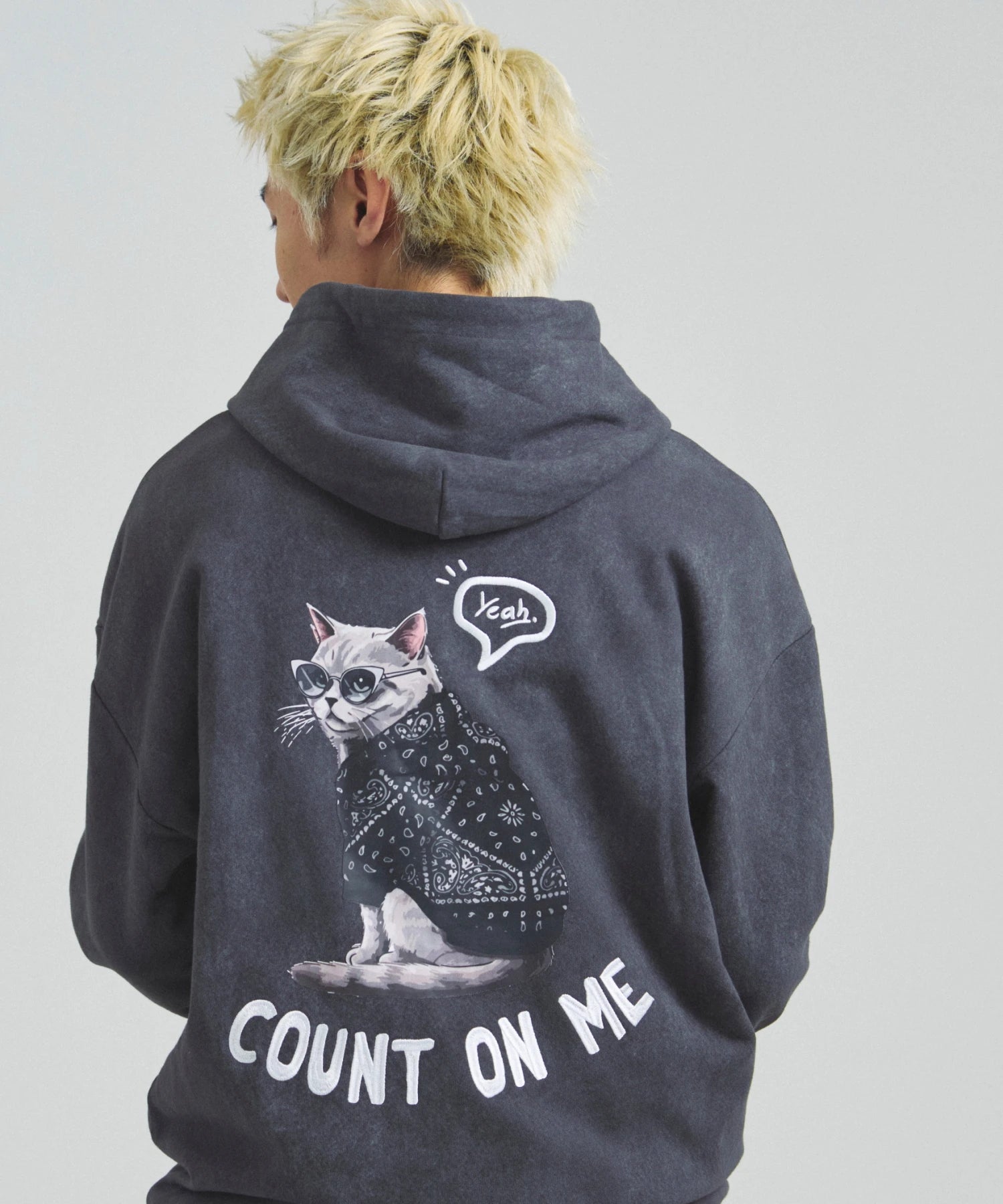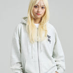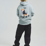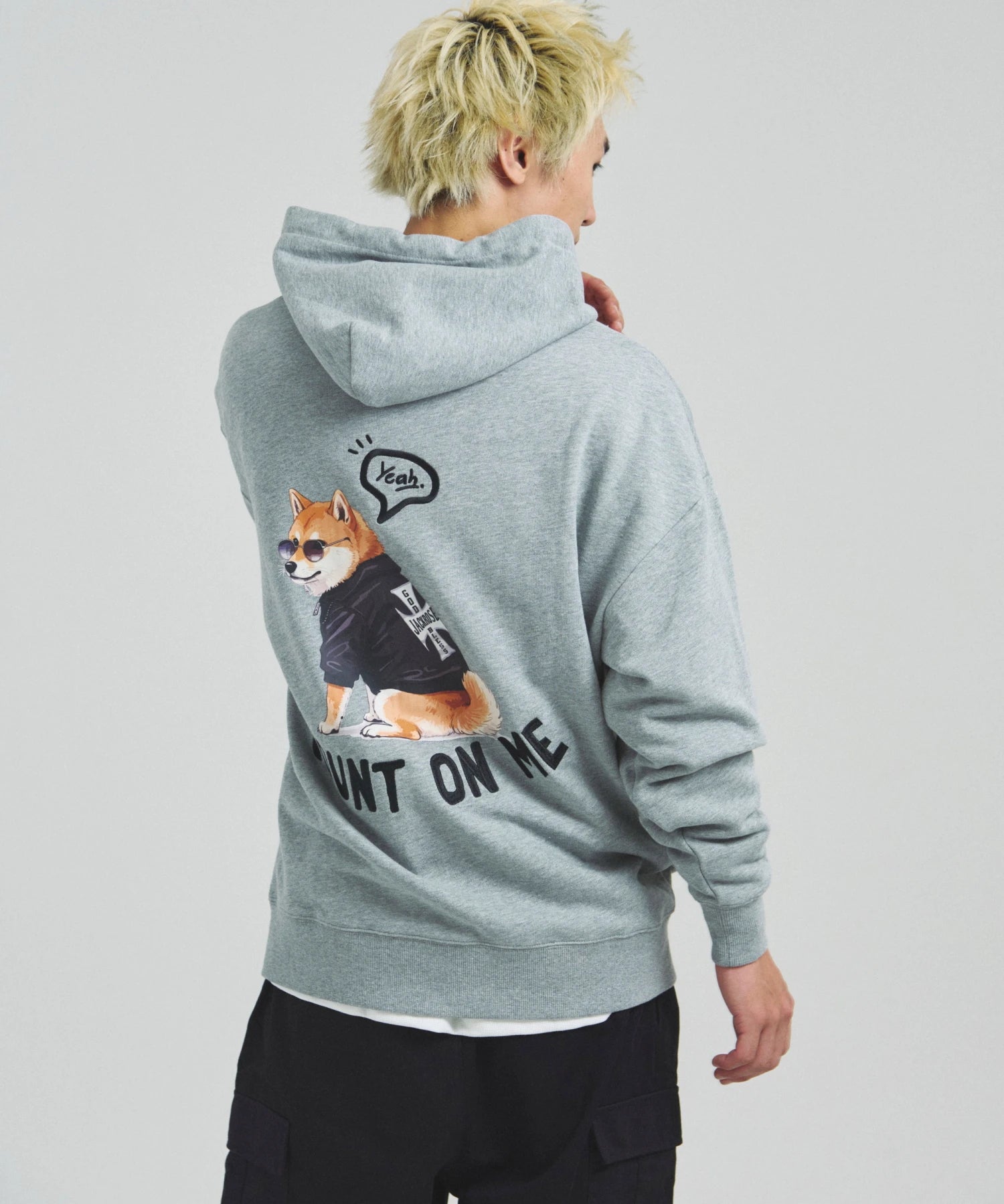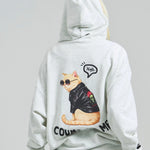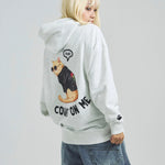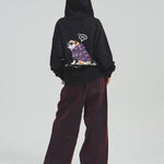 愛らしい犬と猫のグラフィックをあしらったジップパーカー。胸にはシンプルなロゴ刺繍を、背面にはユーモアのある大判グラフィックを施し、存在感抜群の仕上がりになっています。