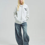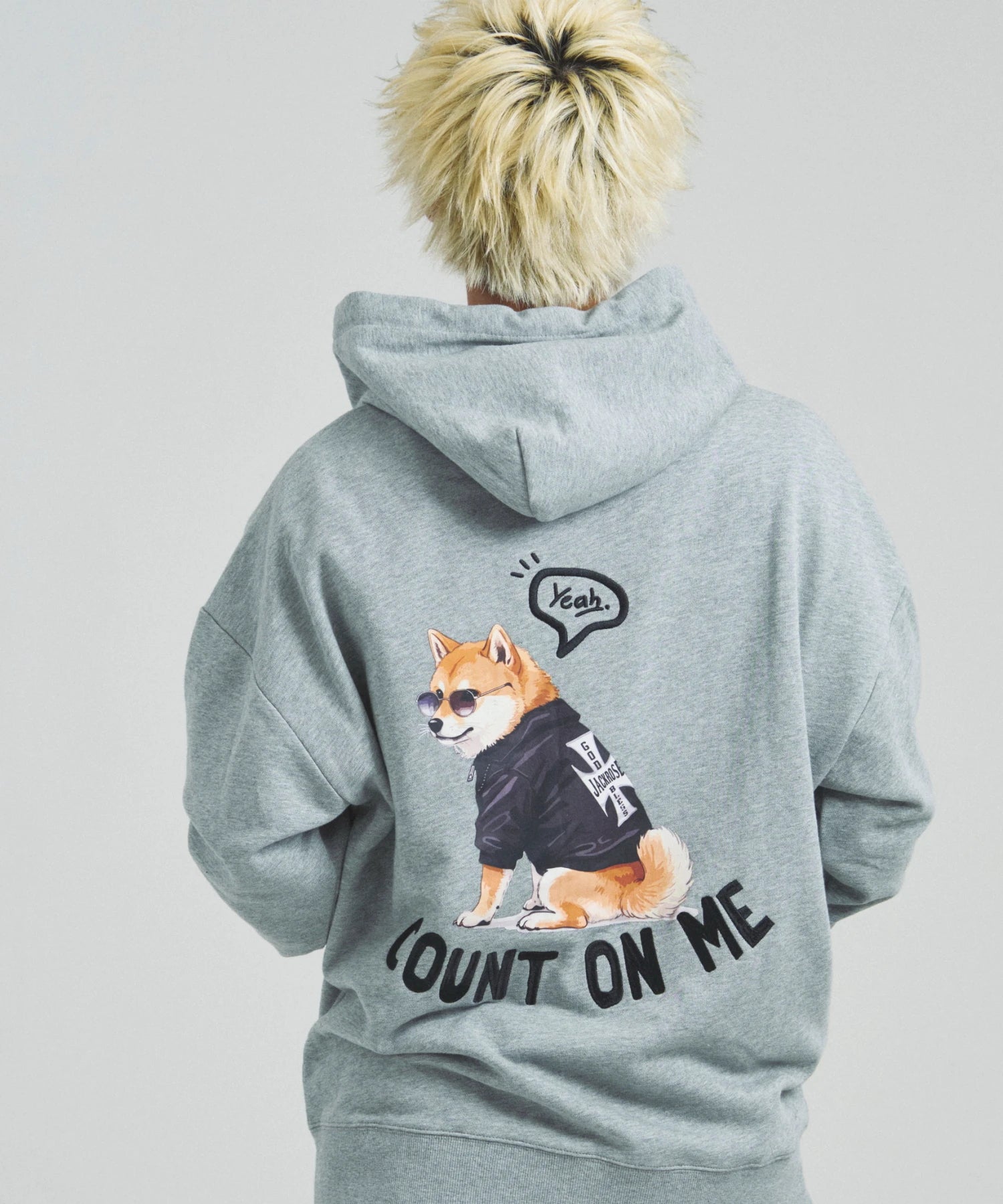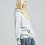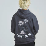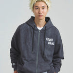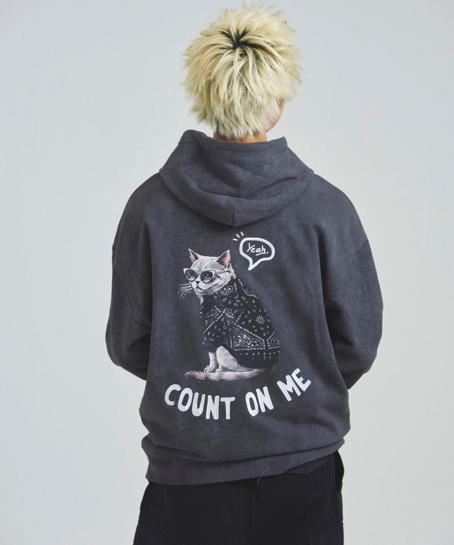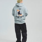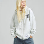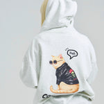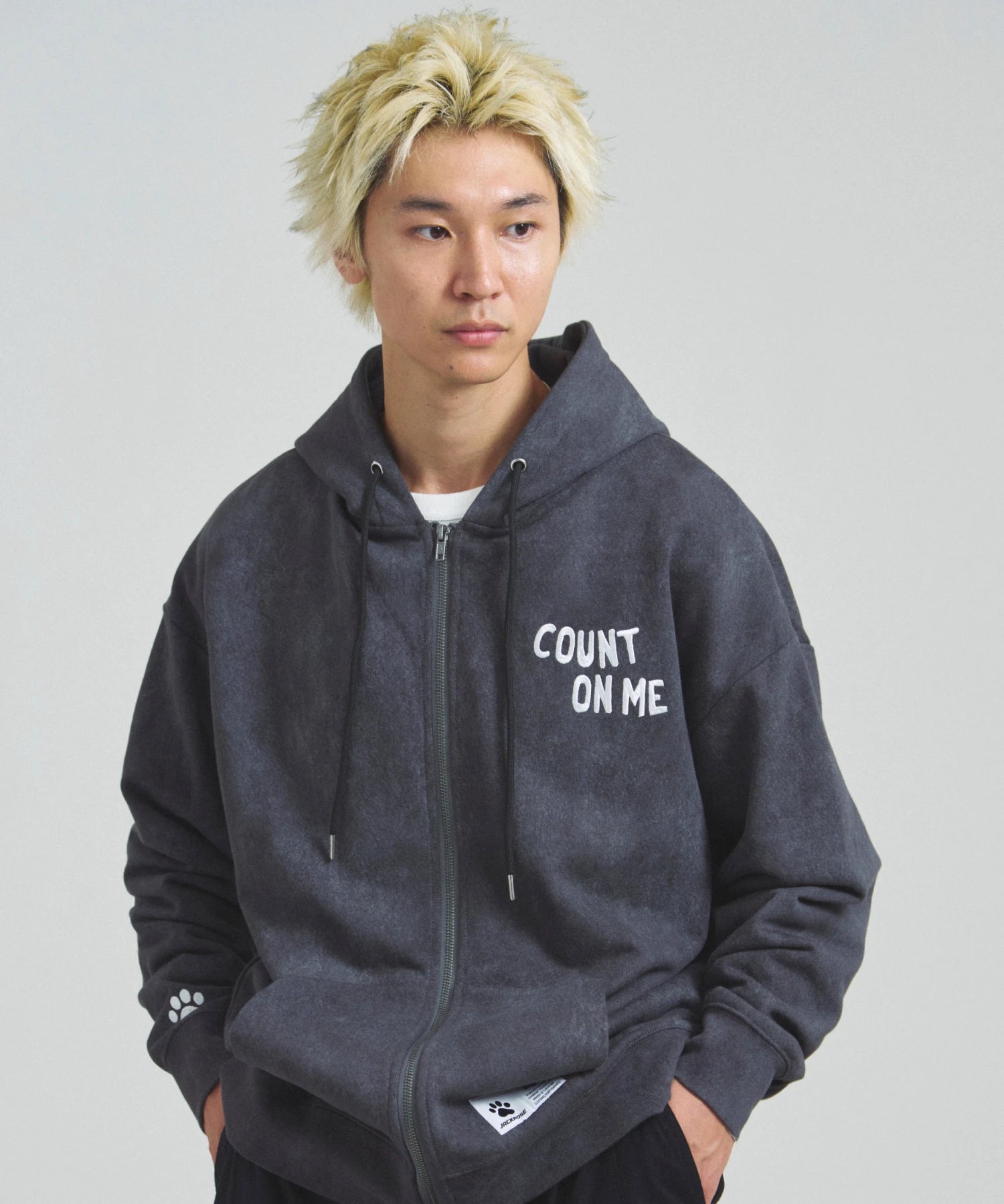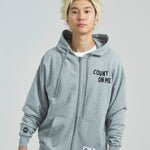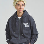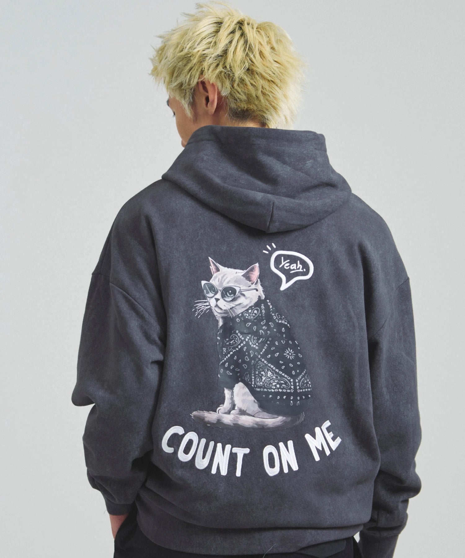 愛らしい犬と猫のグラフィックをあしらったジップパーカー。胸にはシンプルなロゴ刺繍を、背面にはユーモアのある大判グラフィックを施し、存在感抜群の仕上がりになっています。