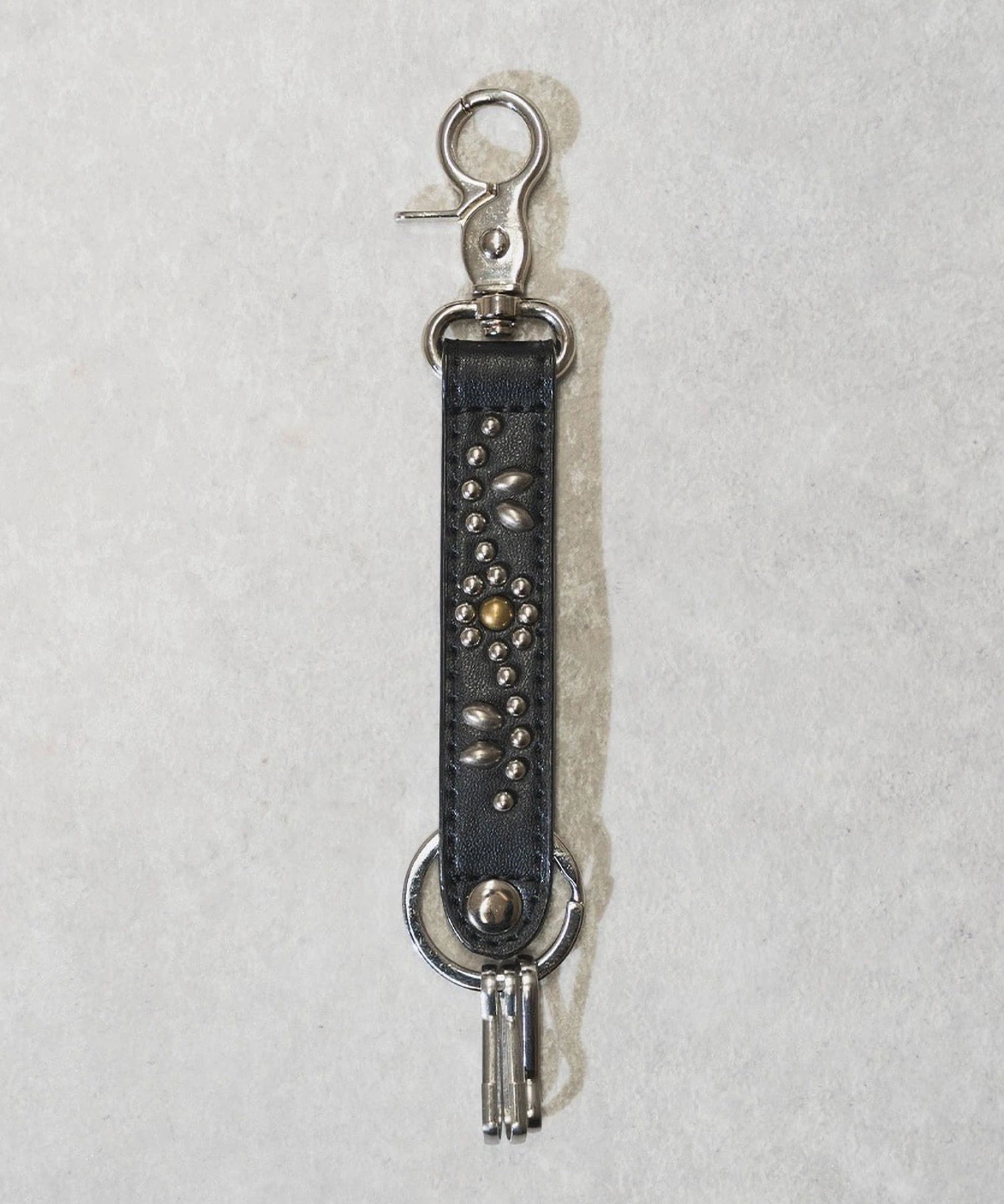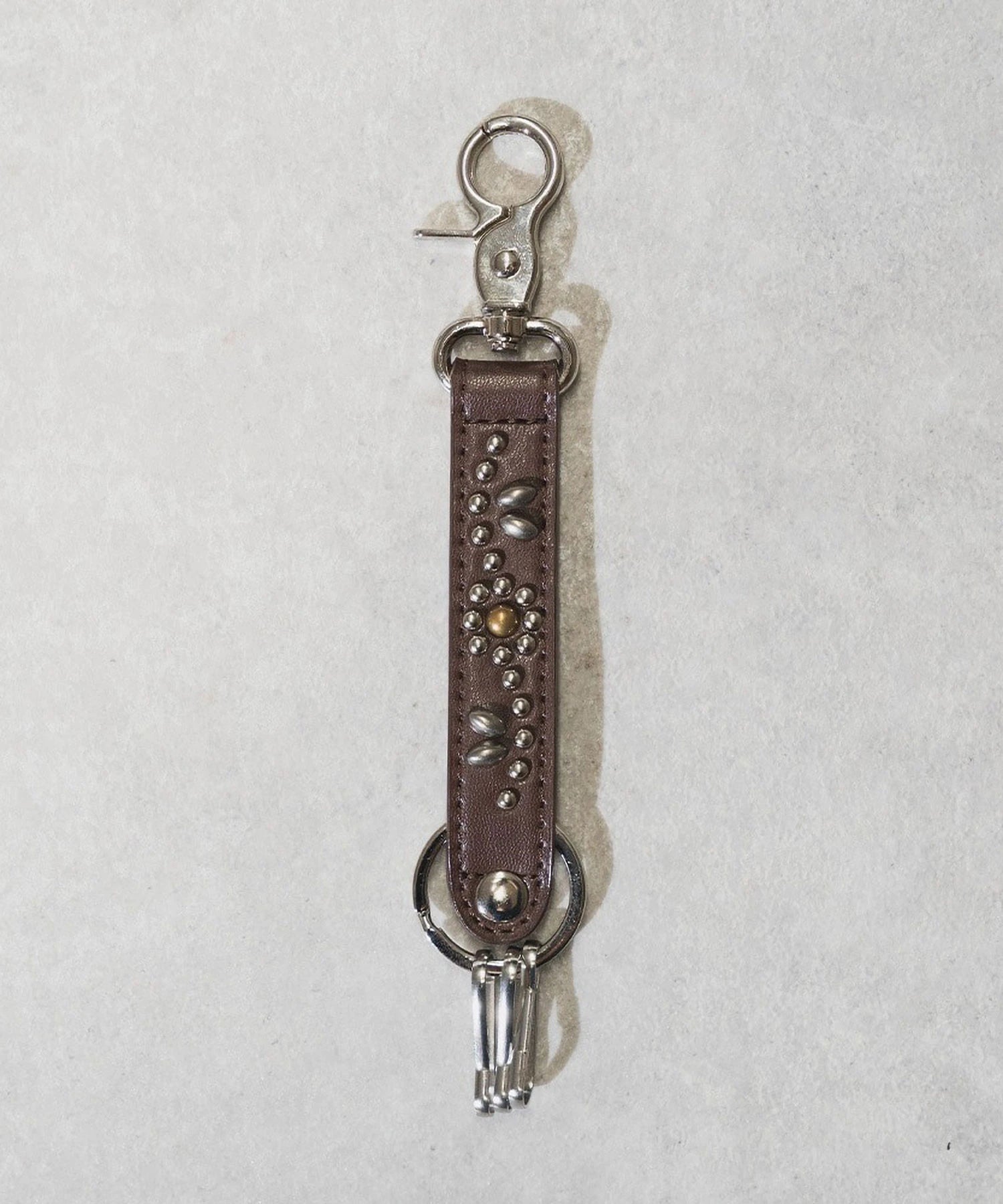 レザー調のPU素材にスタッズを施した存在感のあるデザインが特徴。ナスカンとリング付きで、鍵やバッグ、ベルトループにも簡単に取り付け可能です。