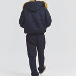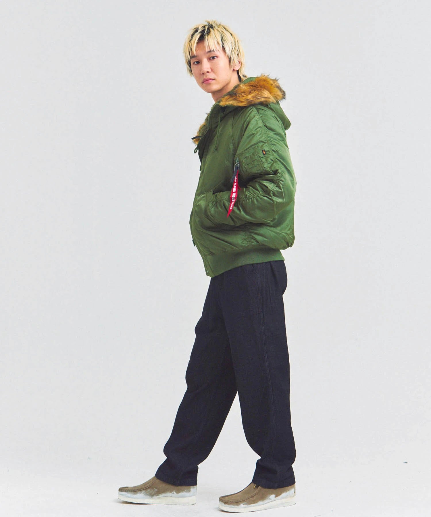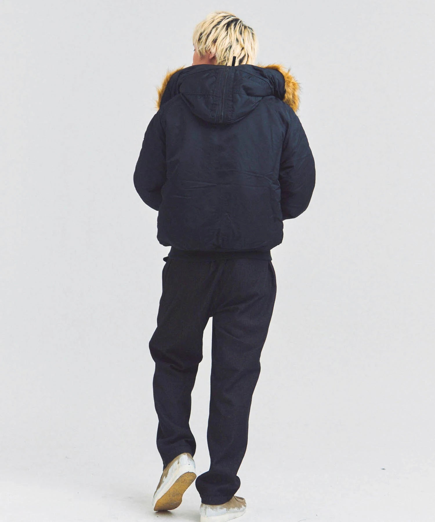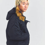 ・フード周りにフェイクファー、合成ムートンのフード裏地、ジッパー付きスプリットフード