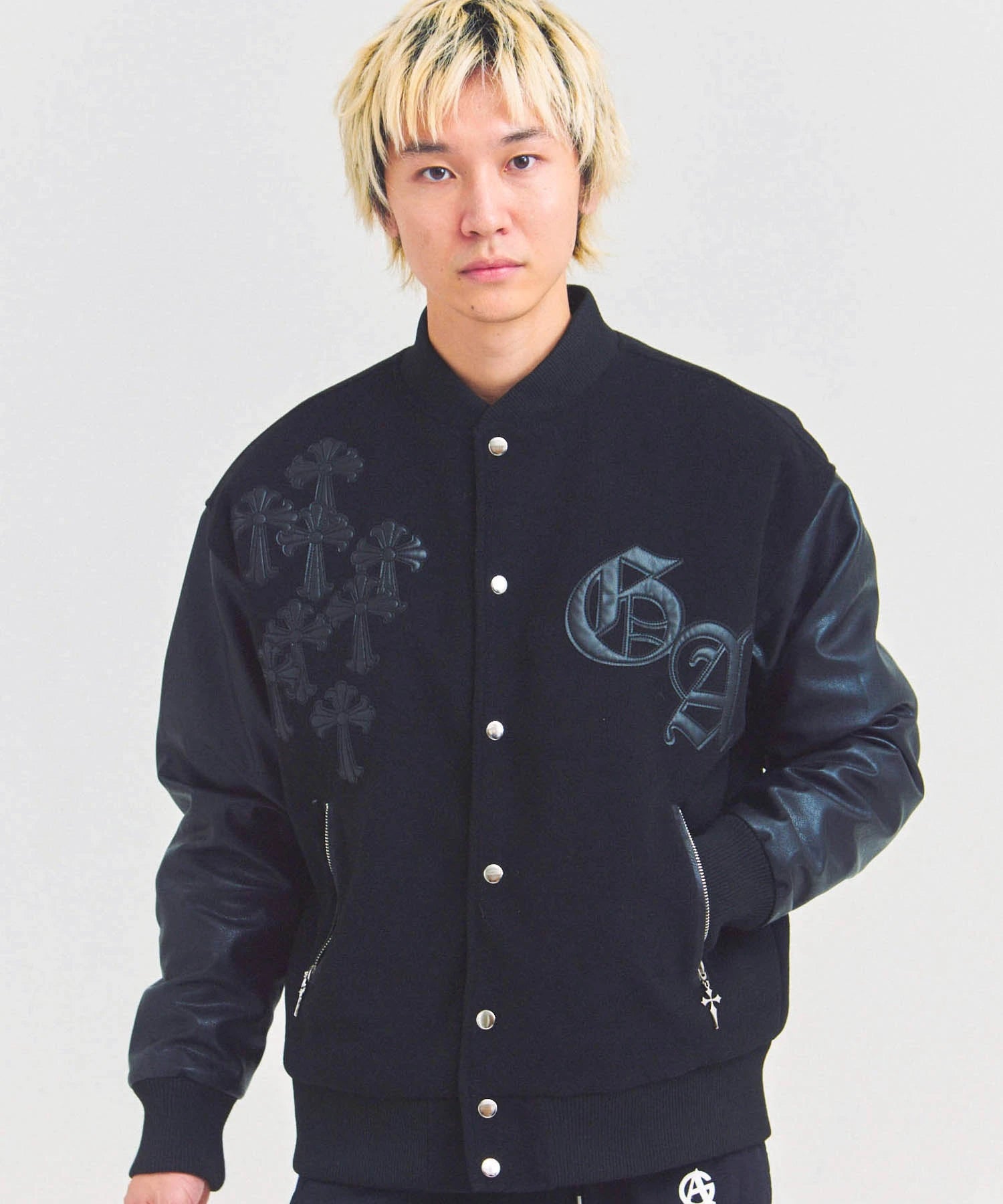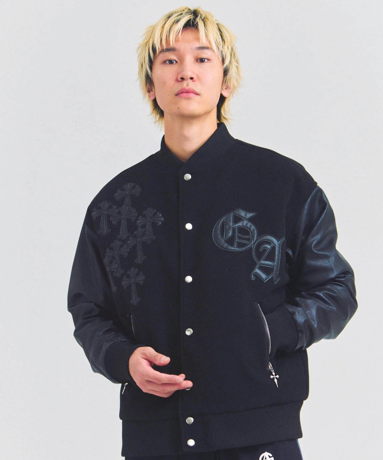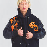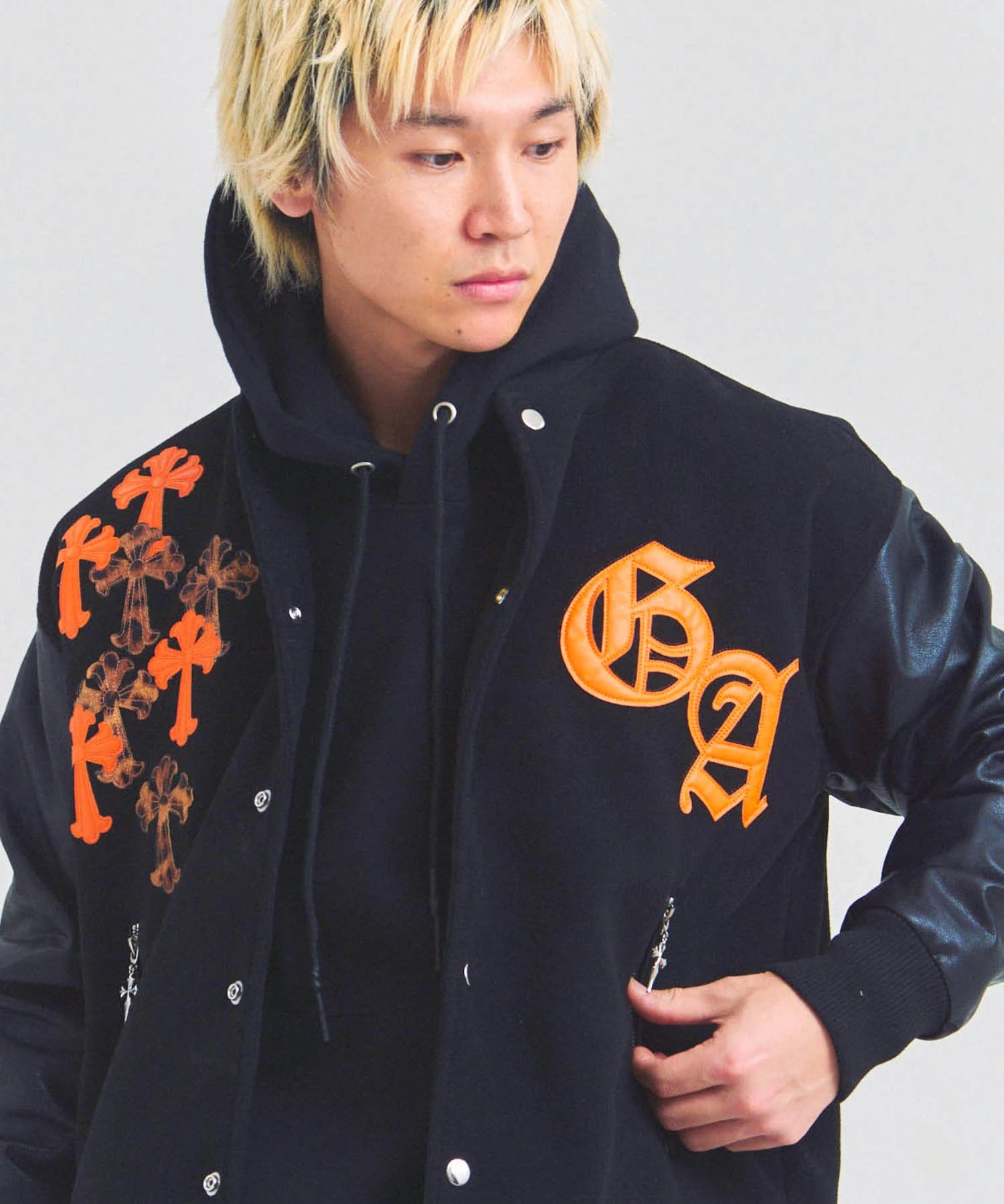 クラシックなスタジャンデザインをベースに、モダンな“クロスモチーフ”刺繍を前後に配した存在感のある1枚。中綿入りで軽く暖かく、秋冬のデイリースタイルに最適です。ブラックはシックに、オレンジは遊び心を添えるカラーアクセント。肩・袖の切り替えが立体感を演出し、コーディネートの主役として映えます。