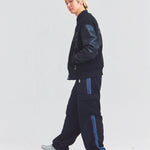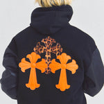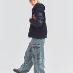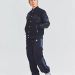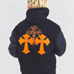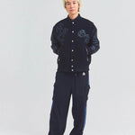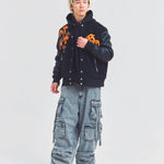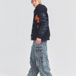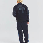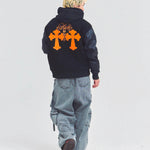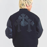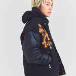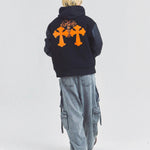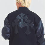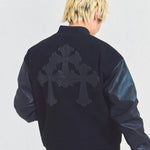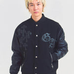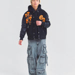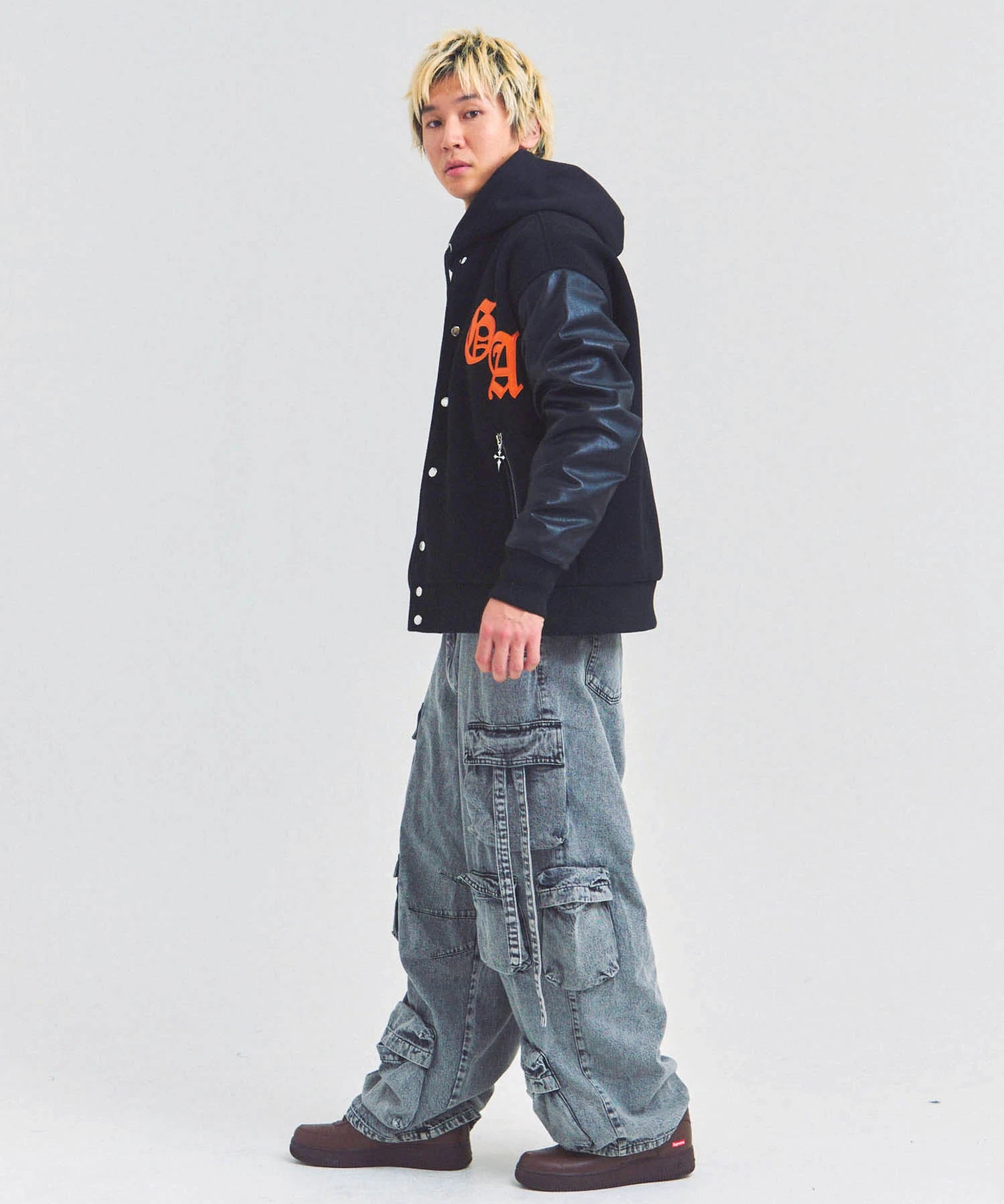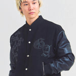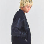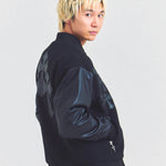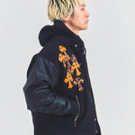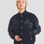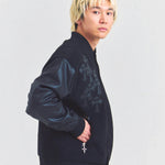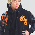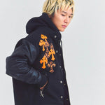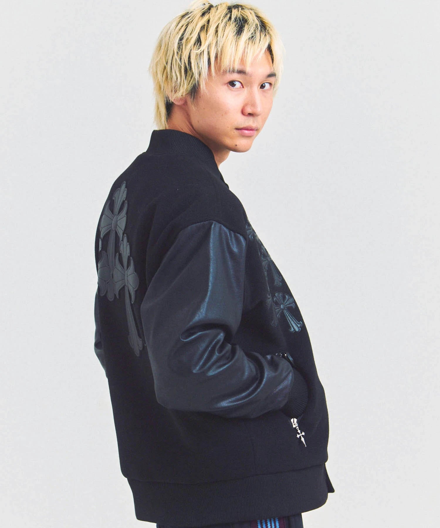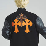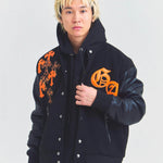 クラシックなスタジャンデザインをベースに、モダンな“クロスモチーフ”刺繍を前後に配した存在感のある1枚。中綿入りで軽く暖かく、秋冬のデイリースタイルに最適です。ブラックはシックに、オレンジは遊び心を添えるカラーアクセント。肩・袖の切り替えが立体感を演出し、コーディネートの主役として映えます。