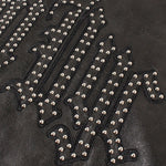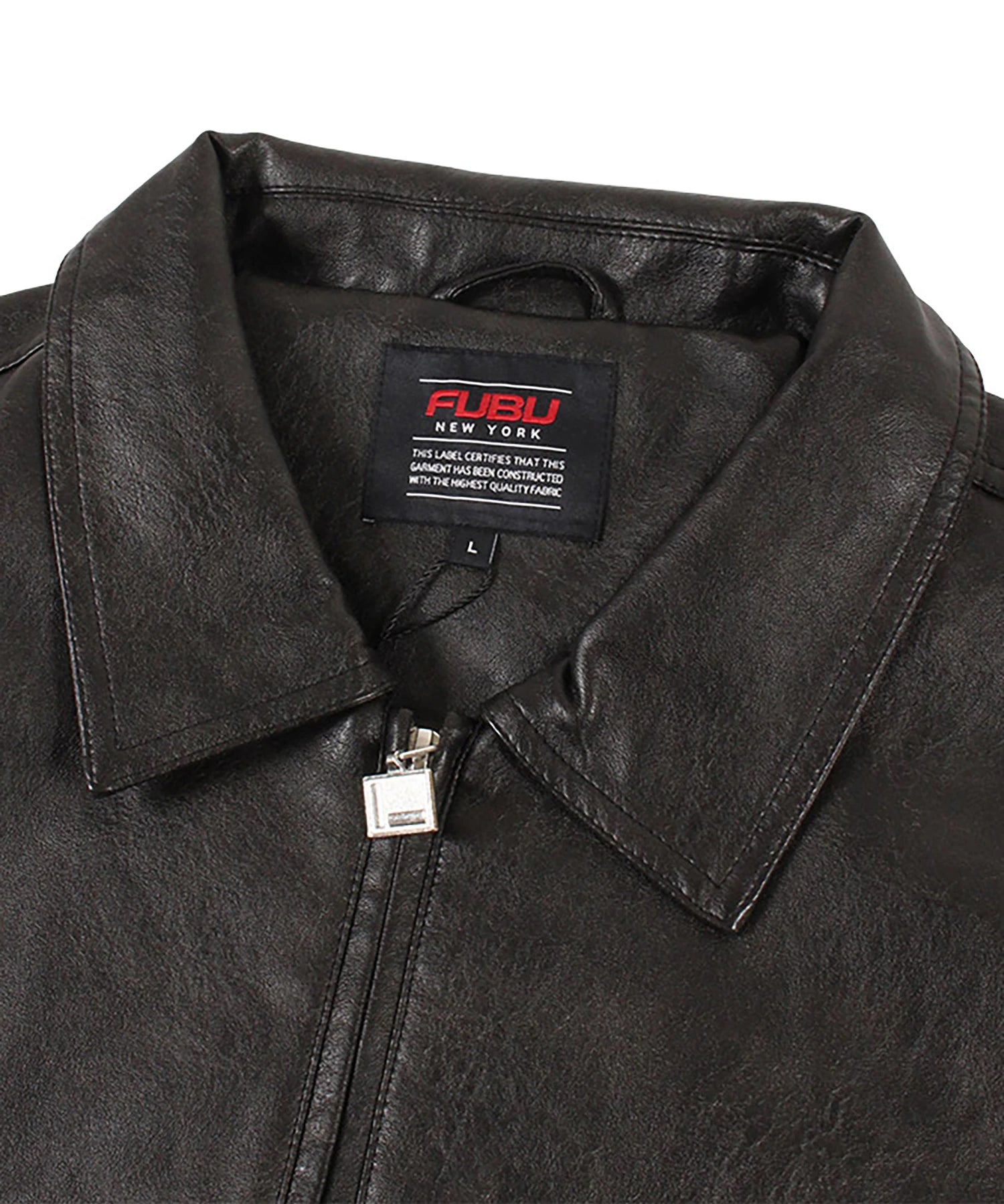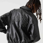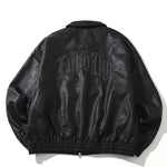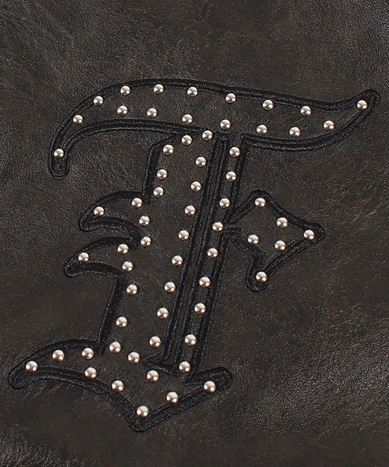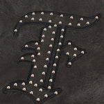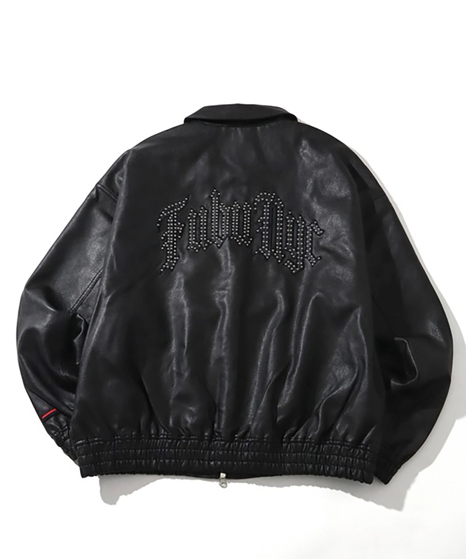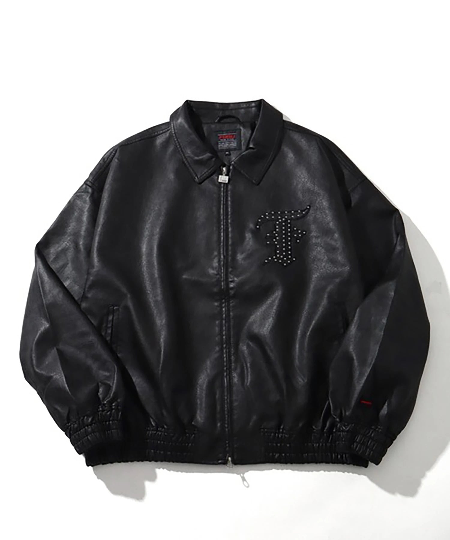 胸元に "F"、バックに "Fubu nyc"のスタッズ加工と刺繍を施したフェイクレザージャケット。両サイドポケットに加えて内ポケットも配置。オールブラックのデザインに、スタッズと袖口に配置された刺繍パッチがアクセントに。裏地はポリエステル100%で滑りが良く、インナーとの重ね着もしやすい仕様。裾・袖口のリブはポリエステル×ポリウレタンで伸縮性を持たせ、快適な着用感を実現。ゆったりとしたシルエットでストリートスタイルに大活躍するユニセックスでおすすめのアイテムです。