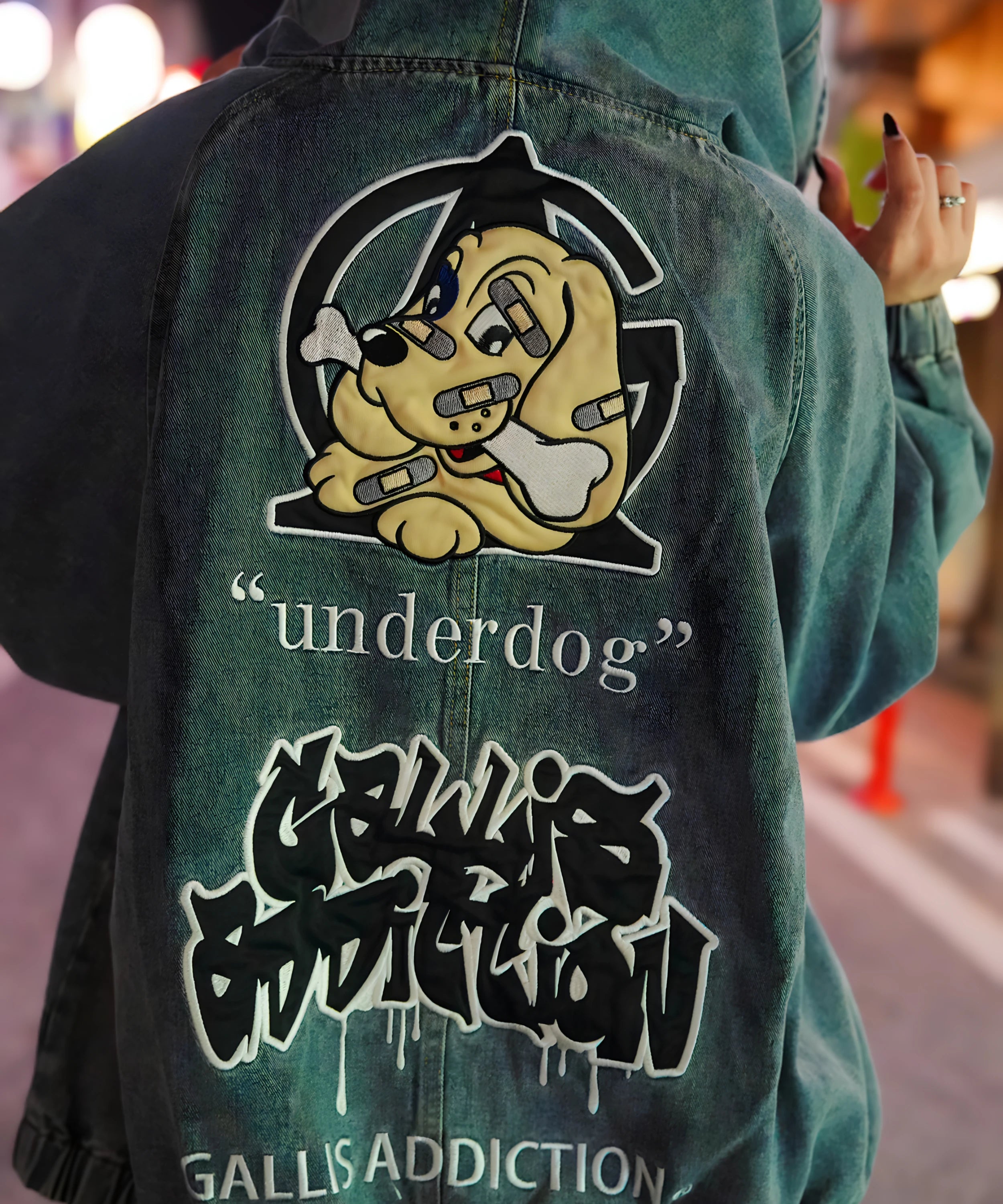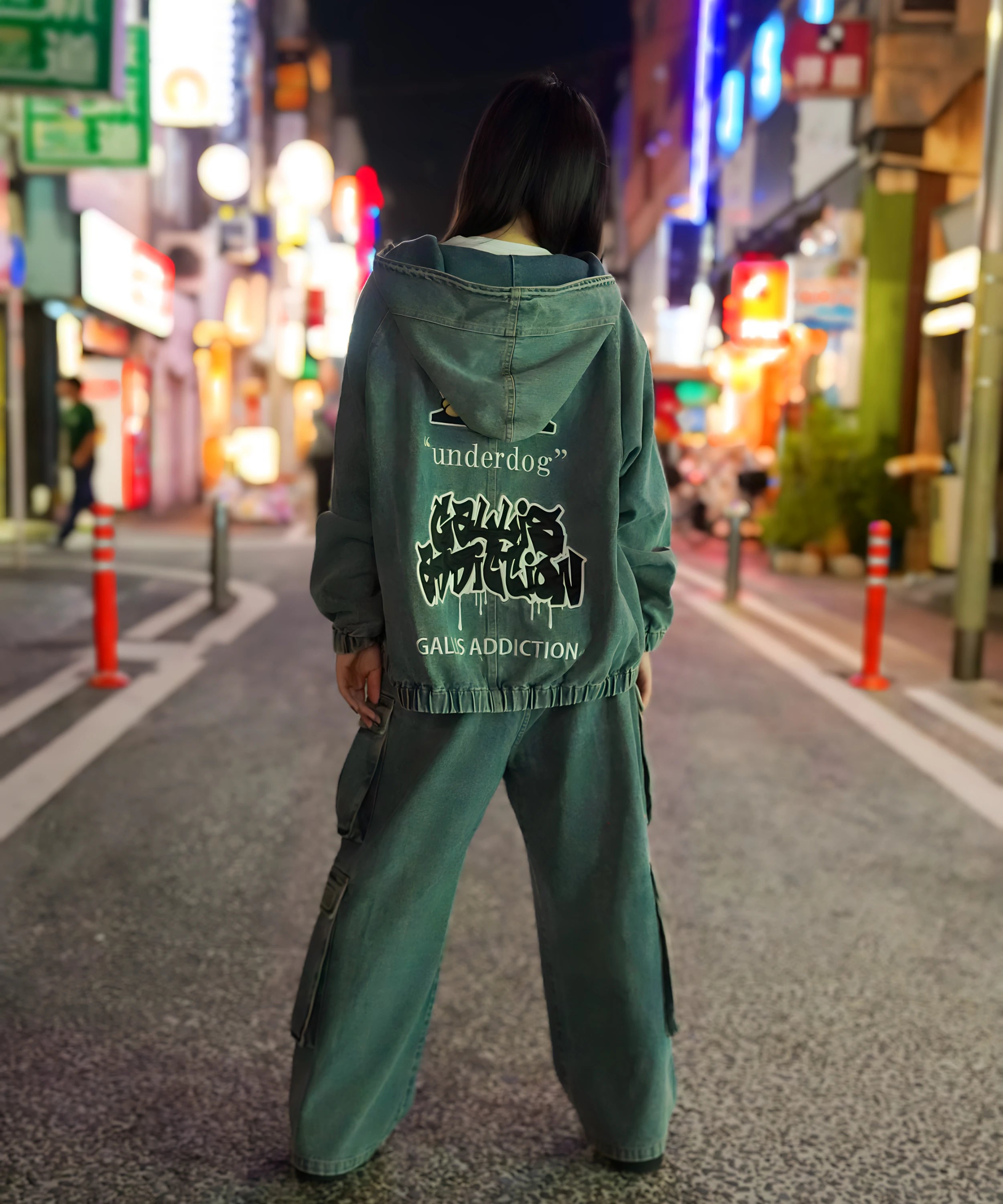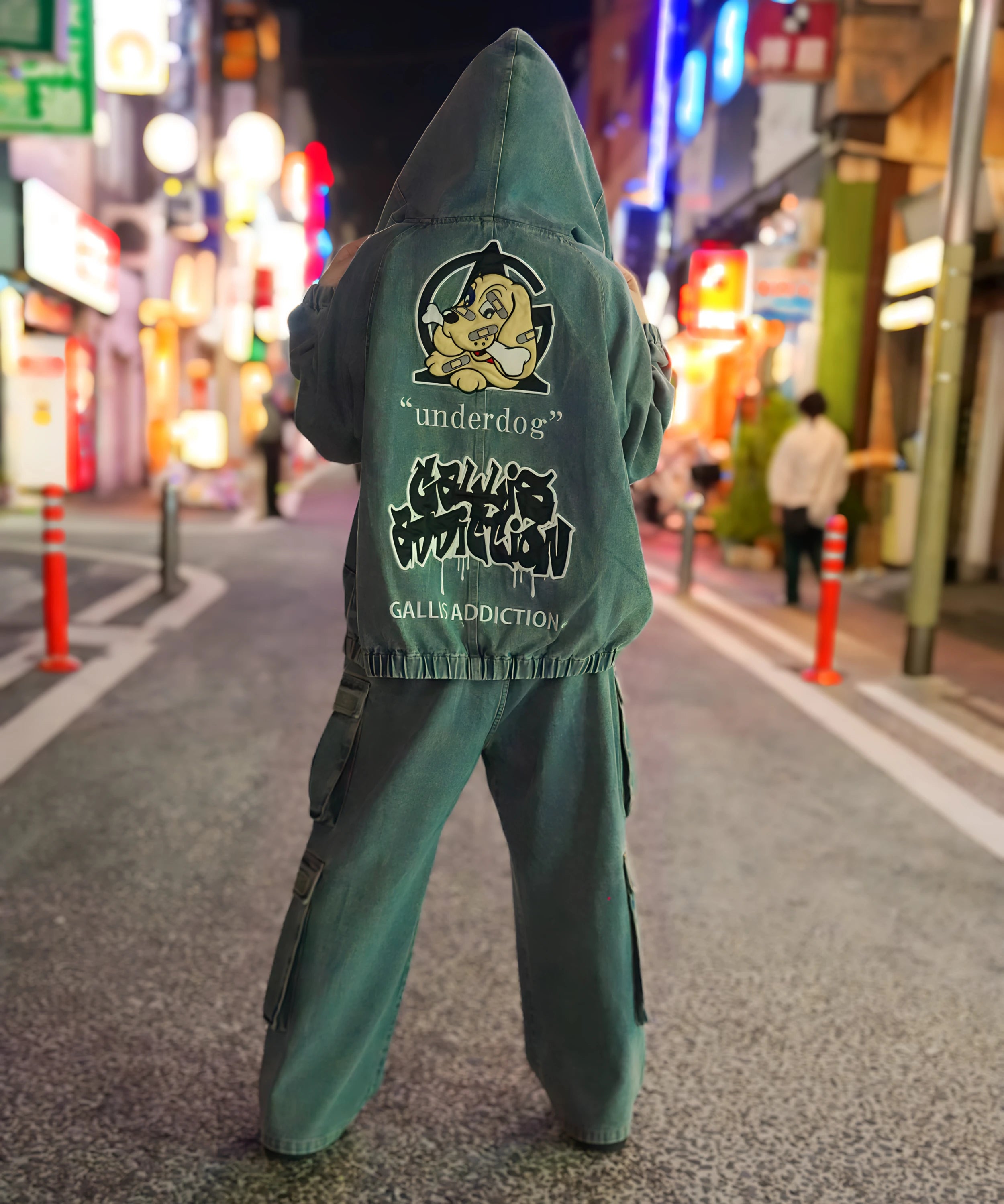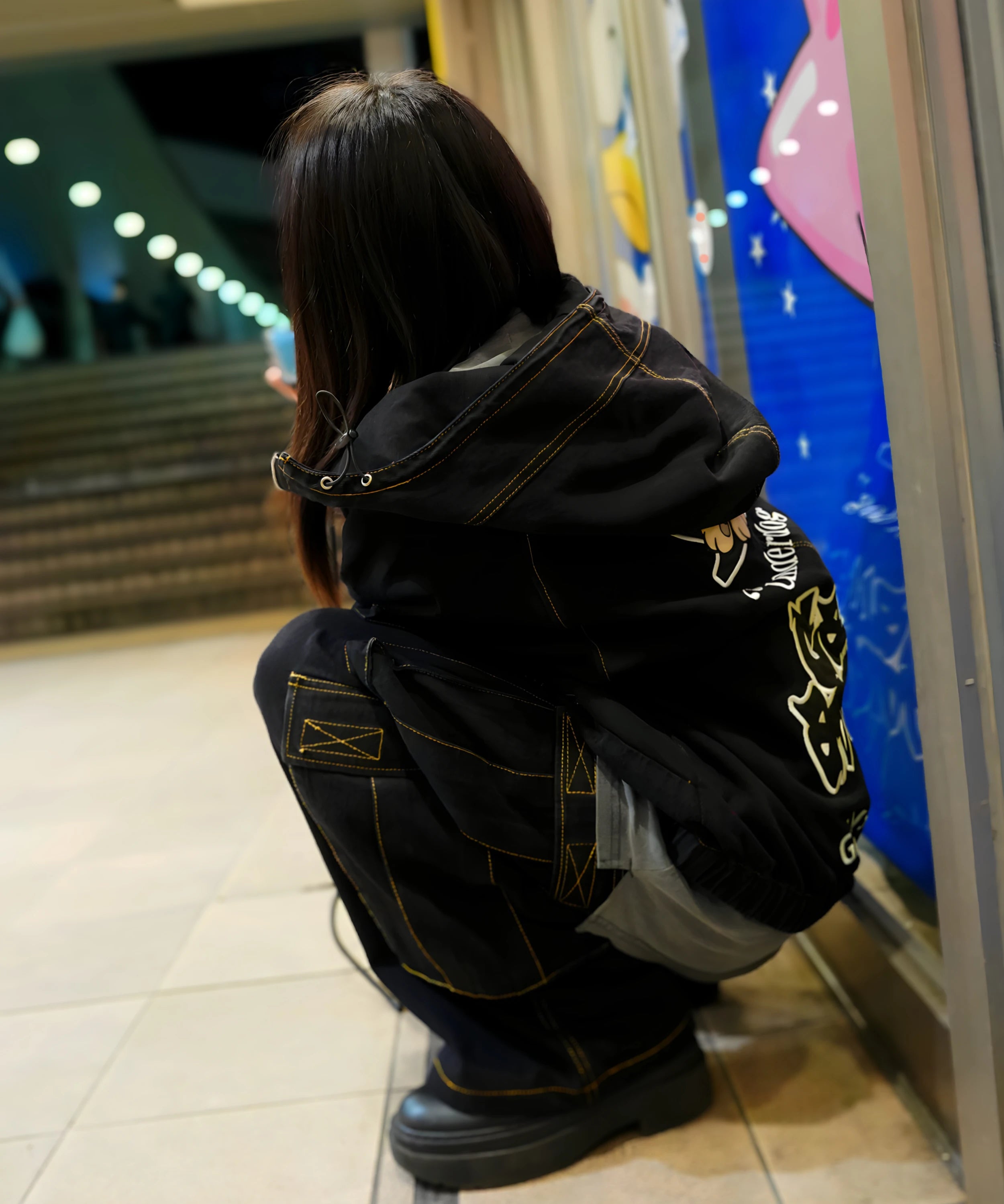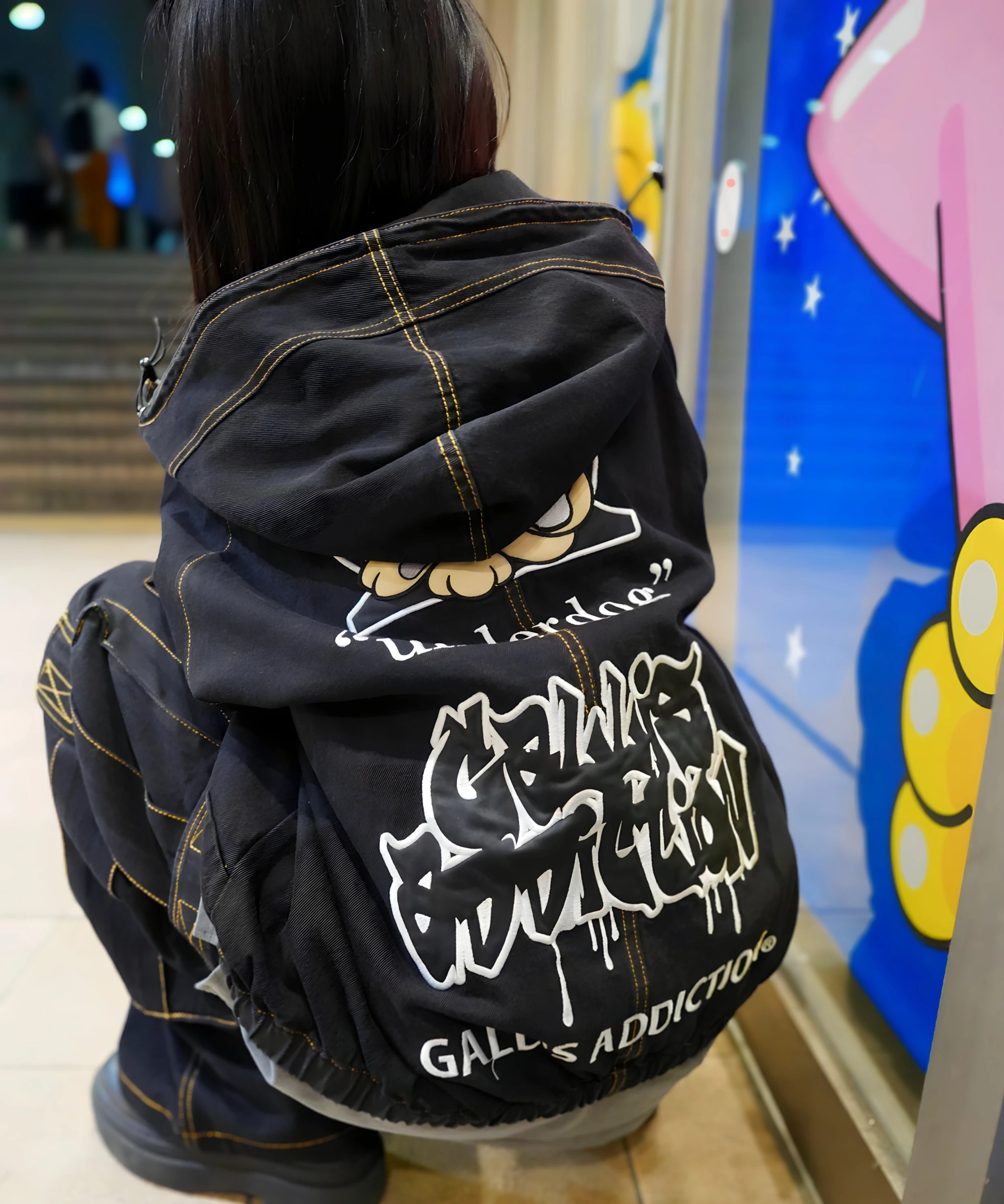 GALFYとGALLIS ADDICTIONのコラボレーションによって誕生した、存在感抜群の別注デニムフードジャケット。フロントにはブランドロゴ刺繍を施し、背面には大胆なグラフィックアートを配置することで、視線を惹きつけるデザインに仕上げました。ゆったりとしたシルエットはストリートスタイルに最適で、レイヤードにも対応。単品使いでも十分なインパクトを放ちますが、同シリーズのカーゴパンツとセットアップで着用することで、より統一感のあるスタイリングが完成します。