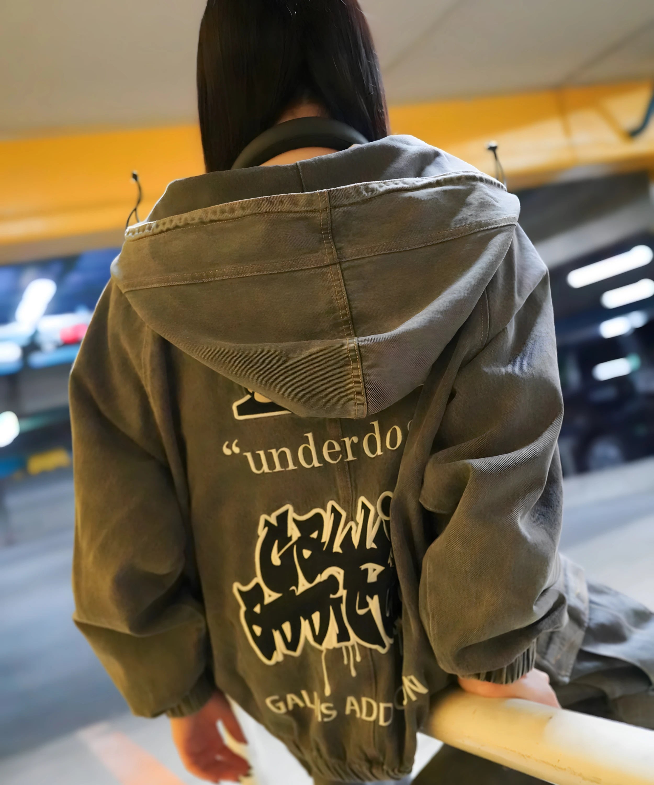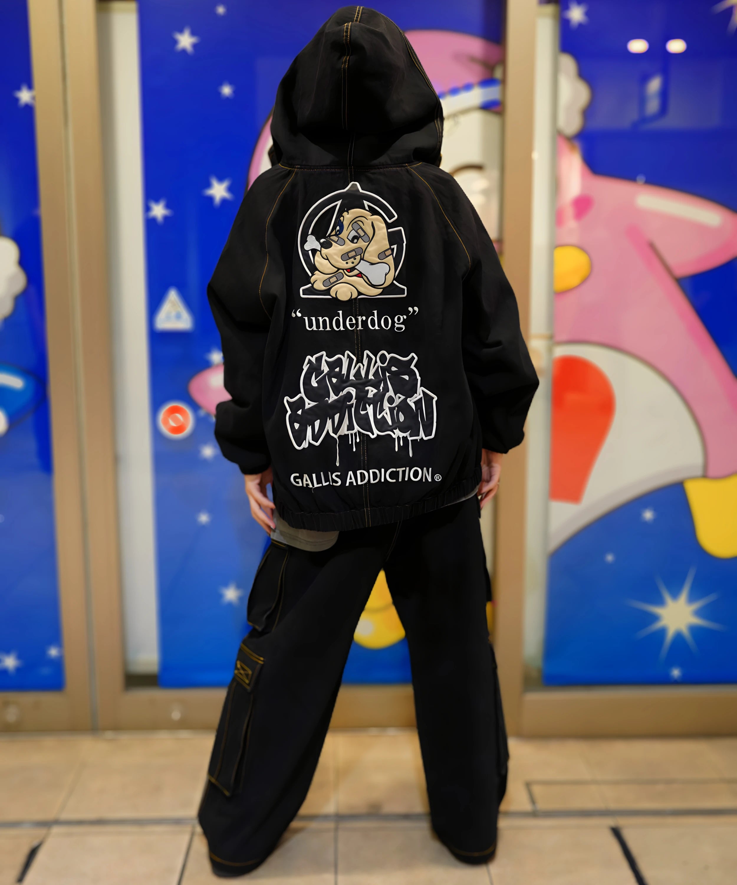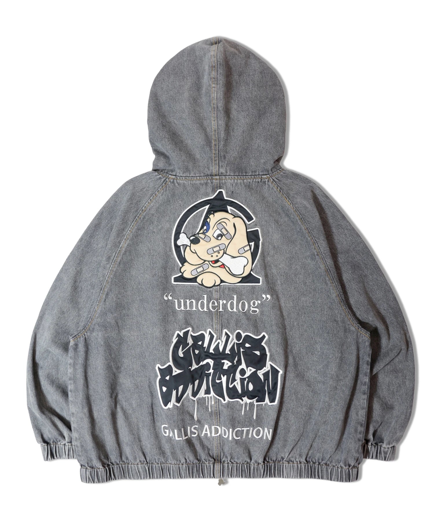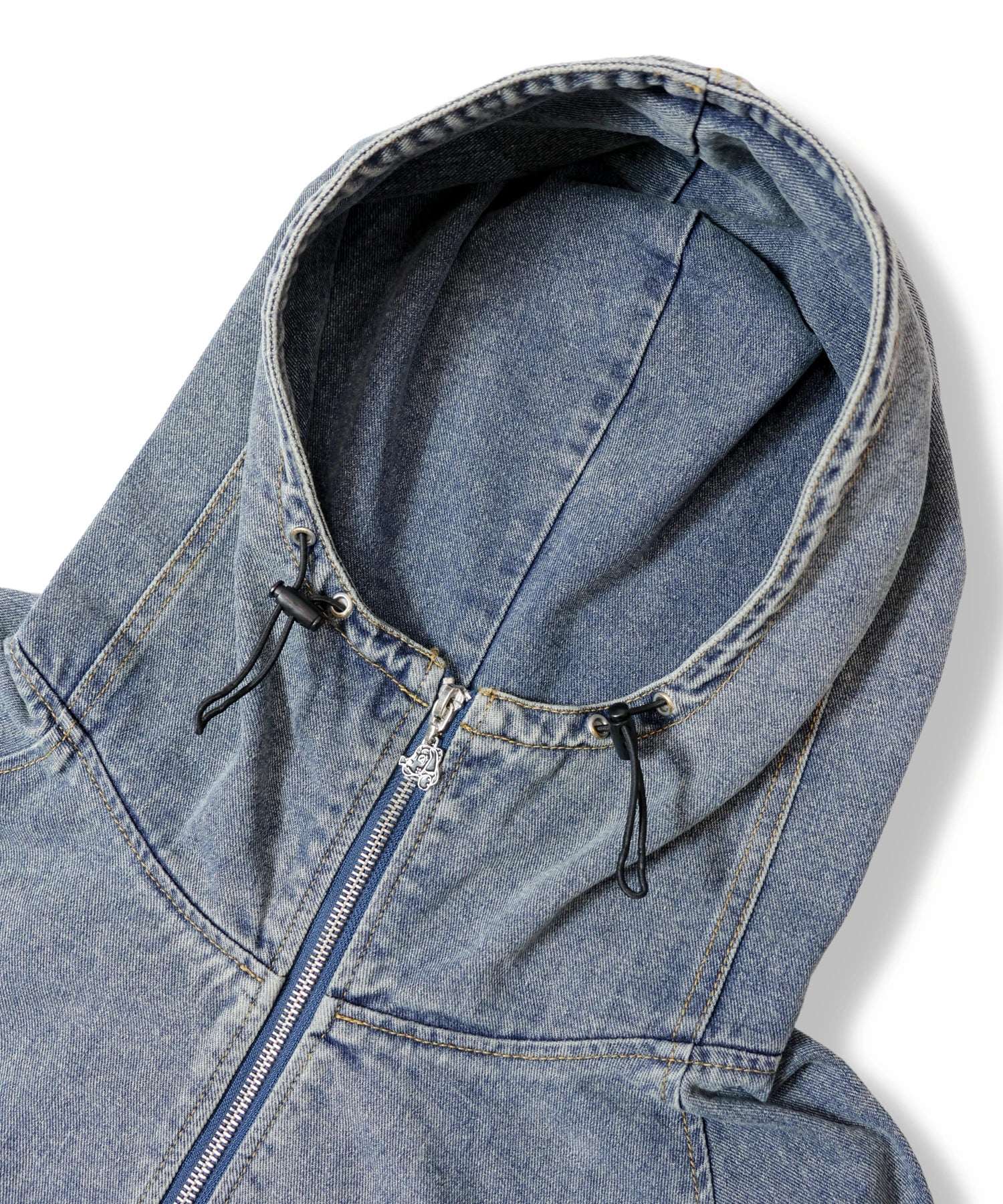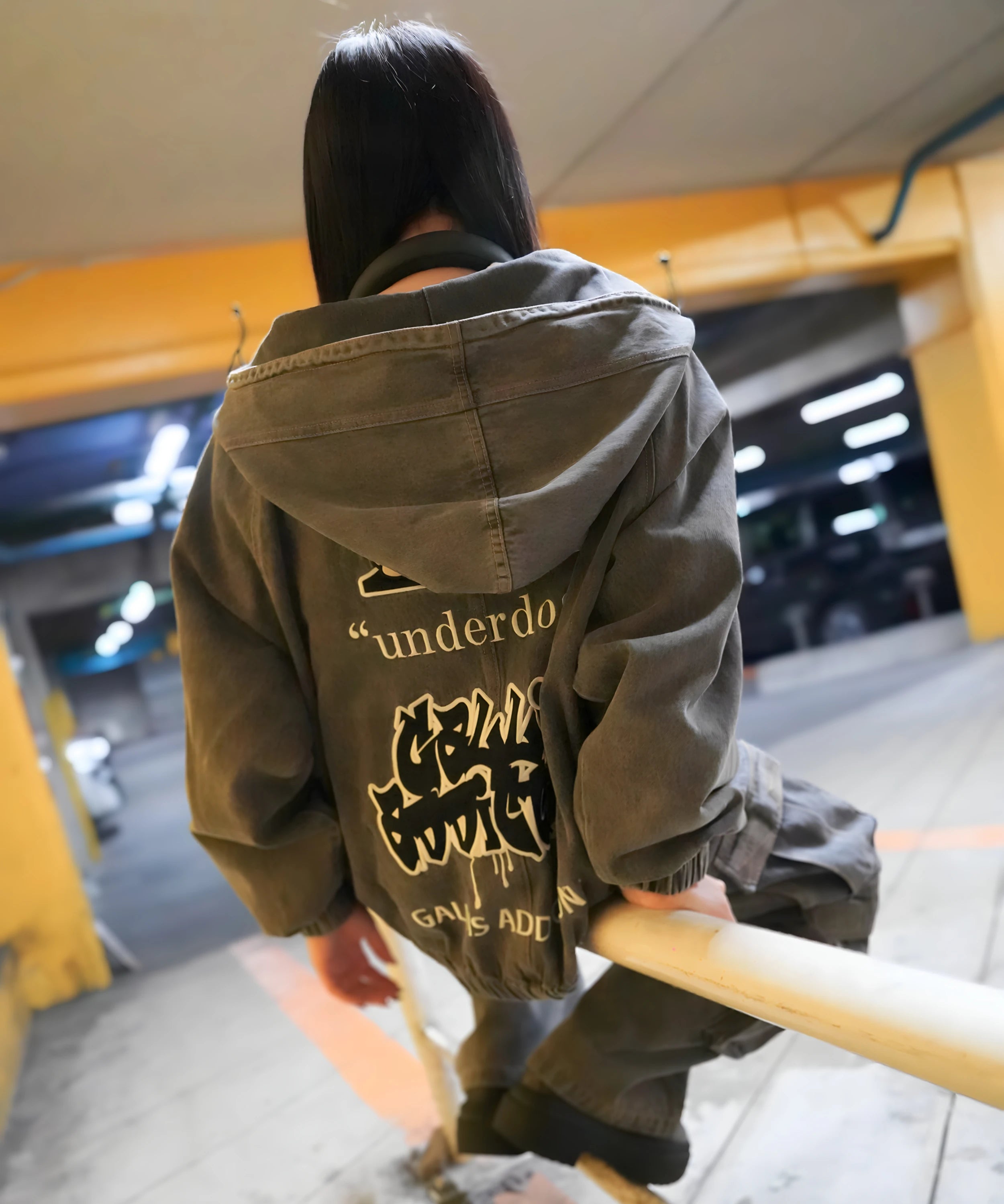 GALFYとGALLIS ADDICTIONのコラボレーションによって誕生した、存在感抜群の別注デニムフードジャケット。フロントにはブランドロゴ刺繍を施し、背面には大胆なグラフィックアートを配置することで、視線を惹きつけるデザインに仕上げました。ゆったりとしたシルエットはストリートスタイルに最適で、レイヤードにも対応。単品使いでも十分なインパクトを放ちますが、同シリーズのカーゴパンツとセットアップで着用することで、より統一感のあるスタイリングが完成します。