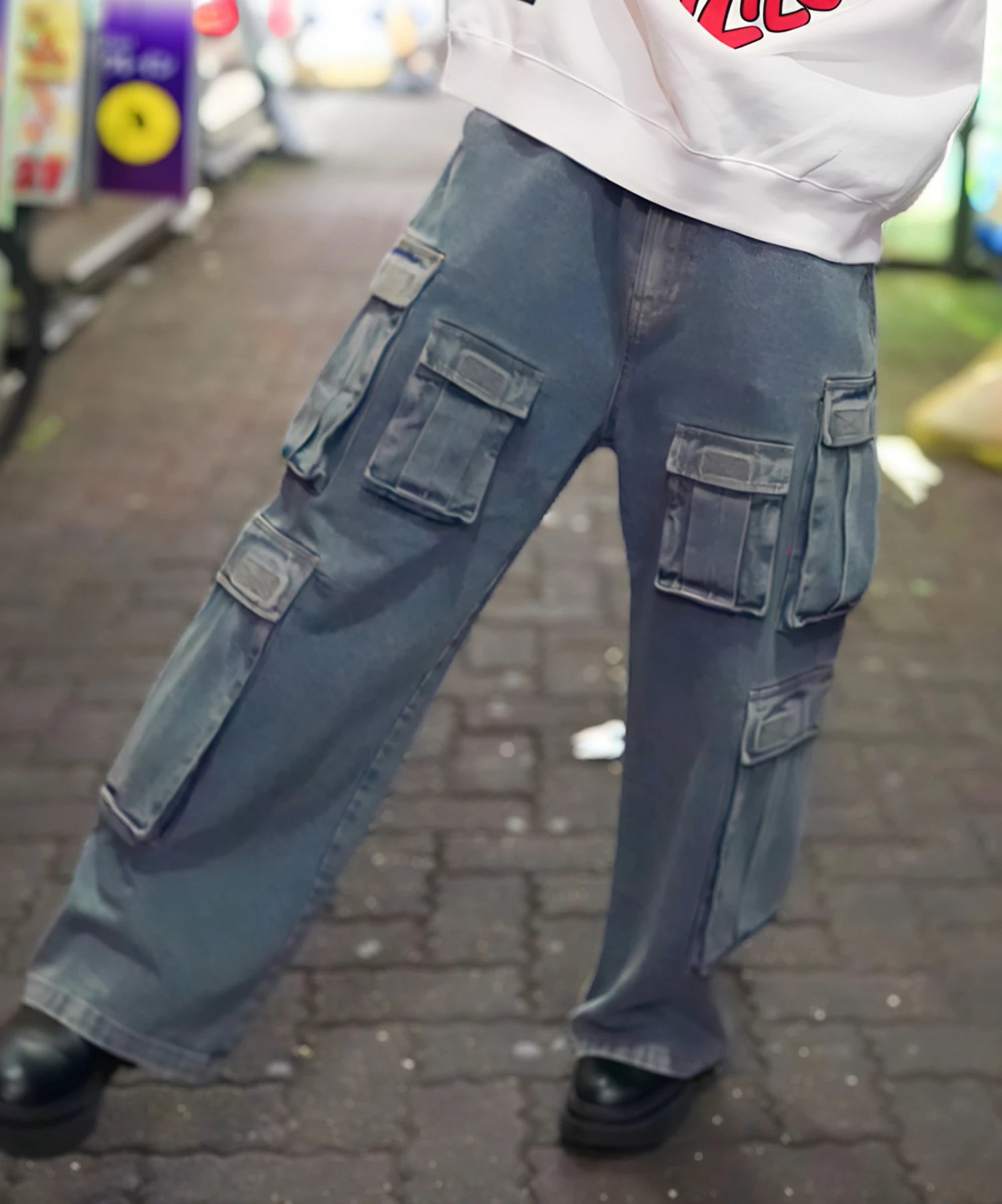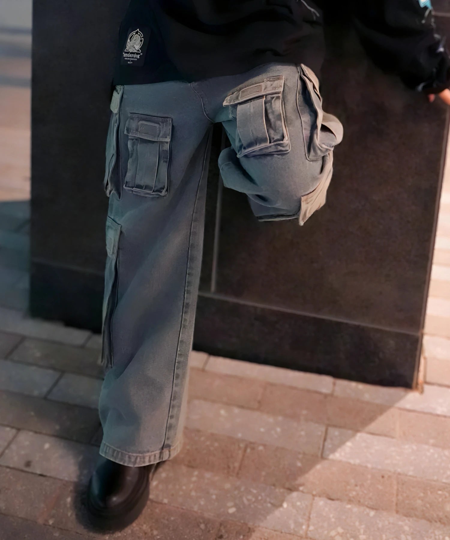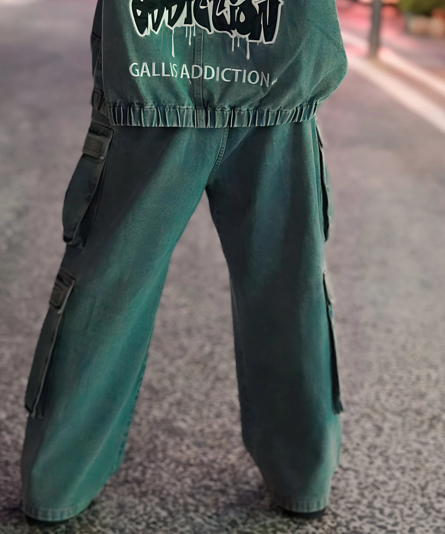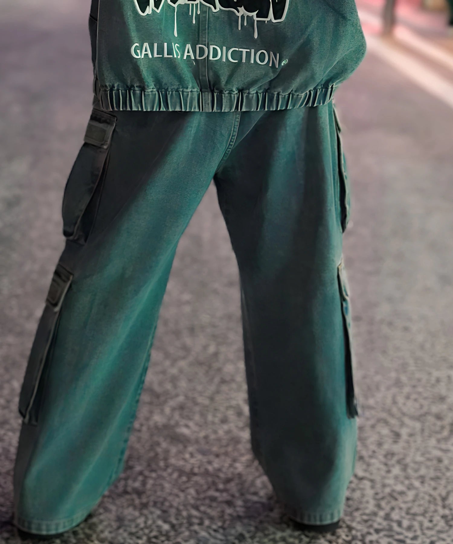 ストリートと機能性を融合させた、GALFY×GALLIS ADDICTIONの別注デニムカーゴパンツ。複数のポケットを備えた実用的なディテールと、程よくルーズなシルエットが特徴です。動きやすさとスタイルを両立し、日常使いからアクティブなシーンまで幅広く対応。単品でもコーディネートの主役として活躍しますが、同シリーズのフードジャケットとセットアップで着用することで、ブランドの世界観をより深く体現できます。